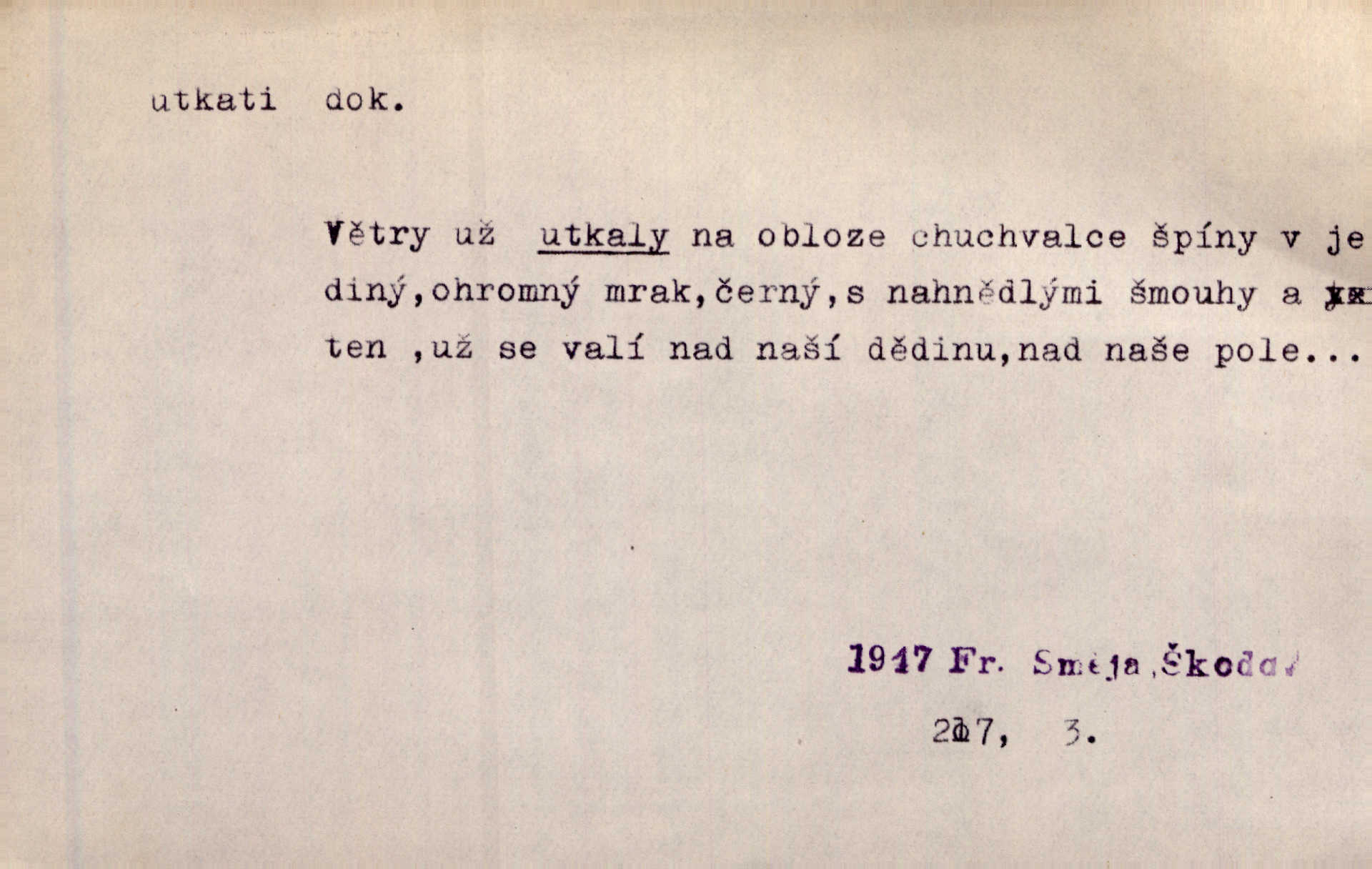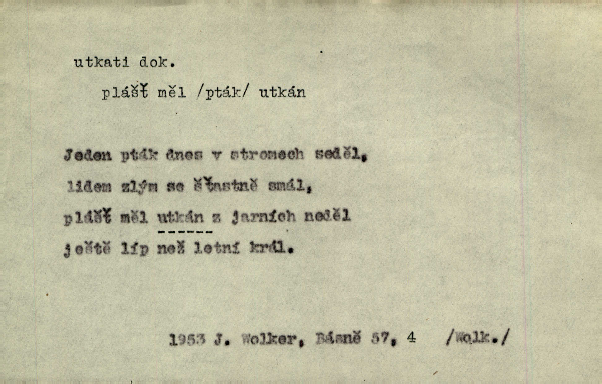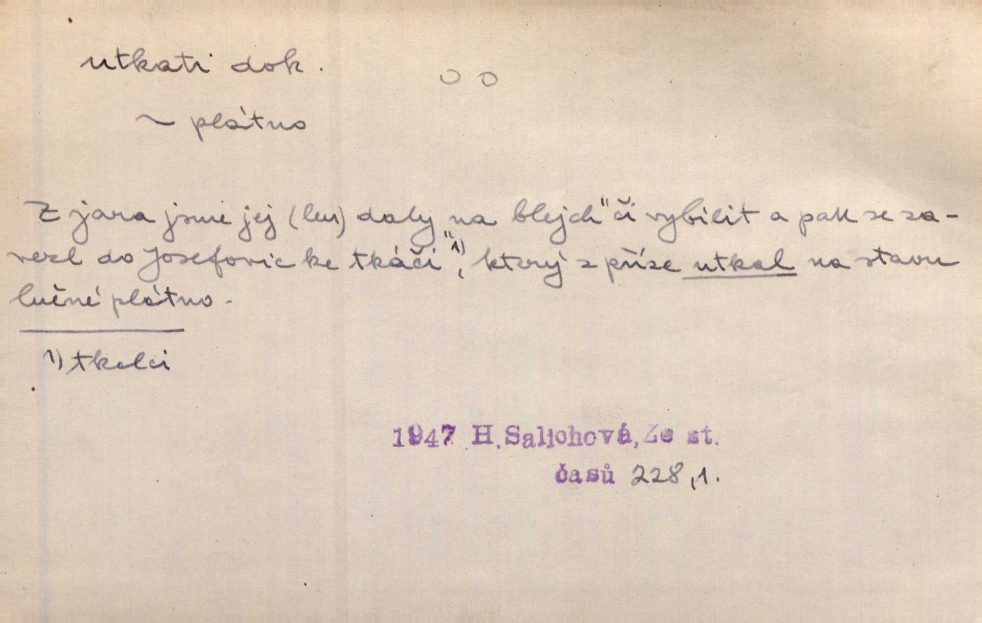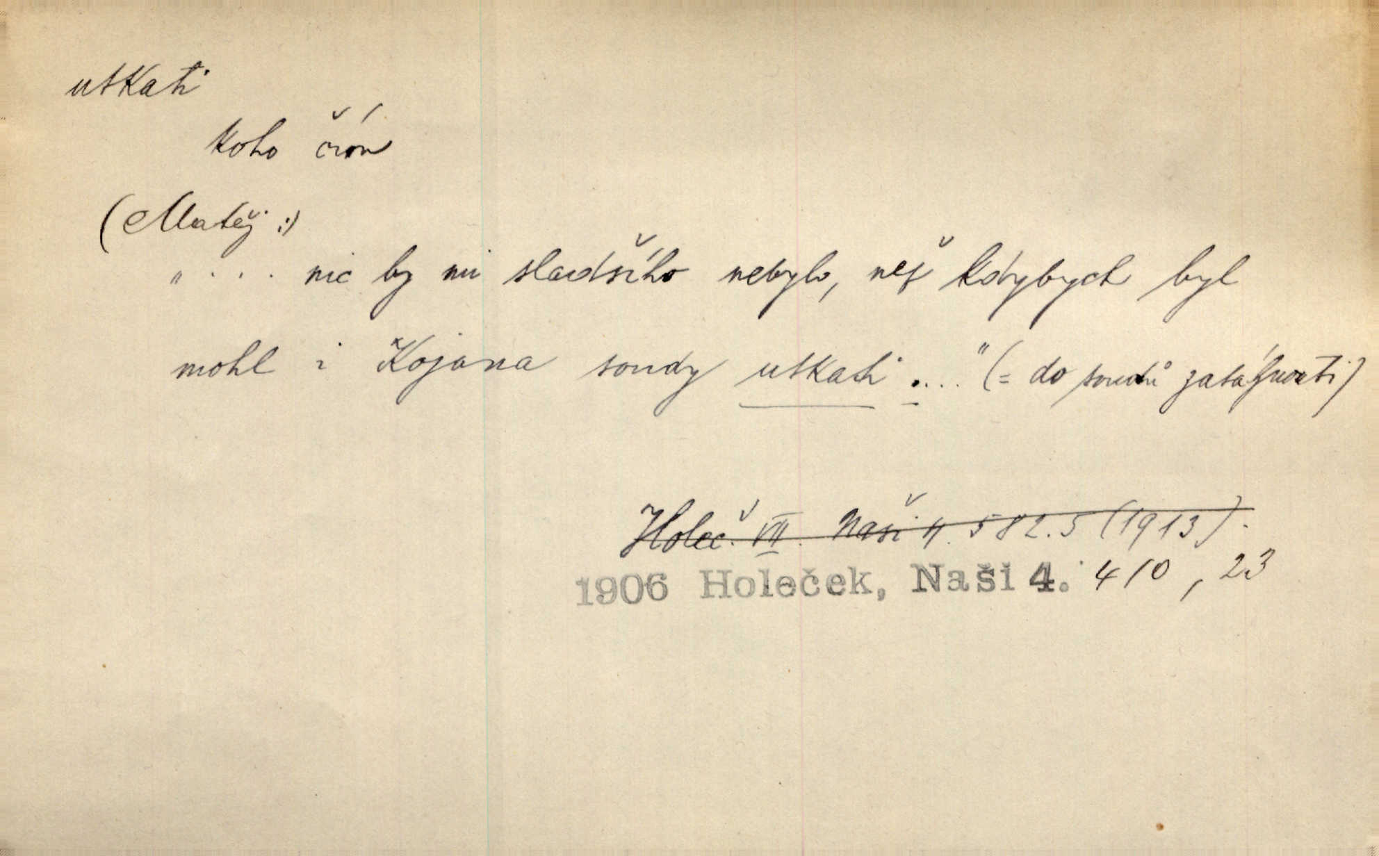 - utkati dok. 1. (co) tkaním vyrobiti něco. Tenkráte lidé sami na šat předli, sami si ho také utkali a ušili. Něm. Žena primitivním a zdlouhavým spůsobem utká z toho [bavlny] hrubé plátno. Štol. Za utkání velkého koberce placeno jedenáct krejcarů. Sum. Za krátko třepetal se ubohý don Juan sám v síti, kterou byl utkal pro tajemnou kněžnu. Čech. Černí pavouci vylezou a rubáš ze smutku utkají. Strn. D Kniž. vůbec vytvořiti, udělati, obyč. z různých částí, jednotlivostí. Utkána je tato sbírka [básní] z dvojího thematického živlu. Sez. Snad bz dovedl básník dobře popsat tuto rázovitou postavu, snad by z ní dovedl utkat povídku. Týd. rozhl. Plyne [bzukot včel] v jednotvárném vypravování o věcech zapomenutých a věcech utkaných ze snů. Vanč. Vnitřní život byl všecek utkán z ideálních vznětů. Čech. Utkal sobě již plán, jak dítě vychová. Hál. Utkali tu svatbu, mně ničehož neřekli. Nov. Třeba je [osudy Rimbaudovy] pozorovati se stanoviska legendy, která se utkala kol jména a plodů jeho. Vrch.