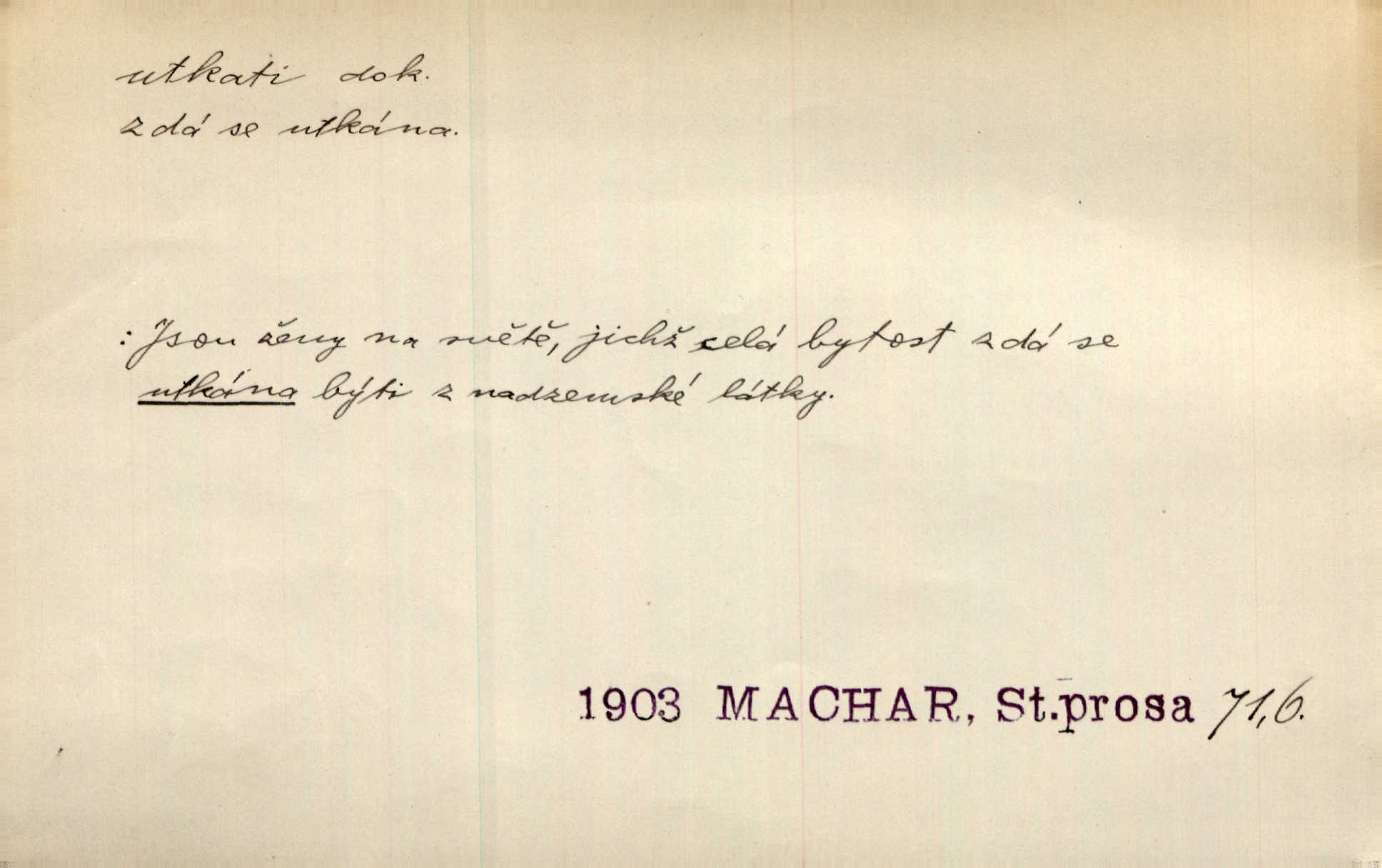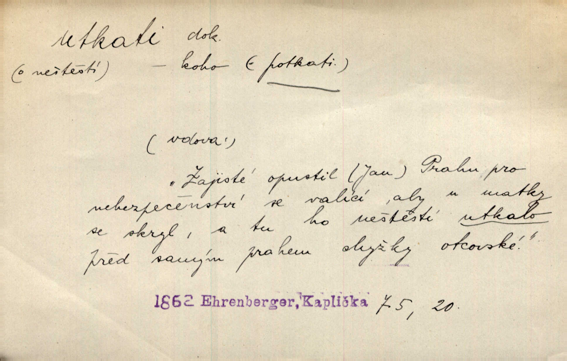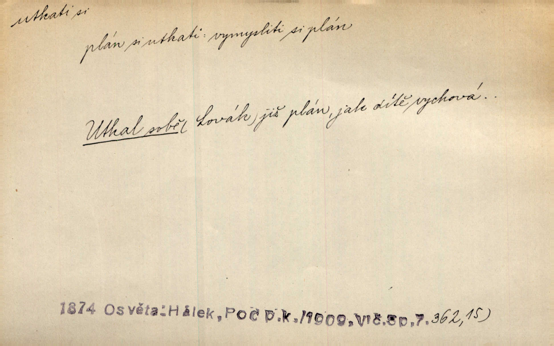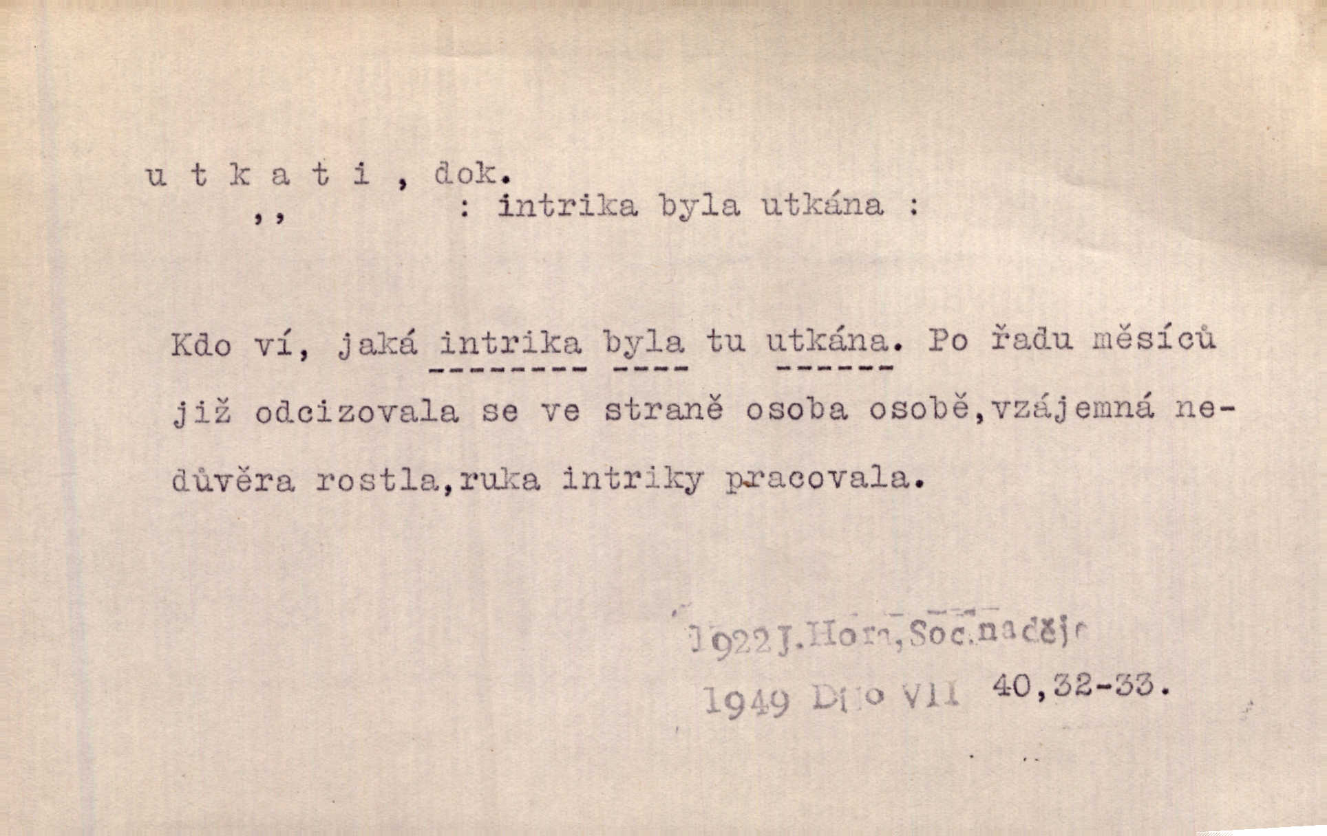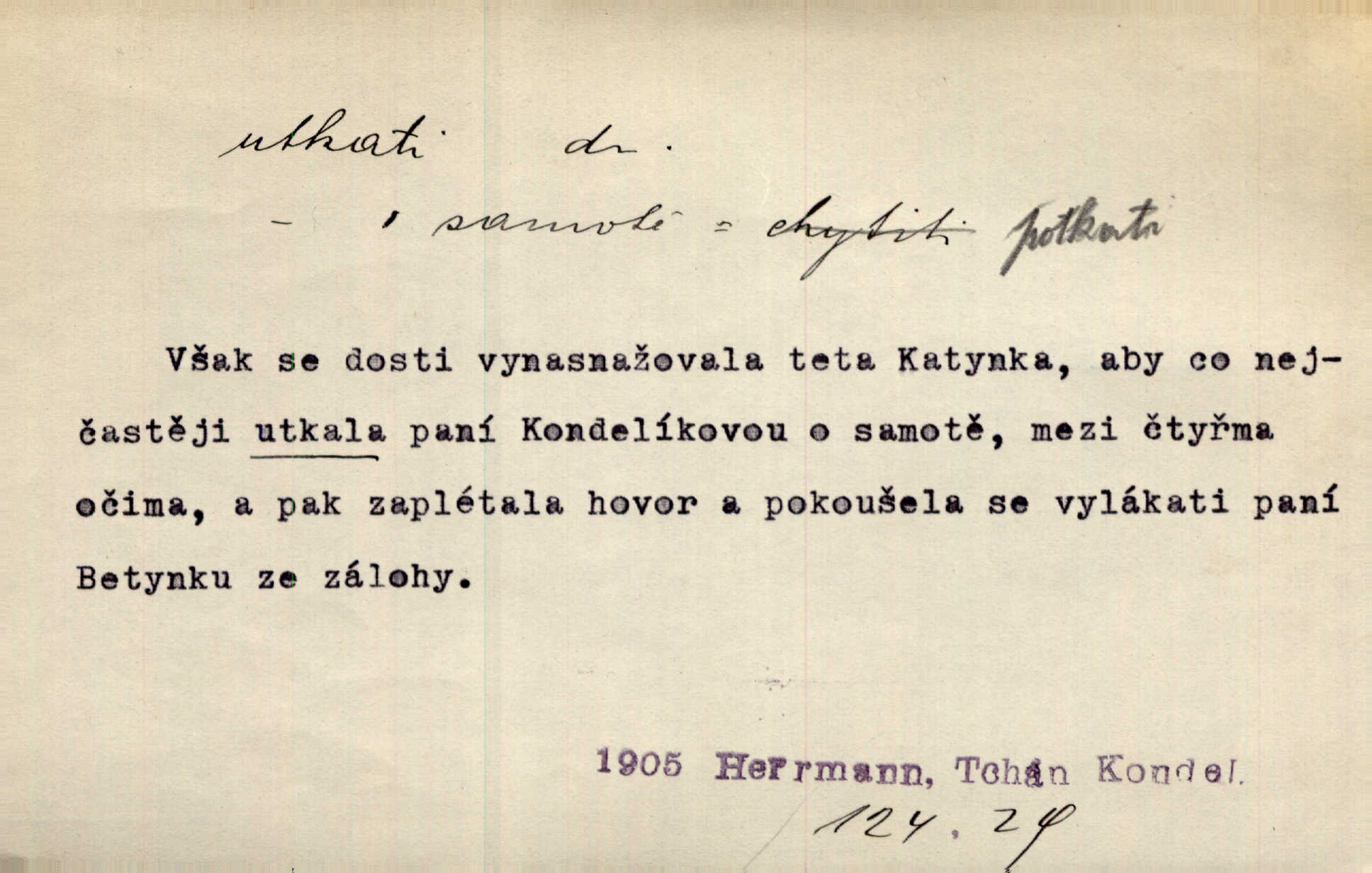 - utkati dok. 1. (co) tkaním vyrobiti něco. Tenkráte lidé sami na šat předli, sami si ho také utkali a ušili. Něm. Žena primitivním a zdlouhavým spůsobem utká z toho [bavlny] hrubé plátno. Štol. Za utkání velkého koberce placeno jedenáct krejcarů. Sum. Za krátko třepetal se ubohý don Juan sám v síti, kterou byl utkal pro tajemnou kněžnu. Čech. Černí pavouci vylezou a rubáš ze smutku utkají. Strn. D Kniž. vůbec vytvořiti, udělati, obyč. z různých částí, jednotlivostí. Utkána je tato sbírka [básní] z dvojího thematického živlu. Sez. Snad bz dovedl básník dobře popsat tuto rázovitou postavu, snad by z ní dovedl utkat povídku. Týd. rozhl. Plyne [bzukot včel] v jednotvárném vypravování o věcech zapomenutých a věcech utkaných ze snů. Vanč. Vnitřní život byl všecek utkán z ideálních vznětů. Čech. Utkal sobě již plán, jak dítě vychová. Hál. Utkali tu svatbu, mně ničehož neřekli. Nov. Třeba je [osudy Rimbaudovy] pozorovati se stanoviska legendy, která se utkala kol jména a plodů jeho. Vrch.