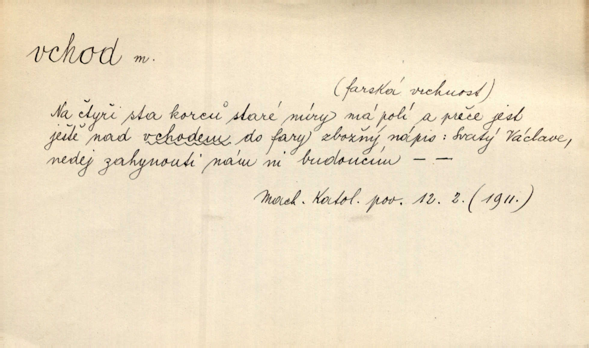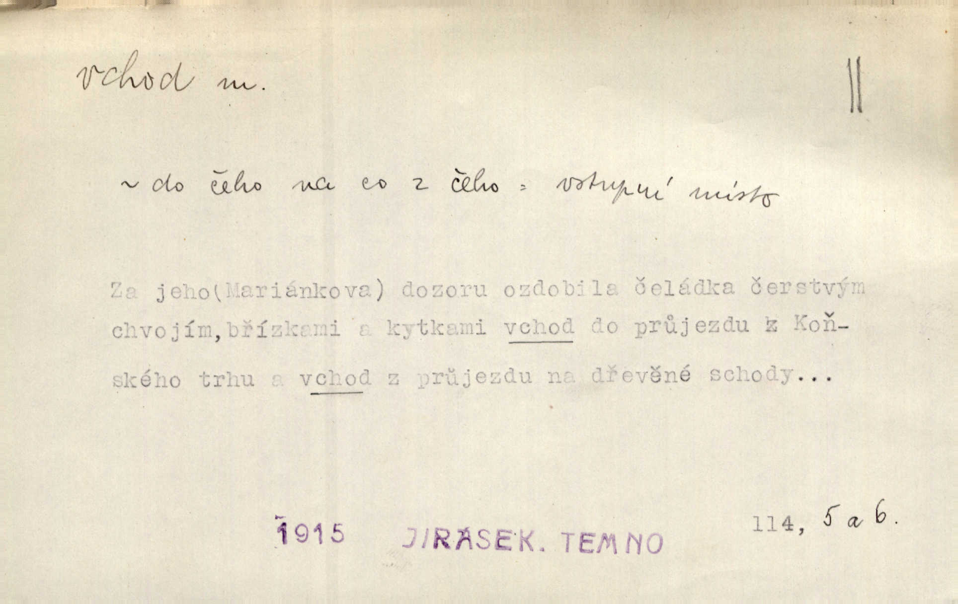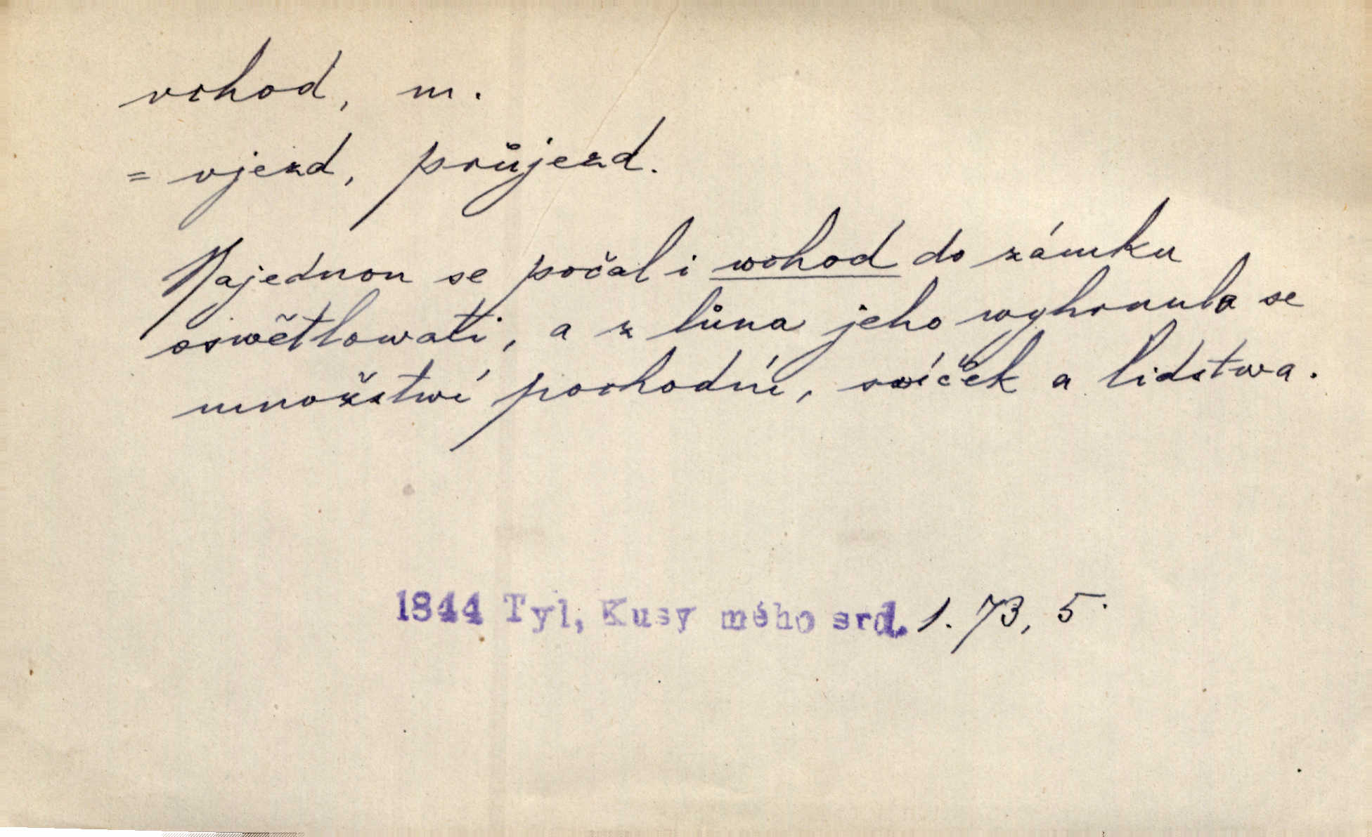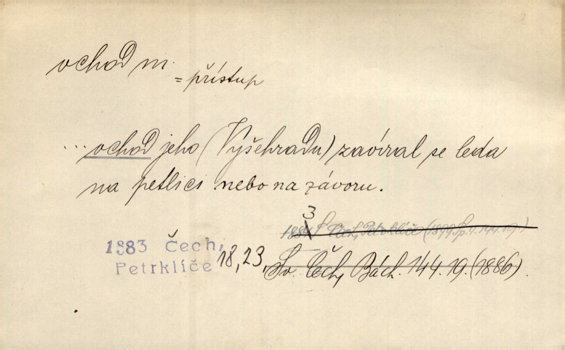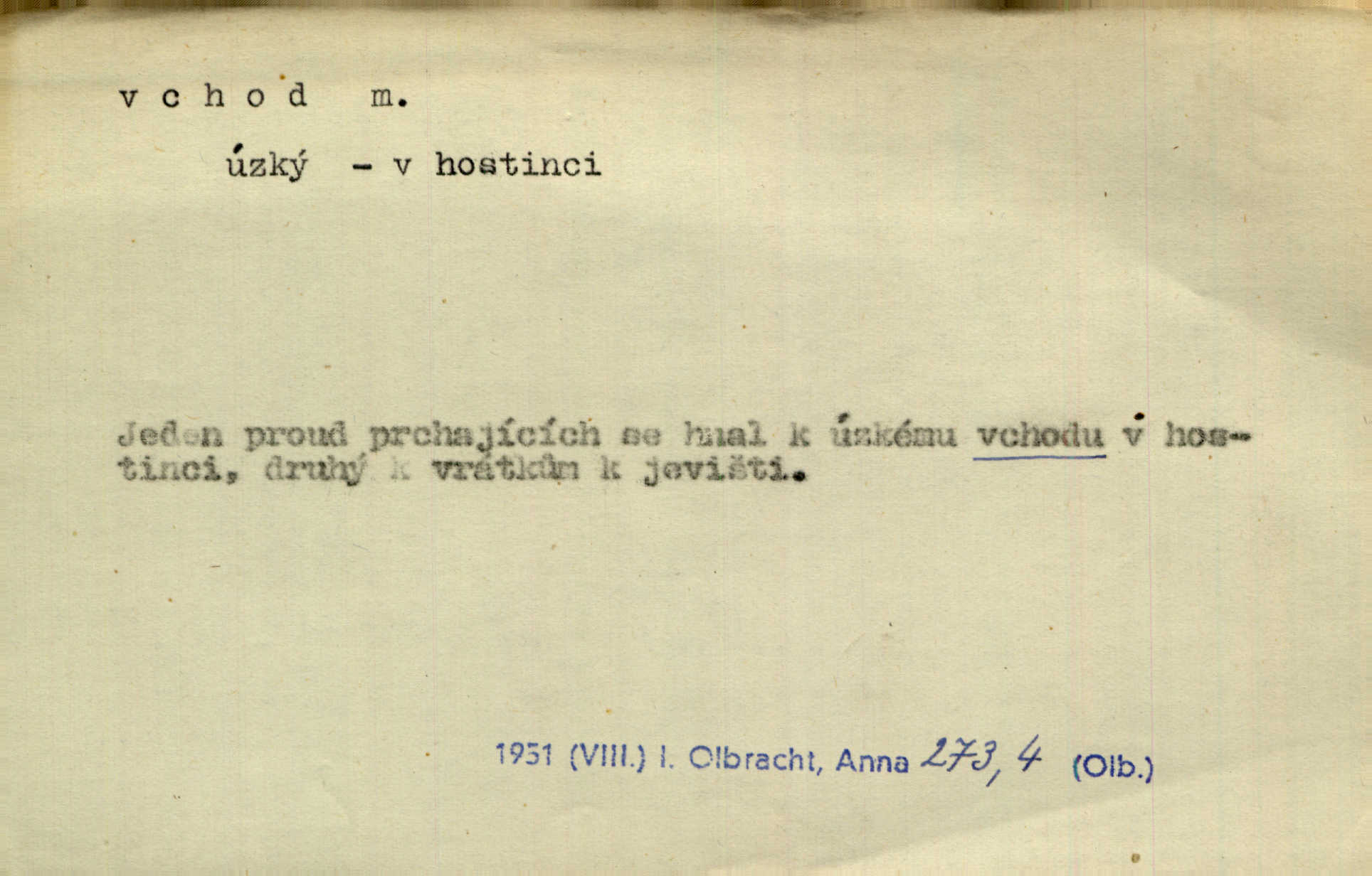- vchod, -u m. místo, kudy se někam vchází. Zvolnili ze slušnosti běh a poklonili se před vchodem, jako by sám vladař stál na prahu. Vanč. Nebylo nikoho, kdo by na okamžik nebyl postál před vchodem. Ben. Opona, která zastírala vchod, teď se vůbec nespouštěla. Herrm. Ten bydlel v přízemí, vchod k němu byl naprosto volný. Šmil. Brána má dva vchody: větší (vrata) pro povozy, a vrátka (dvírce) pro pěší. Jir. Vchod k [údolí] s orlem v oblacích sup hlídá. Vrch. Nízký je vchod do jezevčího toho hnízda otvor. A. Mrš. Anat. vchod pánevní; vchod do hrtanu, vchod do očnice. D Řidč. vstup, vejití dovnitř. Při mém vchodu zavřela knihu a položila ji na stůl. Zey. Josef zabraňuje Kačerovi, jejž od zadu František zdržuje, vchod. Ner. D Poněk. zast. úvod, začátek. Sem patří některé verše z vchodu básně, Hřbitov o dušičkách. J. Han. Ale to není celá báseň, je to jen „vchod“, t. j. prolog. Jir. Dříve než muzikanti přehráli vchod, dala se mi má vyvolená do silného kýchání. Prav.