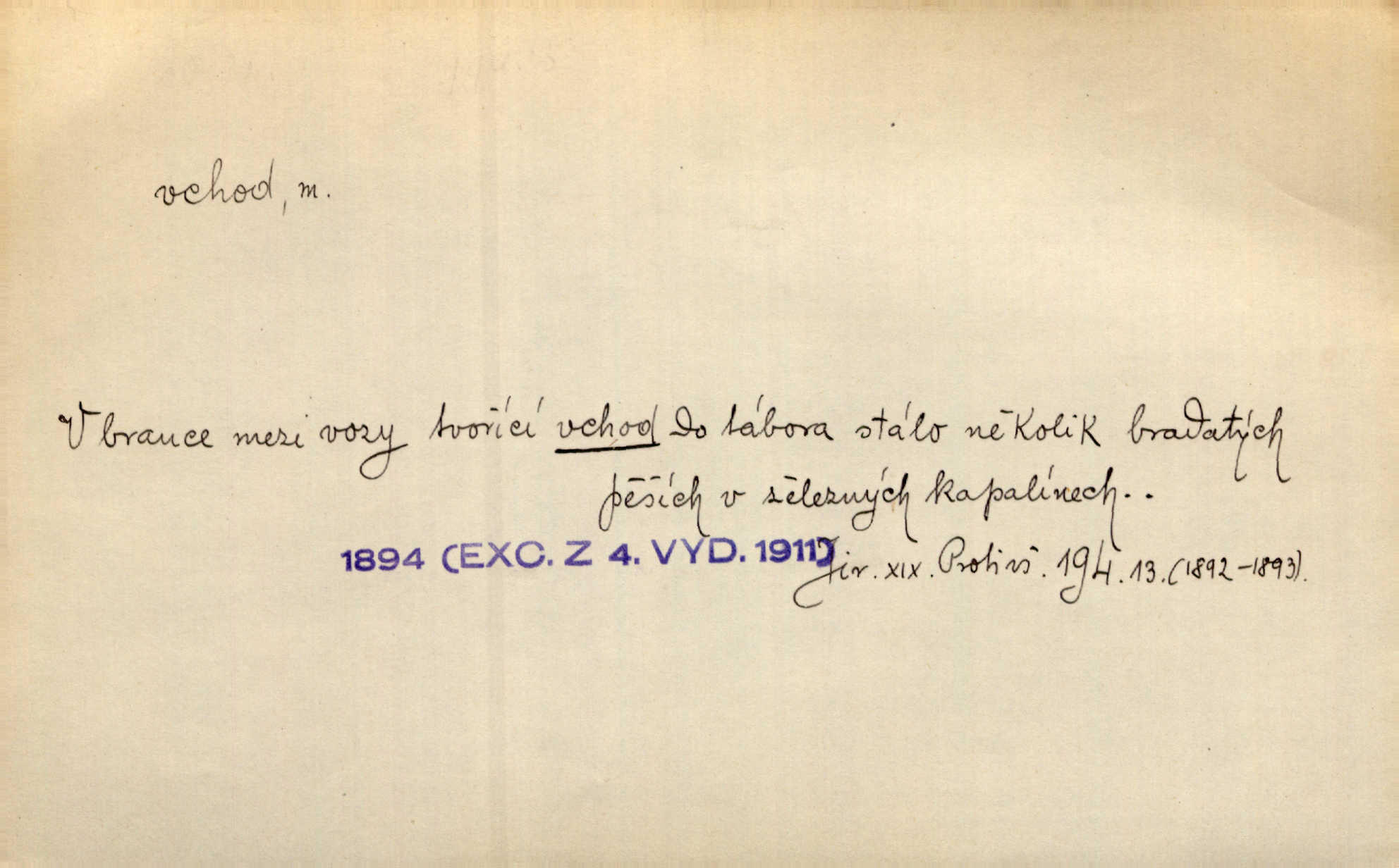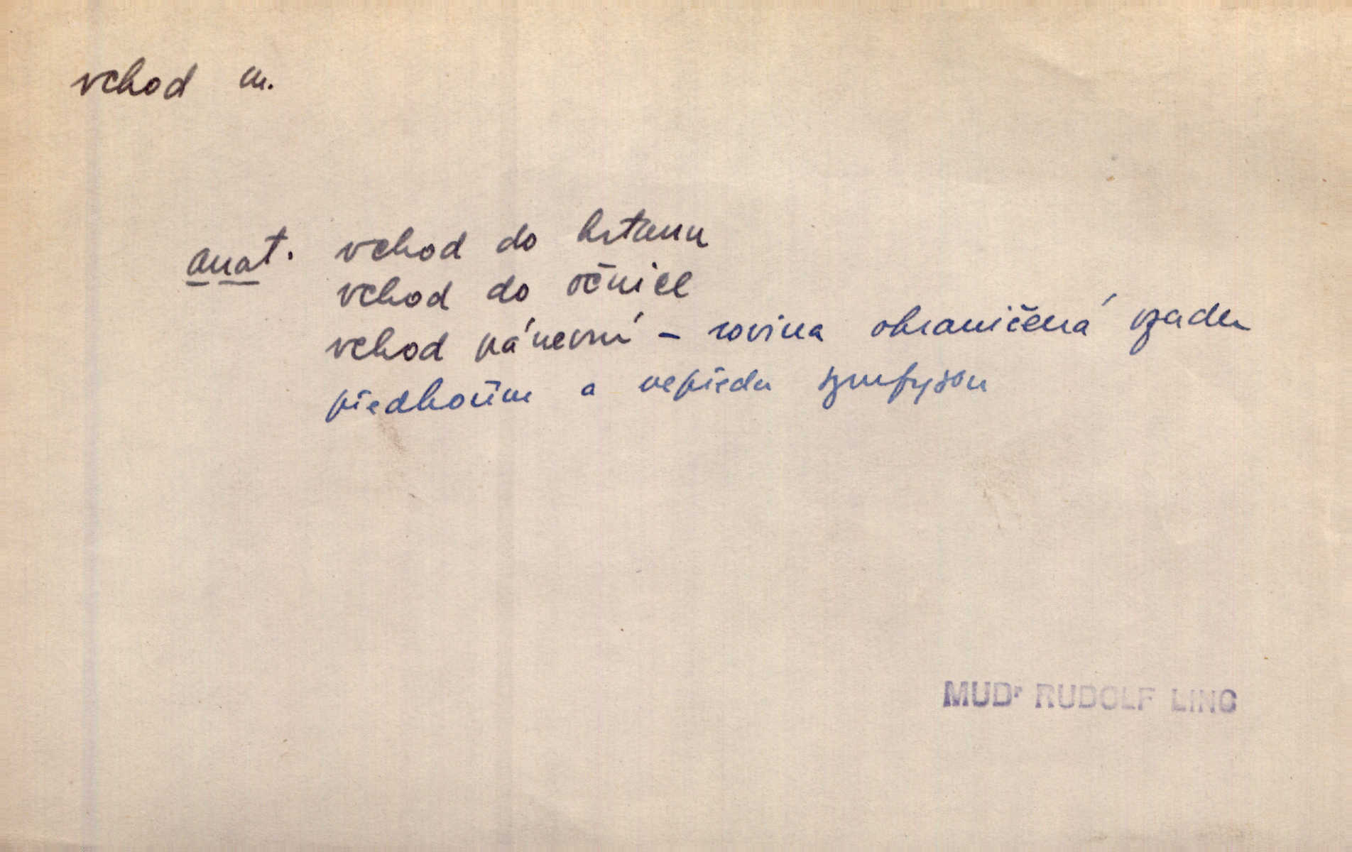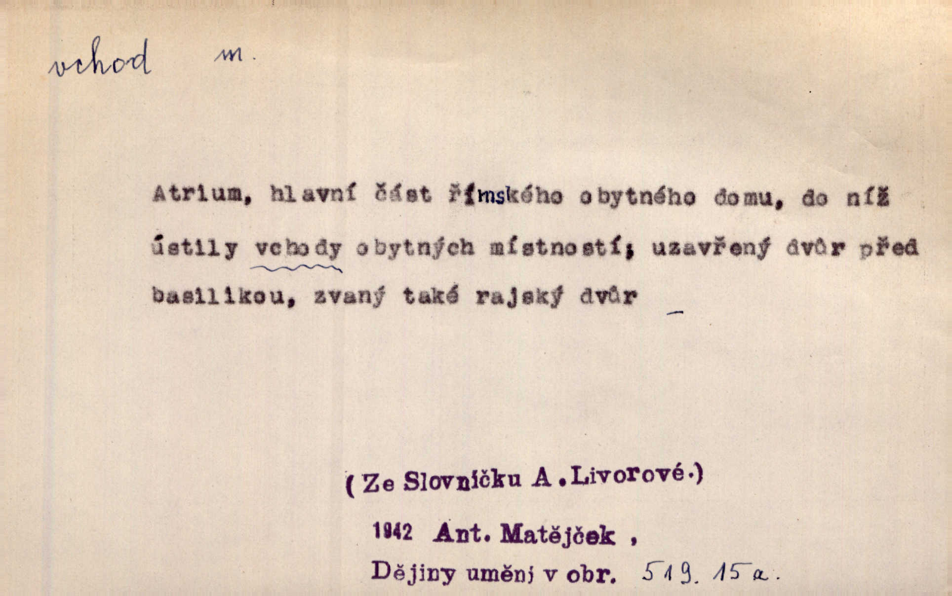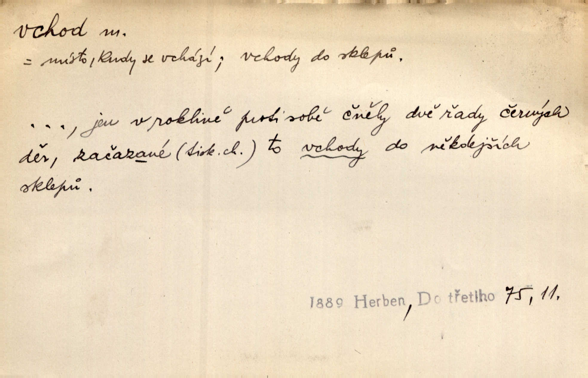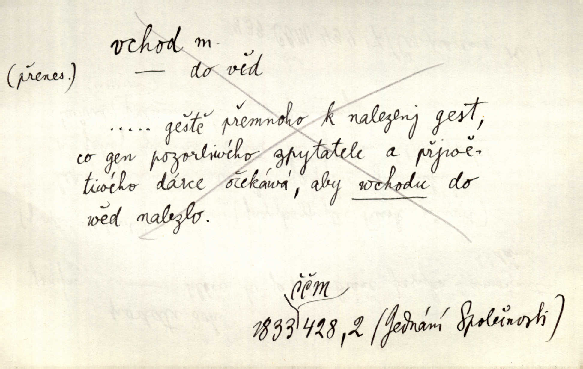 - vchod, -u m. místo, kudy se někam vchází. Zvolnili ze slušnosti běh a poklonili se před vchodem, jako by sám vladař stál na prahu. Vanč. Nebylo nikoho, kdo by na okamžik nebyl postál před vchodem. Ben. Opona, která zastírala vchod, teď se vůbec nespouštěla. Herrm. Ten bydlel v přízemí, vchod k němu byl naprosto volný. Šmil. Brána má dva vchody: větší (vrata) pro povozy, a vrátka (dvírce) pro pěší. Jir. Vchod k [údolí] s orlem v oblacích sup hlídá. Vrch. Nízký je vchod do jezevčího toho hnízda otvor. A. Mrš. Anat. vchod pánevní; vchod do hrtanu, vchod do očnice. D Řidč. vstup, vejití dovnitř. Při mém vchodu zavřela knihu a položila ji na stůl. Zey. Josef zabraňuje Kačerovi, jejž od zadu František zdržuje, vchod. Ner. D Poněk. zast. úvod, začátek. Sem patří některé verše z vchodu básně, Hřbitov o dušičkách. J. Han. Ale to není celá báseň, je to jen „vchod“, t. j. prolog. Jir. Dříve než muzikanti přehráli vchod, dala se mi má vyvolená do silného kýchání. Prav.