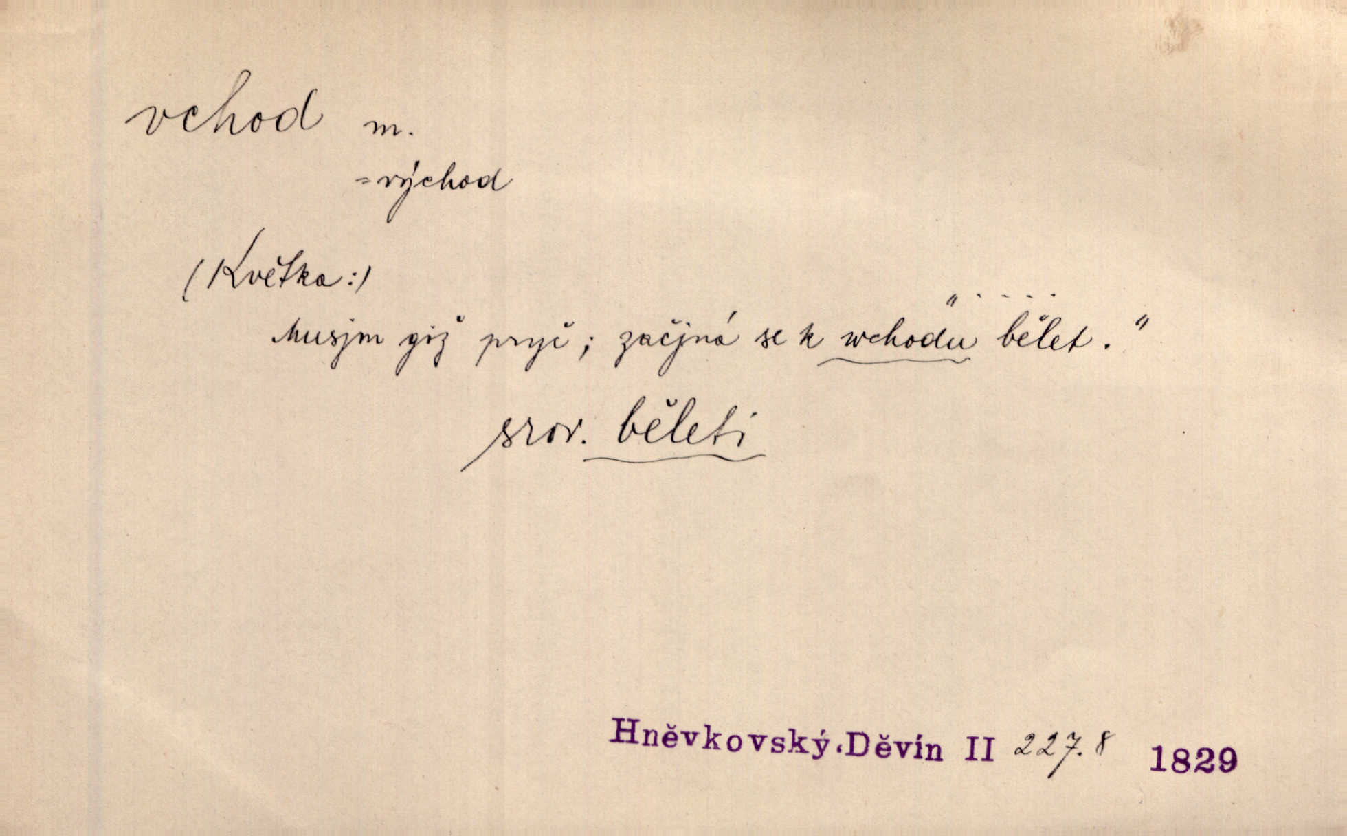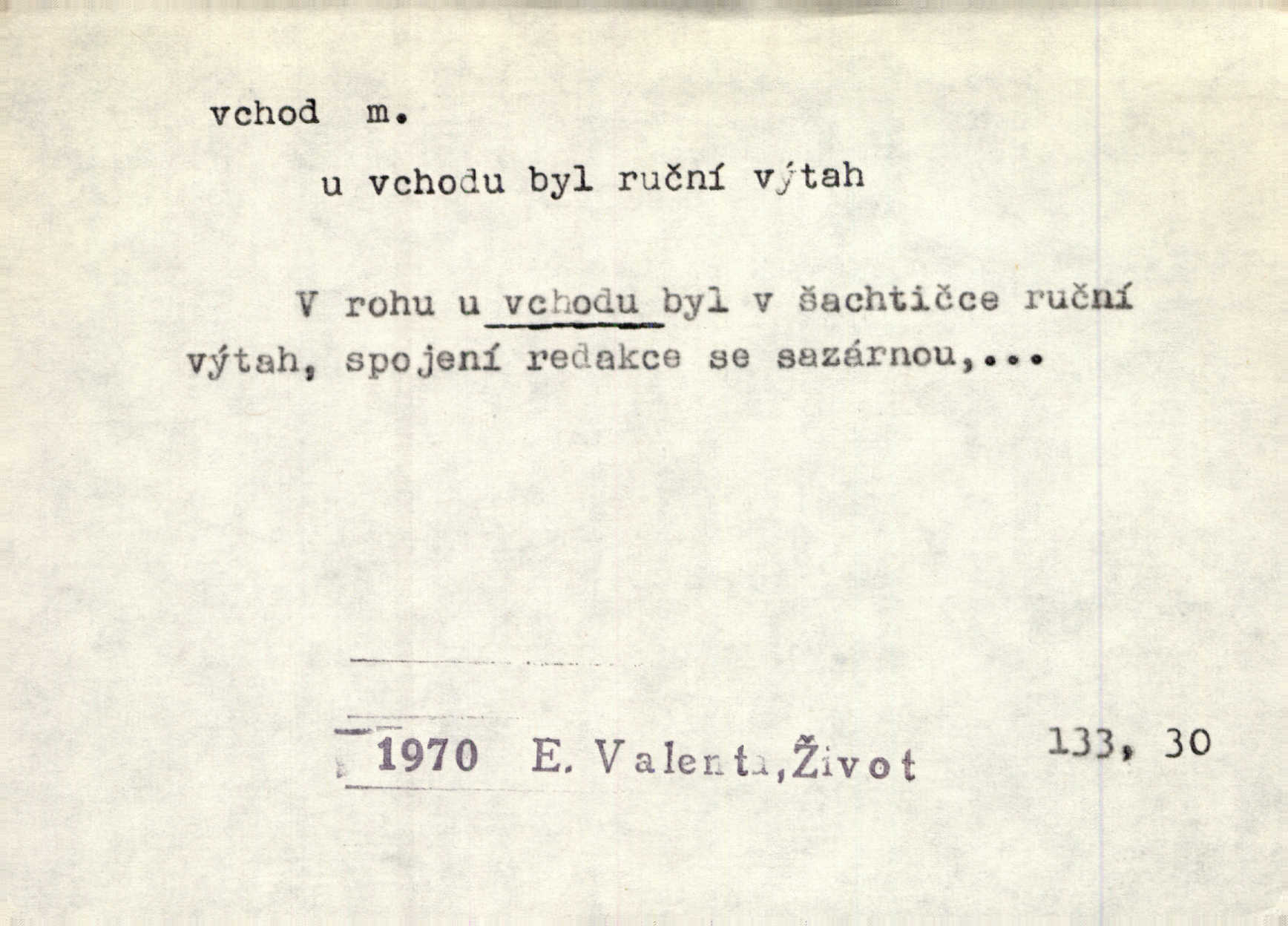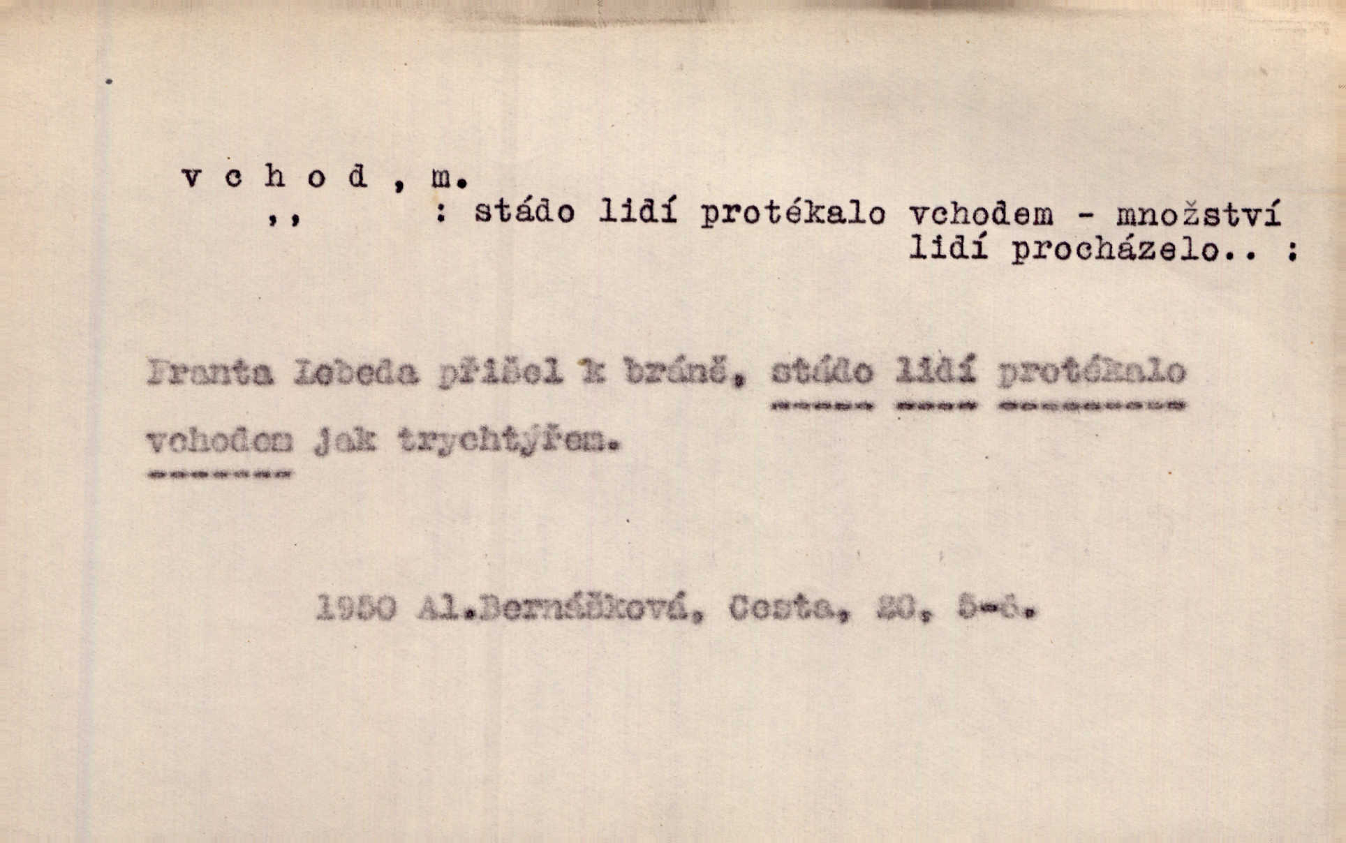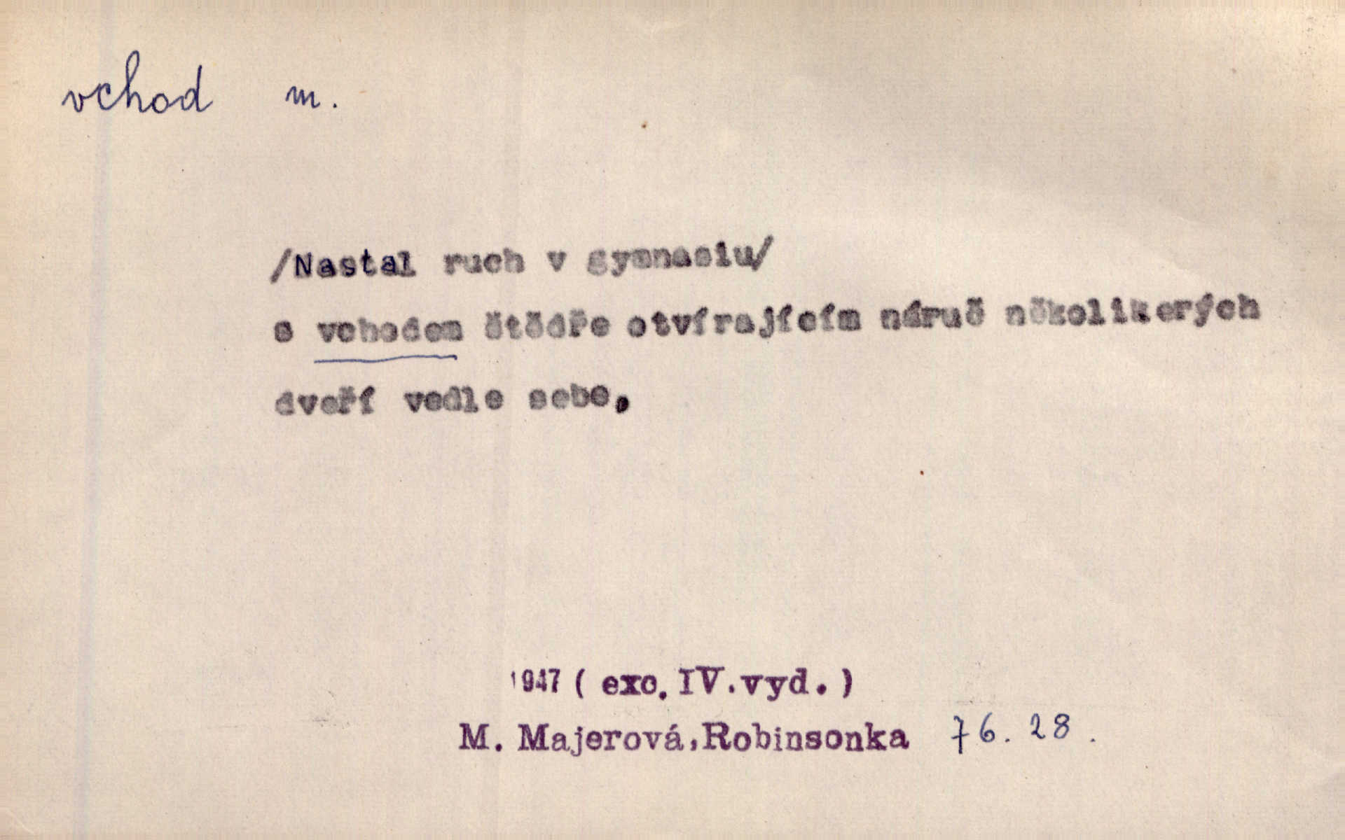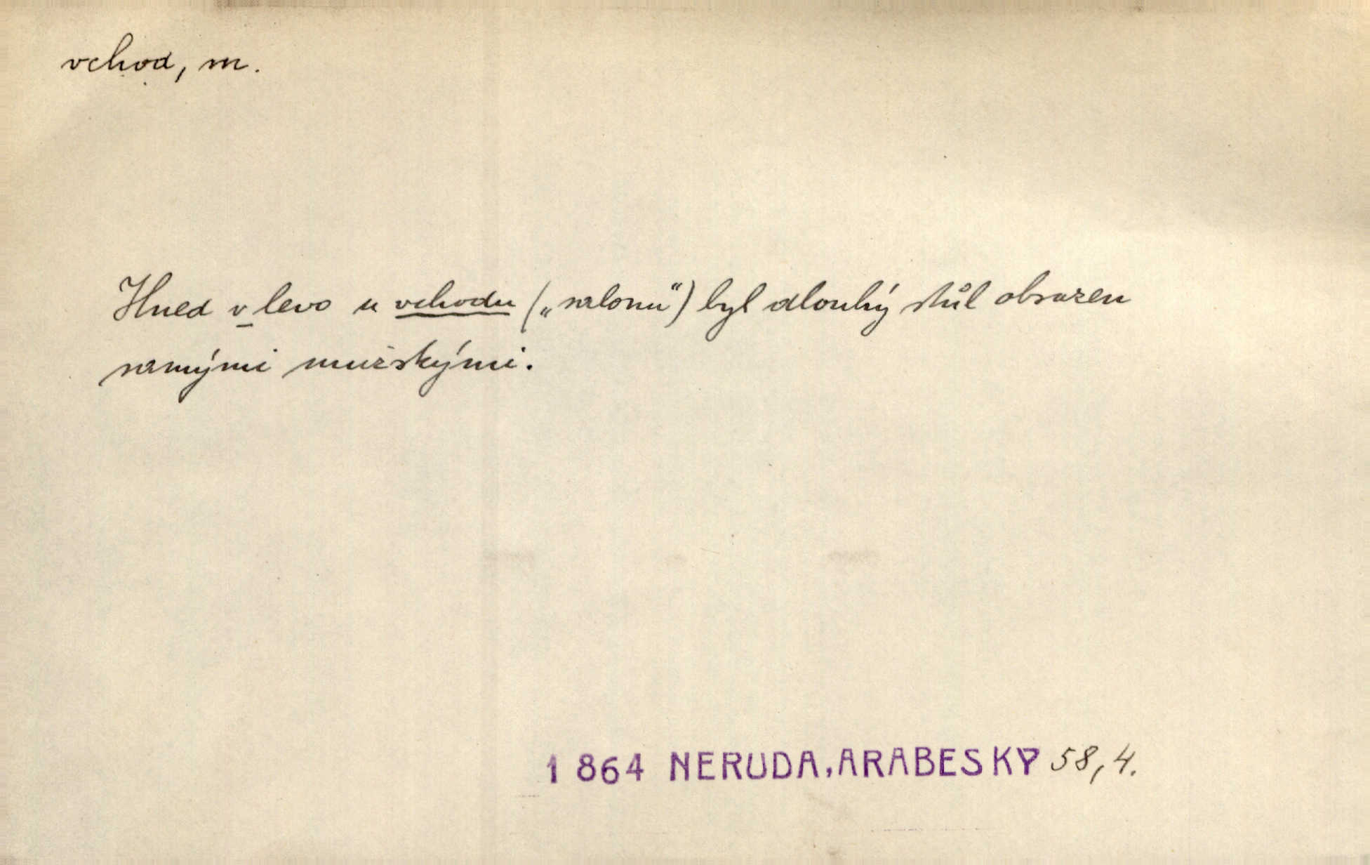 - vchod, -u m. místo, kudy se někam vchází. Zvolnili ze slušnosti běh a poklonili se před vchodem, jako by sám vladař stál na prahu. Vanč. Nebylo nikoho, kdo by na okamžik nebyl postál před vchodem. Ben. Opona, která zastírala vchod, teď se vůbec nespouštěla. Herrm. Ten bydlel v přízemí, vchod k němu byl naprosto volný. Šmil. Brána má dva vchody: větší (vrata) pro povozy, a vrátka (dvírce) pro pěší. Jir. Vchod k [údolí] s orlem v oblacích sup hlídá. Vrch. Nízký je vchod do jezevčího toho hnízda otvor. A. Mrš. Anat. vchod pánevní; vchod do hrtanu, vchod do očnice. D Řidč. vstup, vejití dovnitř. Při mém vchodu zavřela knihu a položila ji na stůl. Zey. Josef zabraňuje Kačerovi, jejž od zadu František zdržuje, vchod. Ner. D Poněk. zast. úvod, začátek. Sem patří některé verše z vchodu básně, Hřbitov o dušičkách. J. Han. Ale to není celá báseň, je to jen „vchod“, t. j. prolog. Jir. Dříve než muzikanti přehráli vchod, dala se mi má vyvolená do silného kýchání. Prav.