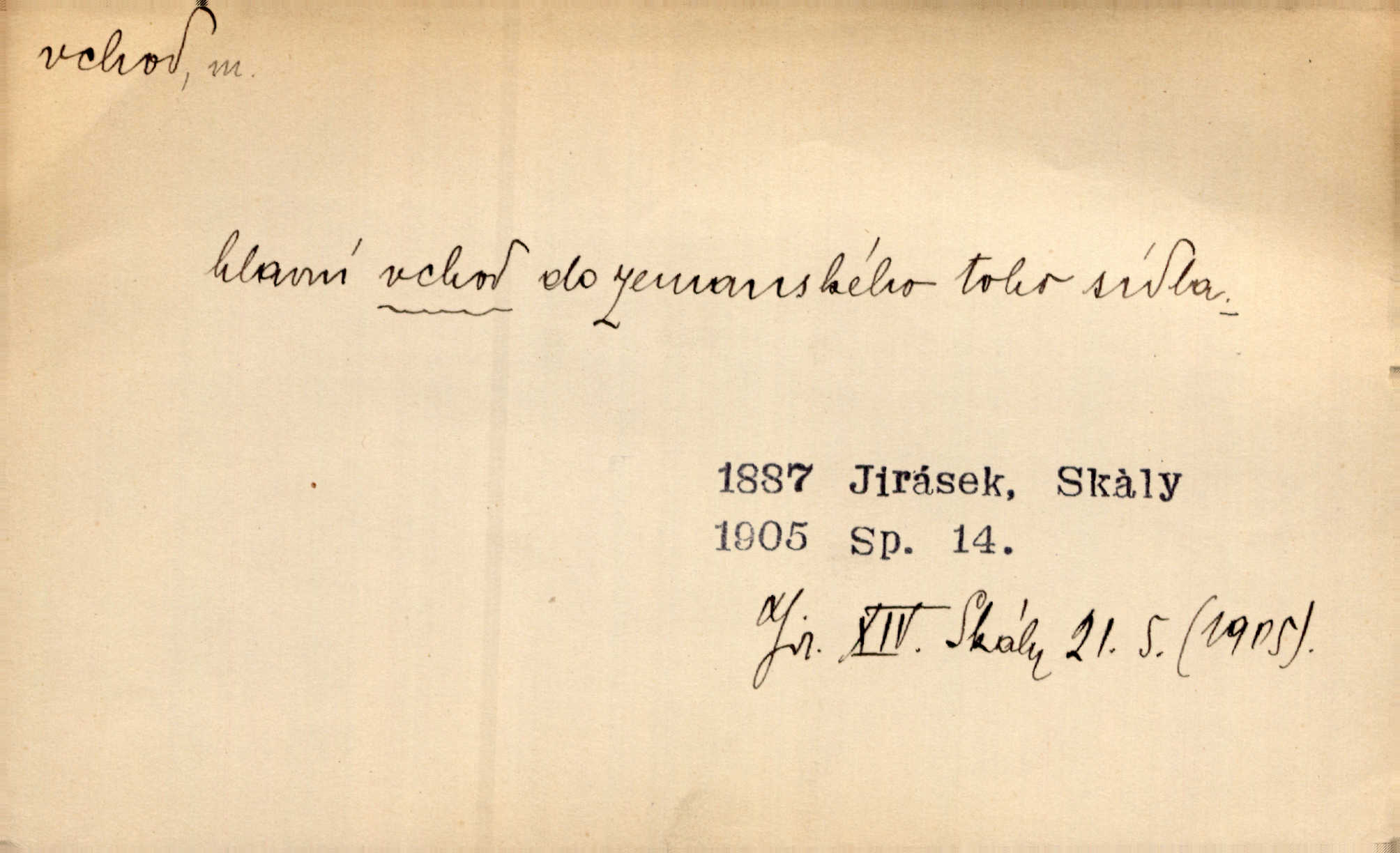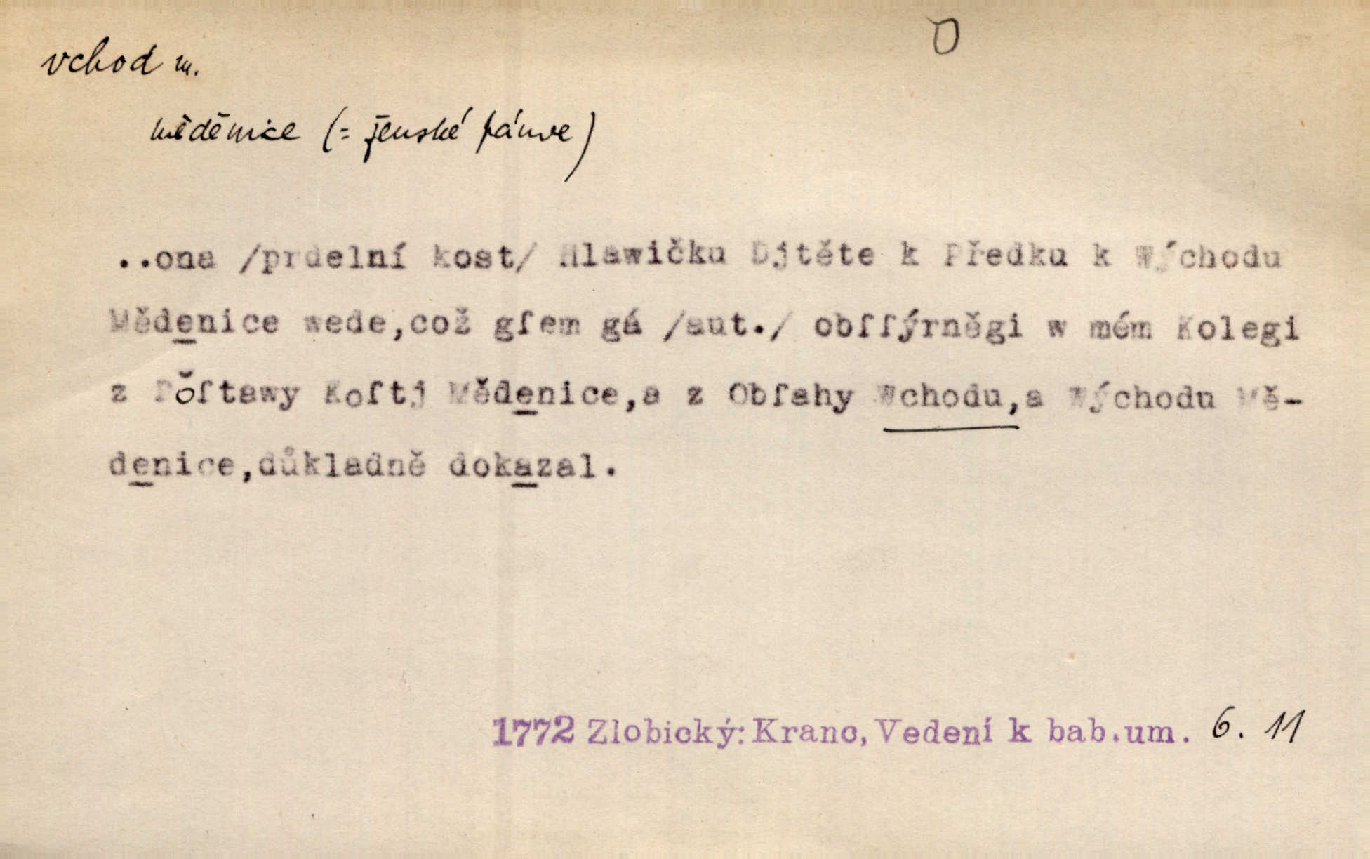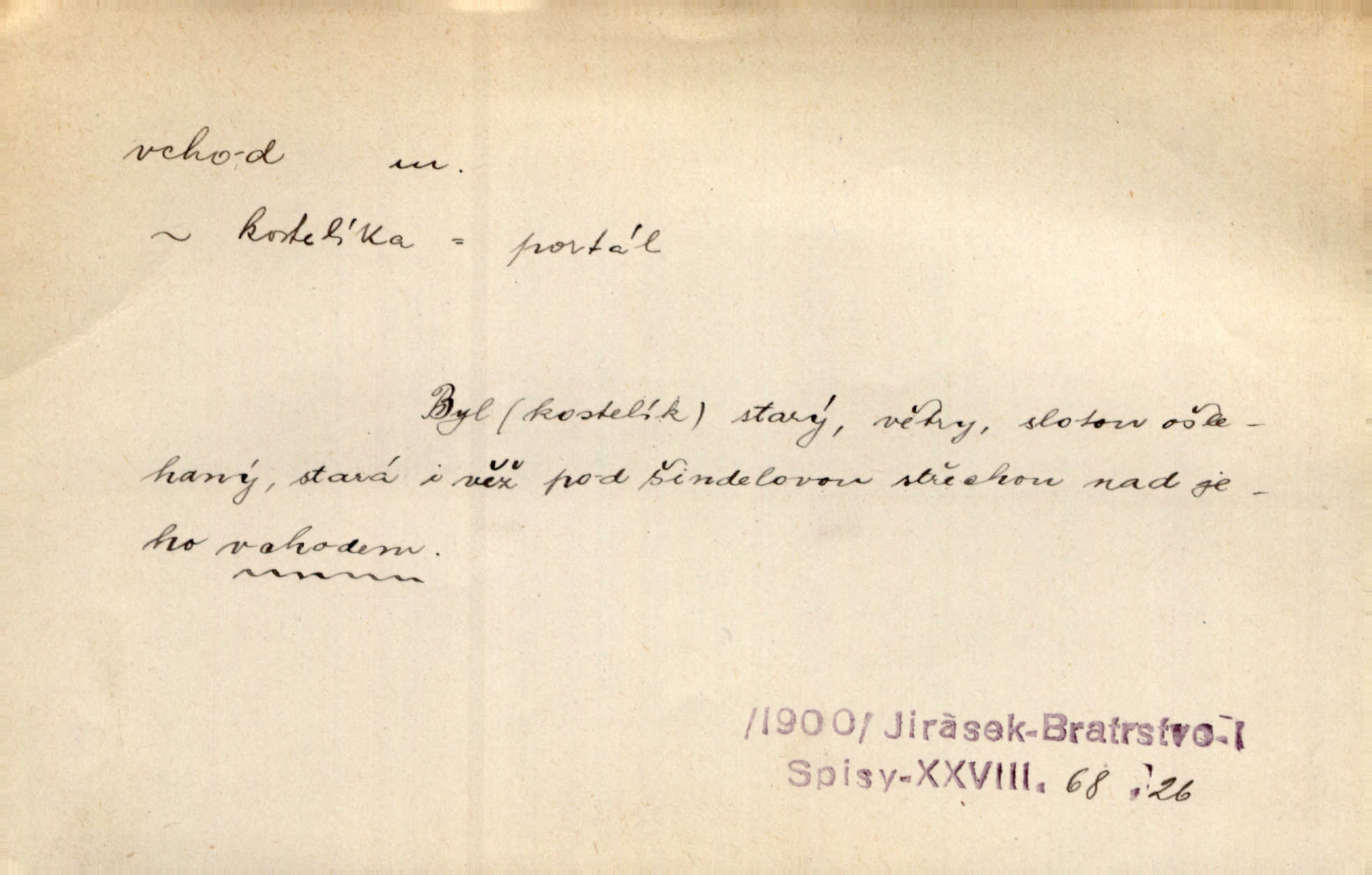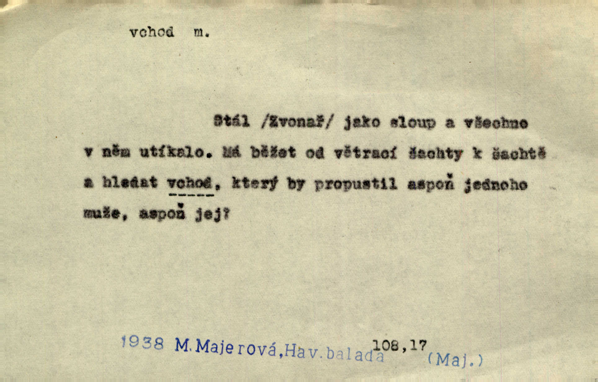 - vchod, -u m. místo, kudy se někam vchází. Zvolnili ze slušnosti běh a poklonili se před vchodem, jako by sám vladař stál na prahu. Vanč. Nebylo nikoho, kdo by na okamžik nebyl postál před vchodem. Ben. Opona, která zastírala vchod, teď se vůbec nespouštěla. Herrm. Ten bydlel v přízemí, vchod k němu byl naprosto volný. Šmil. Brána má dva vchody: větší (vrata) pro povozy, a vrátka (dvírce) pro pěší. Jir. Vchod k [údolí] s orlem v oblacích sup hlídá. Vrch. Nízký je vchod do jezevčího toho hnízda otvor. A. Mrš. Anat. vchod pánevní; vchod do hrtanu, vchod do očnice. D Řidč. vstup, vejití dovnitř. Při mém vchodu zavřela knihu a položila ji na stůl. Zey. Josef zabraňuje Kačerovi, jejž od zadu František zdržuje, vchod. Ner. D Poněk. zast. úvod, začátek. Sem patří některé verše z vchodu básně, Hřbitov o dušičkách. J. Han. Ale to není celá báseň, je to jen „vchod“, t. j. prolog. Jir. Dříve než muzikanti přehráli vchod, dala se mi má vyvolená do silného kýchání. Prav.