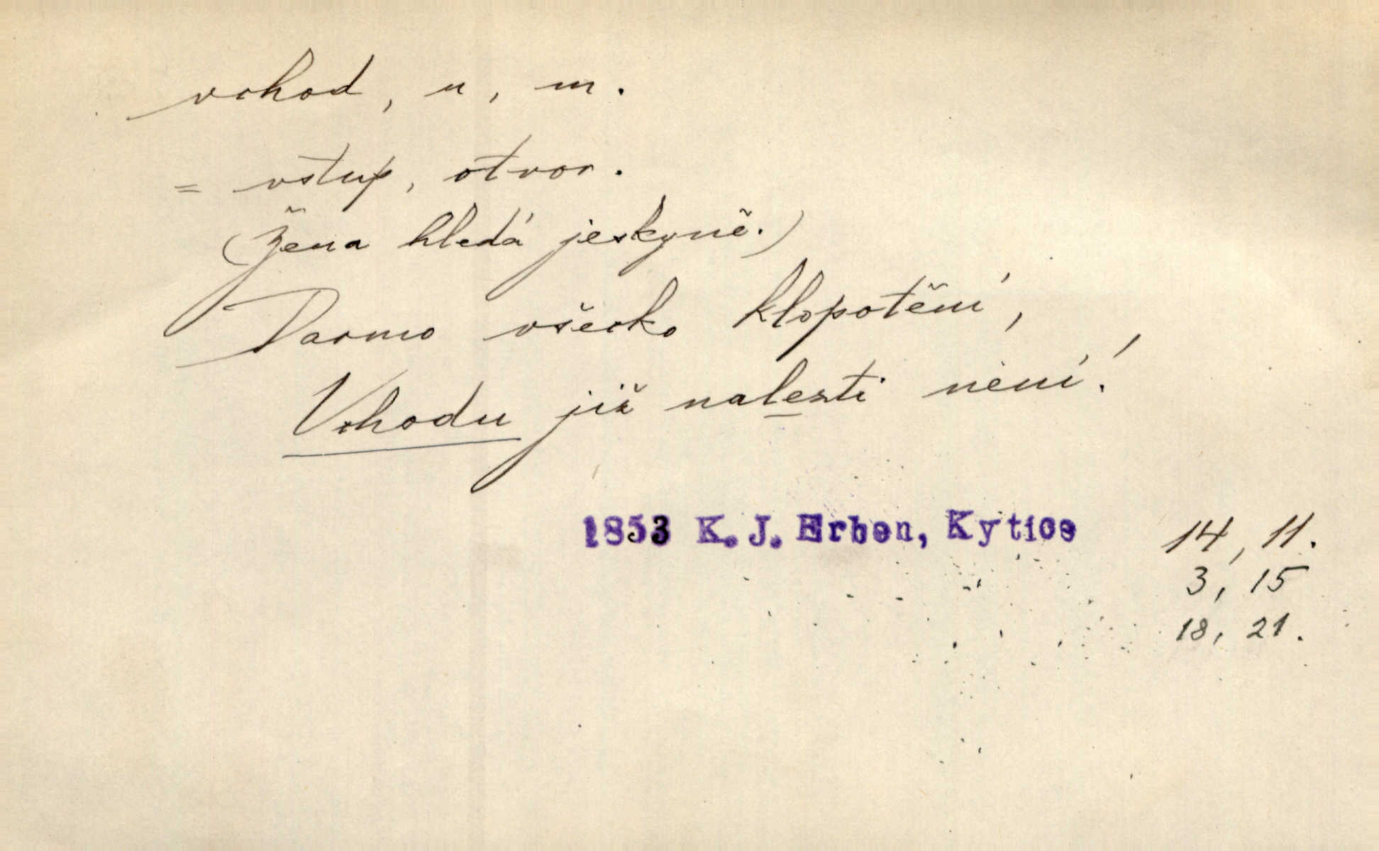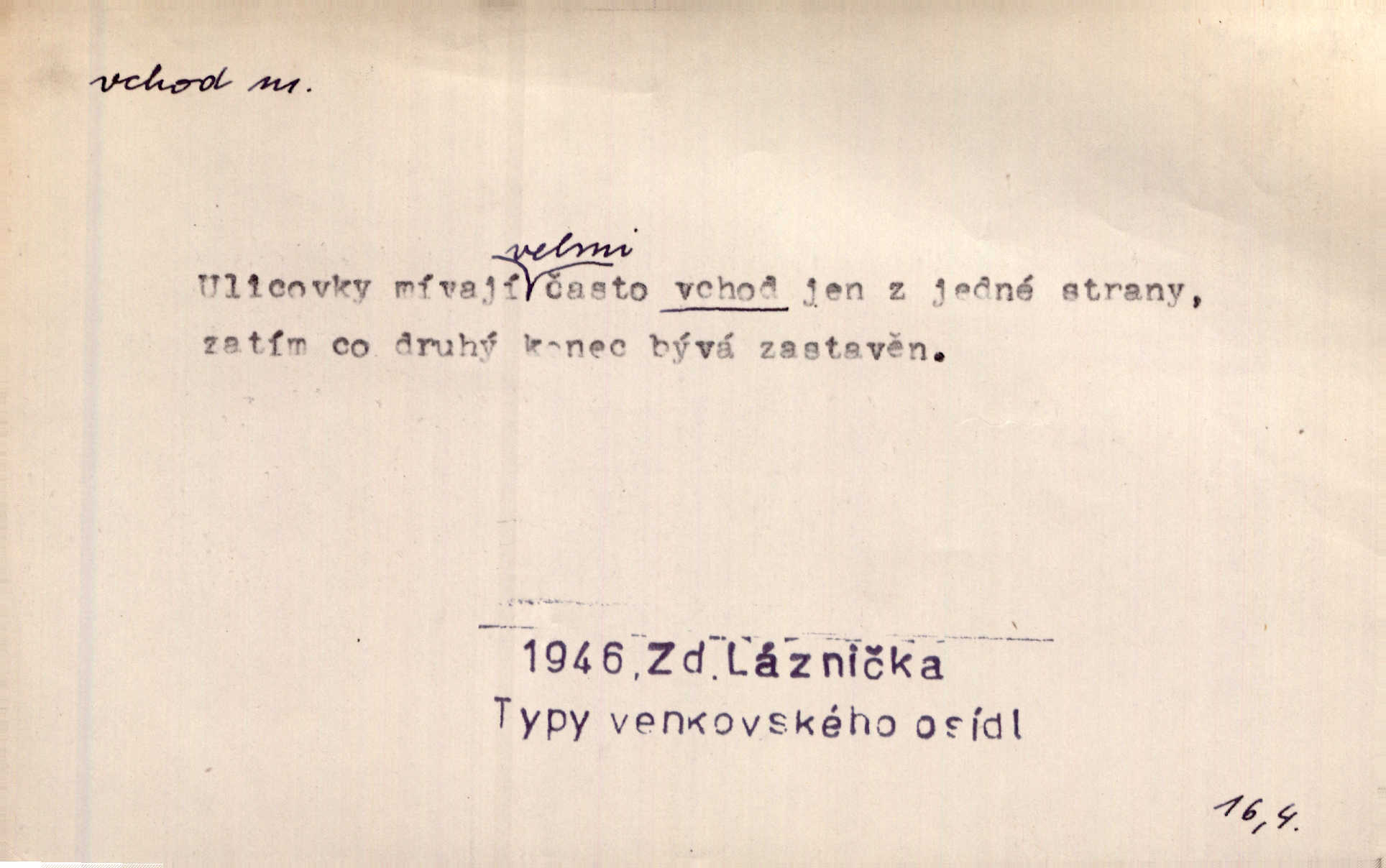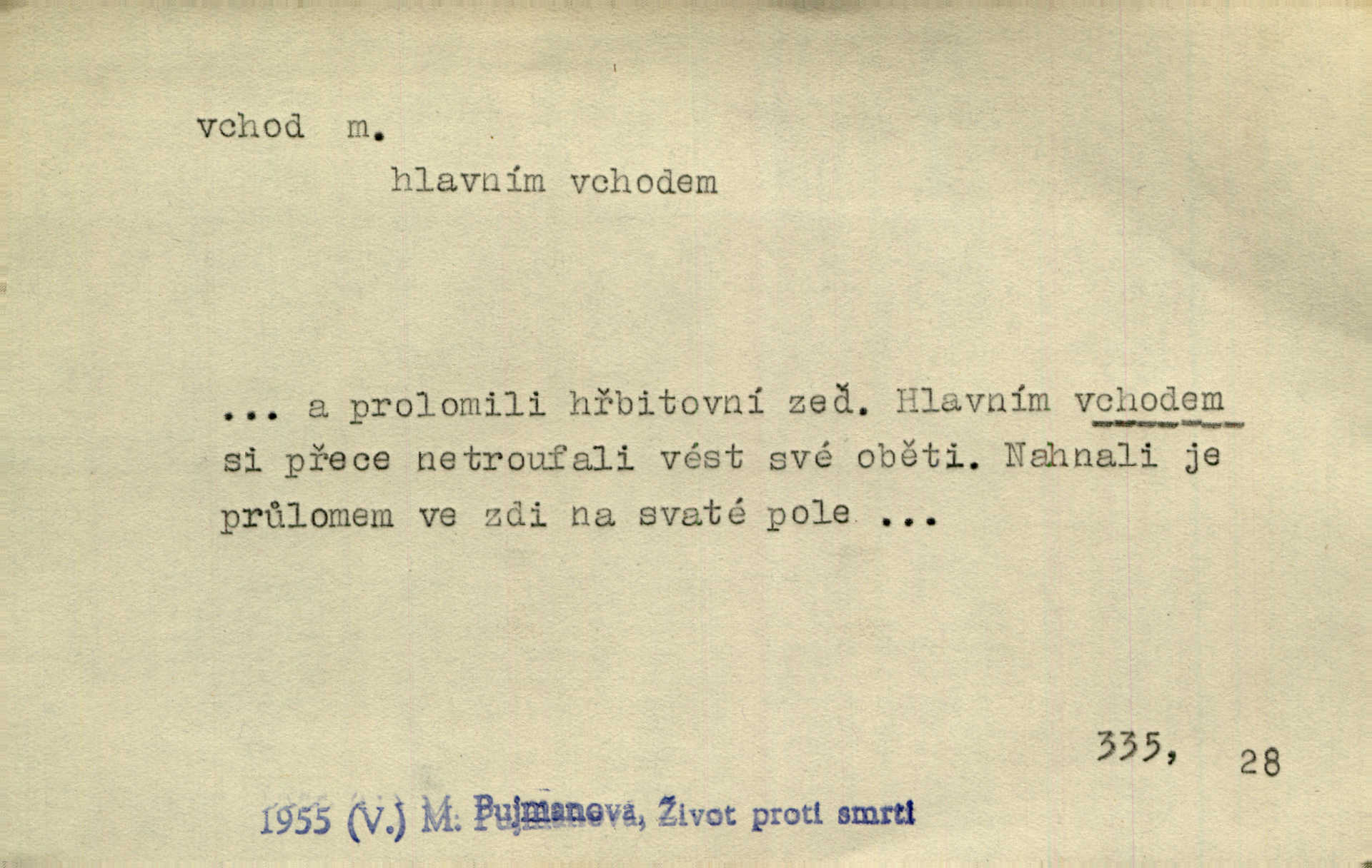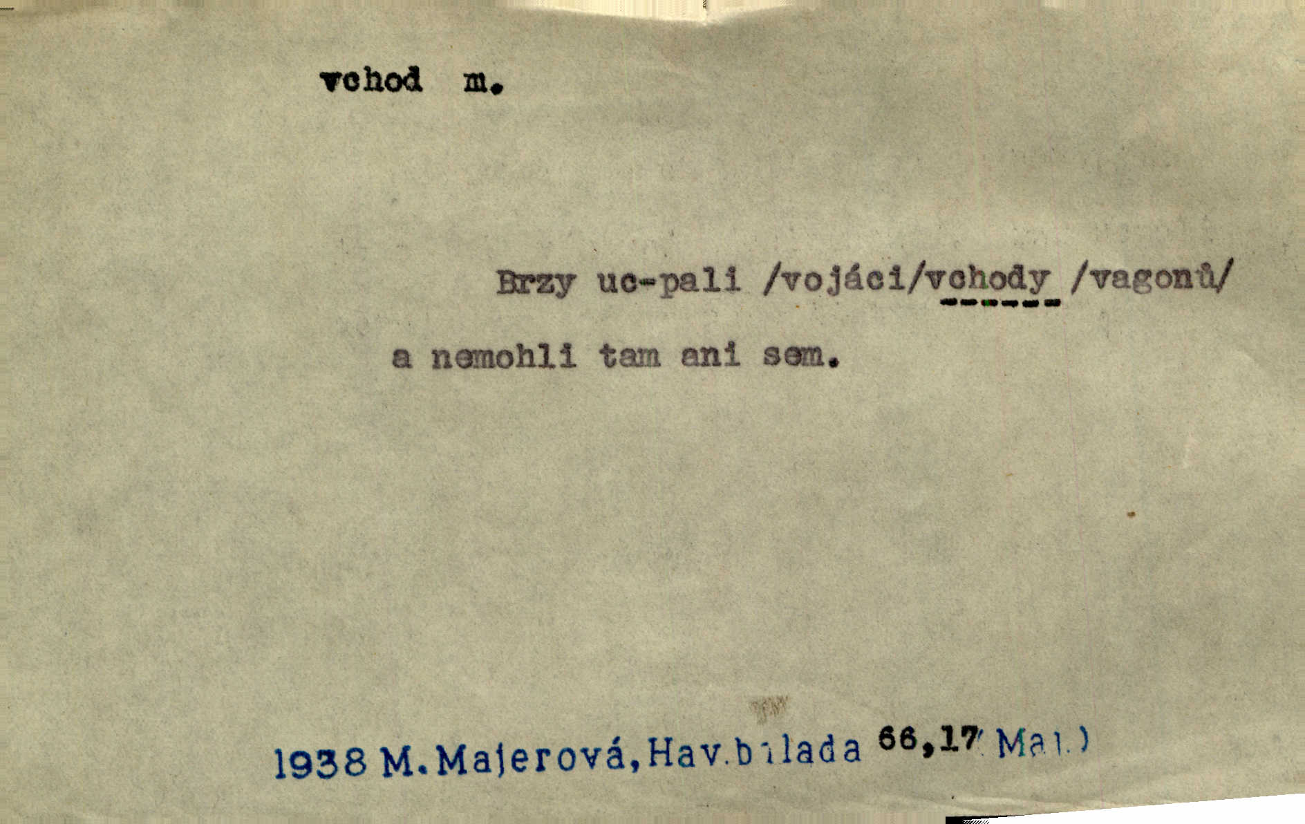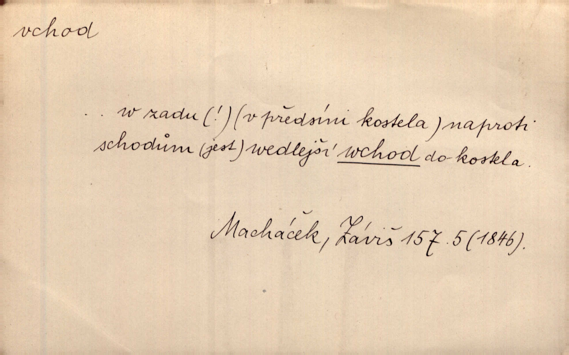 - vchod, -u m. místo, kudy se někam vchází. Zvolnili ze slušnosti běh a poklonili se před vchodem, jako by sám vladař stál na prahu. Vanč. Nebylo nikoho, kdo by na okamžik nebyl postál před vchodem. Ben. Opona, která zastírala vchod, teď se vůbec nespouštěla. Herrm. Ten bydlel v přízemí, vchod k němu byl naprosto volný. Šmil. Brána má dva vchody: větší (vrata) pro povozy, a vrátka (dvírce) pro pěší. Jir. Vchod k [údolí] s orlem v oblacích sup hlídá. Vrch. Nízký je vchod do jezevčího toho hnízda otvor. A. Mrš. Anat. vchod pánevní; vchod do hrtanu, vchod do očnice. D Řidč. vstup, vejití dovnitř. Při mém vchodu zavřela knihu a položila ji na stůl. Zey. Josef zabraňuje Kačerovi, jejž od zadu František zdržuje, vchod. Ner. D Poněk. zast. úvod, začátek. Sem patří některé verše z vchodu básně, Hřbitov o dušičkách. J. Han. Ale to není celá báseň, je to jen „vchod“, t. j. prolog. Jir. Dříve než muzikanti přehráli vchod, dala se mi má vyvolená do silného kýchání. Prav.