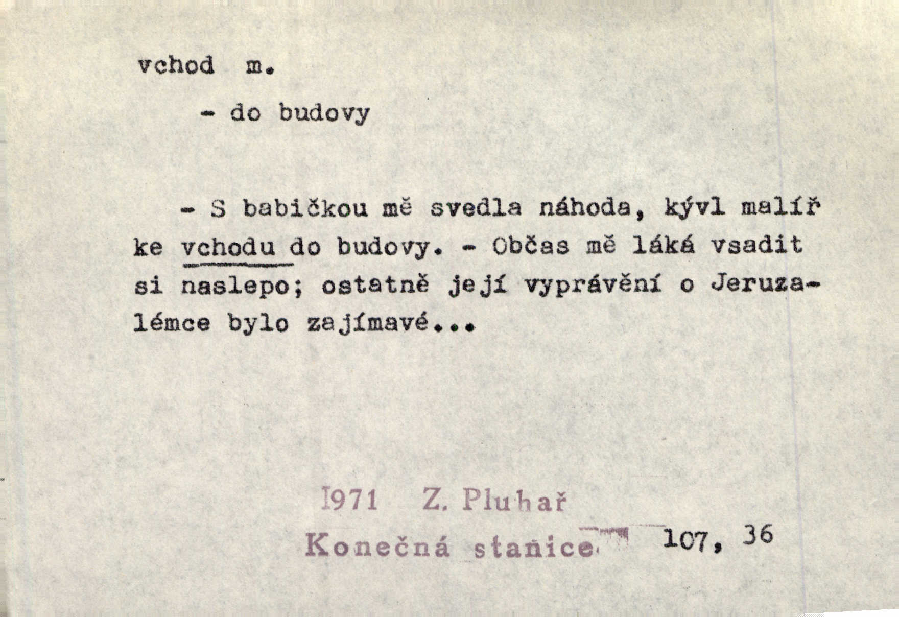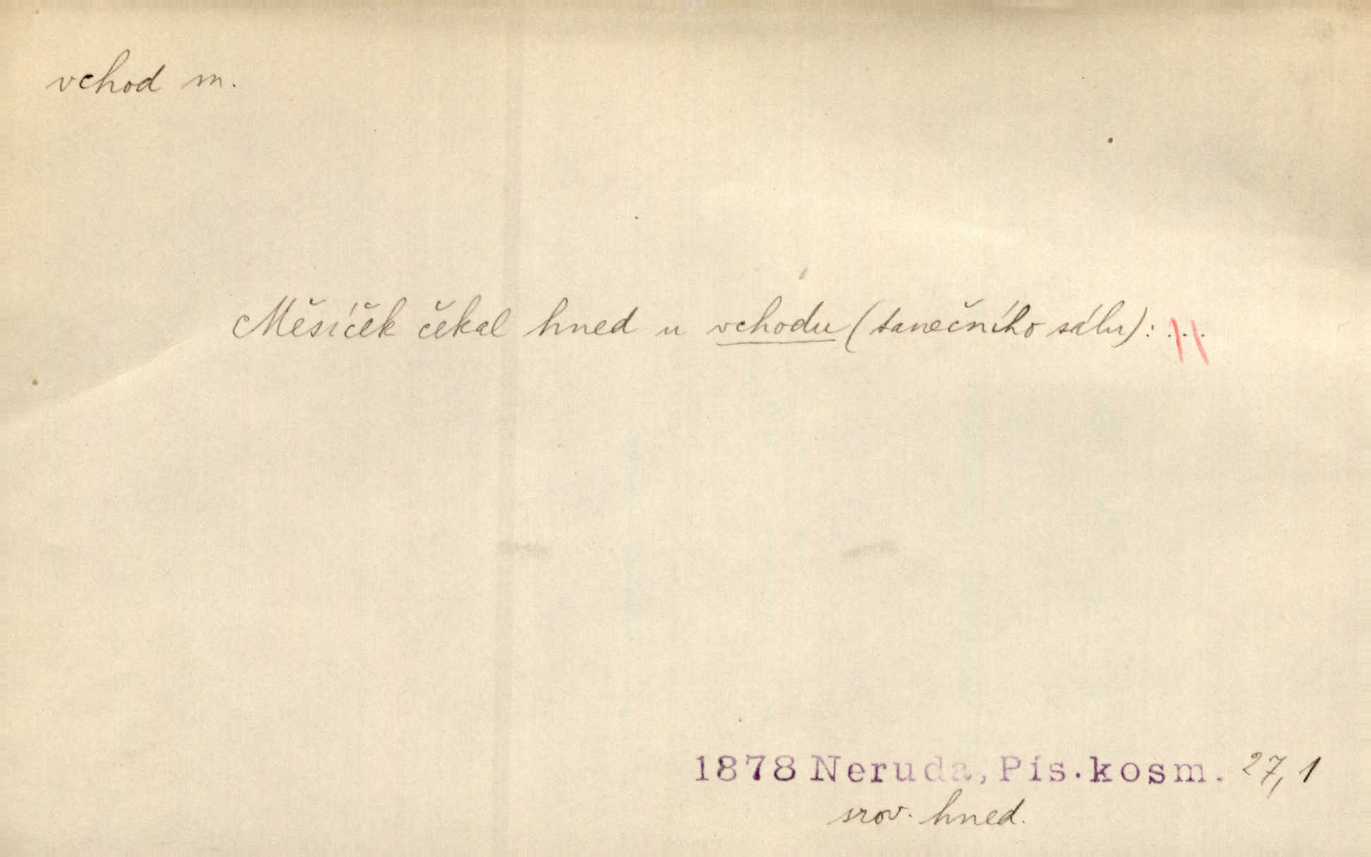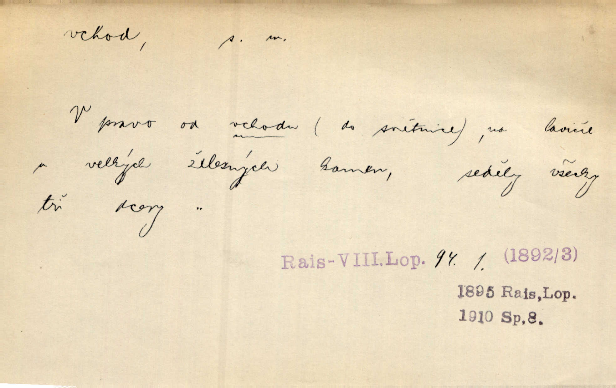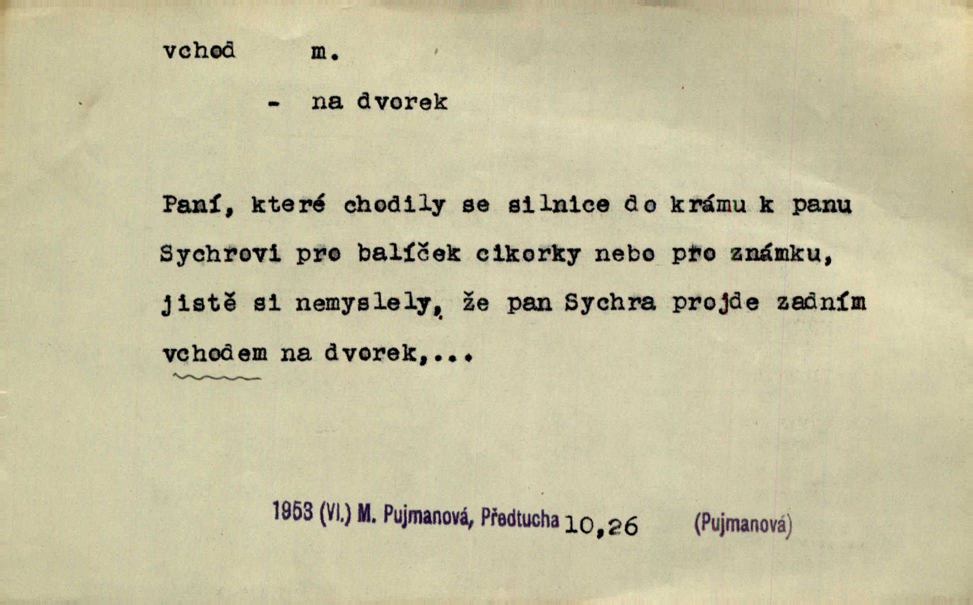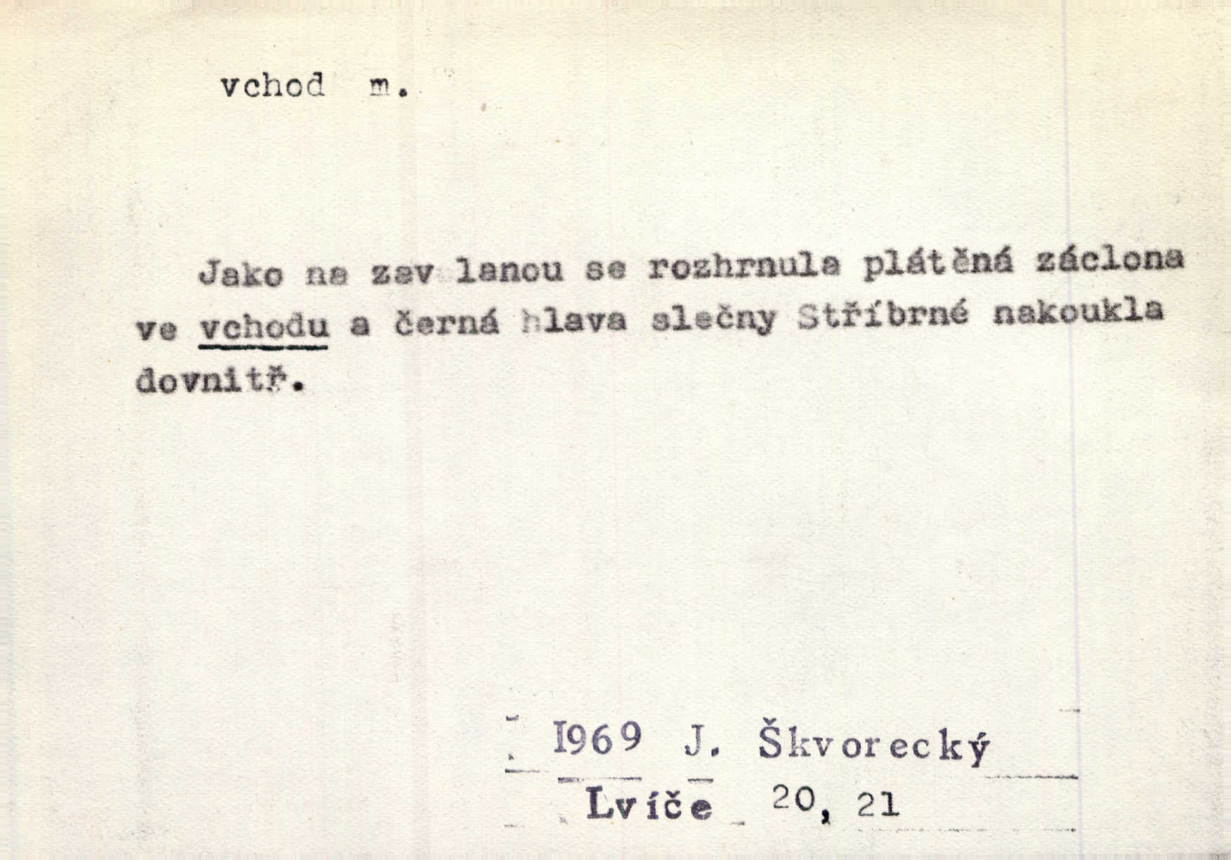 - vchod, -u m. místo, kudy se někam vchází. Zvolnili ze slušnosti běh a poklonili se před vchodem, jako by sám vladař stál na prahu. Vanč. Nebylo nikoho, kdo by na okamžik nebyl postál před vchodem. Ben. Opona, která zastírala vchod, teď se vůbec nespouštěla. Herrm. Ten bydlel v přízemí, vchod k němu byl naprosto volný. Šmil. Brána má dva vchody: větší (vrata) pro povozy, a vrátka (dvírce) pro pěší. Jir. Vchod k [údolí] s orlem v oblacích sup hlídá. Vrch. Nízký je vchod do jezevčího toho hnízda otvor. A. Mrš. Anat. vchod pánevní; vchod do hrtanu, vchod do očnice. D Řidč. vstup, vejití dovnitř. Při mém vchodu zavřela knihu a položila ji na stůl. Zey. Josef zabraňuje Kačerovi, jejž od zadu František zdržuje, vchod. Ner. D Poněk. zast. úvod, začátek. Sem patří některé verše z vchodu básně, Hřbitov o dušičkách. J. Han. Ale to není celá báseň, je to jen „vchod“, t. j. prolog. Jir. Dříve než muzikanti přehráli vchod, dala se mi má vyvolená do silného kýchání. Prav.