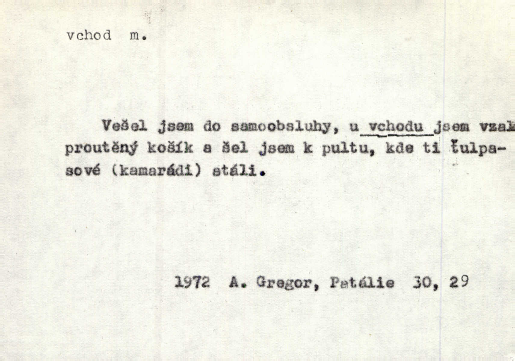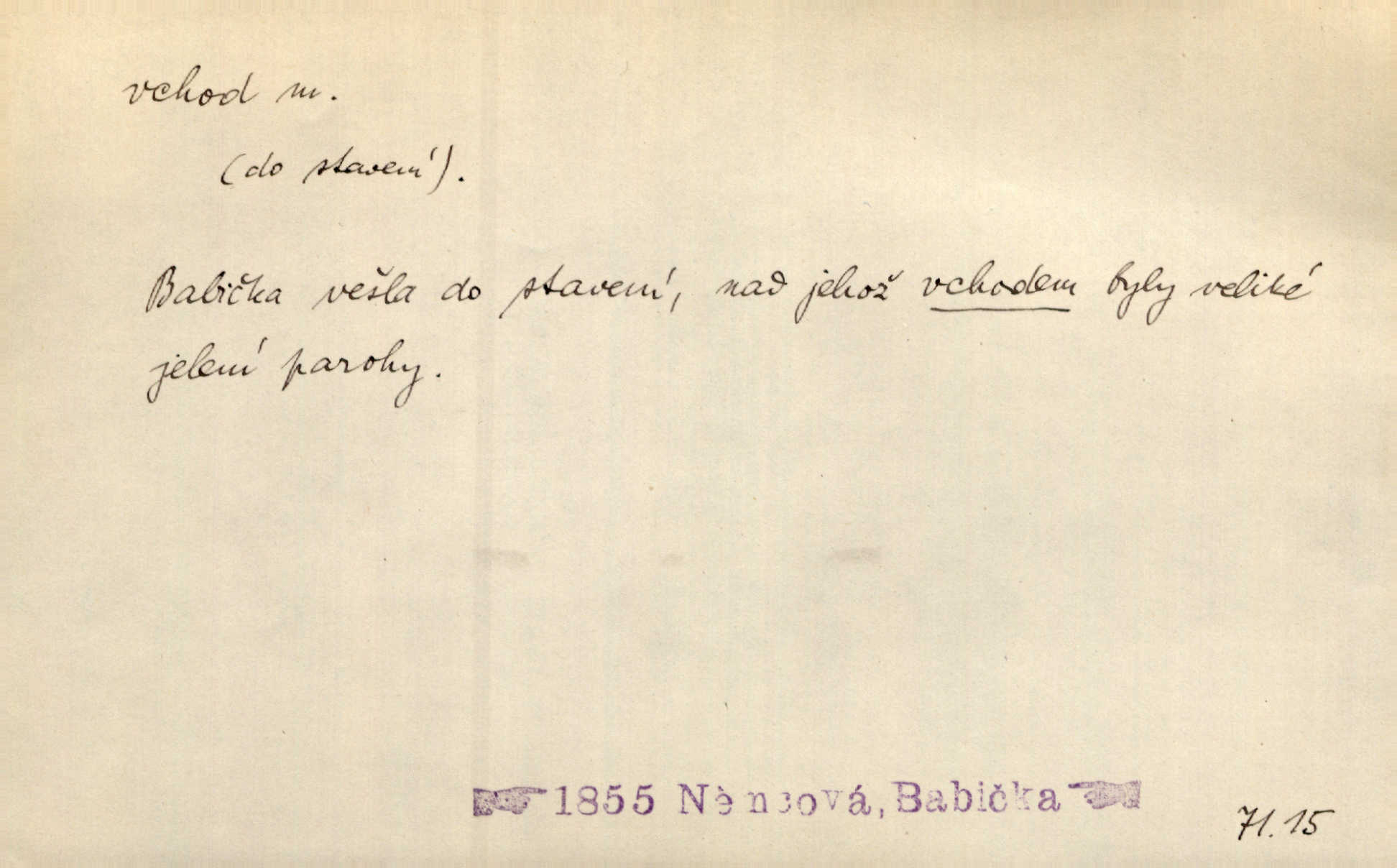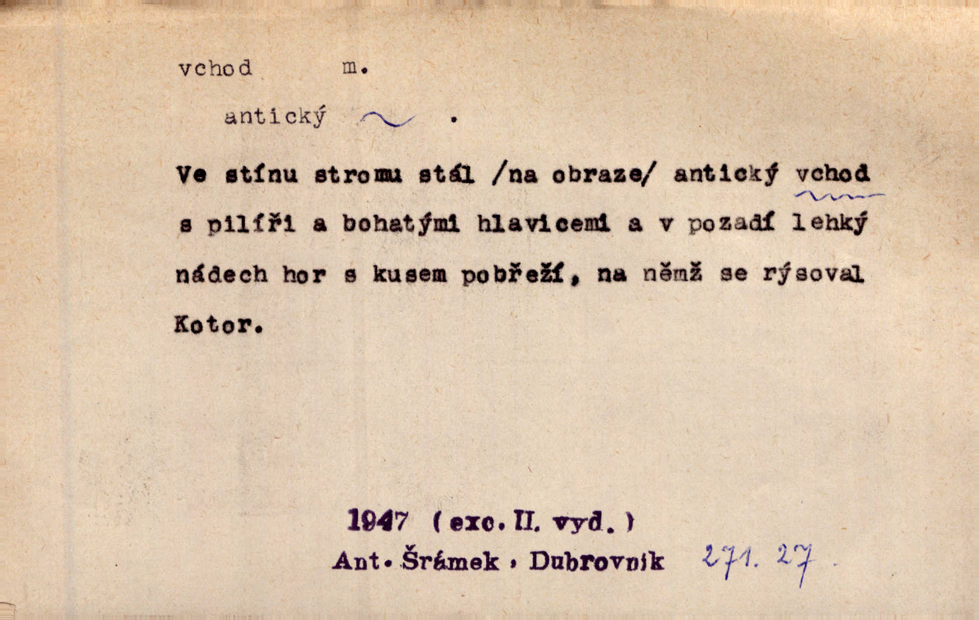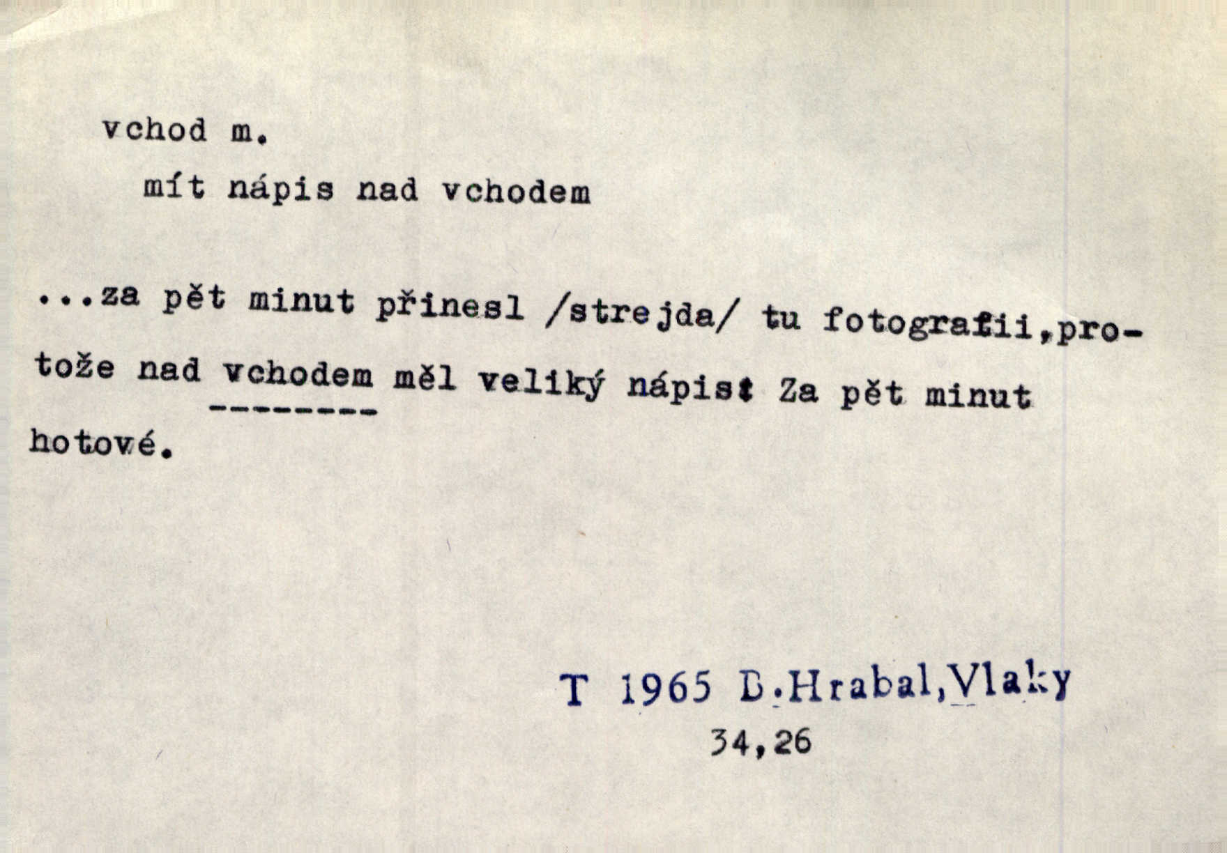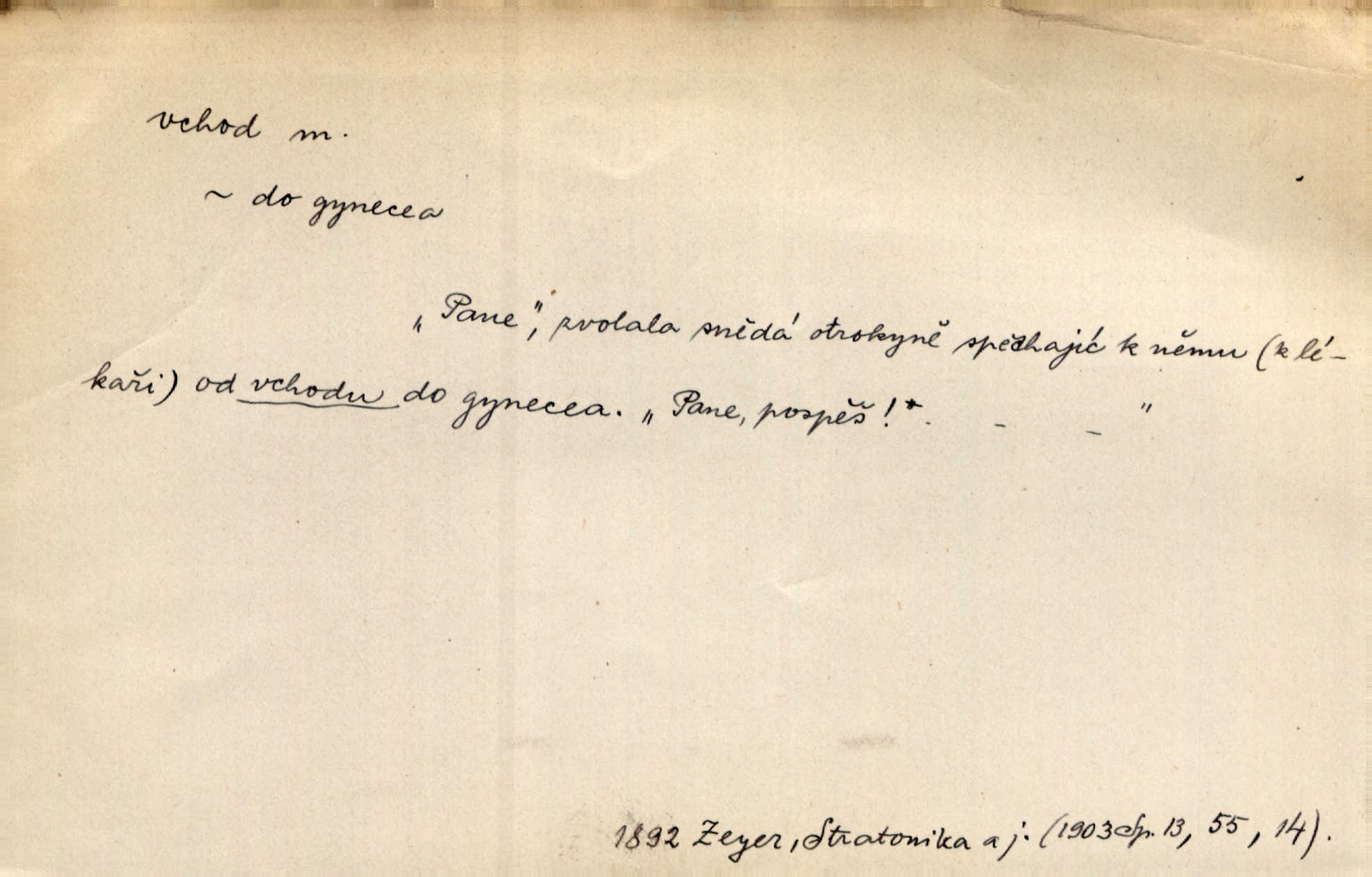 - vchod, -u m. místo, kudy se někam vchází. Zvolnili ze slušnosti běh a poklonili se před vchodem, jako by sám vladař stál na prahu. Vanč. Nebylo nikoho, kdo by na okamžik nebyl postál před vchodem. Ben. Opona, která zastírala vchod, teď se vůbec nespouštěla. Herrm. Ten bydlel v přízemí, vchod k němu byl naprosto volný. Šmil. Brána má dva vchody: větší (vrata) pro povozy, a vrátka (dvírce) pro pěší. Jir. Vchod k [údolí] s orlem v oblacích sup hlídá. Vrch. Nízký je vchod do jezevčího toho hnízda otvor. A. Mrš. Anat. vchod pánevní; vchod do hrtanu, vchod do očnice. D Řidč. vstup, vejití dovnitř. Při mém vchodu zavřela knihu a položila ji na stůl. Zey. Josef zabraňuje Kačerovi, jejž od zadu František zdržuje, vchod. Ner. D Poněk. zast. úvod, začátek. Sem patří některé verše z vchodu básně, Hřbitov o dušičkách. J. Han. Ale to není celá báseň, je to jen „vchod“, t. j. prolog. Jir. Dříve než muzikanti přehráli vchod, dala se mi má vyvolená do silného kýchání. Prav.
