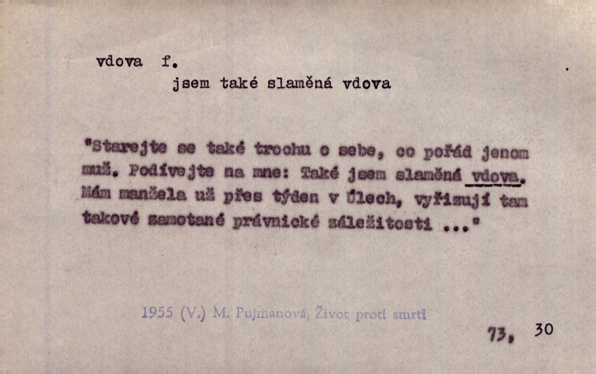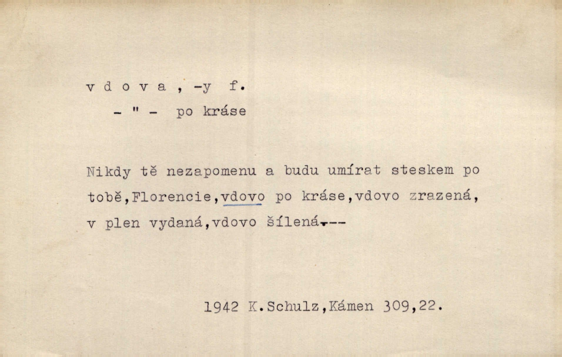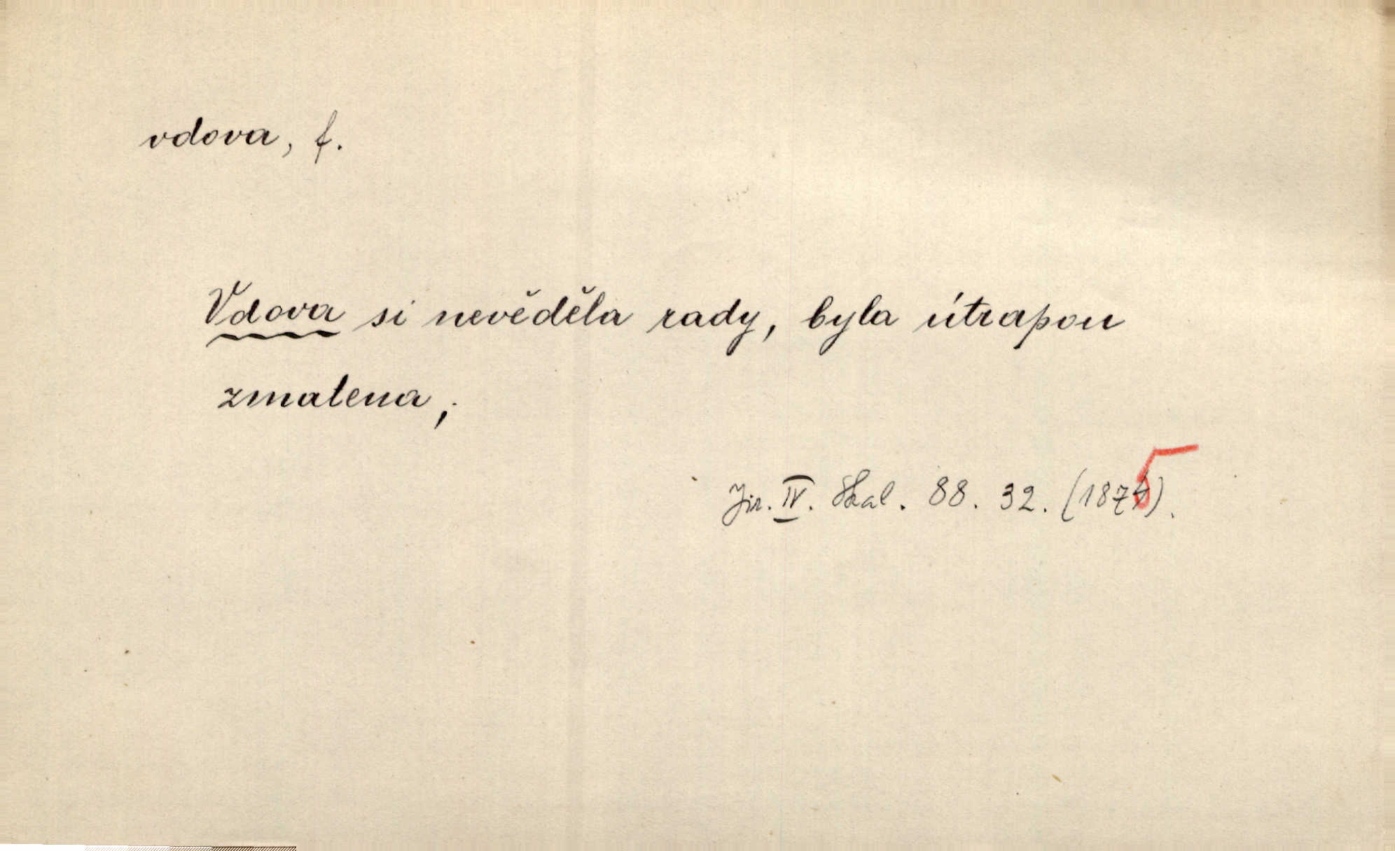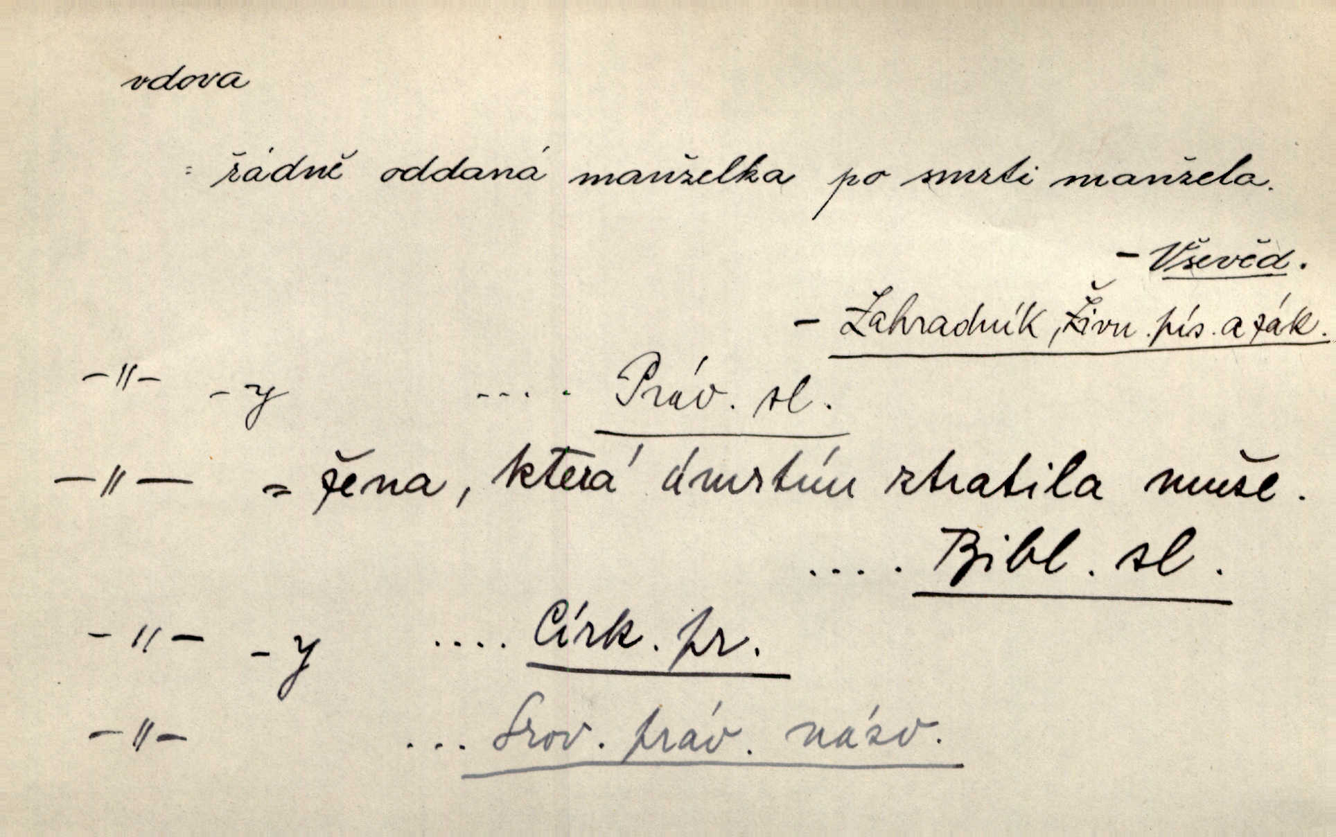 - vdova, -y f. žena, které zemřel manžel. Byla jedna chudá vdova a měla jen jednu dceru. Erb. Přijel, aby smluvil svatební smlouvu mezi polským králem a vdovou po nebožtíku králi Václavovi. Jir. Vůz plný uhlí se v kole je zvrátil. Pod vozem shasla Magdónova vdova. Bezr. Po všechen čas, co byl Šimák v žaláři, chovala se Anežka jako počestná vdova. Šmil. Plačeme(sic!) [ženské] jako vdovy velice. Hol. Na Josefa, říkávají, už i vdovin pluh vyjíždí ze dvora. Hol. Dobrý jako dítě, přispěl [Chocholoušek] často vdoviným grošem tam, kde bída byla příspěvkem nejchudších. Ner. Přen. Večer přehodil zatím lehounce vdovin závoj přes hřbety hor tmu. Kun. Budu [Michelangelo] umírat steskem po tobě, Florencie, vdovo po kráse, vdovo zrazená, vdovo šílená. K. Schulz. Zool. kachna vdova pták z podčeledi kachen plovacích, Dendrocygna viduata. Vdova rod ptáků z čeledi Spermestidae, Vidua; vdova dominikánská. Vdova rajská druh ptáka z čeledi Ploceidae, Vidua paradisea. Vdovy podčeleď čeledi Spermestidae, Viduini.