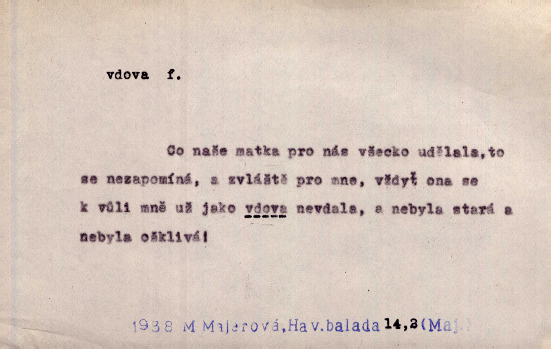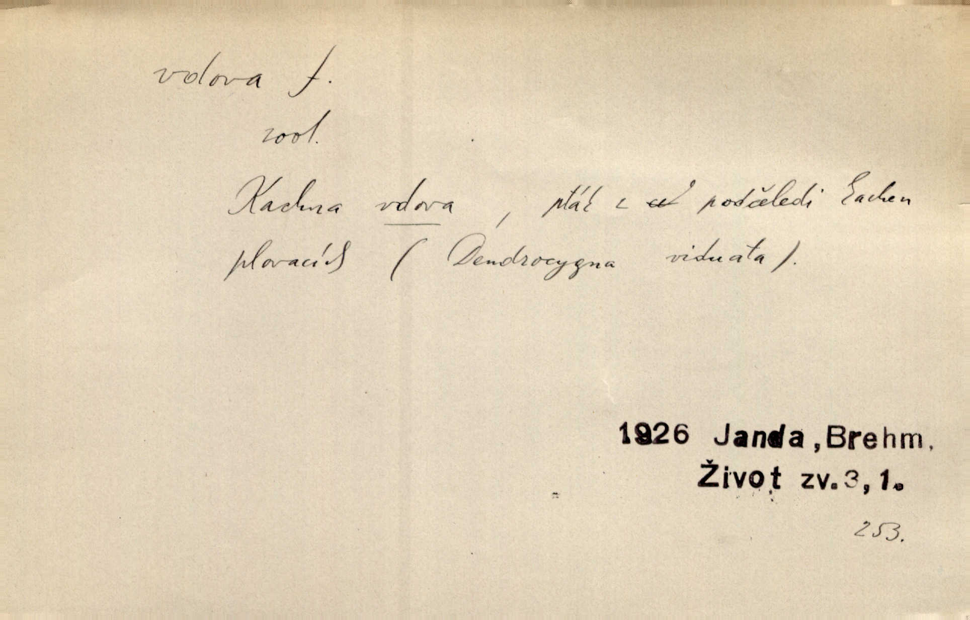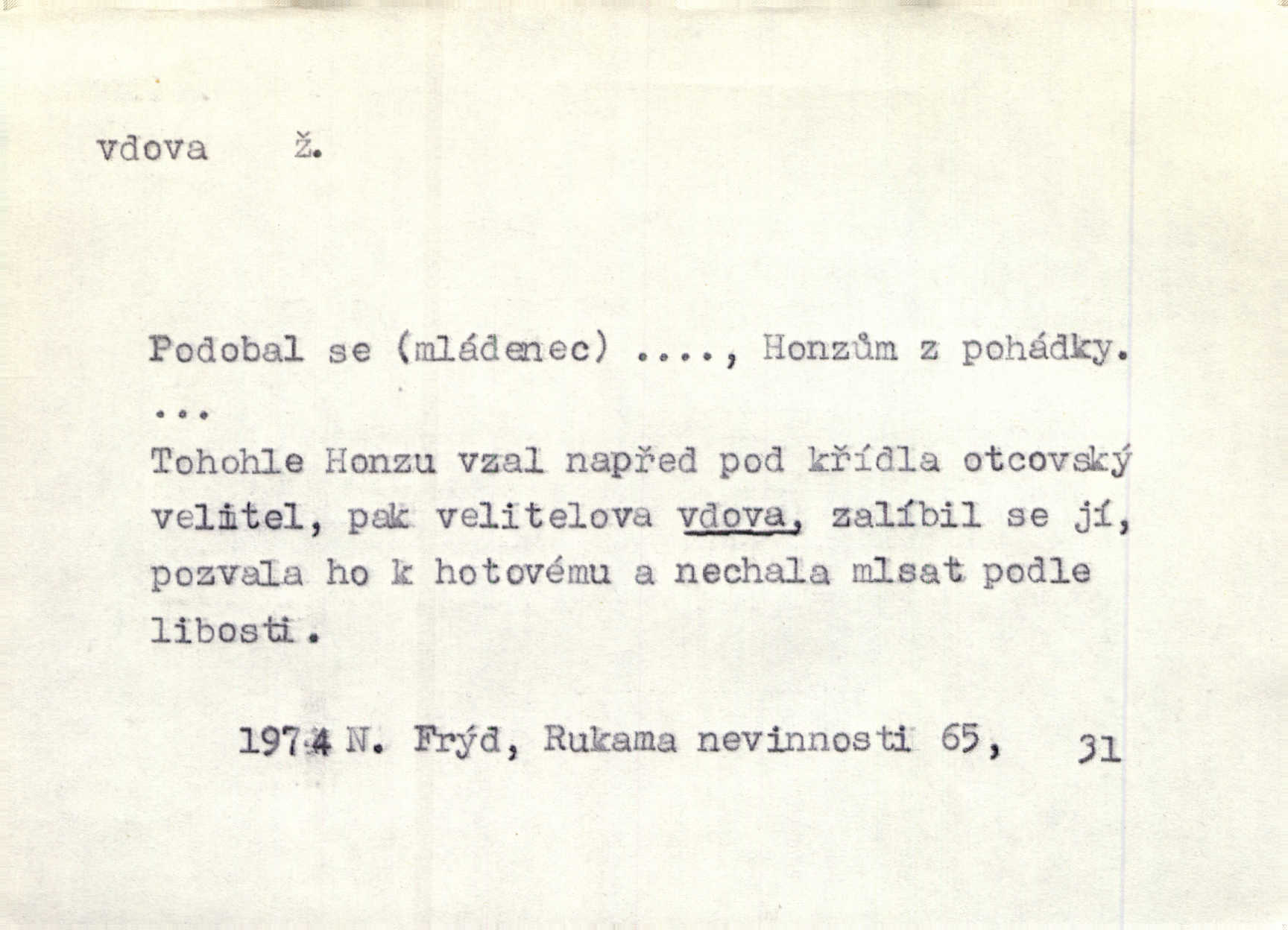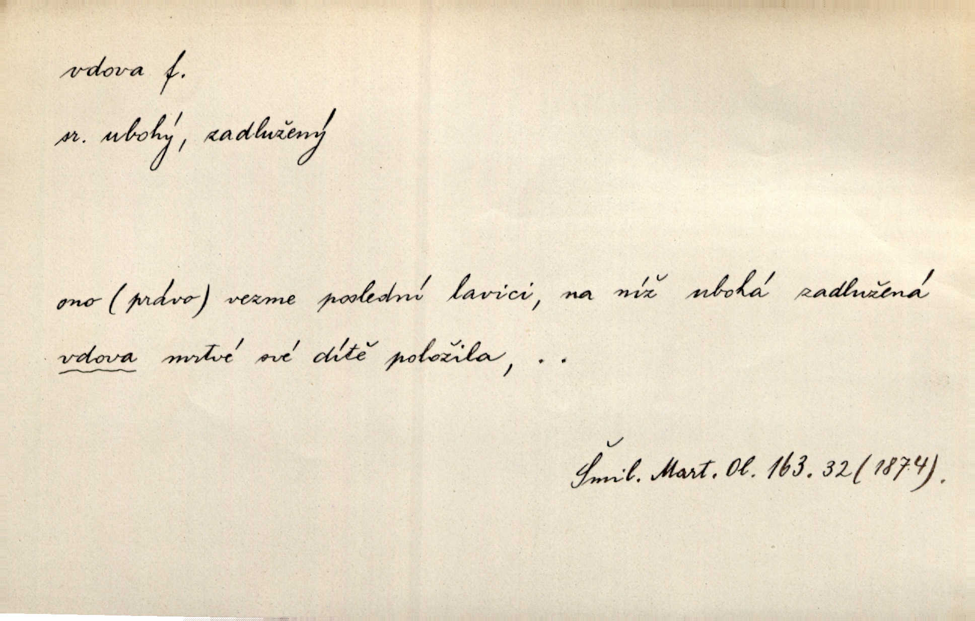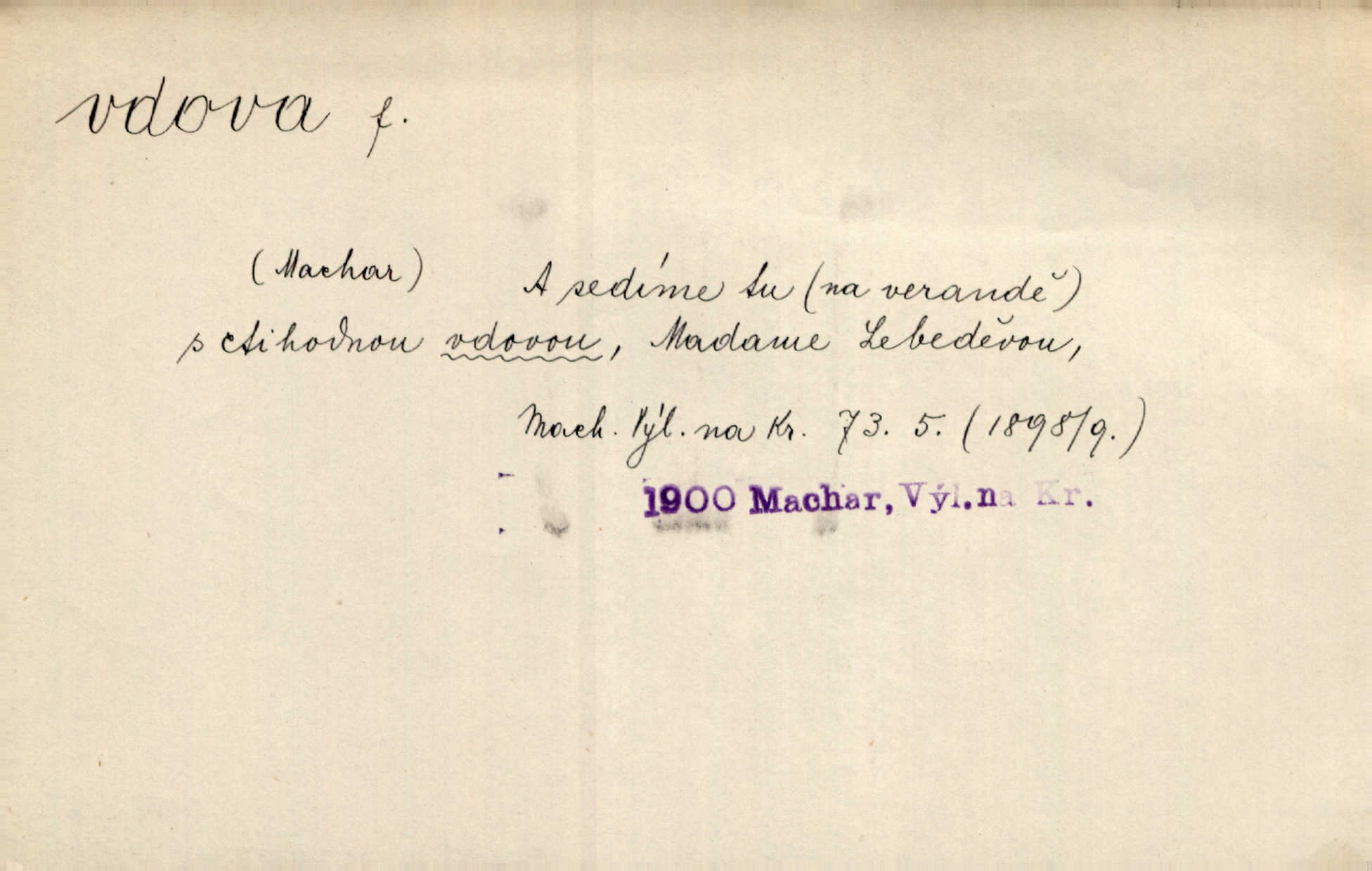 - vdova, -y f. žena, které zemřel manžel. Byla jedna chudá vdova a měla jen jednu dceru. Erb. Přijel, aby smluvil svatební smlouvu mezi polským králem a vdovou po nebožtíku králi Václavovi. Jir. Vůz plný uhlí se v kole je zvrátil. Pod vozem shasla Magdónova vdova. Bezr. Po všechen čas, co byl Šimák v žaláři, chovala se Anežka jako počestná vdova. Šmil. Plačeme(sic!) [ženské] jako vdovy velice. Hol. Na Josefa, říkávají, už i vdovin pluh vyjíždí ze dvora. Hol. Dobrý jako dítě, přispěl [Chocholoušek] často vdoviným grošem tam, kde bída byla příspěvkem nejchudších. Ner. Přen. Večer přehodil zatím lehounce vdovin závoj přes hřbety hor tmu. Kun. Budu [Michelangelo] umírat steskem po tobě, Florencie, vdovo po kráse, vdovo zrazená, vdovo šílená. K. Schulz. Zool. kachna vdova pták z podčeledi kachen plovacích, Dendrocygna viduata. Vdova rod ptáků z čeledi Spermestidae, Vidua; vdova dominikánská. Vdova rajská druh ptáka z čeledi Ploceidae, Vidua paradisea. Vdovy podčeleď čeledi Spermestidae, Viduini.