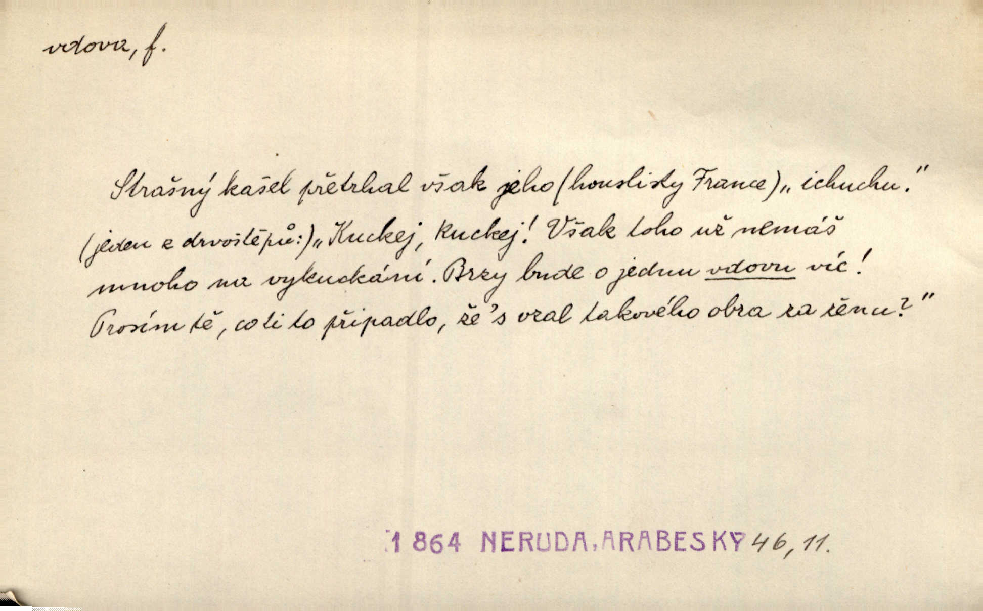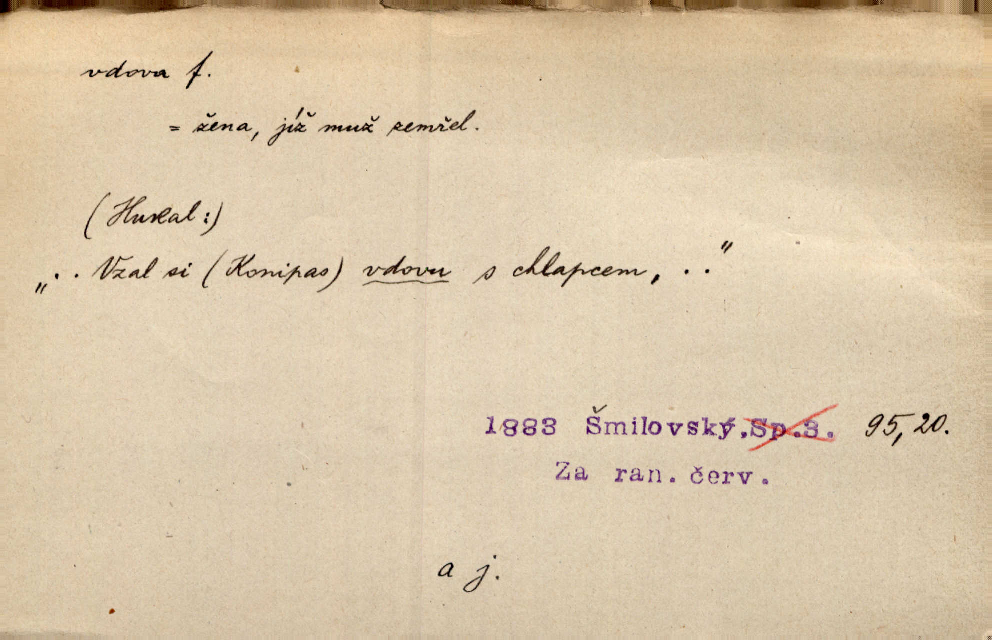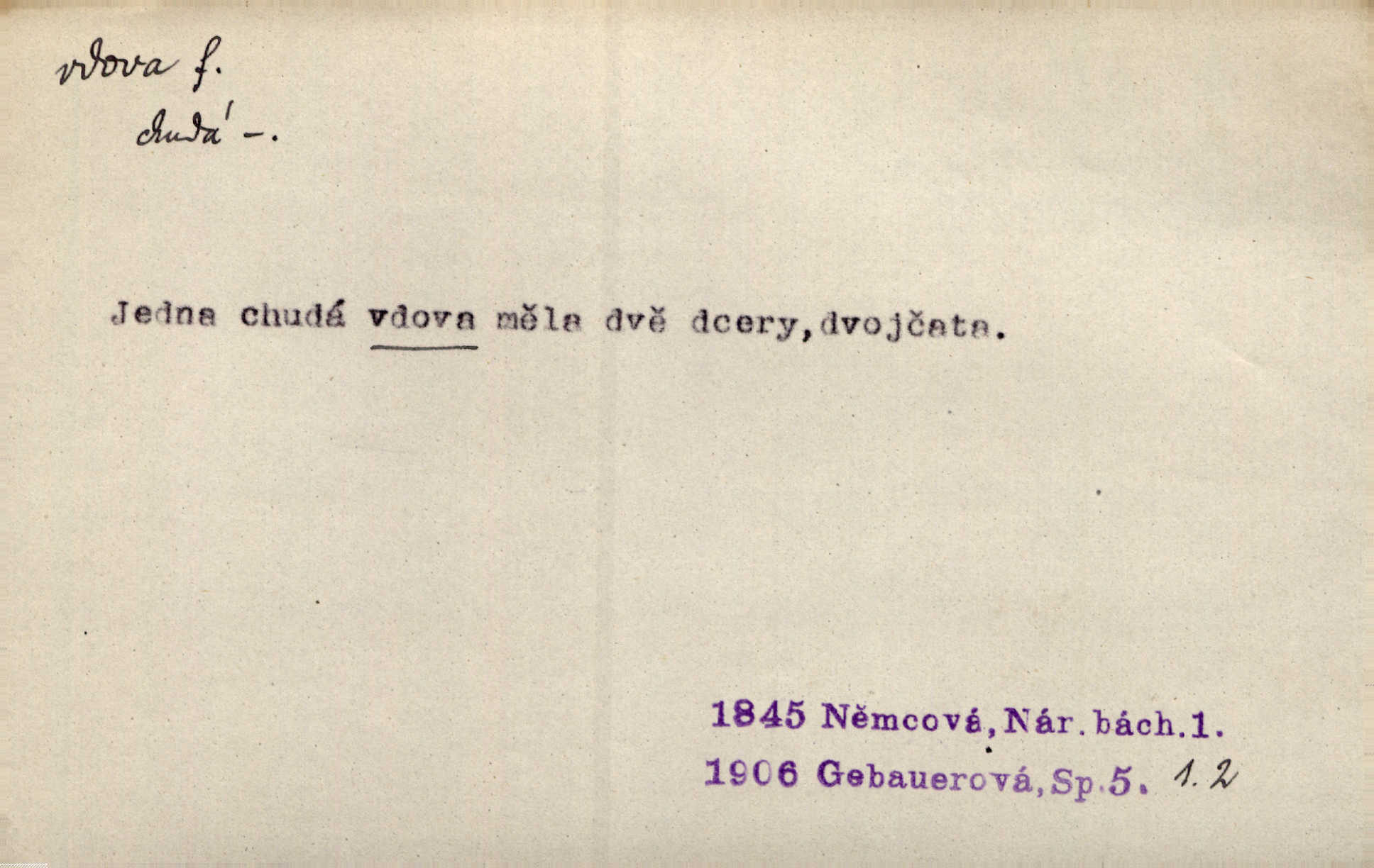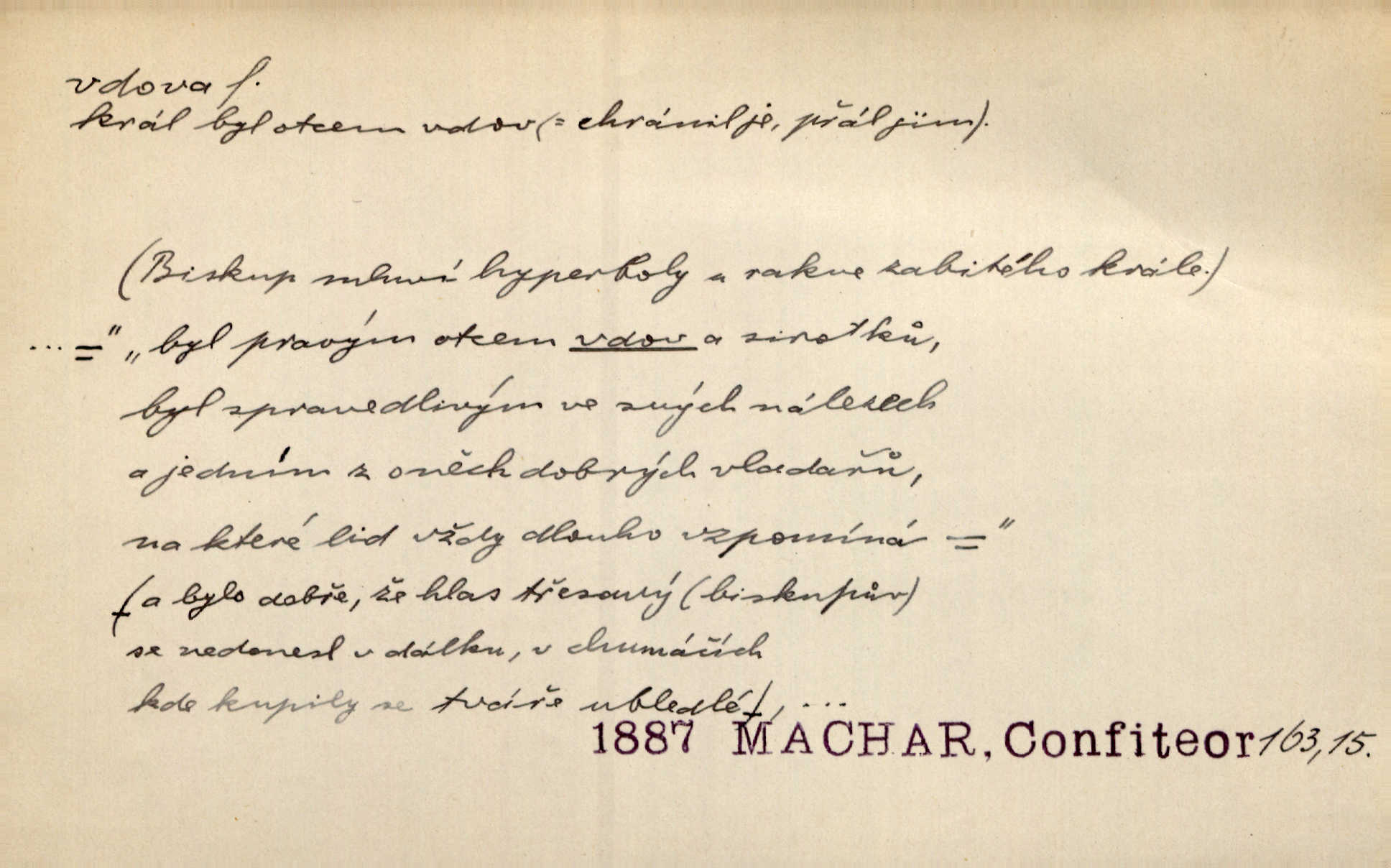 - vdova, -y f. žena, které zemřel manžel. Byla jedna chudá vdova a měla jen jednu dceru. Erb. Přijel, aby smluvil svatební smlouvu mezi polským králem a vdovou po nebožtíku králi Václavovi. Jir. Vůz plný uhlí se v kole je zvrátil. Pod vozem shasla Magdónova vdova. Bezr. Po všechen čas, co byl Šimák v žaláři, chovala se Anežka jako počestná vdova. Šmil. Plačeme(sic!) [ženské] jako vdovy velice. Hol. Na Josefa, říkávají, už i vdovin pluh vyjíždí ze dvora. Hol. Dobrý jako dítě, přispěl [Chocholoušek] často vdoviným grošem tam, kde bída byla příspěvkem nejchudších. Ner. Přen. Večer přehodil zatím lehounce vdovin závoj přes hřbety hor tmu. Kun. Budu [Michelangelo] umírat steskem po tobě, Florencie, vdovo po kráse, vdovo zrazená, vdovo šílená. K. Schulz. Zool. kachna vdova pták z podčeledi kachen plovacích, Dendrocygna viduata. Vdova rod ptáků z čeledi Spermestidae, Vidua; vdova dominikánská. Vdova rajská druh ptáka z čeledi Ploceidae, Vidua paradisea. Vdovy podčeleď čeledi Spermestidae, Viduini.