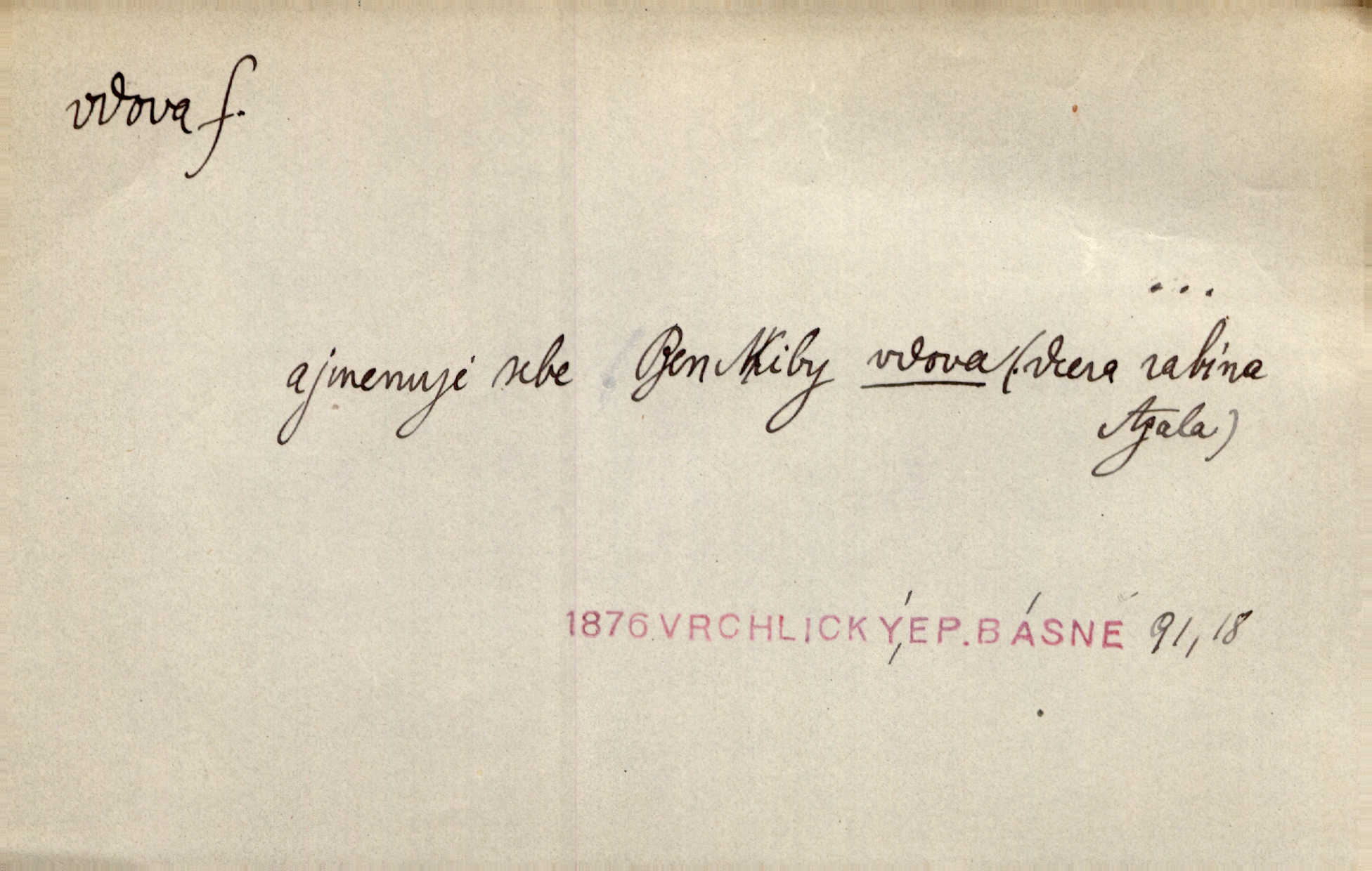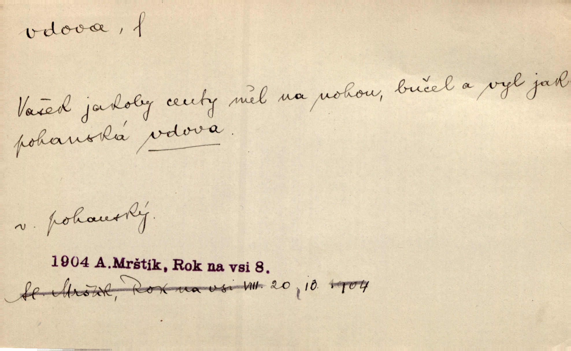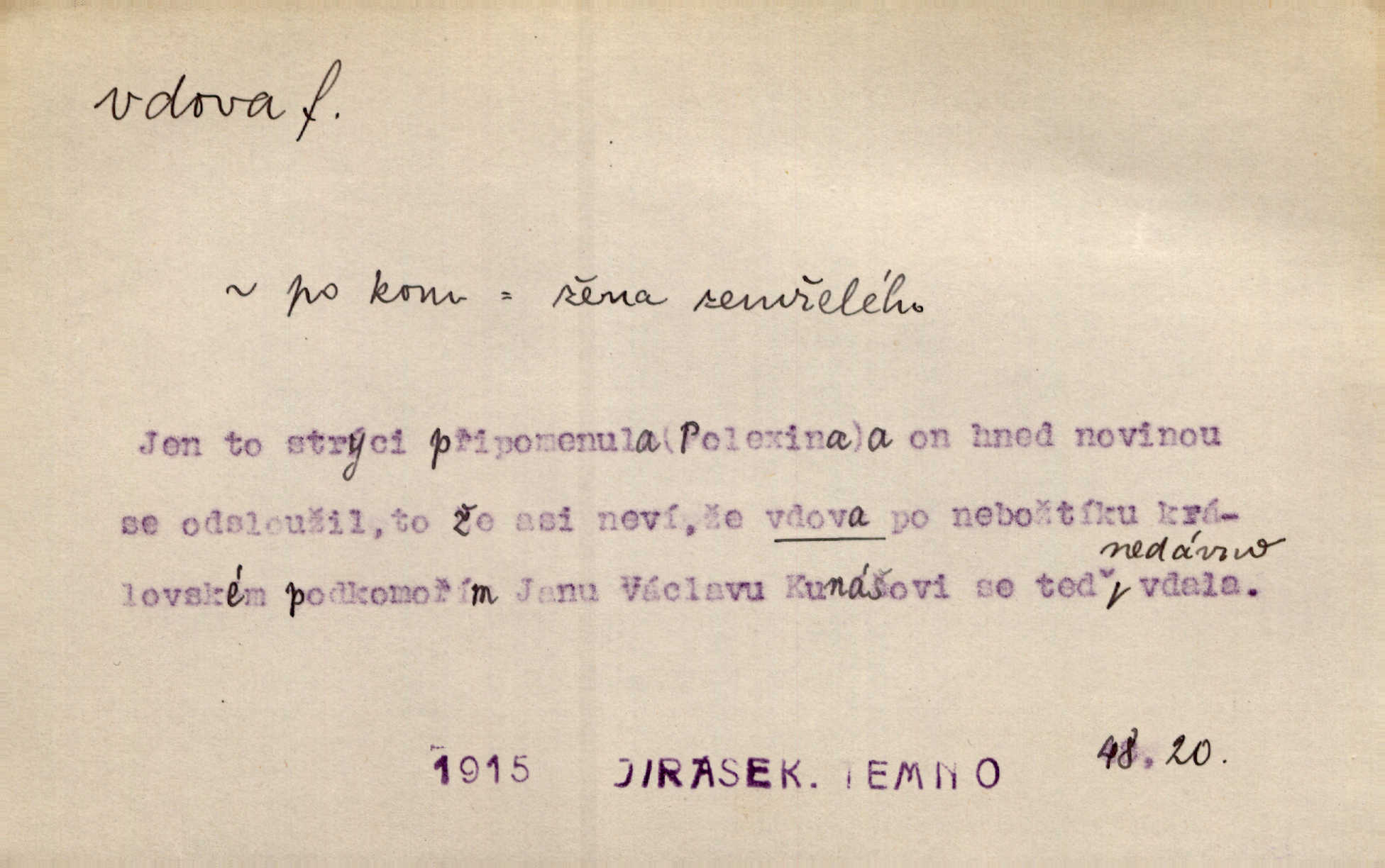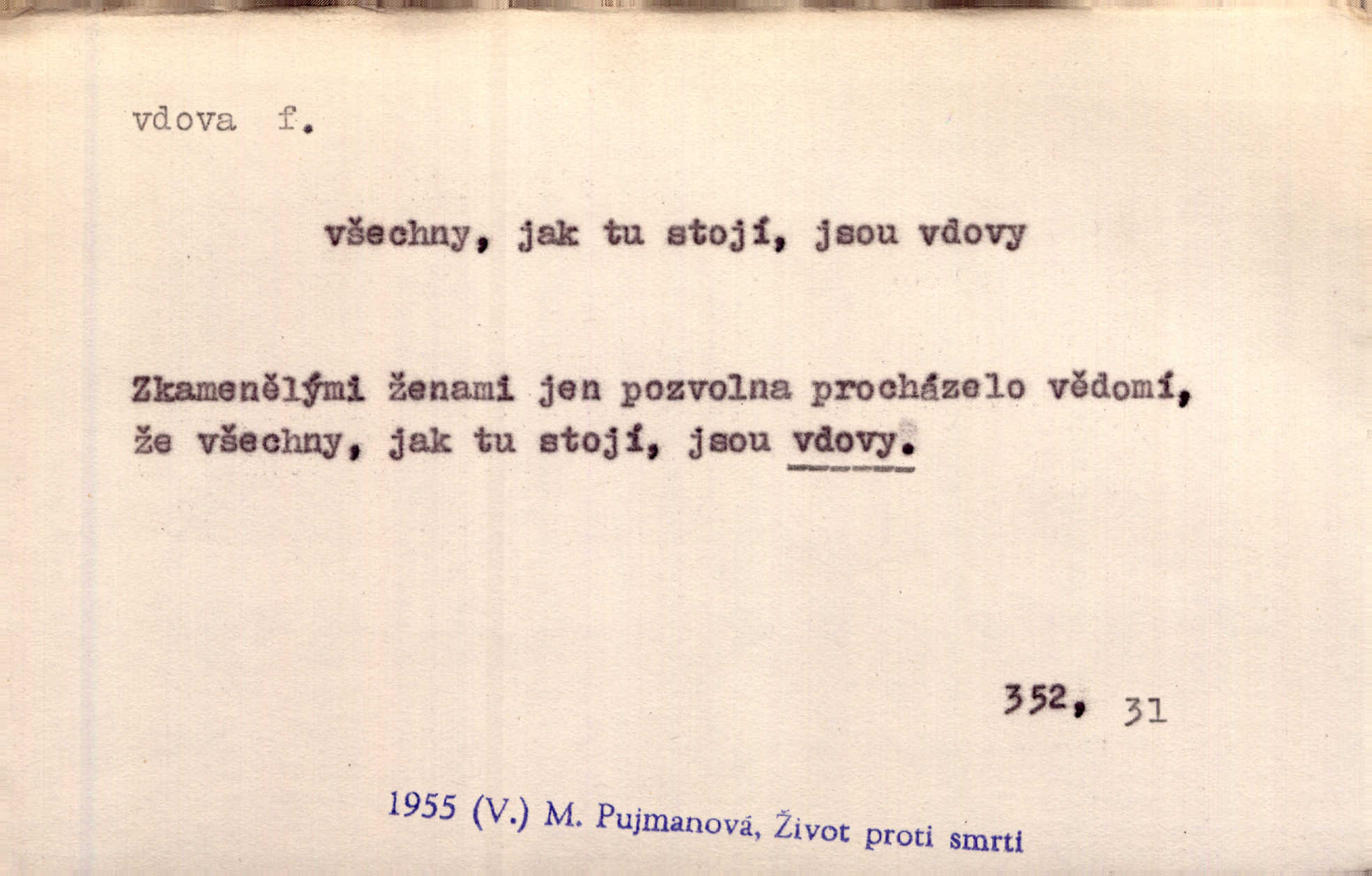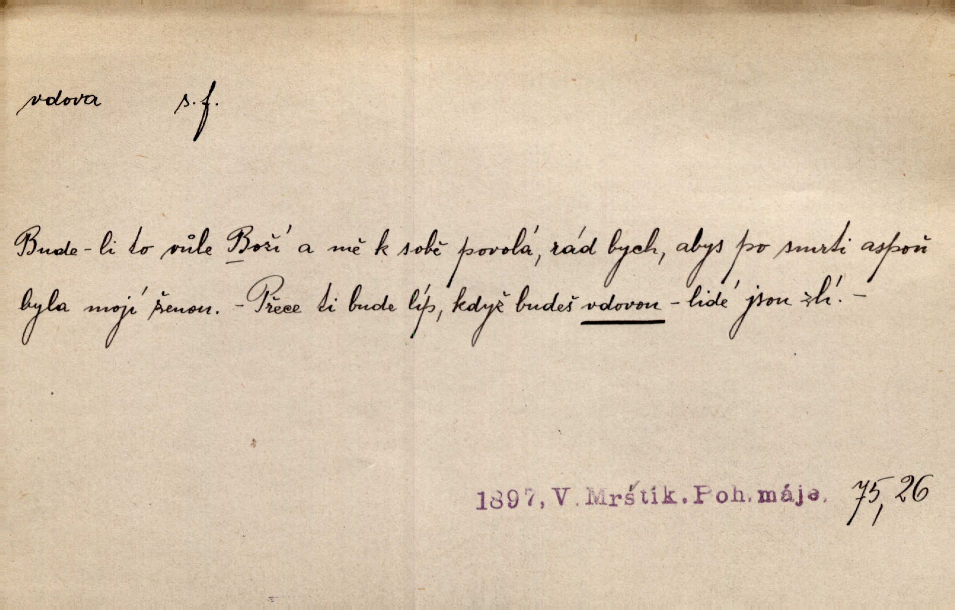 - vdova, -y f. žena, které zemřel manžel. Byla jedna chudá vdova a měla jen jednu dceru. Erb. Přijel, aby smluvil svatební smlouvu mezi polským králem a vdovou po nebožtíku králi Václavovi. Jir. Vůz plný uhlí se v kole je zvrátil. Pod vozem shasla Magdónova vdova. Bezr. Po všechen čas, co byl Šimák v žaláři, chovala se Anežka jako počestná vdova. Šmil. Plačeme(sic!) [ženské] jako vdovy velice. Hol. Na Josefa, říkávají, už i vdovin pluh vyjíždí ze dvora. Hol. Dobrý jako dítě, přispěl [Chocholoušek] často vdoviným grošem tam, kde bída byla příspěvkem nejchudších. Ner. Přen. Večer přehodil zatím lehounce vdovin závoj přes hřbety hor tmu. Kun. Budu [Michelangelo] umírat steskem po tobě, Florencie, vdovo po kráse, vdovo zrazená, vdovo šílená. K. Schulz. Zool. kachna vdova pták z podčeledi kachen plovacích, Dendrocygna viduata. Vdova rod ptáků z čeledi Spermestidae, Vidua; vdova dominikánská. Vdova rajská druh ptáka z čeledi Ploceidae, Vidua paradisea. Vdovy podčeleď čeledi Spermestidae, Viduini.