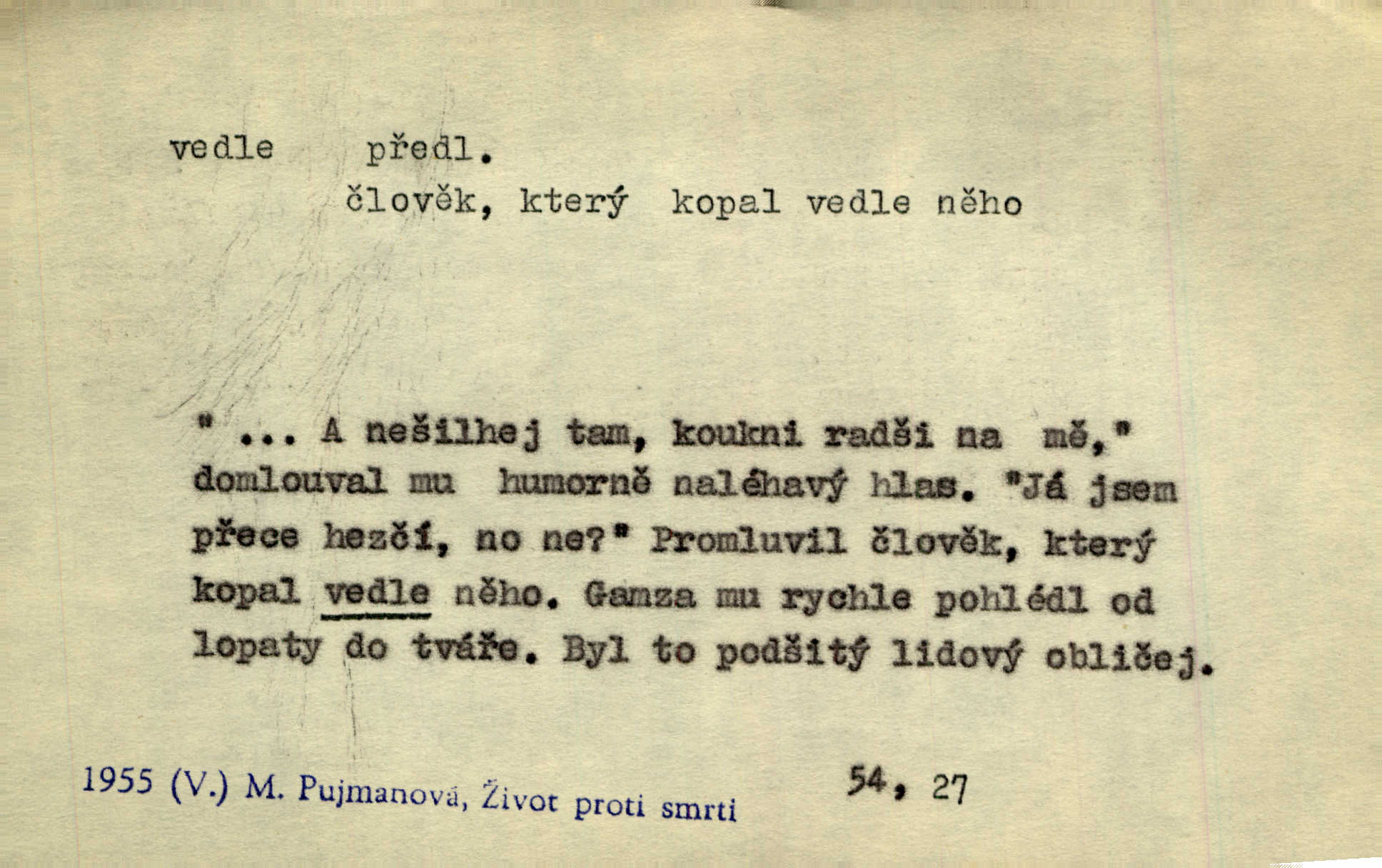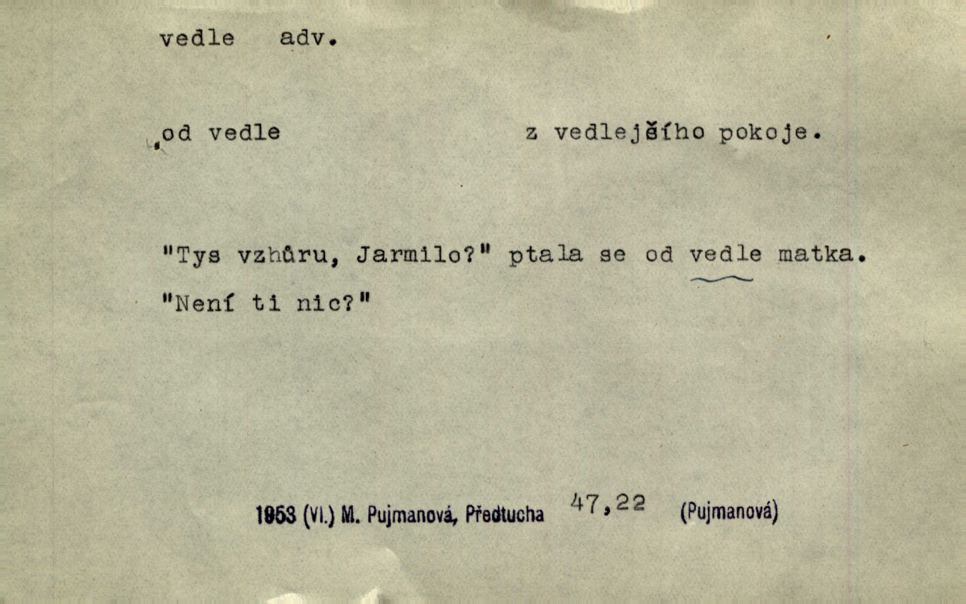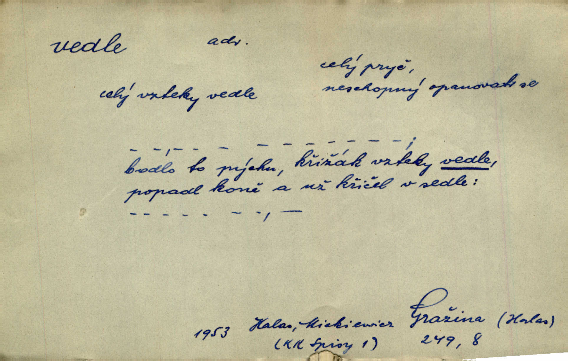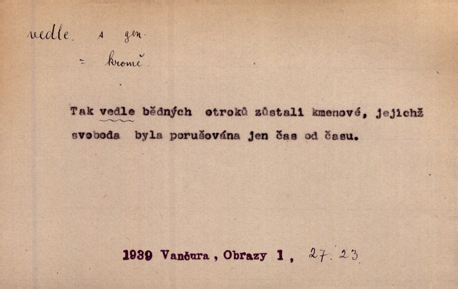 - vedle (zast. vedlé) předl. s gen. vyjadřuje těsnou blízkost u něčeho n. někoho, malou vzdálenost od něčeho n. někoho. Při stěně stála postel, vedle ní vysoká, hřmotná almara. Šmil. Drahomíra vrátí se ode dvéří a postaví se vedle popelnice. Vrch. Sed’ si vedle orla vrabčík. Havl. Sedni vedlé tam té vdovy, ať ti, nač sem přišla, poví. Ner. Vrána vedlé vrány sedá, rovný rovného si hledá. Přísl. V čele jeli tři kněží vedle sebe. Jir. [Davy] stály hustě, hlava vedle hlavy. Vrch. Pod policí visí džbánek vedle džbánku mnoho džbánků u sebe. Prav. Jiskra vedle jiskry lesem svítí. Mácha. [Na jeteliništích] musejí se pečlivě vybírat všechny kamínky místo vedle místečka. Strnadel. Obecní pokladna přece rok vedle roku byla čistá jako sklo rok co rok. Herb. Budu mít vedle sebe ženu sobě rovnou. Svob. Vedlé ní zapomněl, že je studánka na světě v její společnosti. Svět. Našetřila [si] nějaký kapitálek vedle svého chotě. Ben. Vyrostli jsme přece vedle sebe společně. Čap. Ch. Chci, abychom vedle sebe každý svým zůstali pánem. Šmil. Toho nechtějí snésti, ale aby vedle krále panovali zároveň s králem. Jir. [Paleček] chutě se činí vedle Humoristických listů. Zákr. V čele Táborův stál Jan Hvězda z Vícemilic již často jmenovaný, a vedle něho zvláště Bohuslav ze Švamberka. Pal. Stavěti vedle Boha vlast a národ na stejnou výši. Třeb. Fys. spojení článků vedle sebe (op. za sebou). D mimo, podél, kolem něčeho n. někoho. Vraceje se se Sobotkou, šel vedle oficiálova domu. Jir. Přišlo mu jít přes Ropratice vedle Bělků. Staš. Zase stáli chvilku v nesnázi, až šla Horáčkova dívka vedle nich. Herb. Potok rozpustile hrčel vedle silnice. Svět. Potěšil cupal vedle koně. Rais. Opatrně stoupal po pěšinách a plížil se jako zloděj vedle houštin. Herb. Jdou vedle vody. Hovoř. D vyjadřuje srovnání směřující k protikladu, proti někomu, v srovnání k někomu. A čím jsem já vedle vás? Hál. Jsem vedlé něho sprostá chudobka! Ner. Vězte: on [muž] si proto ženu vzal, aby vedlé ní se mužem být zdál. Krás. D kromě někoho n. něčeho, mimo někoho n. něco. Chovala vedle předmětů městsky uhlazených i kusy starosvětské. Čech. Ta Voralka také všecko dělala, ale vedle toho pomáhala jako čeledín. Rais. Byl Samuel Nathan vedle svého pravověrectví také nemalý chytrák. Vrba. Došel až k četnické stanici, která vedle hostince a školy je nejvýznačnější budovou v obci. Poláč. Vedle Karlova mostu nejzajímavější jest most pod Letnou. Herrm. To být nemá, muž nemá vedlé své ženy znát jinou. Svět. To byly její starosti vedle rodění, kojení a děcek opatrování. John. D Zast. dle, podle něčeho. Vedle zpráv v archivu zachovalých byla [budova] i s rathousem dosti otrhaná. Win. Rozděloval [dukáty] na sloupečky vedle počtu hlav. Jir. Učiňme člověka vedlé obrazu našeho. Čel. D Zast. prostřednictvím někoho. Vedlé posla oznámil jsem, že se z nového světa navrátili. Kram.