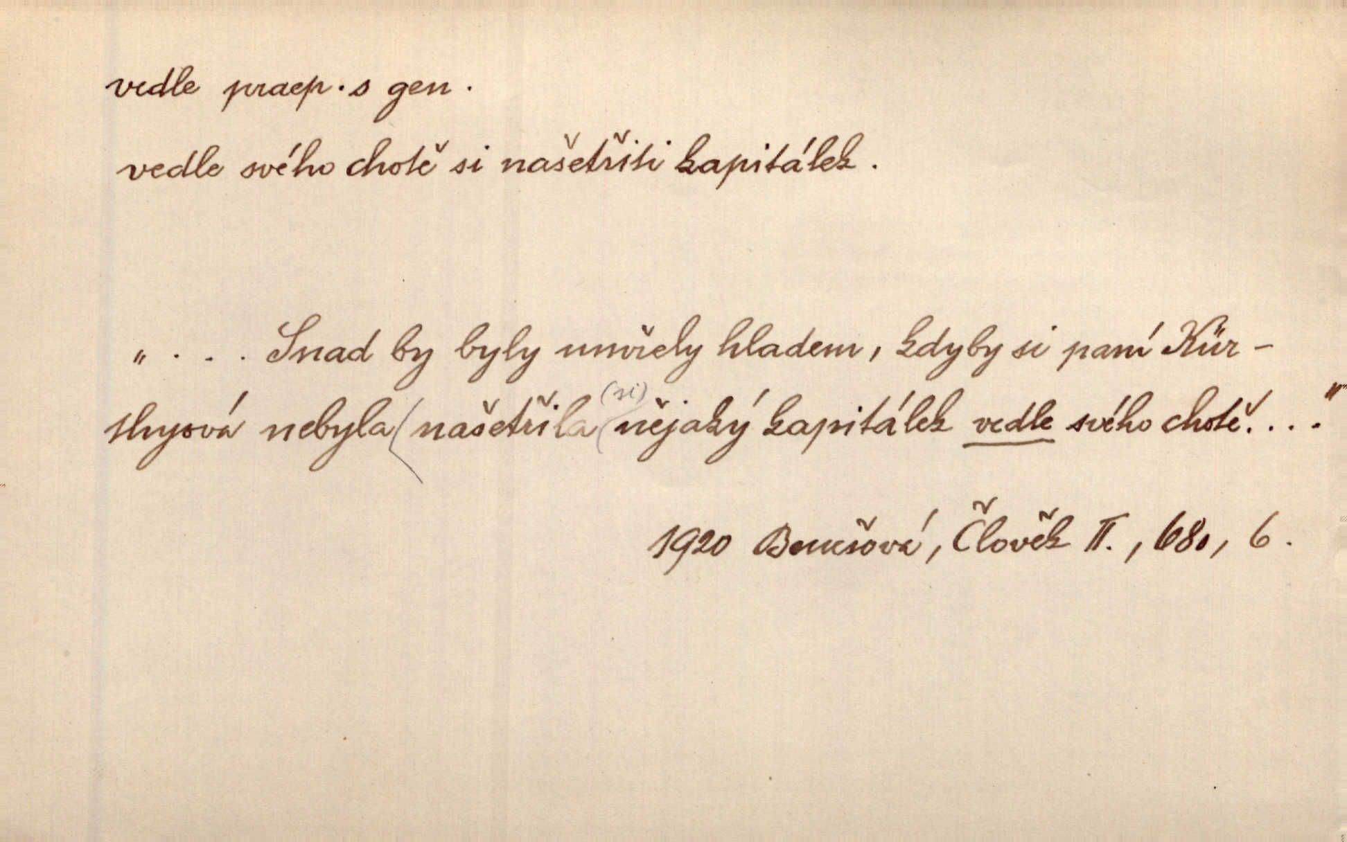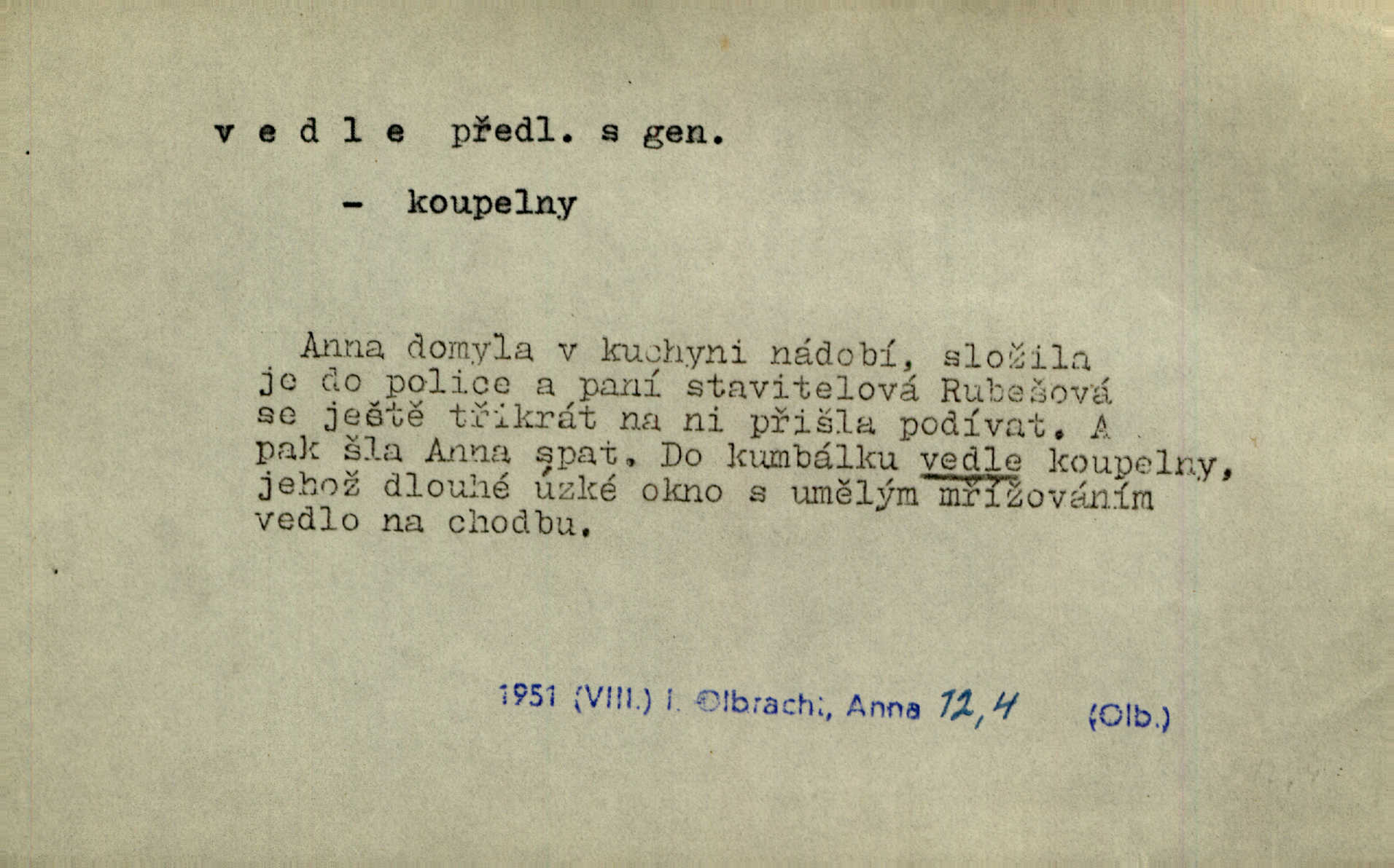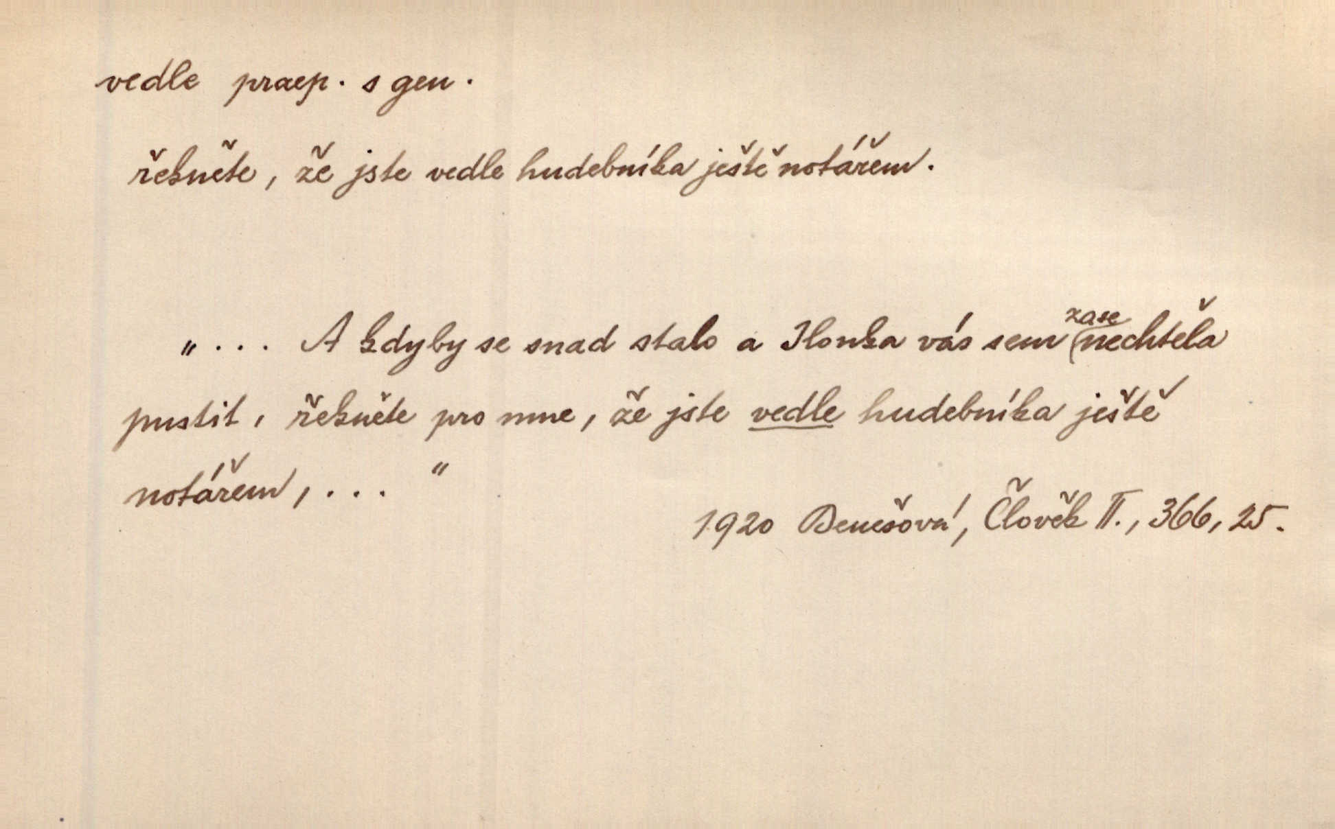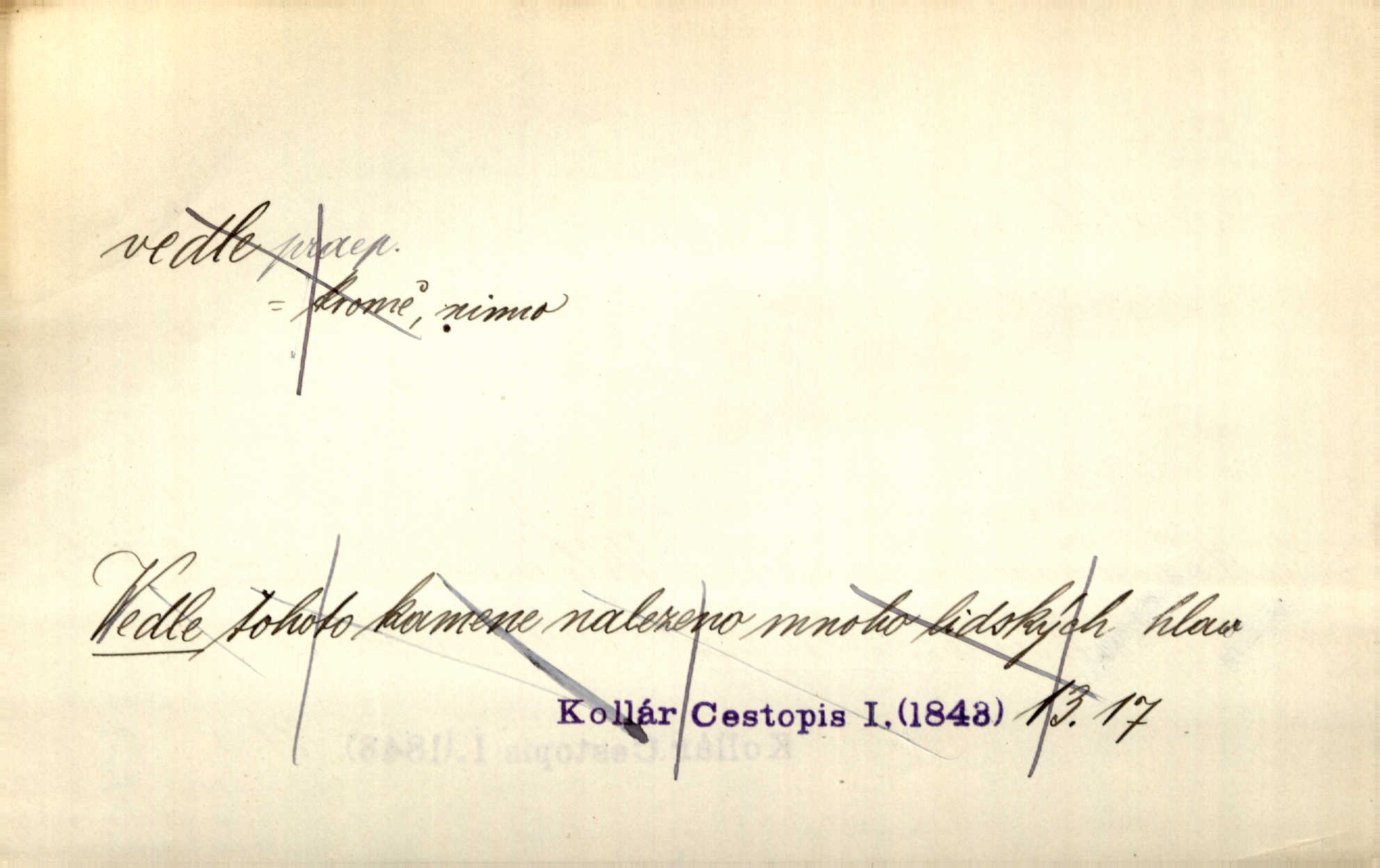 - vedle (zast. vedlé) předl. s gen. vyjadřuje těsnou blízkost u něčeho n. někoho, malou vzdálenost od něčeho n. někoho. Při stěně stála postel, vedle ní vysoká, hřmotná almara. Šmil. Drahomíra vrátí se ode dvéří a postaví se vedle popelnice. Vrch. Sed’ si vedle orla vrabčík. Havl. Sedni vedlé tam té vdovy, ať ti, nač sem přišla, poví. Ner. Vrána vedlé vrány sedá, rovný rovného si hledá. Přísl. V čele jeli tři kněží vedle sebe. Jir. [Davy] stály hustě, hlava vedle hlavy. Vrch. Pod policí visí džbánek vedle džbánku mnoho džbánků u sebe. Prav. Jiskra vedle jiskry lesem svítí. Mácha. [Na jeteliništích] musejí se pečlivě vybírat všechny kamínky místo vedle místečka. Strnadel. Obecní pokladna přece rok vedle roku byla čistá jako sklo rok co rok. Herb. Budu mít vedle sebe ženu sobě rovnou. Svob. Vedlé ní zapomněl, že je studánka na světě v její společnosti. Svět. Našetřila [si] nějaký kapitálek vedle svého chotě. Ben. Vyrostli jsme přece vedle sebe společně. Čap. Ch. Chci, abychom vedle sebe každý svým zůstali pánem. Šmil. Toho nechtějí snésti, ale aby vedle krále panovali zároveň s králem. Jir. [Paleček] chutě se činí vedle Humoristických listů. Zákr. V čele Táborův stál Jan Hvězda z Vícemilic již často jmenovaný, a vedle něho zvláště Bohuslav ze Švamberka. Pal. Stavěti vedle Boha vlast a národ na stejnou výši. Třeb. Fys. spojení článků vedle sebe (op. za sebou). D mimo, podél, kolem něčeho n. někoho. Vraceje se se Sobotkou, šel vedle oficiálova domu. Jir. Přišlo mu jít přes Ropratice vedle Bělků. Staš. Zase stáli chvilku v nesnázi, až šla Horáčkova dívka vedle nich. Herb. Potok rozpustile hrčel vedle silnice. Svět. Potěšil cupal vedle koně. Rais. Opatrně stoupal po pěšinách a plížil se jako zloděj vedle houštin. Herb. Jdou vedle vody. Hovoř. D vyjadřuje srovnání směřující k protikladu, proti někomu, v srovnání k někomu. A čím jsem já vedle vás? Hál. Jsem vedlé něho sprostá chudobka! Ner. Vězte: on [muž] si proto ženu vzal, aby vedlé ní se mužem být zdál. Krás. D kromě někoho n. něčeho, mimo někoho n. něco. Chovala vedle předmětů městsky uhlazených i kusy starosvětské. Čech. Ta Voralka také všecko dělala, ale vedle toho pomáhala jako čeledín. Rais. Byl Samuel Nathan vedle svého pravověrectví také nemalý chytrák. Vrba. Došel až k četnické stanici, která vedle hostince a školy je nejvýznačnější budovou v obci. Poláč. Vedle Karlova mostu nejzajímavější jest most pod Letnou. Herrm. To být nemá, muž nemá vedlé své ženy znát jinou. Svět. To byly její starosti vedle rodění, kojení a děcek opatrování. John. D Zast. dle, podle něčeho. Vedle zpráv v archivu zachovalých byla [budova] i s rathousem dosti otrhaná. Win. Rozděloval [dukáty] na sloupečky vedle počtu hlav. Jir. Učiňme člověka vedlé obrazu našeho. Čel. D Zast. prostřednictvím někoho. Vedlé posla oznámil jsem, že se z nového světa navrátili. Kram.