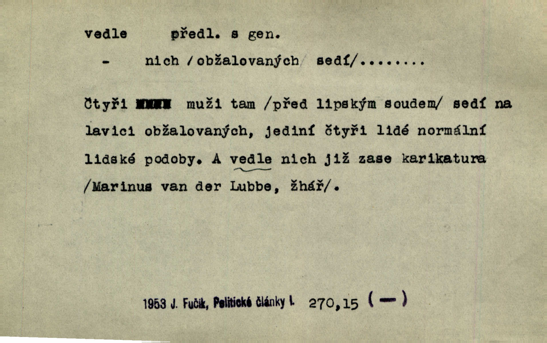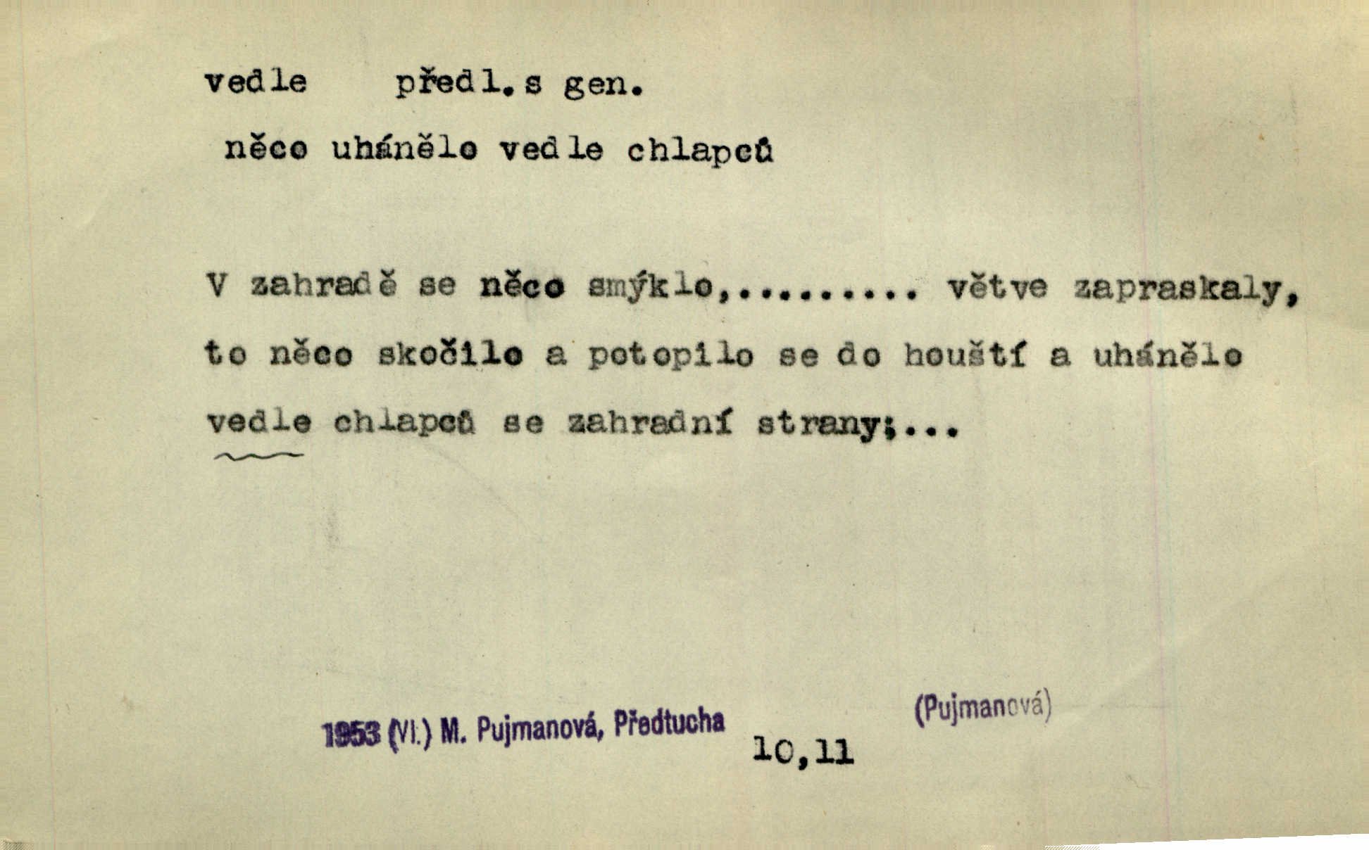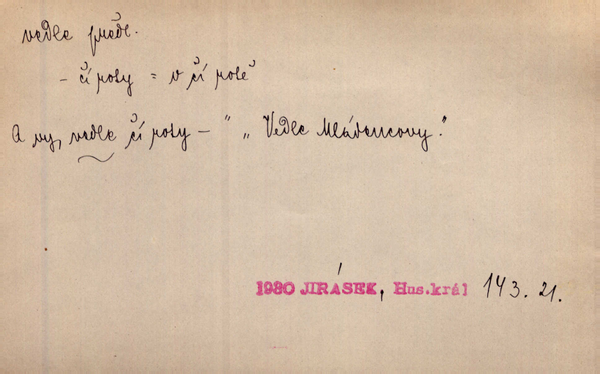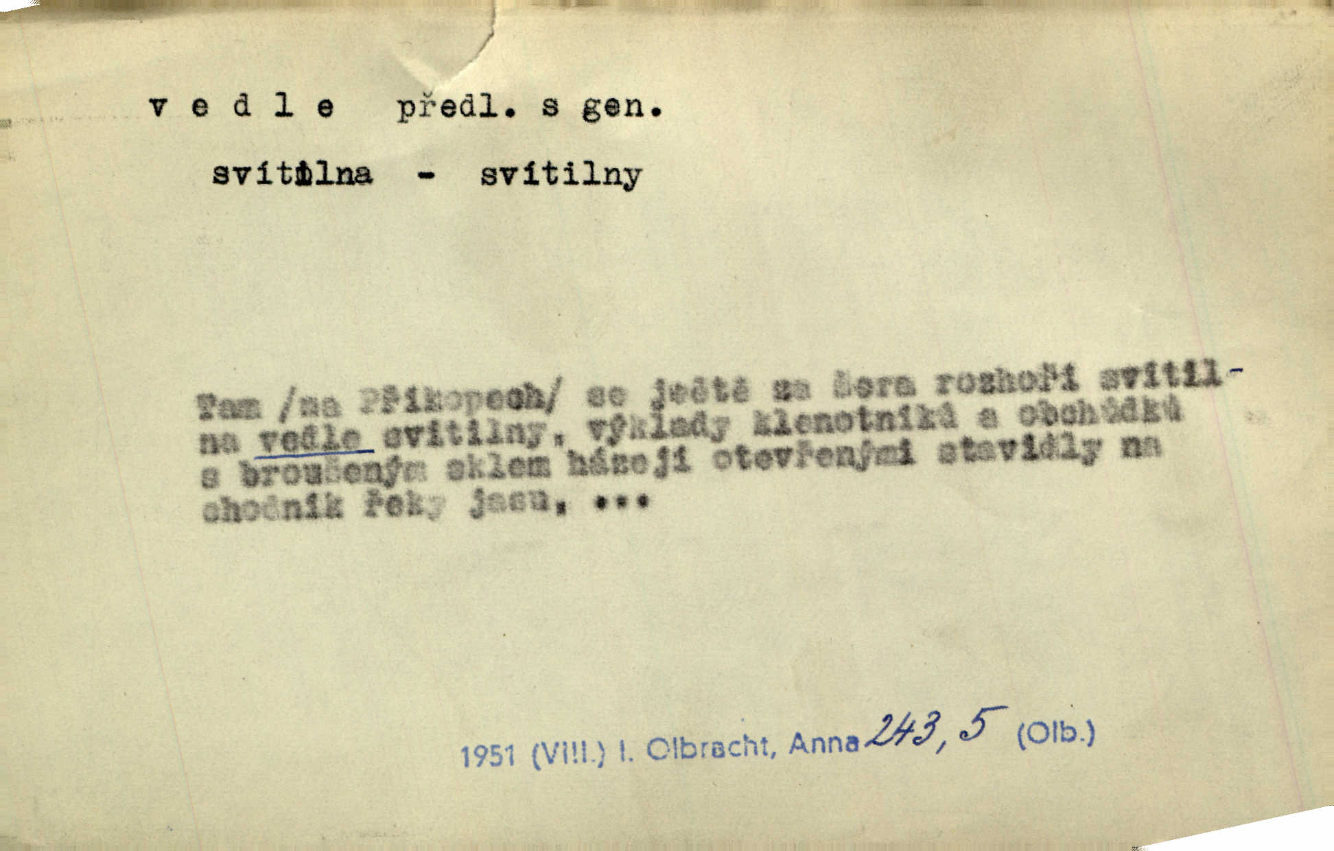 - vedle (zast. vedlé) předl. s gen. vyjadřuje těsnou blízkost u něčeho n. někoho, malou vzdálenost od něčeho n. někoho. Při stěně stála postel, vedle ní vysoká, hřmotná almara. Šmil. Drahomíra vrátí se ode dvéří a postaví se vedle popelnice. Vrch. Sed’ si vedle orla vrabčík. Havl. Sedni vedlé tam té vdovy, ať ti, nač sem přišla, poví. Ner. Vrána vedlé vrány sedá, rovný rovného si hledá. Přísl. V čele jeli tři kněží vedle sebe. Jir. [Davy] stály hustě, hlava vedle hlavy. Vrch. Pod policí visí džbánek vedle džbánku mnoho džbánků u sebe. Prav. Jiskra vedle jiskry lesem svítí. Mácha. [Na jeteliništích] musejí se pečlivě vybírat všechny kamínky místo vedle místečka. Strnadel. Obecní pokladna přece rok vedle roku byla čistá jako sklo rok co rok. Herb. Budu mít vedle sebe ženu sobě rovnou. Svob. Vedlé ní zapomněl, že je studánka na světě v její společnosti. Svět. Našetřila [si] nějaký kapitálek vedle svého chotě. Ben. Vyrostli jsme přece vedle sebe společně. Čap. Ch. Chci, abychom vedle sebe každý svým zůstali pánem. Šmil. Toho nechtějí snésti, ale aby vedle krále panovali zároveň s králem. Jir. [Paleček] chutě se činí vedle Humoristických listů. Zákr. V čele Táborův stál Jan Hvězda z Vícemilic již často jmenovaný, a vedle něho zvláště Bohuslav ze Švamberka. Pal. Stavěti vedle Boha vlast a národ na stejnou výši. Třeb. Fys. spojení článků vedle sebe (op. za sebou). D mimo, podél, kolem něčeho n. někoho. Vraceje se se Sobotkou, šel vedle oficiálova domu. Jir. Přišlo mu jít přes Ropratice vedle Bělků. Staš. Zase stáli chvilku v nesnázi, až šla Horáčkova dívka vedle nich. Herb. Potok rozpustile hrčel vedle silnice. Svět. Potěšil cupal vedle koně. Rais. Opatrně stoupal po pěšinách a plížil se jako zloděj vedle houštin. Herb. Jdou vedle vody. Hovoř. D vyjadřuje srovnání směřující k protikladu, proti někomu, v srovnání k někomu. A čím jsem já vedle vás? Hál. Jsem vedlé něho sprostá chudobka! Ner. Vězte: on [muž] si proto ženu vzal, aby vedlé ní se mužem být zdál. Krás. D kromě někoho n. něčeho, mimo někoho n. něco. Chovala vedle předmětů městsky uhlazených i kusy starosvětské. Čech. Ta Voralka také všecko dělala, ale vedle toho pomáhala jako čeledín. Rais. Byl Samuel Nathan vedle svého pravověrectví také nemalý chytrák. Vrba. Došel až k četnické stanici, která vedle hostince a školy je nejvýznačnější budovou v obci. Poláč. Vedle Karlova mostu nejzajímavější jest most pod Letnou. Herrm. To být nemá, muž nemá vedlé své ženy znát jinou. Svět. To byly její starosti vedle rodění, kojení a děcek opatrování. John. D Zast. dle, podle něčeho. Vedle zpráv v archivu zachovalých byla [budova] i s rathousem dosti otrhaná. Win. Rozděloval [dukáty] na sloupečky vedle počtu hlav. Jir. Učiňme člověka vedlé obrazu našeho. Čel. D Zast. prostřednictvím někoho. Vedlé posla oznámil jsem, že se z nového světa navrátili. Kram.