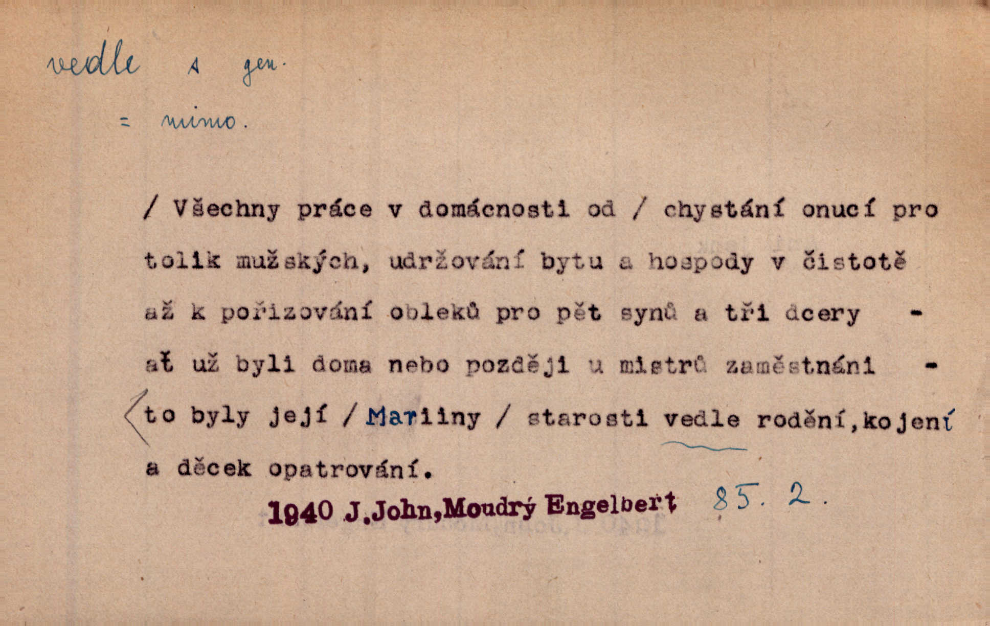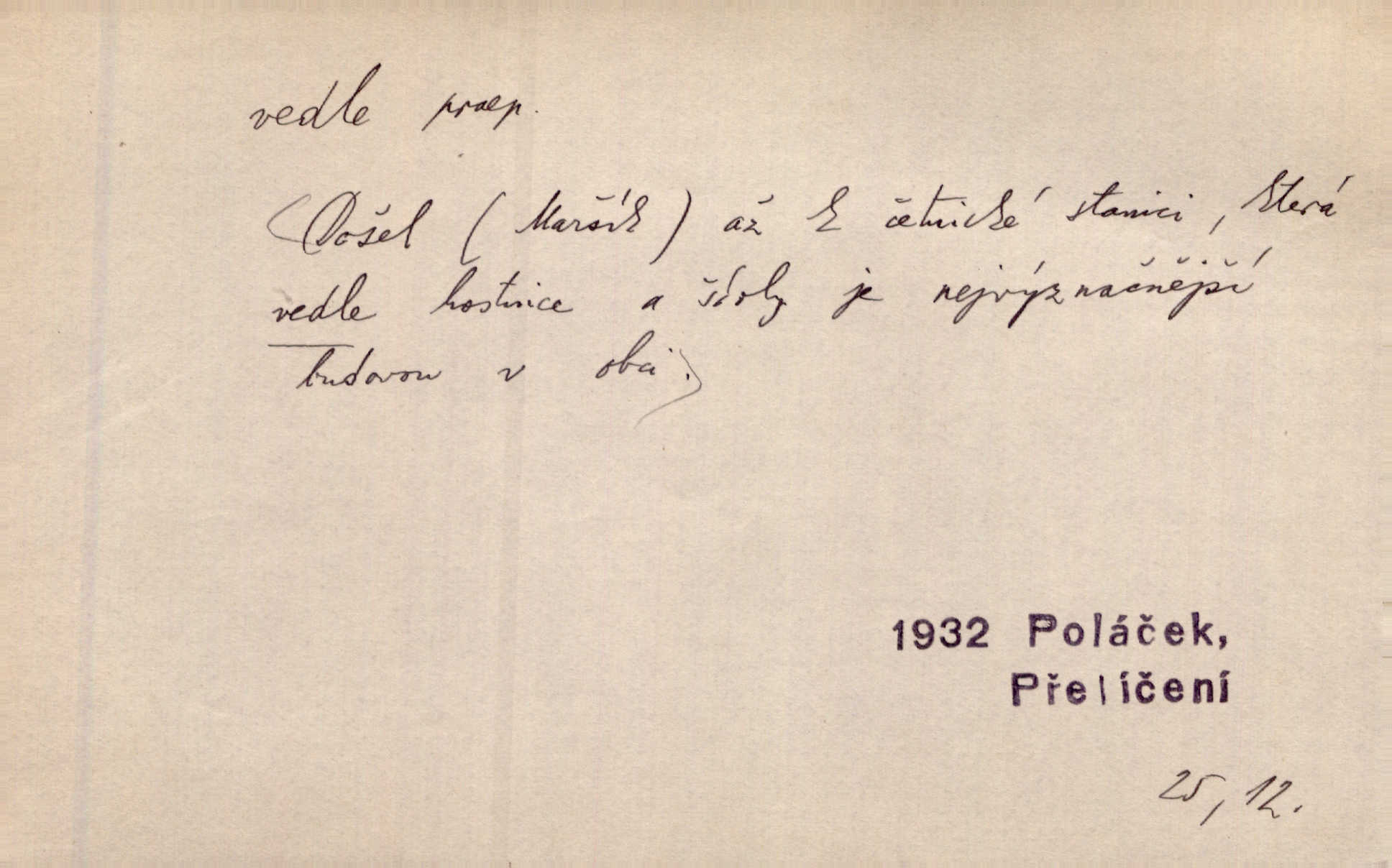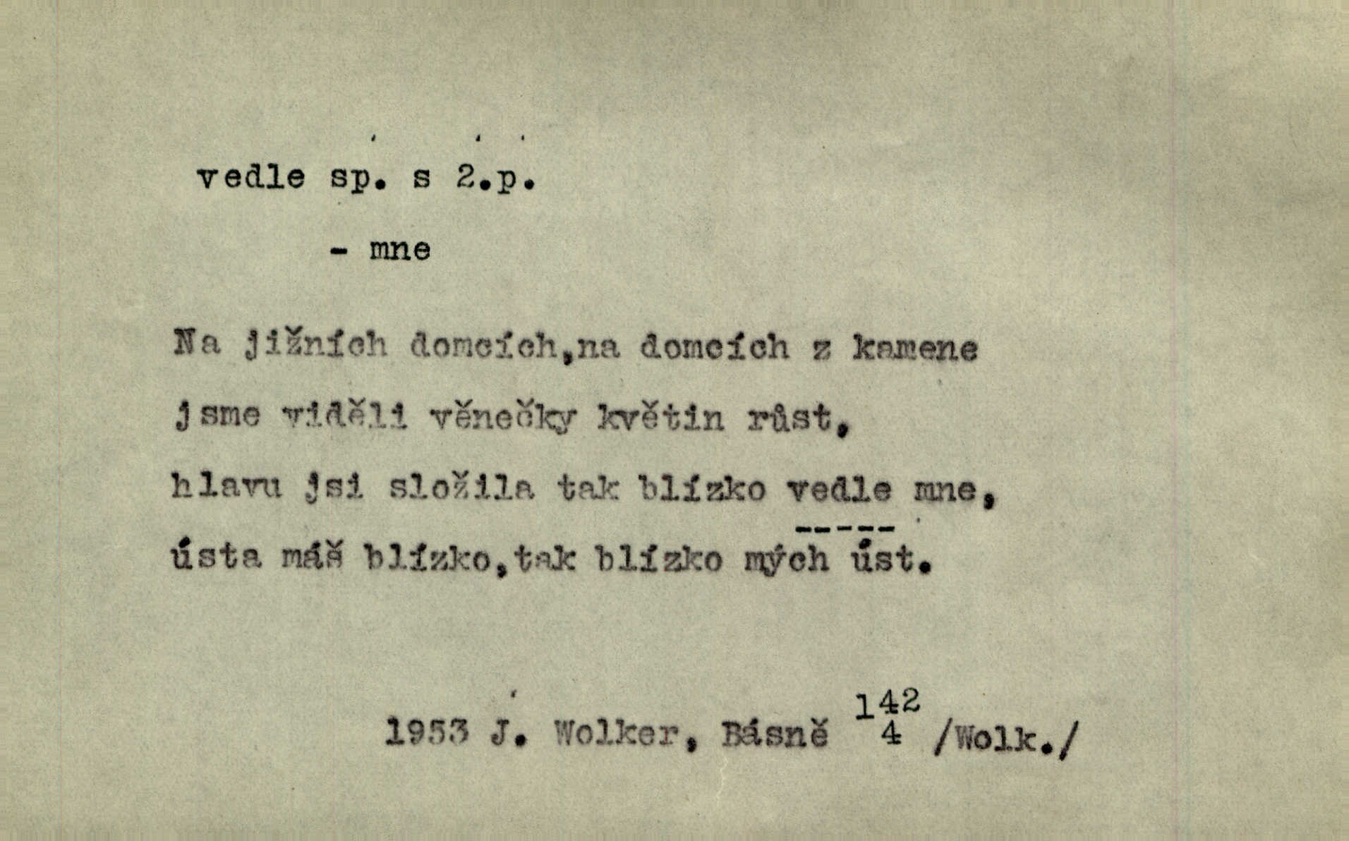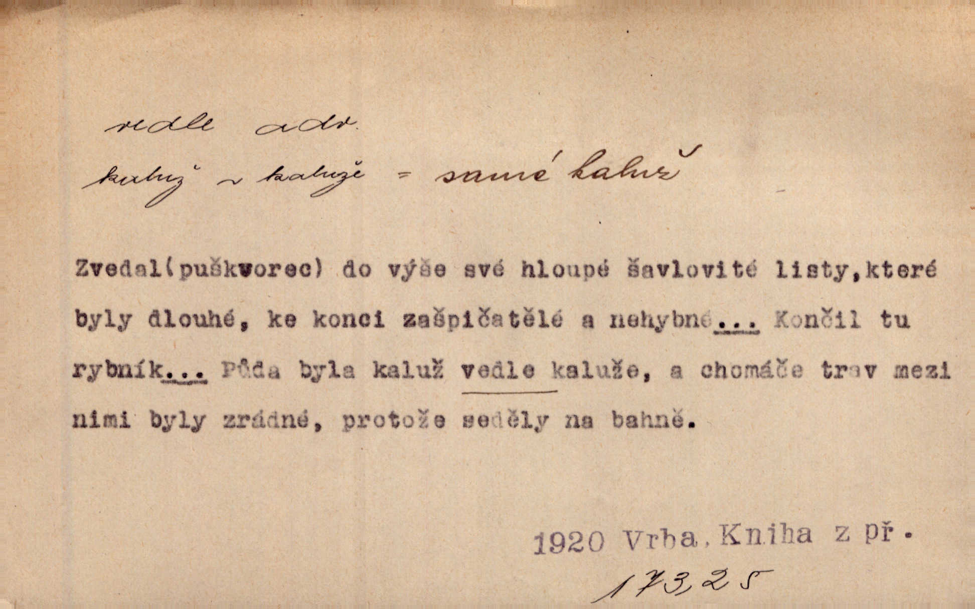 - vedle (zast. vedlé) předl. s gen. vyjadřuje těsnou blízkost u něčeho n. někoho, malou vzdálenost od něčeho n. někoho. Při stěně stála postel, vedle ní vysoká, hřmotná almara. Šmil. Drahomíra vrátí se ode dvéří a postaví se vedle popelnice. Vrch. Sed’ si vedle orla vrabčík. Havl. Sedni vedlé tam té vdovy, ať ti, nač sem přišla, poví. Ner. Vrána vedlé vrány sedá, rovný rovného si hledá. Přísl. V čele jeli tři kněží vedle sebe. Jir. [Davy] stály hustě, hlava vedle hlavy. Vrch. Pod policí visí džbánek vedle džbánku mnoho džbánků u sebe. Prav. Jiskra vedle jiskry lesem svítí. Mácha. [Na jeteliništích] musejí se pečlivě vybírat všechny kamínky místo vedle místečka. Strnadel. Obecní pokladna přece rok vedle roku byla čistá jako sklo rok co rok. Herb. Budu mít vedle sebe ženu sobě rovnou. Svob. Vedlé ní zapomněl, že je studánka na světě v její společnosti. Svět. Našetřila [si] nějaký kapitálek vedle svého chotě. Ben. Vyrostli jsme přece vedle sebe společně. Čap. Ch. Chci, abychom vedle sebe každý svým zůstali pánem. Šmil. Toho nechtějí snésti, ale aby vedle krále panovali zároveň s králem. Jir. [Paleček] chutě se činí vedle Humoristických listů. Zákr. V čele Táborův stál Jan Hvězda z Vícemilic již často jmenovaný, a vedle něho zvláště Bohuslav ze Švamberka. Pal. Stavěti vedle Boha vlast a národ na stejnou výši. Třeb. Fys. spojení článků vedle sebe (op. za sebou). D mimo, podél, kolem něčeho n. někoho. Vraceje se se Sobotkou, šel vedle oficiálova domu. Jir. Přišlo mu jít přes Ropratice vedle Bělků. Staš. Zase stáli chvilku v nesnázi, až šla Horáčkova dívka vedle nich. Herb. Potok rozpustile hrčel vedle silnice. Svět. Potěšil cupal vedle koně. Rais. Opatrně stoupal po pěšinách a plížil se jako zloděj vedle houštin. Herb. Jdou vedle vody. Hovoř. D vyjadřuje srovnání směřující k protikladu, proti někomu, v srovnání k někomu. A čím jsem já vedle vás? Hál. Jsem vedlé něho sprostá chudobka! Ner. Vězte: on [muž] si proto ženu vzal, aby vedlé ní se mužem být zdál. Krás. D kromě někoho n. něčeho, mimo někoho n. něco. Chovala vedle předmětů městsky uhlazených i kusy starosvětské. Čech. Ta Voralka také všecko dělala, ale vedle toho pomáhala jako čeledín. Rais. Byl Samuel Nathan vedle svého pravověrectví také nemalý chytrák. Vrba. Došel až k četnické stanici, která vedle hostince a školy je nejvýznačnější budovou v obci. Poláč. Vedle Karlova mostu nejzajímavější jest most pod Letnou. Herrm. To být nemá, muž nemá vedlé své ženy znát jinou. Svět. To byly její starosti vedle rodění, kojení a děcek opatrování. John. D Zast. dle, podle něčeho. Vedle zpráv v archivu zachovalých byla [budova] i s rathousem dosti otrhaná. Win. Rozděloval [dukáty] na sloupečky vedle počtu hlav. Jir. Učiňme člověka vedlé obrazu našeho. Čel. D Zast. prostřednictvím někoho. Vedlé posla oznámil jsem, že se z nového světa navrátili. Kram.