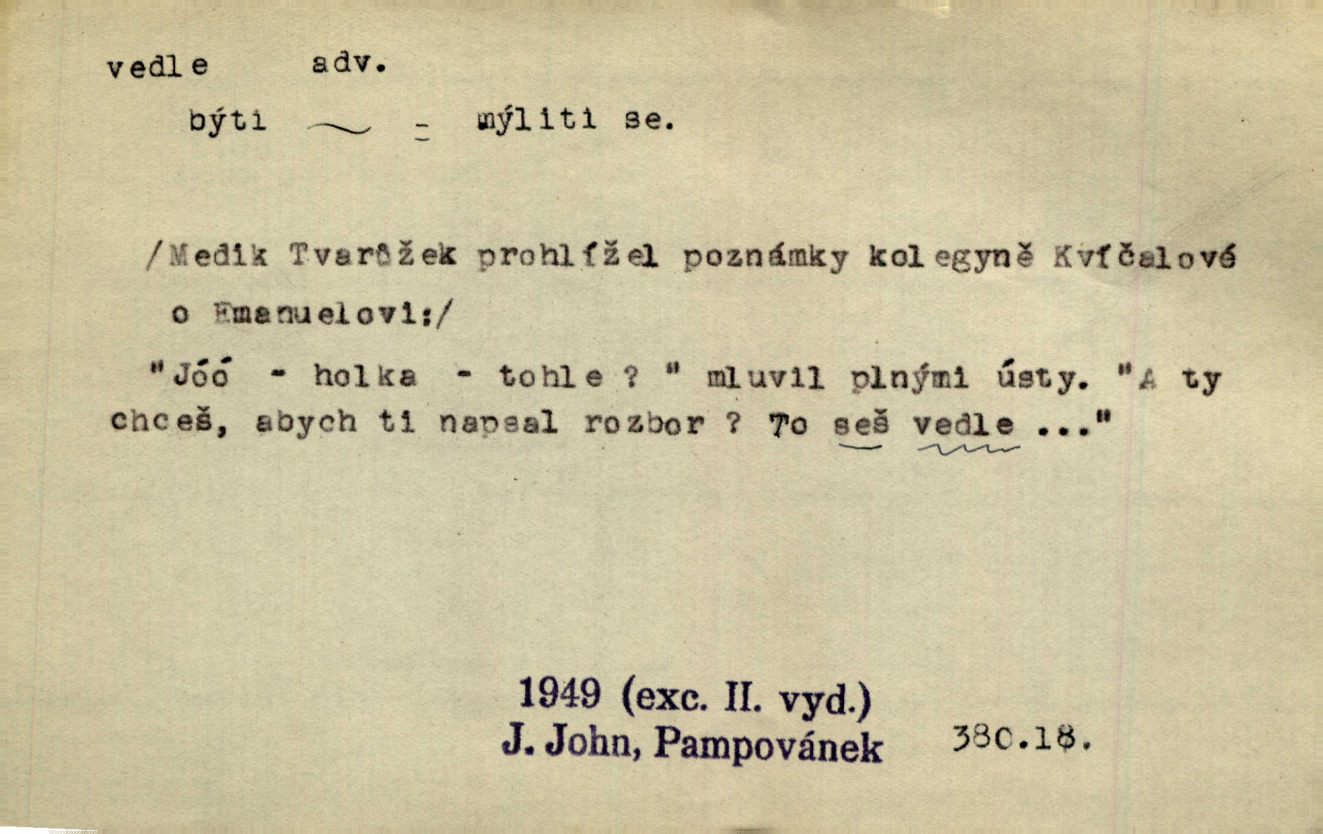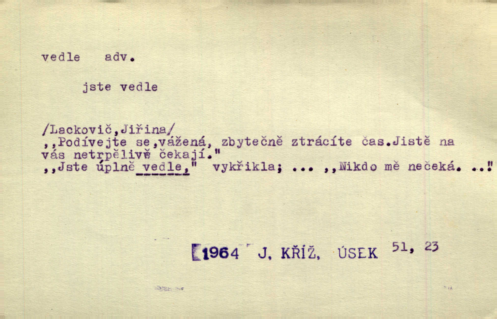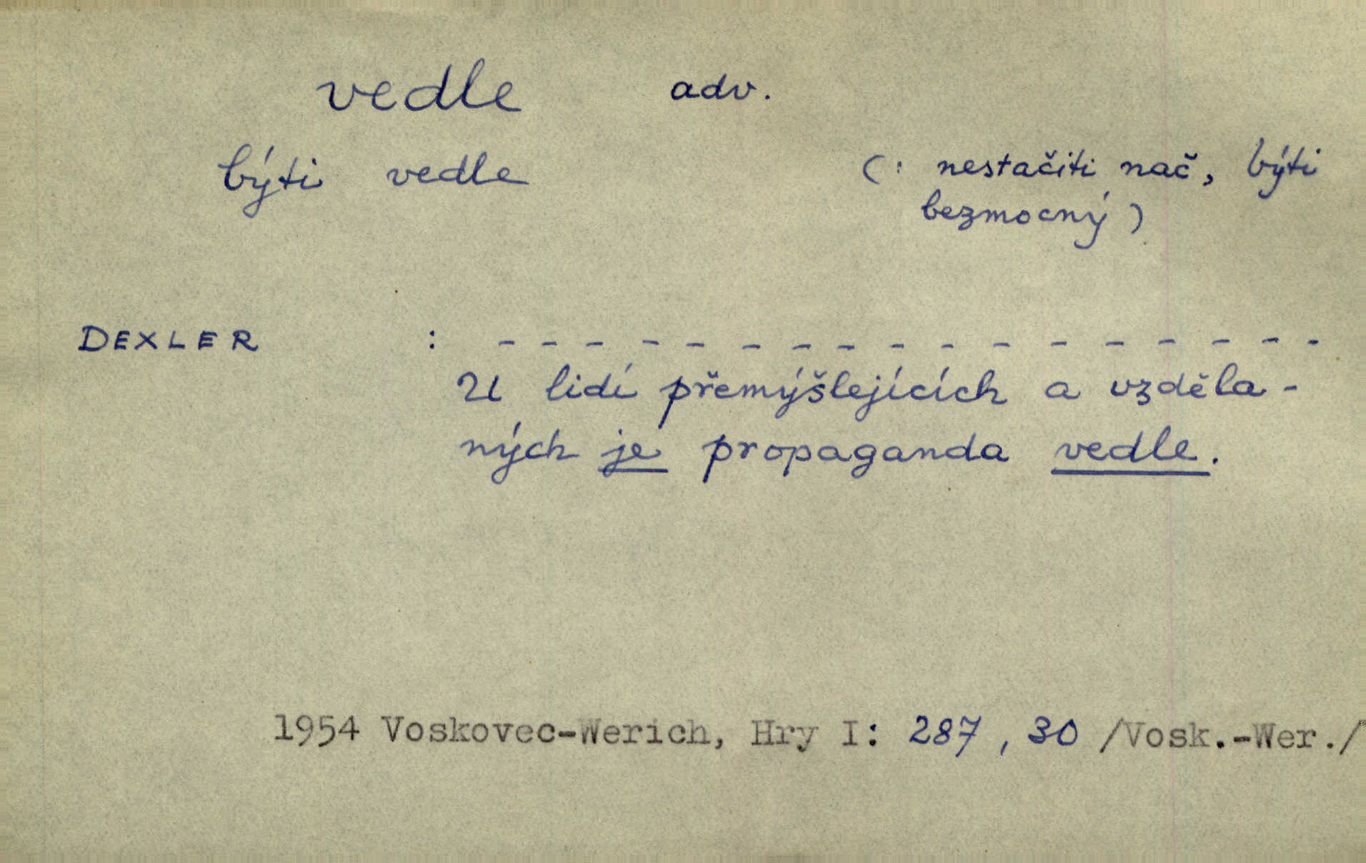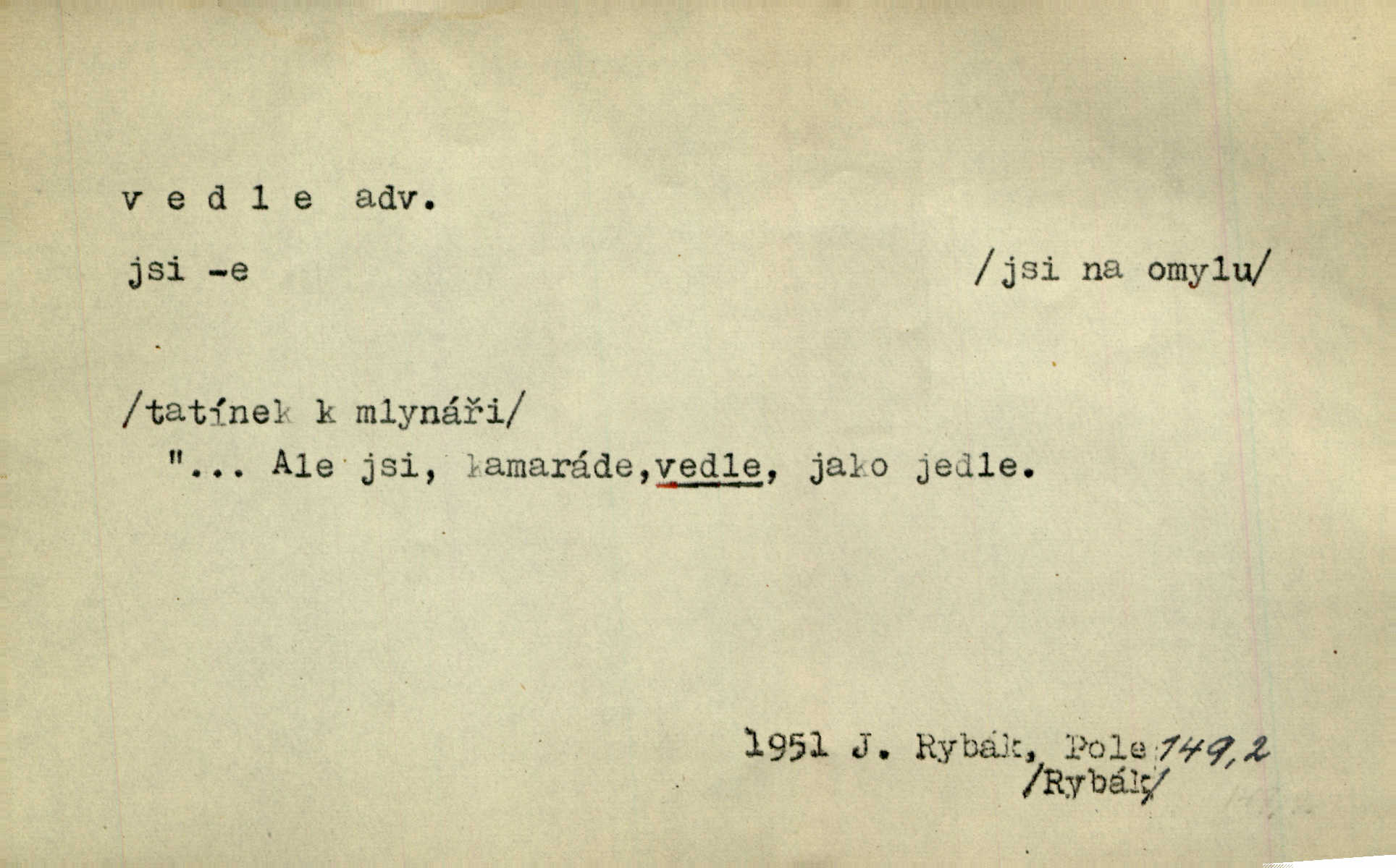 - vedle adv. v těsné blízkosti, sousedství někoho n. něčeho, v malé vzdálenosti někoho n. něčeho. Vedle viselo telefonní sluchátko. John. Ten rudý prapor náš s tím bílým vedle polem. Ner. Brzy také obrátil se k vedle jdoucímu panu Vackovi. Choch. Vedle v pokoji někdo se prudko rozkašlal. Jir. Teta vešla opět do kuchyně. Strýc se vedle svléká. Šim. Vedle u zedníků něco pekli. Čech. Byla jsem vedle, u Frýdků. Jir. Hukal štípal vedle sousedovi dříví. Šmil. Lid. I Jaroušek od vedle se na té hromadě [písku] batolíval od sousedů. Mateříd. D stranou, mimo; nesprávně, ne přímo. Škoda rány, která padne vedle. Šim. Urážlivé narážky pana poslance střelily rozhodně vedle. R. právo. Myslím, že jste trefil hodně vedle zmýlil jste se. Mart. Opět sáhl vedle, jako vždycky. Kop. Až jsem jednou šlápl vedle a musel se oženit udělal chybu. Lang. A já nerad mluvím vedle, a když mluvím, zbytečně se pak jenom za to stydím ne k věci. Mah. Nesnáší [soudce] mluvení vedle. Kocourek. I když jsou nejvřeleji upřímné, myslily si přece něco vedle potají. Lier. A náhodou není ani kousíček vedle. Náhodou uhod’. Ros. Slang. Všechno je mi vedle nezáleží mi na ničem. Vrbová. D Zast. mimochodem. To není sada praktická, což, vedle řečeno, je nad míru hloupé. Sab.