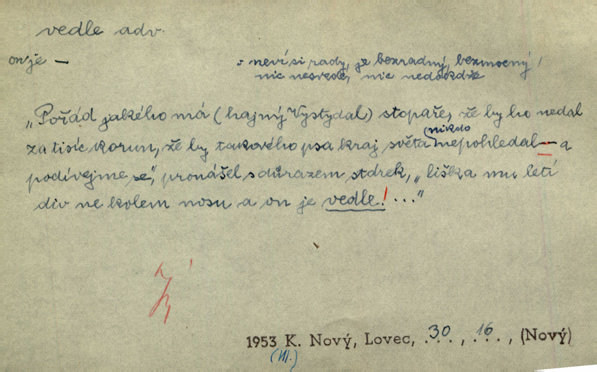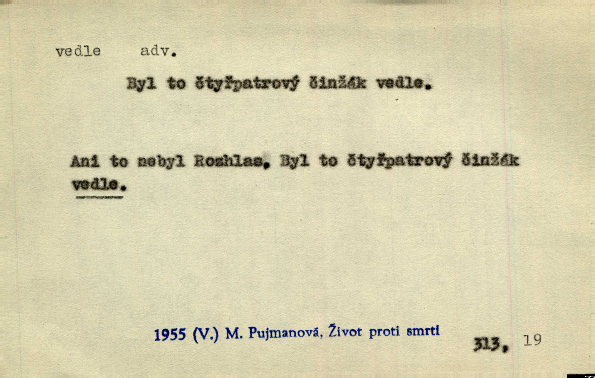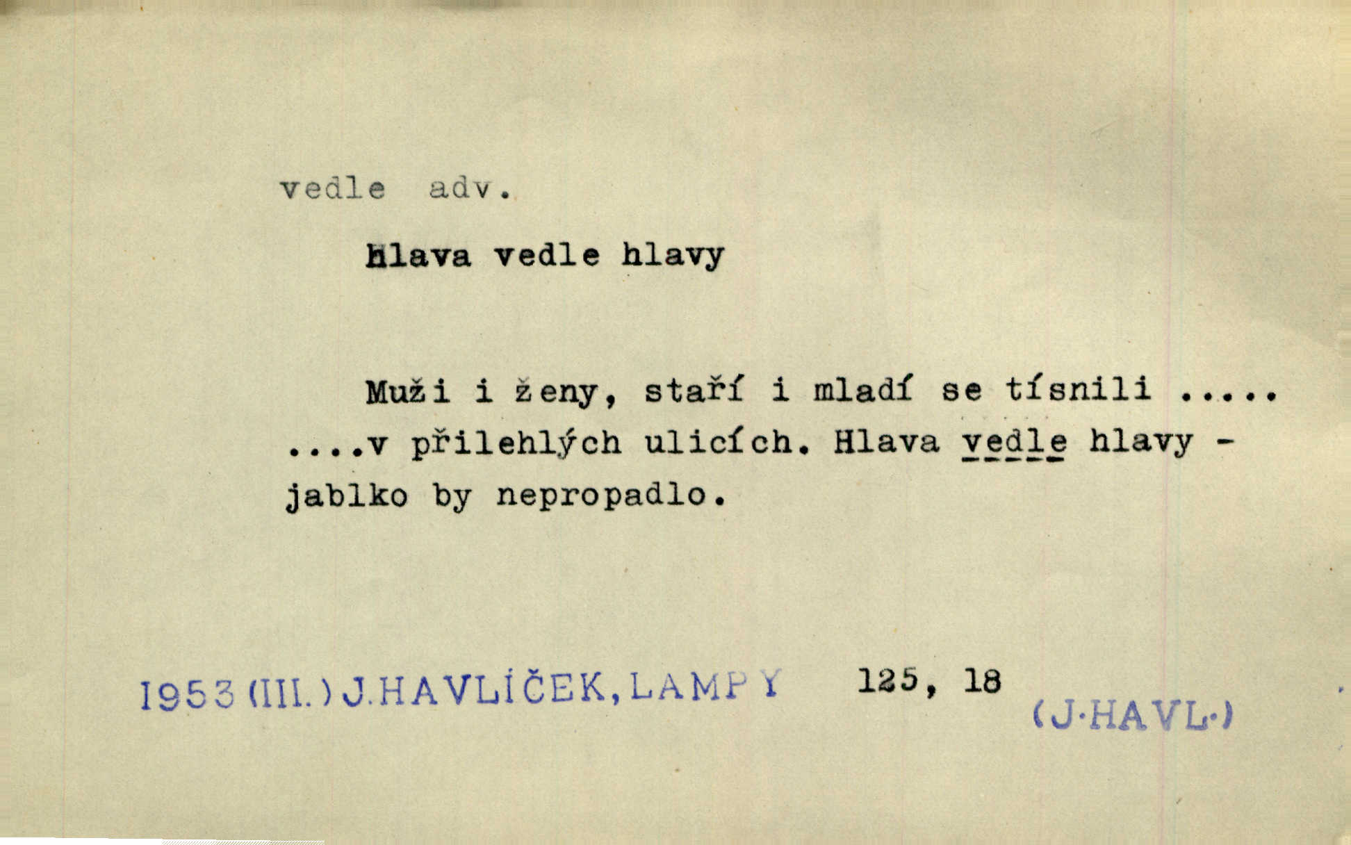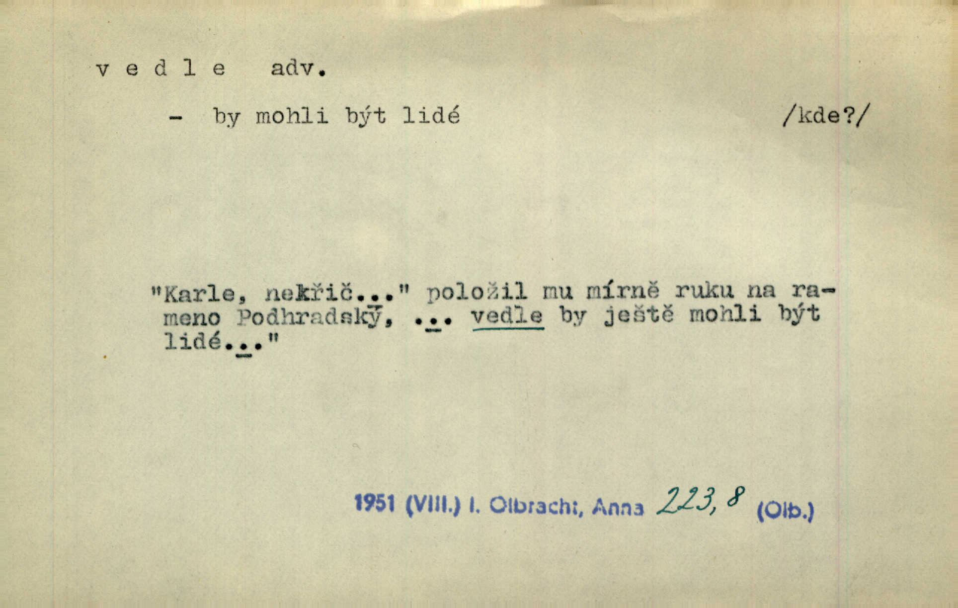 - vedle adv. v těsné blízkosti, sousedství někoho n. něčeho, v malé vzdálenosti někoho n. něčeho. Vedle viselo telefonní sluchátko. John. Ten rudý prapor náš s tím bílým vedle polem. Ner. Brzy také obrátil se k vedle jdoucímu panu Vackovi. Choch. Vedle v pokoji někdo se prudko rozkašlal. Jir. Teta vešla opět do kuchyně. Strýc se vedle svléká. Šim. Vedle u zedníků něco pekli. Čech. Byla jsem vedle, u Frýdků. Jir. Hukal štípal vedle sousedovi dříví. Šmil. Lid. I Jaroušek od vedle se na té hromadě [písku] batolíval od sousedů. Mateříd. D stranou, mimo; nesprávně, ne přímo. Škoda rány, která padne vedle. Šim. Urážlivé narážky pana poslance střelily rozhodně vedle. R. právo. Myslím, že jste trefil hodně vedle zmýlil jste se. Mart. Opět sáhl vedle, jako vždycky. Kop. Až jsem jednou šlápl vedle a musel se oženit udělal chybu. Lang. A já nerad mluvím vedle, a když mluvím, zbytečně se pak jenom za to stydím ne k věci. Mah. Nesnáší [soudce] mluvení vedle. Kocourek. I když jsou nejvřeleji upřímné, myslily si přece něco vedle potají. Lier. A náhodou není ani kousíček vedle. Náhodou uhod’. Ros. Slang. Všechno je mi vedle nezáleží mi na ničem. Vrbová. D Zast. mimochodem. To není sada praktická, což, vedle řečeno, je nad míru hloupé. Sab.