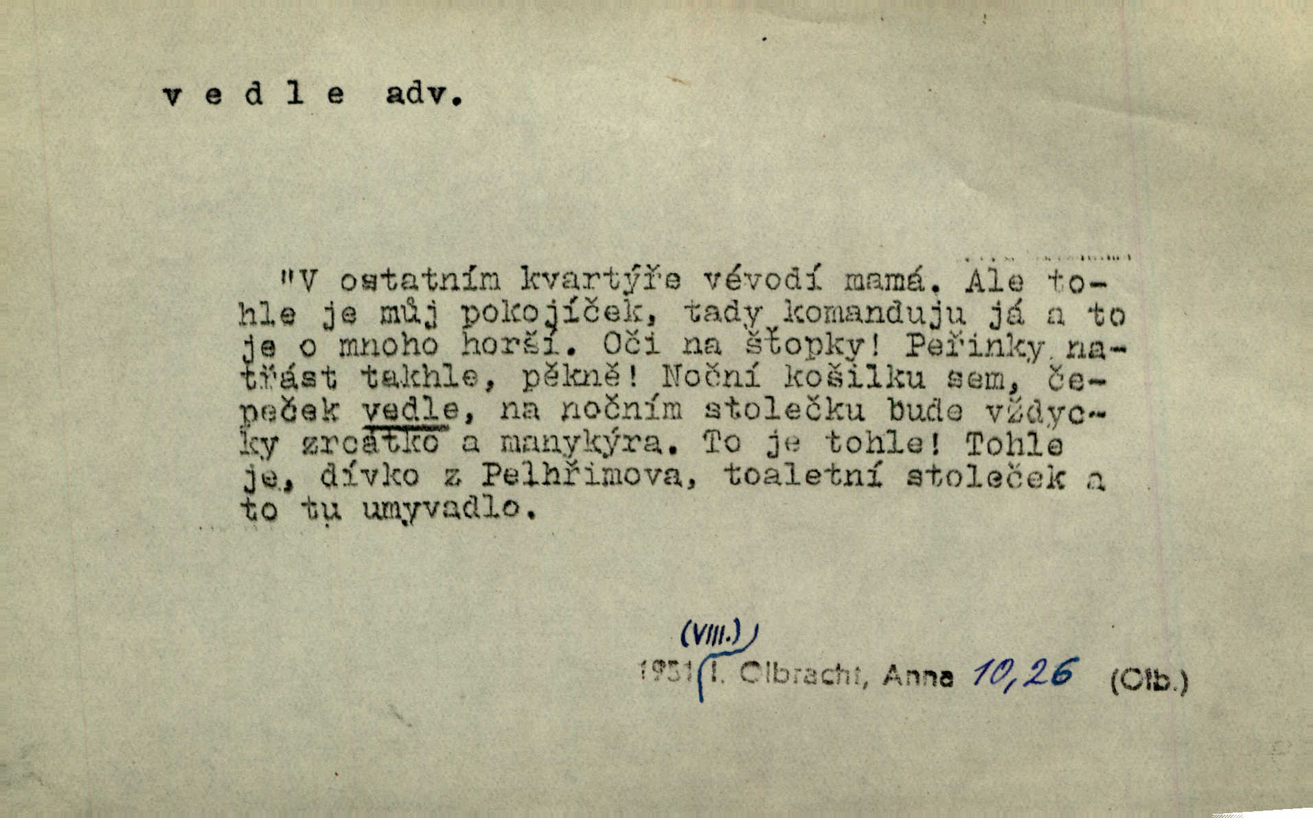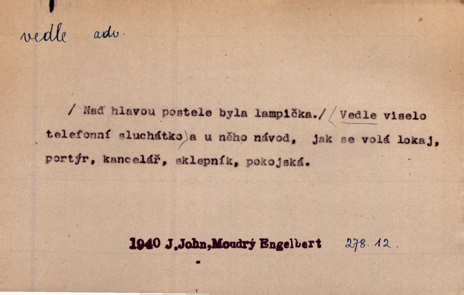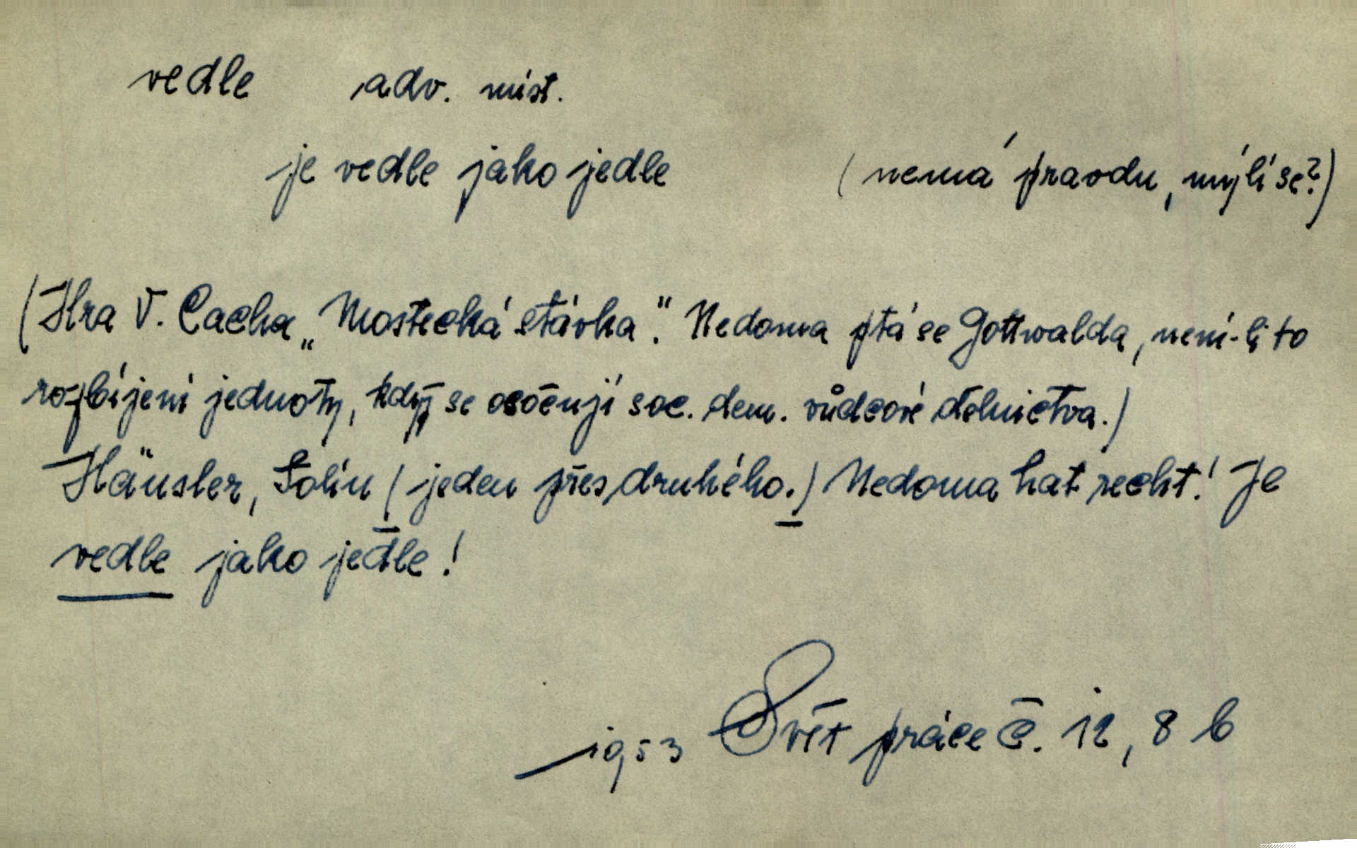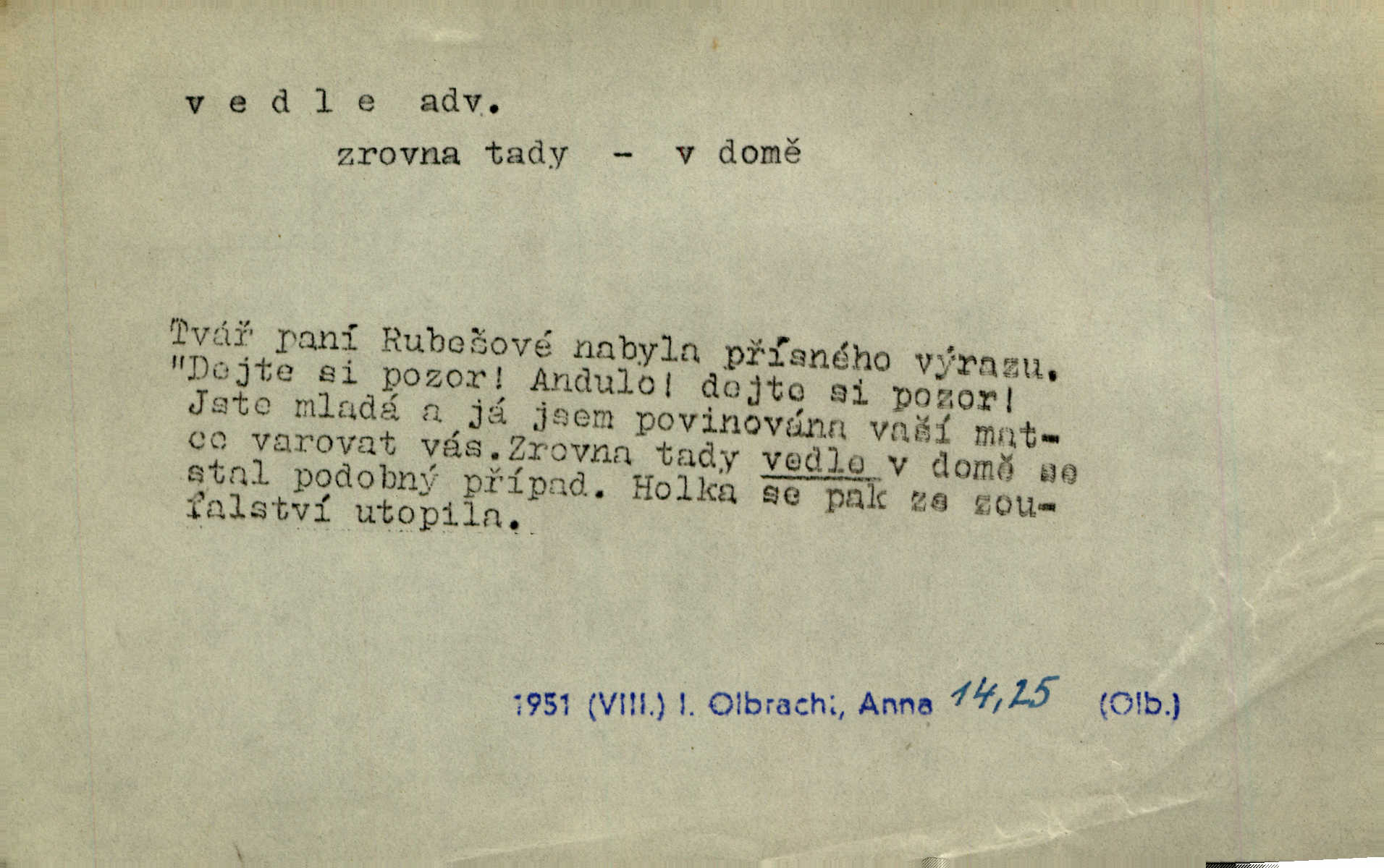 - vedle adv. v těsné blízkosti, sousedství někoho n. něčeho, v malé vzdálenosti někoho n. něčeho. Vedle viselo telefonní sluchátko. John. Ten rudý prapor náš s tím bílým vedle polem. Ner. Brzy také obrátil se k vedle jdoucímu panu Vackovi. Choch. Vedle v pokoji někdo se prudko rozkašlal. Jir. Teta vešla opět do kuchyně. Strýc se vedle svléká. Šim. Vedle u zedníků něco pekli. Čech. Byla jsem vedle, u Frýdků. Jir. Hukal štípal vedle sousedovi dříví. Šmil. Lid. I Jaroušek od vedle se na té hromadě [písku] batolíval od sousedů. Mateříd. D stranou, mimo; nesprávně, ne přímo. Škoda rány, která padne vedle. Šim. Urážlivé narážky pana poslance střelily rozhodně vedle. R. právo. Myslím, že jste trefil hodně vedle zmýlil jste se. Mart. Opět sáhl vedle, jako vždycky. Kop. Až jsem jednou šlápl vedle a musel se oženit udělal chybu. Lang. A já nerad mluvím vedle, a když mluvím, zbytečně se pak jenom za to stydím ne k věci. Mah. Nesnáší [soudce] mluvení vedle. Kocourek. I když jsou nejvřeleji upřímné, myslily si přece něco vedle potají. Lier. A náhodou není ani kousíček vedle. Náhodou uhod’. Ros. Slang. Všechno je mi vedle nezáleží mi na ničem. Vrbová. D Zast. mimochodem. To není sada praktická, což, vedle řečeno, je nad míru hloupé. Sab.
