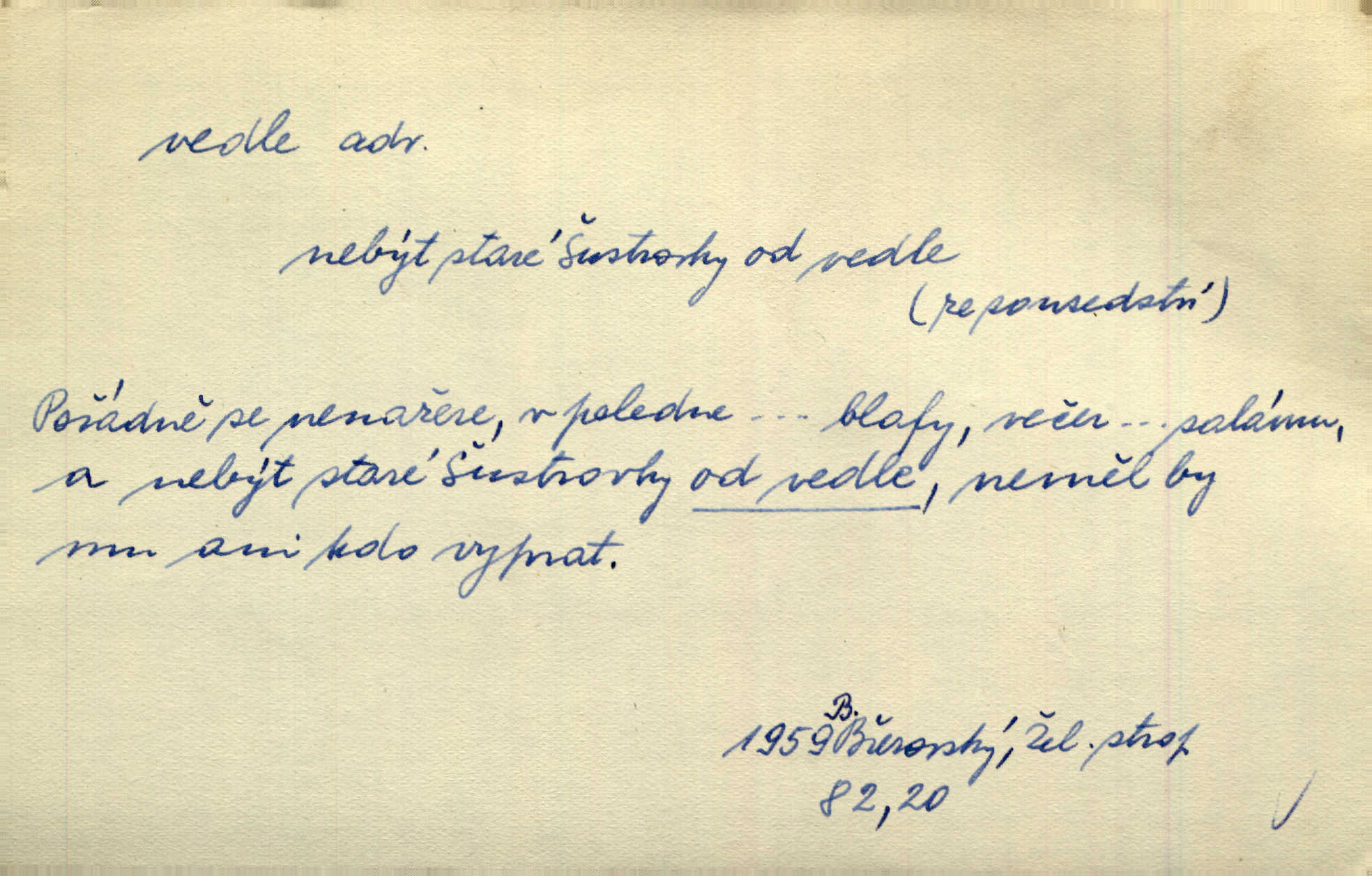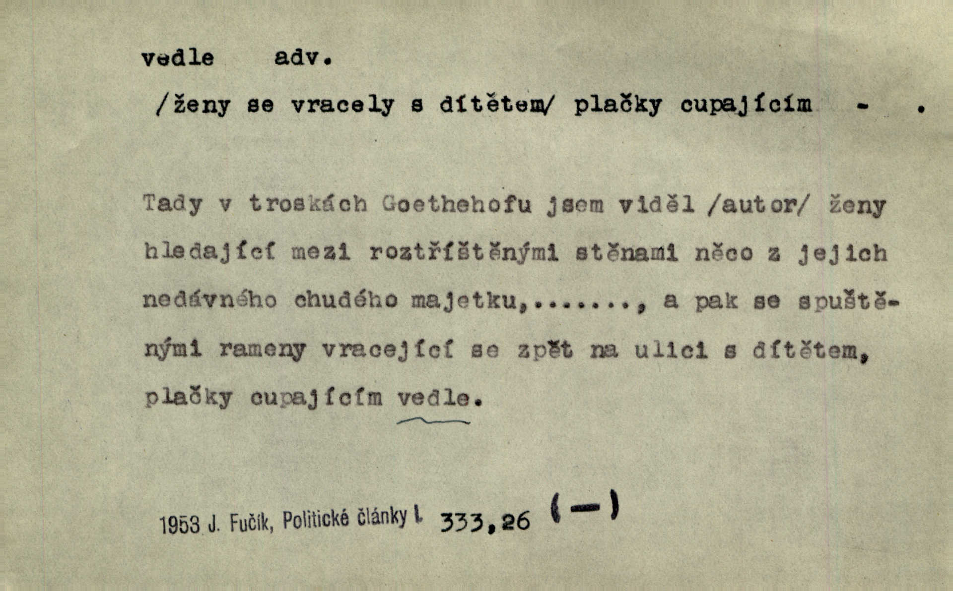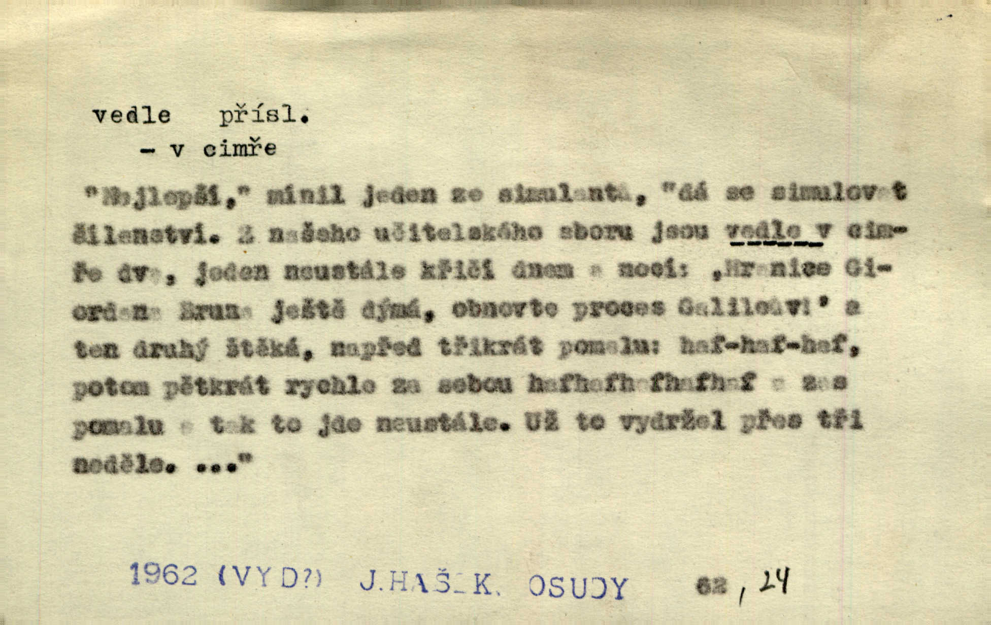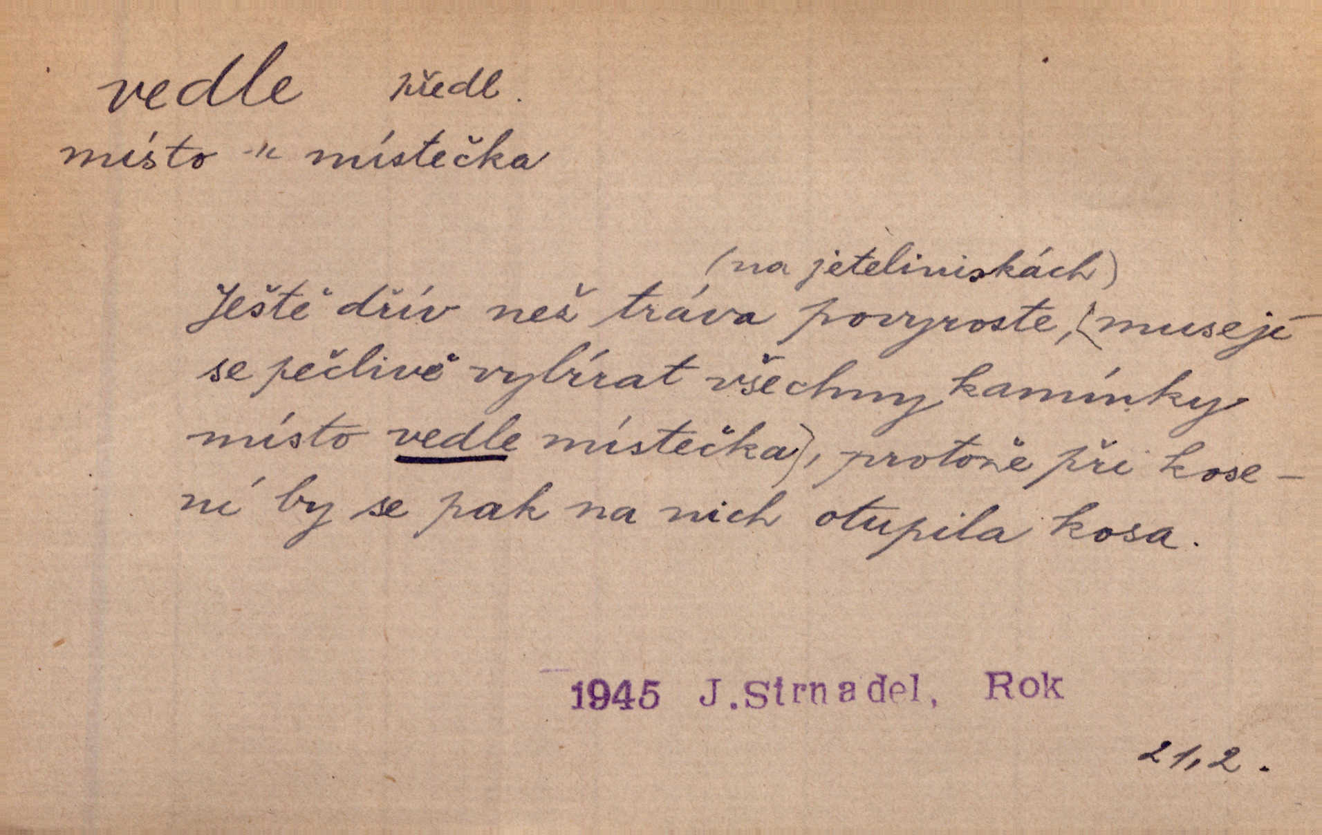 - vedle adv. v těsné blízkosti, sousedství někoho n. něčeho, v malé vzdálenosti někoho n. něčeho. Vedle viselo telefonní sluchátko. John. Ten rudý prapor náš s tím bílým vedle polem. Ner. Brzy také obrátil se k vedle jdoucímu panu Vackovi. Choch. Vedle v pokoji někdo se prudko rozkašlal. Jir. Teta vešla opět do kuchyně. Strýc se vedle svléká. Šim. Vedle u zedníků něco pekli. Čech. Byla jsem vedle, u Frýdků. Jir. Hukal štípal vedle sousedovi dříví. Šmil. Lid. I Jaroušek od vedle se na té hromadě [písku] batolíval od sousedů. Mateříd. D stranou, mimo; nesprávně, ne přímo. Škoda rány, která padne vedle. Šim. Urážlivé narážky pana poslance střelily rozhodně vedle. R. právo. Myslím, že jste trefil hodně vedle zmýlil jste se. Mart. Opět sáhl vedle, jako vždycky. Kop. Až jsem jednou šlápl vedle a musel se oženit udělal chybu. Lang. A já nerad mluvím vedle, a když mluvím, zbytečně se pak jenom za to stydím ne k věci. Mah. Nesnáší [soudce] mluvení vedle. Kocourek. I když jsou nejvřeleji upřímné, myslily si přece něco vedle potají. Lier. A náhodou není ani kousíček vedle. Náhodou uhod’. Ros. Slang. Všechno je mi vedle nezáleží mi na ničem. Vrbová. D Zast. mimochodem. To není sada praktická, což, vedle řečeno, je nad míru hloupé. Sab.