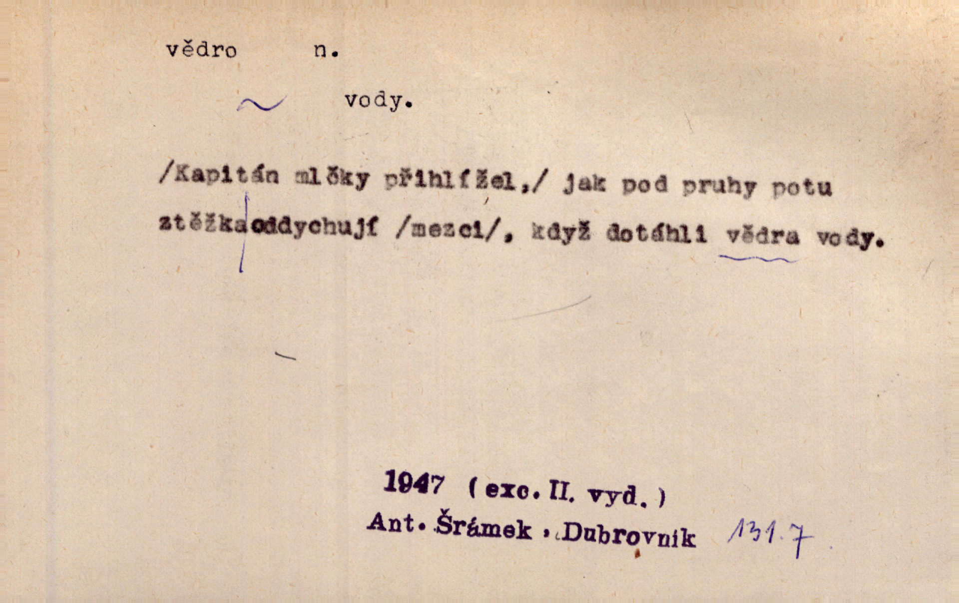 - vedro, -a n. velké horko, parno. Bylo kruté letní vedro. Čech. Nepohnuté stávalo všecko v poledním vedru. Linda. Půda na těch místech nikdy nevysýchala, ani za nejprudšího vedra v létě. V. Mrš. Venku bylo vedro jako v peci. Herb. Po krátké chvíli pociťoval jsem však podivné horko v sobě, jakési suché, vnitřní vedro. Svob. Přen. Foukanice, mrazy i vedra života notně mne sešlehaly. Rais. Jako bouřlivá tepna budoucnosti bil zpěv Byronův v současné vedro dusné ovzduší doby. Krás. Jen němé vedro tvé spravedlnosti sálá. Břez.