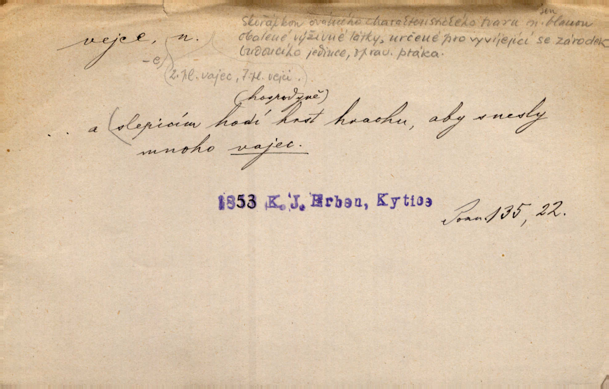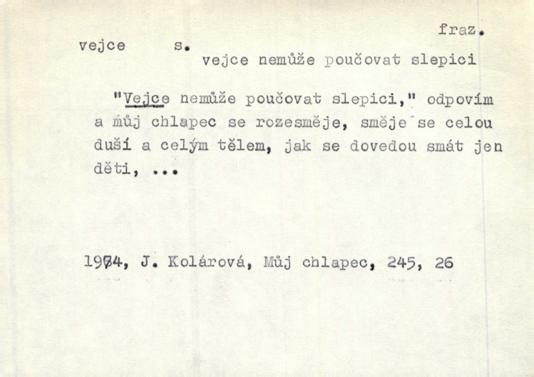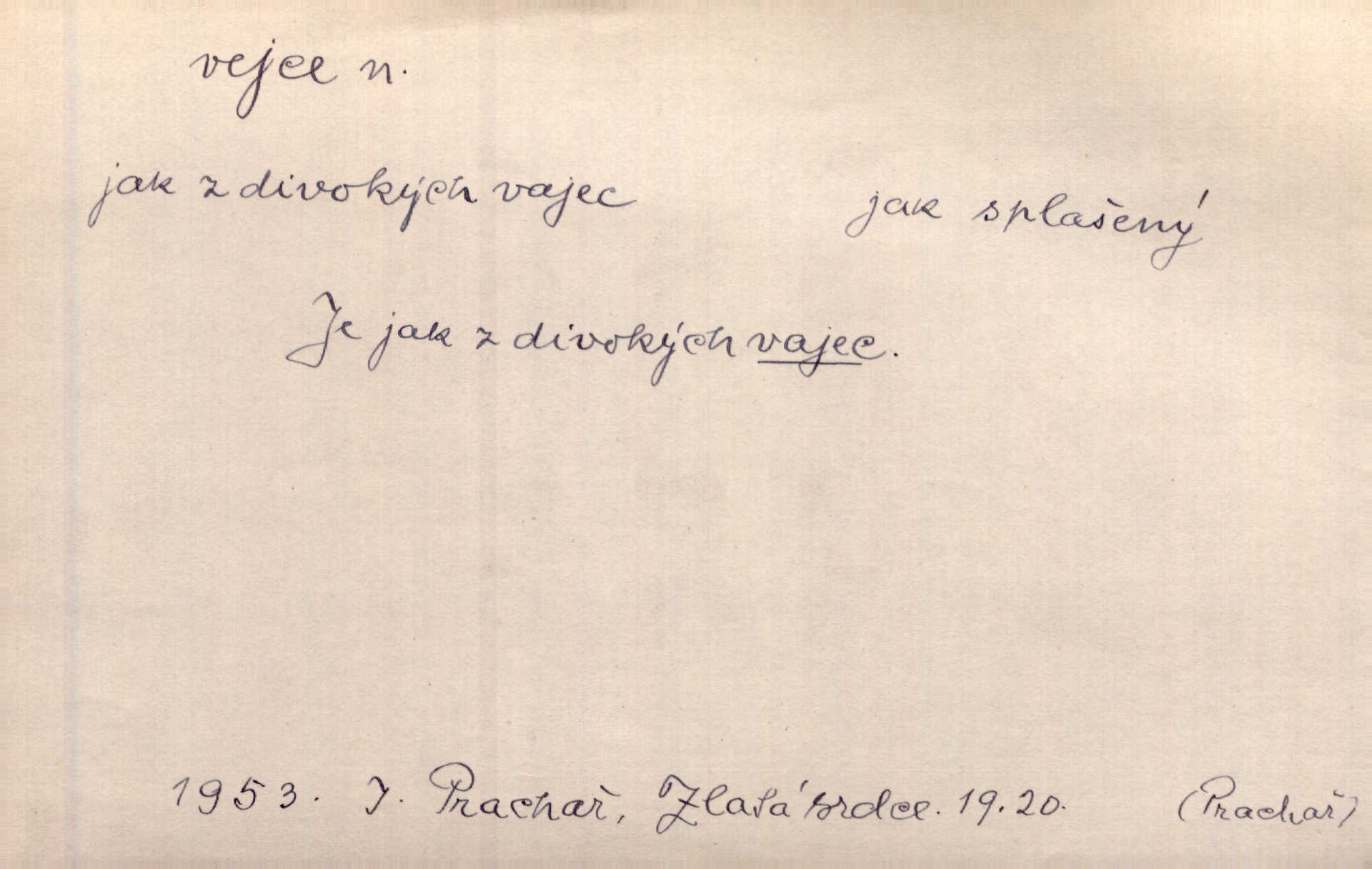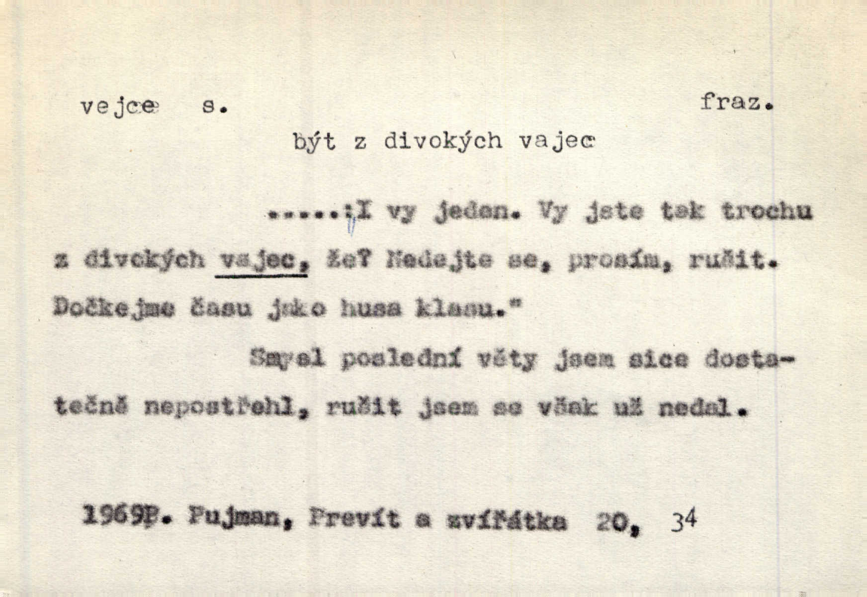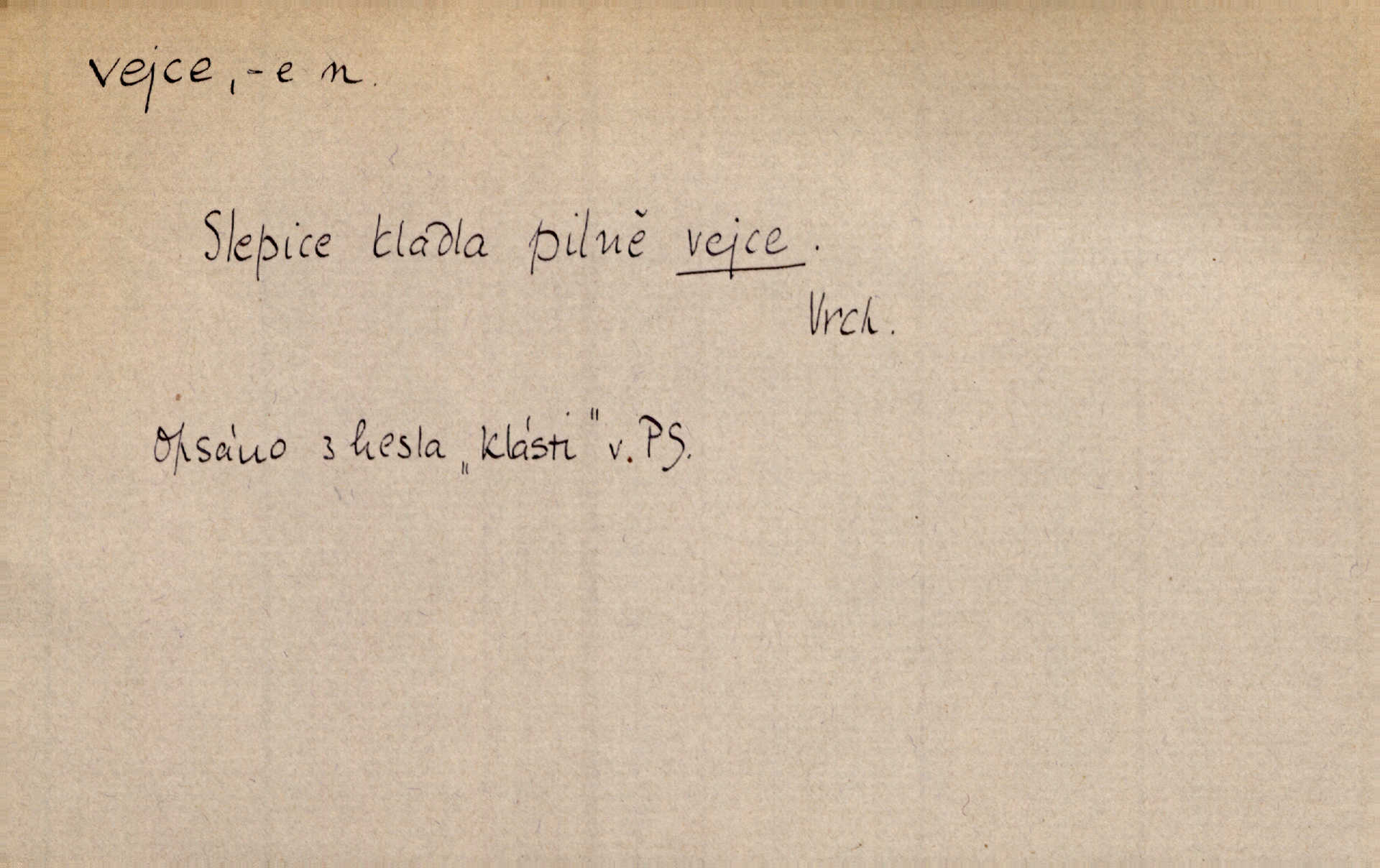 - vejce, -e n. (2. pl. vajec, 7. vejci) skořápkou oválného tvaru n. jen blanou obalený zárodek budoucího jedince, zpr. ptáka. Slepicím hodí hrst hrachu, aby snesly mnoho vajec. Erb. Má stará schovává pro vás vejce od tyrolek k násadce. Něm. Mladá nosila do města vejce na prodej, co jim slepice snesly. Erb. Vybrali jsme kde jaké vejce z kurníku. Kam. Voralka již skládala vejce na kuřata, na kačky i na housata. Rais. V díře na jiné straně o něco výše jsou datlíci ještě ve vejcích. Hál. Smetánky žluté jak z vejce vyvrhnutý žloutek krčily se v trávě. V. Mrš. Dostávali jsme malovaná vejce i perník kraslice. Jir. Potom vyměňují si červené vejce (kraslice). Něm. Kameny v prstenech jako holubí vejce. Heřm. Slívy modrají se velké jako vejce slepičí. Čech. Vypouklé jeho čelo bylo holé jako vejce. Maj. A jeden ten sirotek jako druhý, jako vejce od černé slepice a od bílé. Ner. Jako vejce vejci, tak byli si podobni dnové na Dubecké faře úplně. Baar. Holubička z vejce urobená [visí nad kamny] ze skořápky. Čech. Která slípka mnoho kdáče, ta málo vajec nese kdo mnoho mluví, málo udělá. Přísl. A jak sobě vyšlapuje, zticha jako po vejcích opatrně. Choch. Dávám pozor, jako bych nesl vejce na másle, a přece jsem rozlil byl jsem velmi opatrný. Prav. S těmi [pány] musí člověk jako s měkkými vejcemi opatrně, slušně. Svět. Vím, že šetříval [soudce] tuláků jako čerjených vajec jednal s nimi mírně. Vanč. Proto [aby se zachoval] musí tancovat mezi vejci, nositi na obou ramenou, obě strany klamati a čekati jednati opatrnicky. Herb. Uměl výborně tančiti mezi vejci. Smet. Povídalo se, že to je prach na prach vycvikaná osoba a že sedí na několika vejcích a že čeká, z kterého bude největší kuře jedná obojace. Jah. Ta [žena] všechno ví… i kde čert vejce snes’ ví všechno možné. Staš. Vyhledávaly [noviny] na vejci chlup, aby mohly štváti malichernosti, zbytečnosti. Hol. Vyvraceti hloupé předsudky je vejcem do kuželek kouleti marné. Šmil. Než by vejce uvařil, vyrazil tryskem ze zámecké brány velmi rychle, v mžiku. Vrba. Seděl jako kvočna na vejcích ani se nehnul. Vanč. Až kočka vejce snese nikdy. A. Mar. „Ten si sed’ do vajec,“ usmál se účetní dočkal se nepříjemnosti. Šim. „Těm donesl také slepé vejce,“ zašuškal mlynář nic nezařídil. Kosm. [Ujal se] opuštěného sirotka, ale přes to moudře nejednal a kukaččí vejce do hnízda si přinesl přijal vetřelce, který mu způsobil mnoho nepříjemného. Klost. „Krkavčí matka“, která své dítě pohodí, je taková nadávka, jako řekne-li se „kukaččino vejce“; znamená to: zvrhlé, nezdárné dítě, jež zahubí rodiče. Herb. Jsme všeci z divokejch vajec! divocí. V. Mrš. Obrovská myšlenka — ale jen zas Kolumbovo vejce, nic víc, pravím věc v podstatě prostá, ale vyžadující při řešení vtipu. Ner. I forma, v jaké jest proveden [Bar-Kochba], byla pro mne vskutku vejcem Kolumbovým něčím překvapujícím. Vrch. To je všechno tvůj výmysl, babizno, tvoje hadí vejce! Nic takového neřekla Jányška starostovi pomluva, zlý výmysl. Rón. Zeměd. matičková vejce vhodná k nakládání, v srpnu n. začátkem září snesená. Porcelánové vejce podkladek. Kuch. sázená, míchaná, smažená a pod. vejce. D něco tvarem tomuto ptačímu vejci podobného. Ohromné vejce, kde se taví litina s hliníkem, obrátilo se ústím k nebi. Maj. Dávno vrhač pum vrhl svá „vejce“ bomby. Lid. nov. Říkalo se jim [kapesním hodinkám] pro jejich charakteristický tvar „norimberské vejce“. Lid. nov. Lid. U Kujíčků zrají papeží vejce paví (ovoce). Hais. Zahr. paví vejce odrůda slívy s plody vejčitými. D červená vejce lid. velikonoce. Skutečně „po červených vejcích“ bylo Šmatlánovi lépe. Nov.