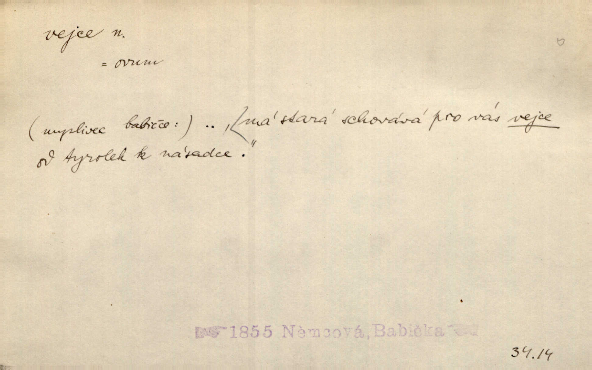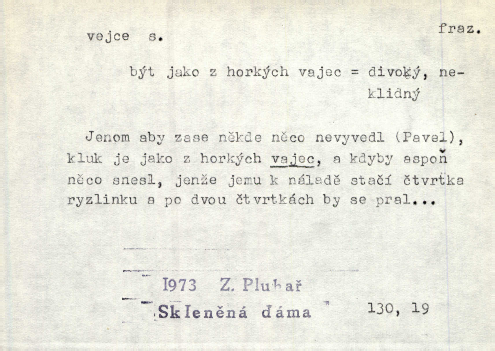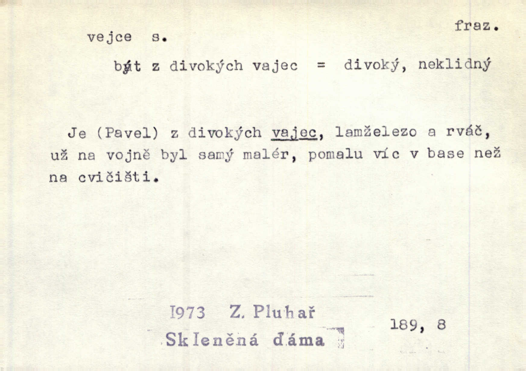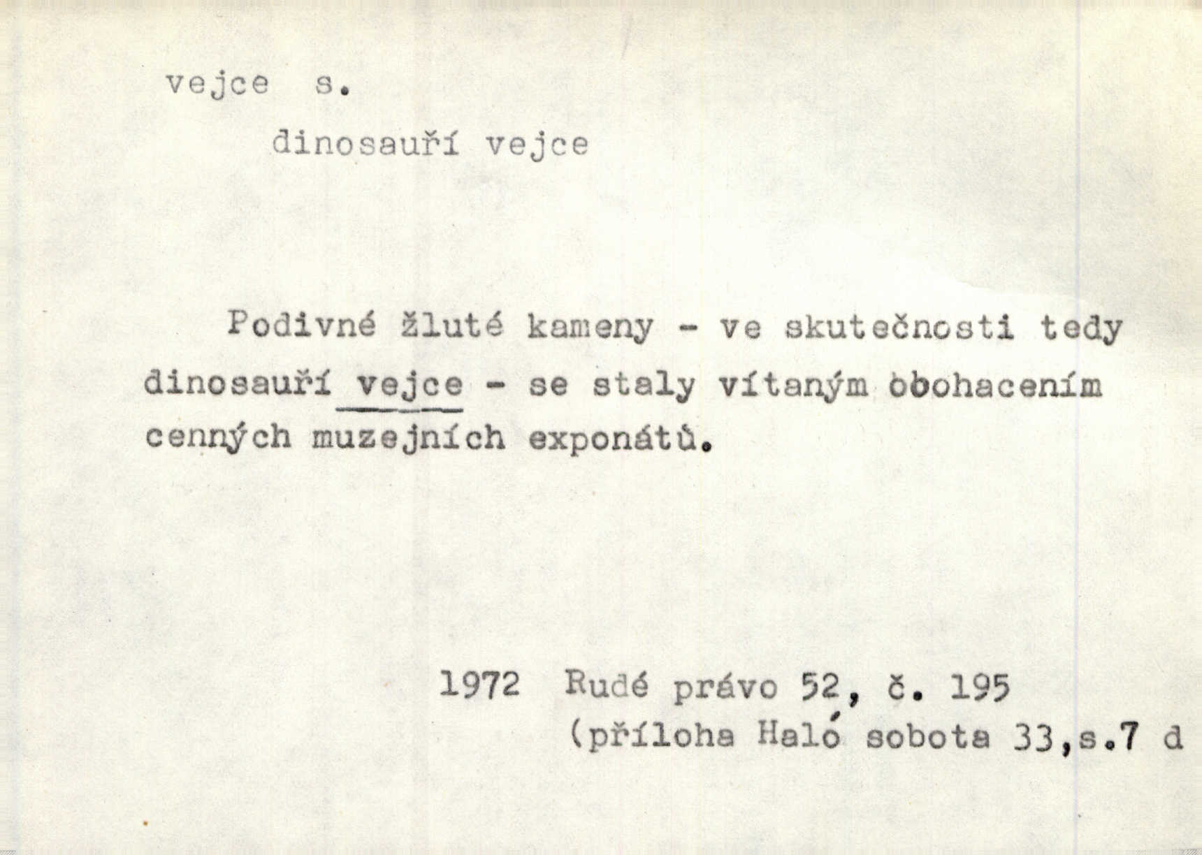 - vejce, -e n. (2. pl. vajec, 7. vejci) skořápkou oválného tvaru n. jen blanou obalený zárodek budoucího jedince, zpr. ptáka. Slepicím hodí hrst hrachu, aby snesly mnoho vajec. Erb. Má stará schovává pro vás vejce od tyrolek k násadce. Něm. Mladá nosila do města vejce na prodej, co jim slepice snesly. Erb. Vybrali jsme kde jaké vejce z kurníku. Kam. Voralka již skládala vejce na kuřata, na kačky i na housata. Rais. V díře na jiné straně o něco výše jsou datlíci ještě ve vejcích. Hál. Smetánky žluté jak z vejce vyvrhnutý žloutek krčily se v trávě. V. Mrš. Dostávali jsme malovaná vejce i perník kraslice. Jir. Potom vyměňují si červené vejce (kraslice). Něm. Kameny v prstenech jako holubí vejce. Heřm. Slívy modrají se velké jako vejce slepičí. Čech. Vypouklé jeho čelo bylo holé jako vejce. Maj. A jeden ten sirotek jako druhý, jako vejce od černé slepice a od bílé. Ner. Jako vejce vejci, tak byli si podobni dnové na Dubecké faře úplně. Baar. Holubička z vejce urobená [visí nad kamny] ze skořápky. Čech. Která slípka mnoho kdáče, ta málo vajec nese kdo mnoho mluví, málo udělá. Přísl. A jak sobě vyšlapuje, zticha jako po vejcích opatrně. Choch. Dávám pozor, jako bych nesl vejce na másle, a přece jsem rozlil byl jsem velmi opatrný. Prav. S těmi [pány] musí člověk jako s měkkými vejcemi opatrně, slušně. Svět. Vím, že šetříval [soudce] tuláků jako čerjených vajec jednal s nimi mírně. Vanč. Proto [aby se zachoval] musí tancovat mezi vejci, nositi na obou ramenou, obě strany klamati a čekati jednati opatrnicky. Herb. Uměl výborně tančiti mezi vejci. Smet. Povídalo se, že to je prach na prach vycvikaná osoba a že sedí na několika vejcích a že čeká, z kterého bude největší kuře jedná obojace. Jah. Ta [žena] všechno ví… i kde čert vejce snes’ ví všechno možné. Staš. Vyhledávaly [noviny] na vejci chlup, aby mohly štváti malichernosti, zbytečnosti. Hol. Vyvraceti hloupé předsudky je vejcem do kuželek kouleti marné. Šmil. Než by vejce uvařil, vyrazil tryskem ze zámecké brány velmi rychle, v mžiku. Vrba. Seděl jako kvočna na vejcích ani se nehnul. Vanč. Až kočka vejce snese nikdy. A. Mar. „Ten si sed’ do vajec,“ usmál se účetní dočkal se nepříjemnosti. Šim. „Těm donesl také slepé vejce,“ zašuškal mlynář nic nezařídil. Kosm. [Ujal se] opuštěného sirotka, ale přes to moudře nejednal a kukaččí vejce do hnízda si přinesl přijal vetřelce, který mu způsobil mnoho nepříjemného. Klost. „Krkavčí matka“, která své dítě pohodí, je taková nadávka, jako řekne-li se „kukaččino vejce“; znamená to: zvrhlé, nezdárné dítě, jež zahubí rodiče. Herb. Jsme všeci z divokejch vajec! divocí. V. Mrš. Obrovská myšlenka — ale jen zas Kolumbovo vejce, nic víc, pravím věc v podstatě prostá, ale vyžadující při řešení vtipu. Ner. I forma, v jaké jest proveden [Bar-Kochba], byla pro mne vskutku vejcem Kolumbovým něčím překvapujícím. Vrch. To je všechno tvůj výmysl, babizno, tvoje hadí vejce! Nic takového neřekla Jányška starostovi pomluva, zlý výmysl. Rón. Zeměd. matičková vejce vhodná k nakládání, v srpnu n. začátkem září snesená. Porcelánové vejce podkladek. Kuch. sázená, míchaná, smažená a pod. vejce. D něco tvarem tomuto ptačímu vejci podobného. Ohromné vejce, kde se taví litina s hliníkem, obrátilo se ústím k nebi. Maj. Dávno vrhač pum vrhl svá „vejce“ bomby. Lid. nov. Říkalo se jim [kapesním hodinkám] pro jejich charakteristický tvar „norimberské vejce“. Lid. nov. Lid. U Kujíčků zrají papeží vejce paví (ovoce). Hais. Zahr. paví vejce odrůda slívy s plody vejčitými. D červená vejce lid. velikonoce. Skutečně „po červených vejcích“ bylo Šmatlánovi lépe. Nov.