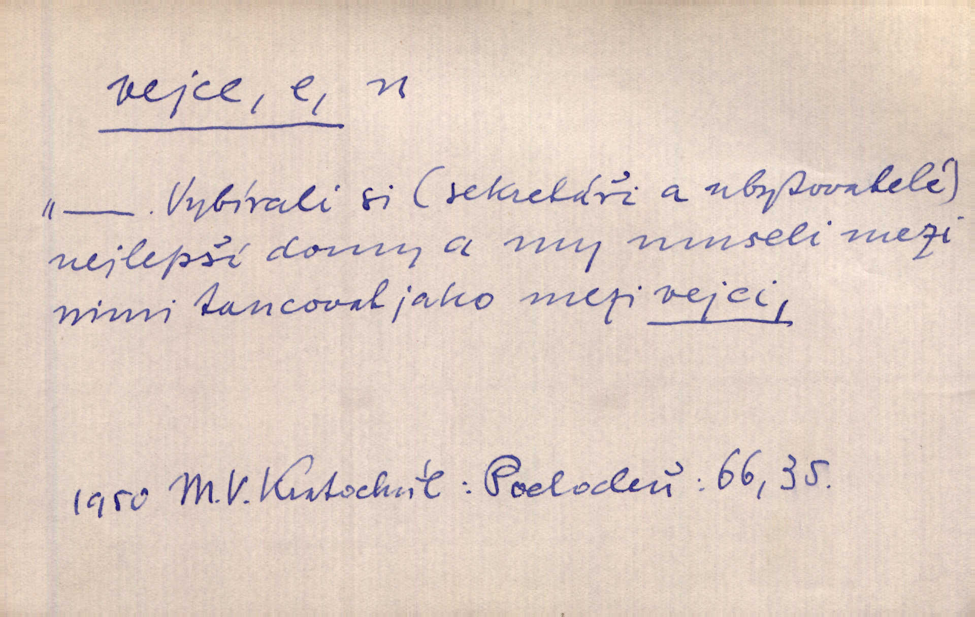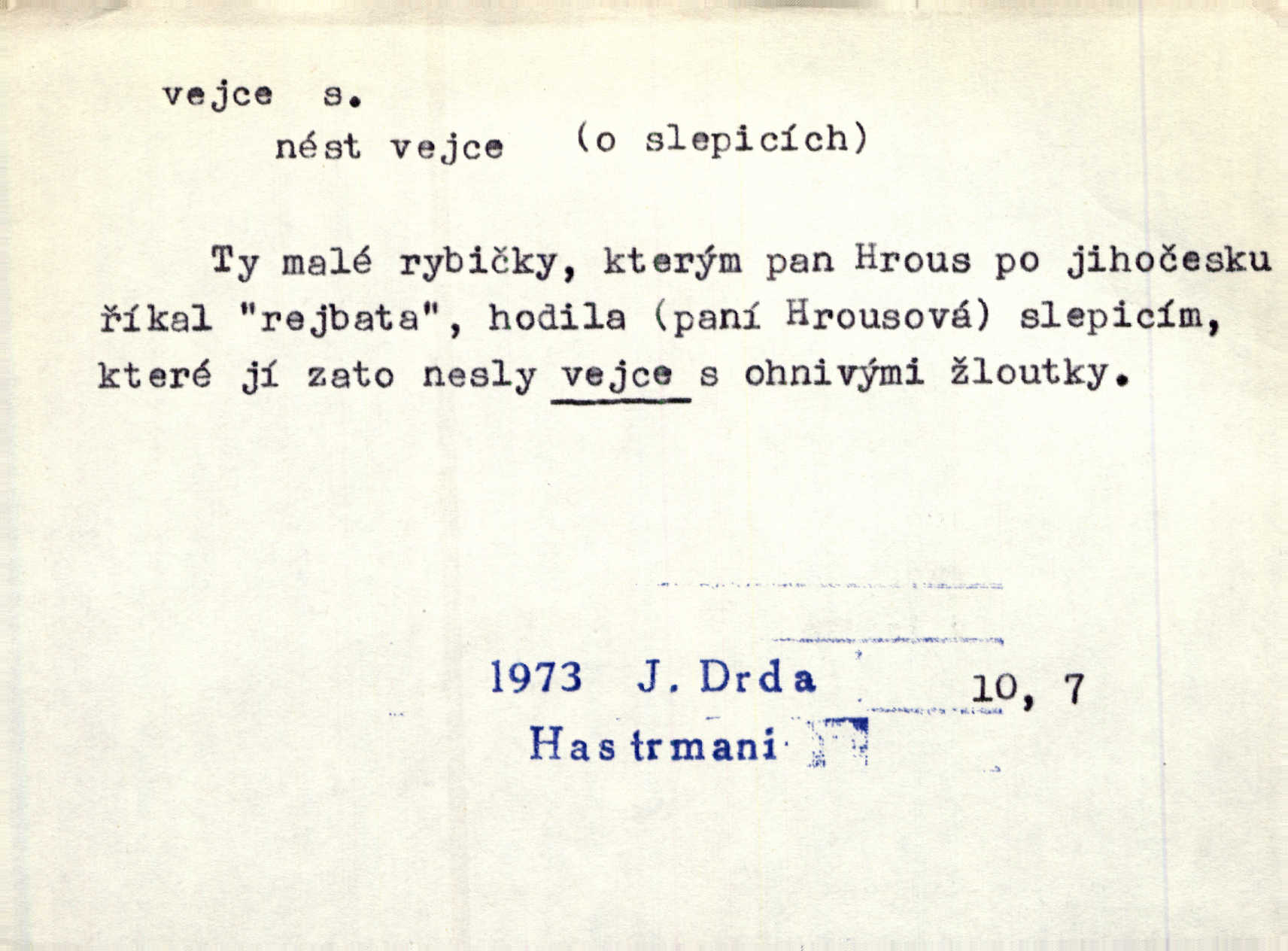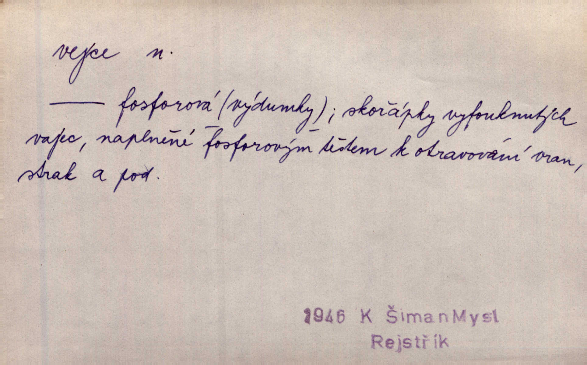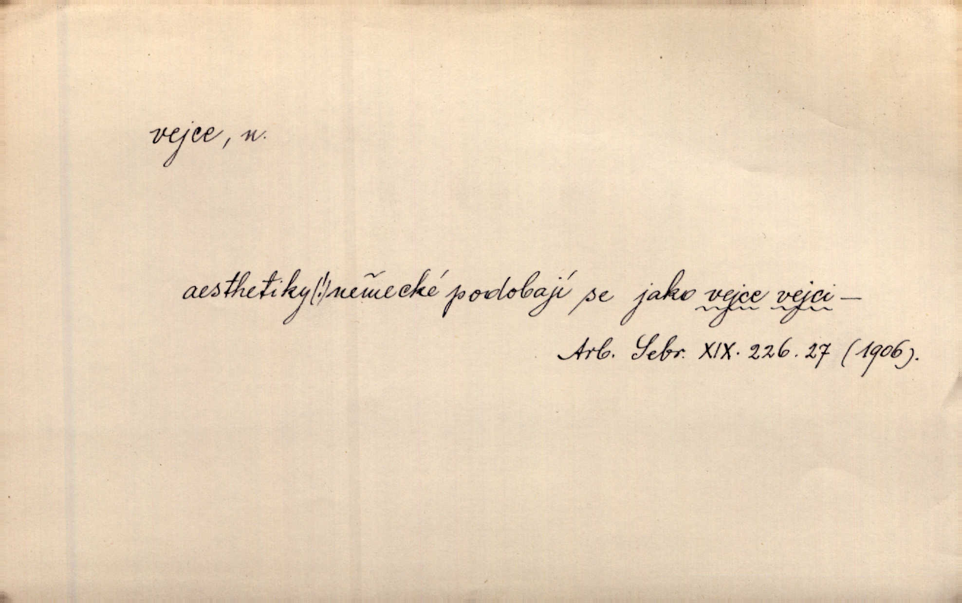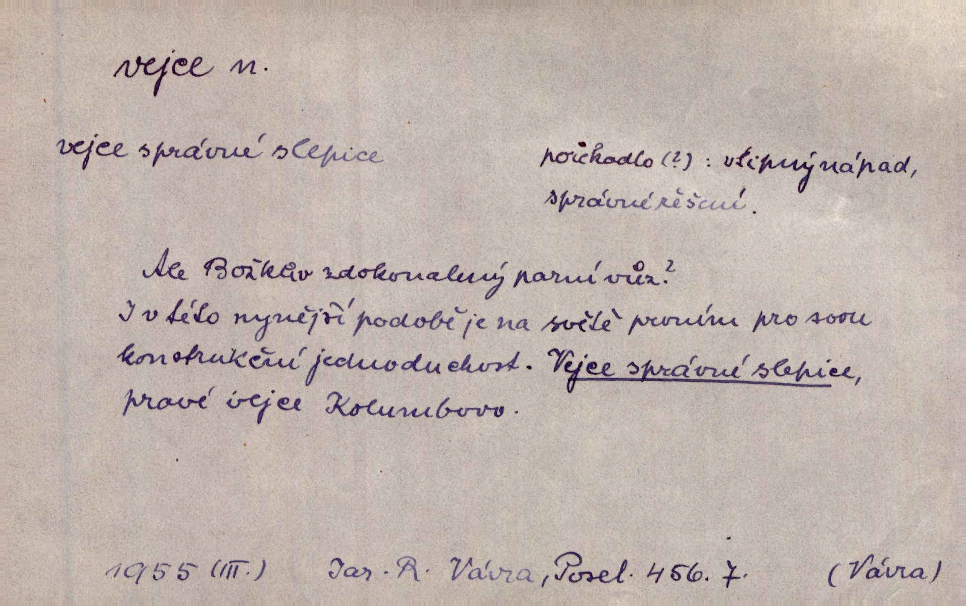 - vejce, -e n. (2. pl. vajec, 7. vejci) skořápkou oválného tvaru n. jen blanou obalený zárodek budoucího jedince, zpr. ptáka. Slepicím hodí hrst hrachu, aby snesly mnoho vajec. Erb. Má stará schovává pro vás vejce od tyrolek k násadce. Něm. Mladá nosila do města vejce na prodej, co jim slepice snesly. Erb. Vybrali jsme kde jaké vejce z kurníku. Kam. Voralka již skládala vejce na kuřata, na kačky i na housata. Rais. V díře na jiné straně o něco výše jsou datlíci ještě ve vejcích. Hál. Smetánky žluté jak z vejce vyvrhnutý žloutek krčily se v trávě. V. Mrš. Dostávali jsme malovaná vejce i perník kraslice. Jir. Potom vyměňují si červené vejce (kraslice). Něm. Kameny v prstenech jako holubí vejce. Heřm. Slívy modrají se velké jako vejce slepičí. Čech. Vypouklé jeho čelo bylo holé jako vejce. Maj. A jeden ten sirotek jako druhý, jako vejce od černé slepice a od bílé. Ner. Jako vejce vejci, tak byli si podobni dnové na Dubecké faře úplně. Baar. Holubička z vejce urobená [visí nad kamny] ze skořápky. Čech. Která slípka mnoho kdáče, ta málo vajec nese kdo mnoho mluví, málo udělá. Přísl. A jak sobě vyšlapuje, zticha jako po vejcích opatrně. Choch. Dávám pozor, jako bych nesl vejce na másle, a přece jsem rozlil byl jsem velmi opatrný. Prav. S těmi [pány] musí člověk jako s měkkými vejcemi opatrně, slušně. Svět. Vím, že šetříval [soudce] tuláků jako čerjených vajec jednal s nimi mírně. Vanč. Proto [aby se zachoval] musí tancovat mezi vejci, nositi na obou ramenou, obě strany klamati a čekati jednati opatrnicky. Herb. Uměl výborně tančiti mezi vejci. Smet. Povídalo se, že to je prach na prach vycvikaná osoba a že sedí na několika vejcích a že čeká, z kterého bude největší kuře jedná obojace. Jah. Ta [žena] všechno ví… i kde čert vejce snes’ ví všechno možné. Staš. Vyhledávaly [noviny] na vejci chlup, aby mohly štváti malichernosti, zbytečnosti. Hol. Vyvraceti hloupé předsudky je vejcem do kuželek kouleti marné. Šmil. Než by vejce uvařil, vyrazil tryskem ze zámecké brány velmi rychle, v mžiku. Vrba. Seděl jako kvočna na vejcích ani se nehnul. Vanč. Až kočka vejce snese nikdy. A. Mar. „Ten si sed’ do vajec,“ usmál se účetní dočkal se nepříjemnosti. Šim. „Těm donesl také slepé vejce,“ zašuškal mlynář nic nezařídil. Kosm. [Ujal se] opuštěného sirotka, ale přes to moudře nejednal a kukaččí vejce do hnízda si přinesl přijal vetřelce, který mu způsobil mnoho nepříjemného. Klost. „Krkavčí matka“, která své dítě pohodí, je taková nadávka, jako řekne-li se „kukaččino vejce“; znamená to: zvrhlé, nezdárné dítě, jež zahubí rodiče. Herb. Jsme všeci z divokejch vajec! divocí. V. Mrš. Obrovská myšlenka — ale jen zas Kolumbovo vejce, nic víc, pravím věc v podstatě prostá, ale vyžadující při řešení vtipu. Ner. I forma, v jaké jest proveden [Bar-Kochba], byla pro mne vskutku vejcem Kolumbovým něčím překvapujícím. Vrch. To je všechno tvůj výmysl, babizno, tvoje hadí vejce! Nic takového neřekla Jányška starostovi pomluva, zlý výmysl. Rón. Zeměd. matičková vejce vhodná k nakládání, v srpnu n. začátkem září snesená. Porcelánové vejce podkladek. Kuch. sázená, míchaná, smažená a pod. vejce. D něco tvarem tomuto ptačímu vejci podobného. Ohromné vejce, kde se taví litina s hliníkem, obrátilo se ústím k nebi. Maj. Dávno vrhač pum vrhl svá „vejce“ bomby. Lid. nov. Říkalo se jim [kapesním hodinkám] pro jejich charakteristický tvar „norimberské vejce“. Lid. nov. Lid. U Kujíčků zrají papeží vejce paví (ovoce). Hais. Zahr. paví vejce odrůda slívy s plody vejčitými. D červená vejce lid. velikonoce. Skutečně „po červených vejcích“ bylo Šmatlánovi lépe. Nov.