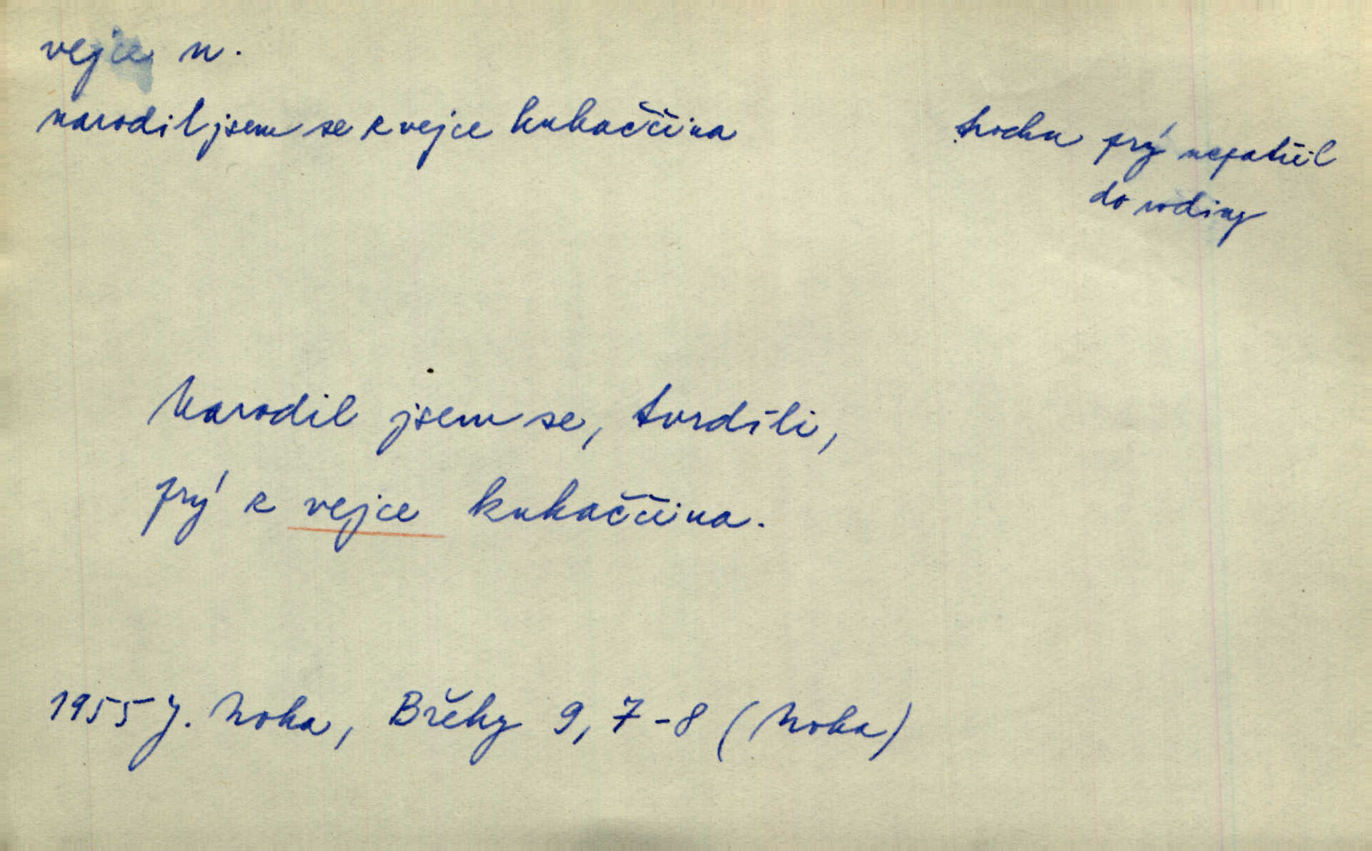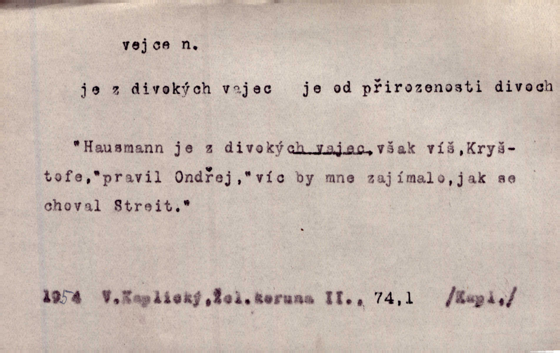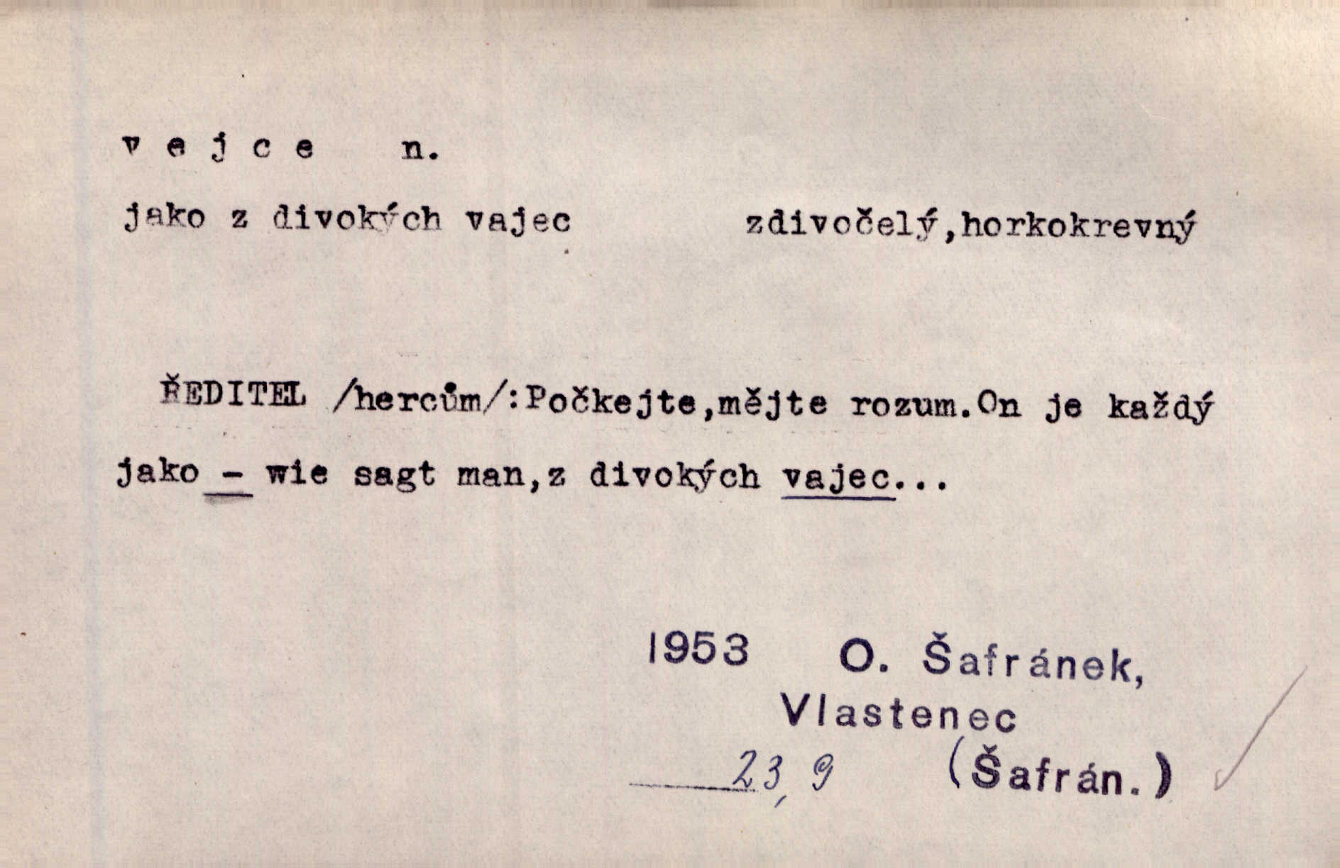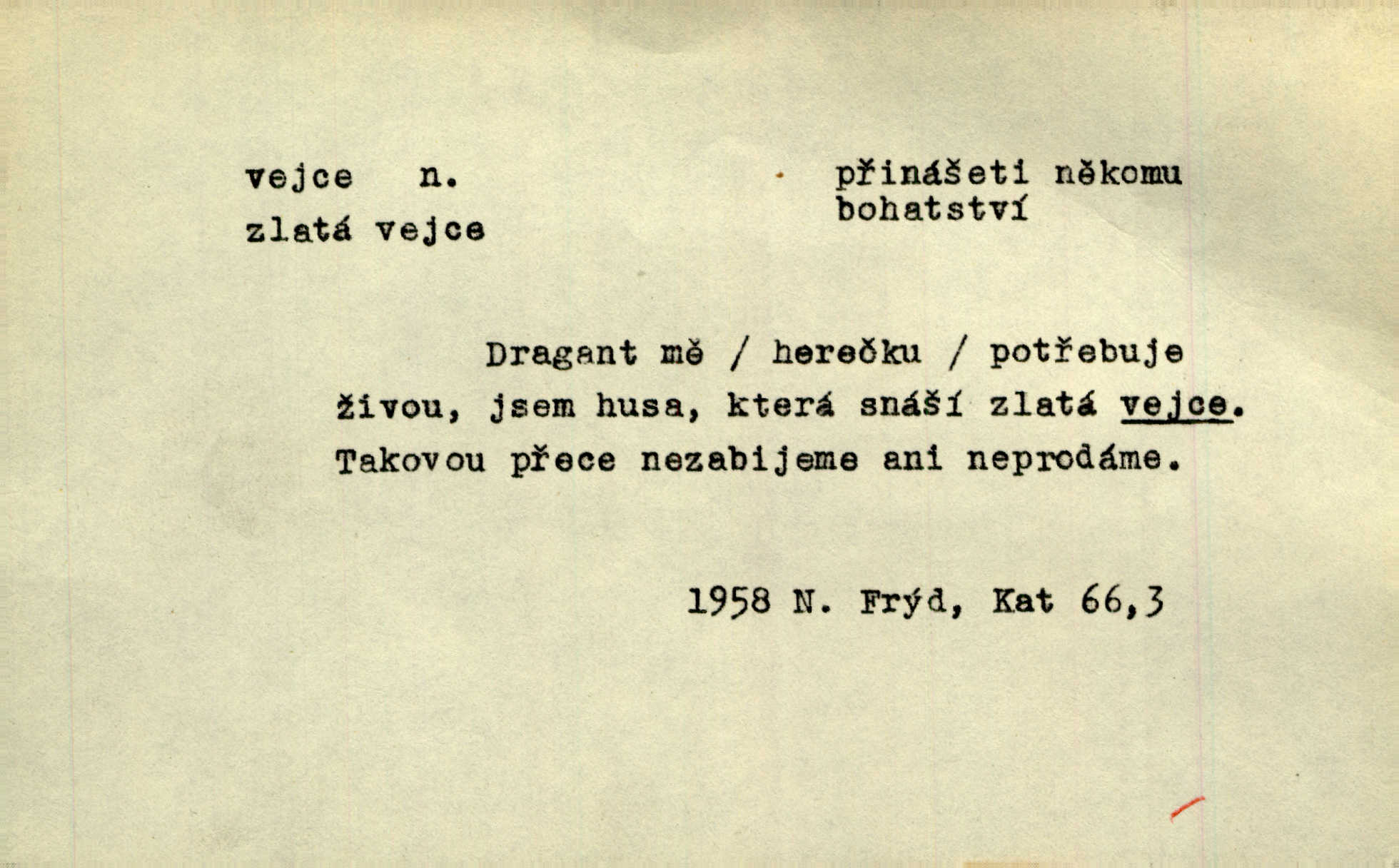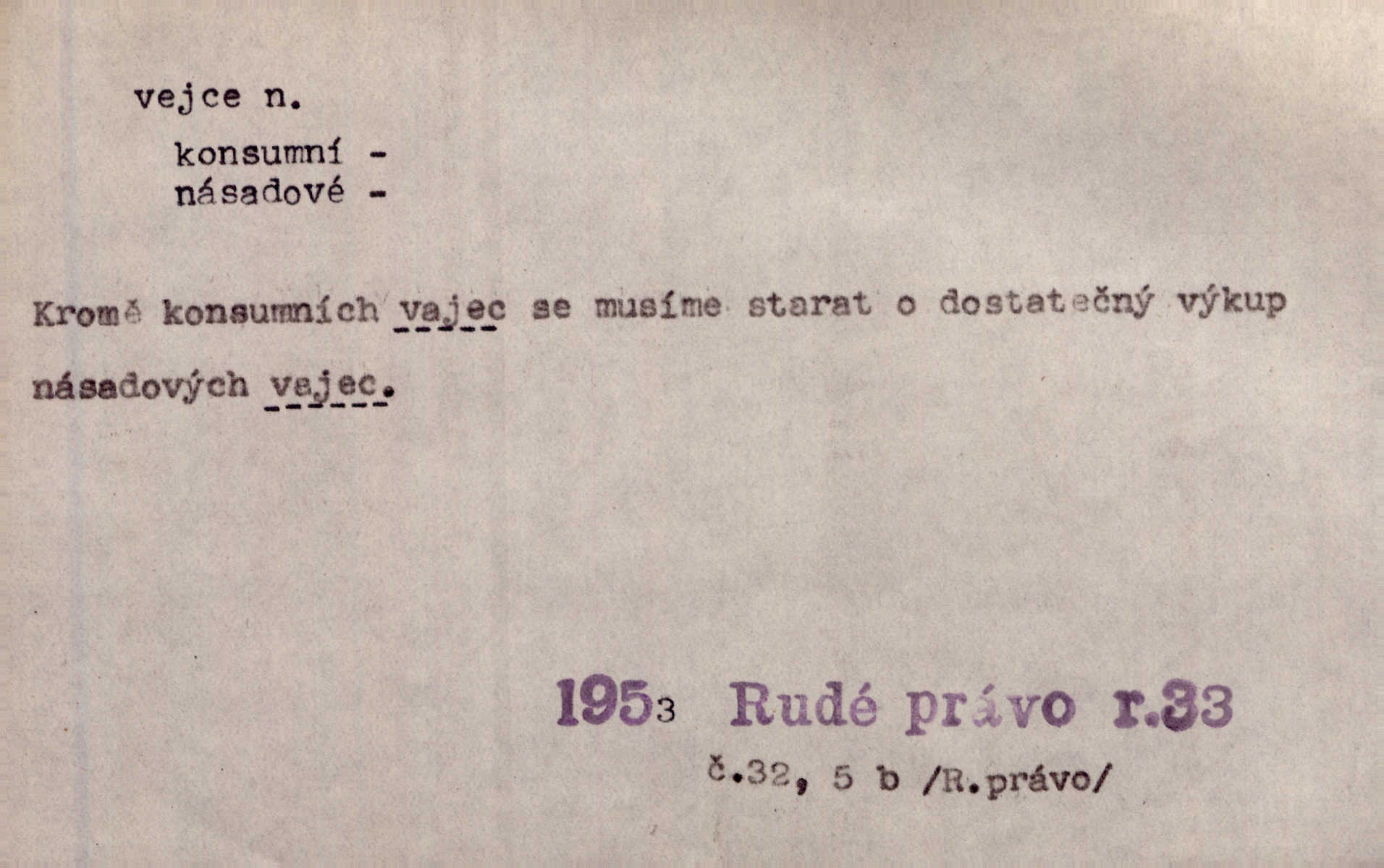- vejce, -e n. (2. pl. vajec, 7. vejci) skořápkou oválného tvaru n. jen blanou obalený zárodek budoucího jedince, zpr. ptáka. Slepicím hodí hrst hrachu, aby snesly mnoho vajec. Erb. Má stará schovává pro vás vejce od tyrolek k násadce. Něm. Mladá nosila do města vejce na prodej, co jim slepice snesly. Erb. Vybrali jsme kde jaké vejce z kurníku. Kam. Voralka již skládala vejce na kuřata, na kačky i na housata. Rais. V díře na jiné straně o něco výše jsou datlíci ještě ve vejcích. Hál. Smetánky žluté jak z vejce vyvrhnutý žloutek krčily se v trávě. V. Mrš. Dostávali jsme malovaná vejce i perník kraslice. Jir. Potom vyměňují si červené vejce (kraslice). Něm. Kameny v prstenech jako holubí vejce. Heřm. Slívy modrají se velké jako vejce slepičí. Čech. Vypouklé jeho čelo bylo holé jako vejce. Maj. A jeden ten sirotek jako druhý, jako vejce od černé slepice a od bílé. Ner. Jako vejce vejci, tak byli si podobni dnové na Dubecké faře úplně. Baar. Holubička z vejce urobená [visí nad kamny] ze skořápky. Čech. Která slípka mnoho kdáče, ta málo vajec nese kdo mnoho mluví, málo udělá. Přísl. A jak sobě vyšlapuje, zticha jako po vejcích opatrně. Choch. Dávám pozor, jako bych nesl vejce na másle, a přece jsem rozlil byl jsem velmi opatrný. Prav. S těmi [pány] musí člověk jako s měkkými vejcemi opatrně, slušně. Svět. Vím, že šetříval [soudce] tuláků jako čerjených vajec jednal s nimi mírně. Vanč. Proto [aby se zachoval] musí tancovat mezi vejci, nositi na obou ramenou, obě strany klamati a čekati jednati opatrnicky. Herb. Uměl výborně tančiti mezi vejci. Smet. Povídalo se, že to je prach na prach vycvikaná osoba a že sedí na několika vejcích a že čeká, z kterého bude největší kuře jedná obojace. Jah. Ta [žena] všechno ví… i kde čert vejce snes’ ví všechno možné. Staš. Vyhledávaly [noviny] na vejci chlup, aby mohly štváti malichernosti, zbytečnosti. Hol. Vyvraceti hloupé předsudky je vejcem do kuželek kouleti marné. Šmil. Než by vejce uvařil, vyrazil tryskem ze zámecké brány velmi rychle, v mžiku. Vrba. Seděl jako kvočna na vejcích ani se nehnul. Vanč. Až kočka vejce snese nikdy. A. Mar. „Ten si sed’ do vajec,“ usmál se účetní dočkal se nepříjemnosti. Šim. „Těm donesl také slepé vejce,“ zašuškal mlynář nic nezařídil. Kosm. [Ujal se] opuštěného sirotka, ale přes to moudře nejednal a kukaččí vejce do hnízda si přinesl přijal vetřelce, který mu způsobil mnoho nepříjemného. Klost. „Krkavčí matka“, která své dítě pohodí, je taková nadávka, jako řekne-li se „kukaččino vejce“; znamená to: zvrhlé, nezdárné dítě, jež zahubí rodiče. Herb. Jsme všeci z divokejch vajec! divocí. V. Mrš. Obrovská myšlenka — ale jen zas Kolumbovo vejce, nic víc, pravím věc v podstatě prostá, ale vyžadující při řešení vtipu. Ner. I forma, v jaké jest proveden [Bar-Kochba], byla pro mne vskutku vejcem Kolumbovým něčím překvapujícím. Vrch. To je všechno tvůj výmysl, babizno, tvoje hadí vejce! Nic takového neřekla Jányška starostovi pomluva, zlý výmysl. Rón. Zeměd. matičková vejce vhodná k nakládání, v srpnu n. začátkem září snesená. Porcelánové vejce podkladek. Kuch. sázená, míchaná, smažená a pod. vejce. D něco tvarem tomuto ptačímu vejci podobného. Ohromné vejce, kde se taví litina s hliníkem, obrátilo se ústím k nebi. Maj. Dávno vrhač pum vrhl svá „vejce“ bomby. Lid. nov. Říkalo se jim [kapesním hodinkám] pro jejich charakteristický tvar „norimberské vejce“. Lid. nov. Lid. U Kujíčků zrají papeží vejce paví (ovoce). Hais. Zahr. paví vejce odrůda slívy s plody vejčitými. D červená vejce lid. velikonoce. Skutečně „po červených vejcích“ bylo Šmatlánovi lépe. Nov.