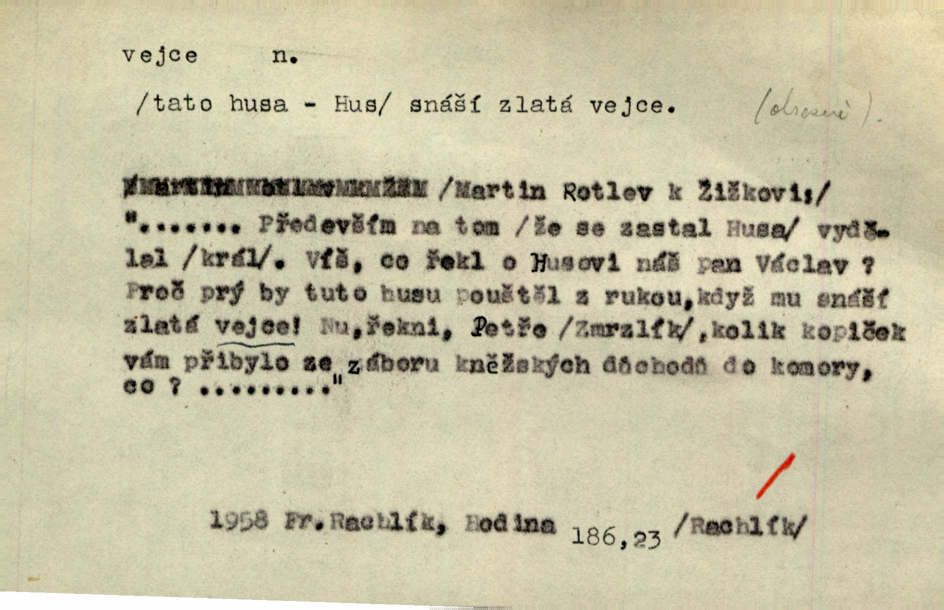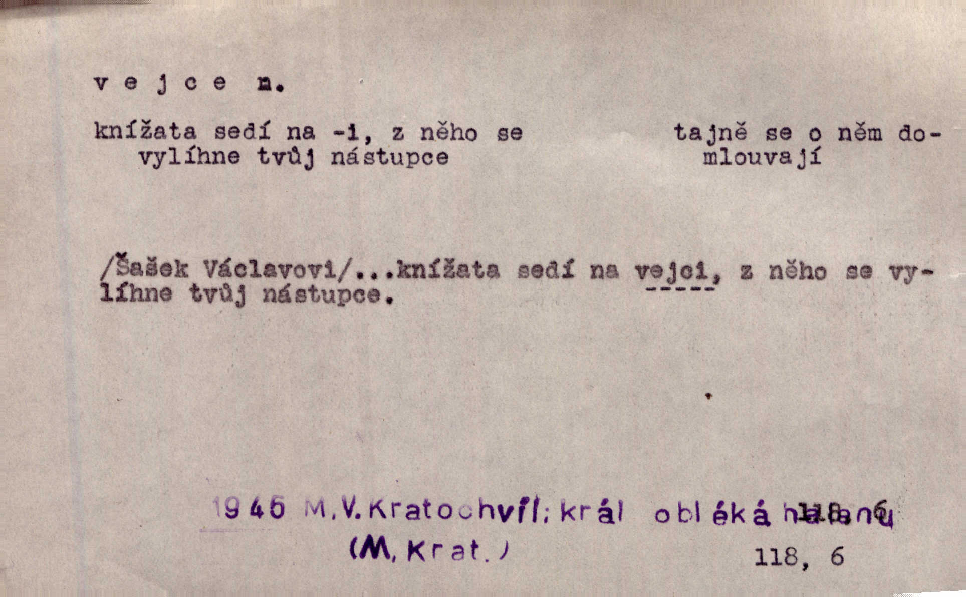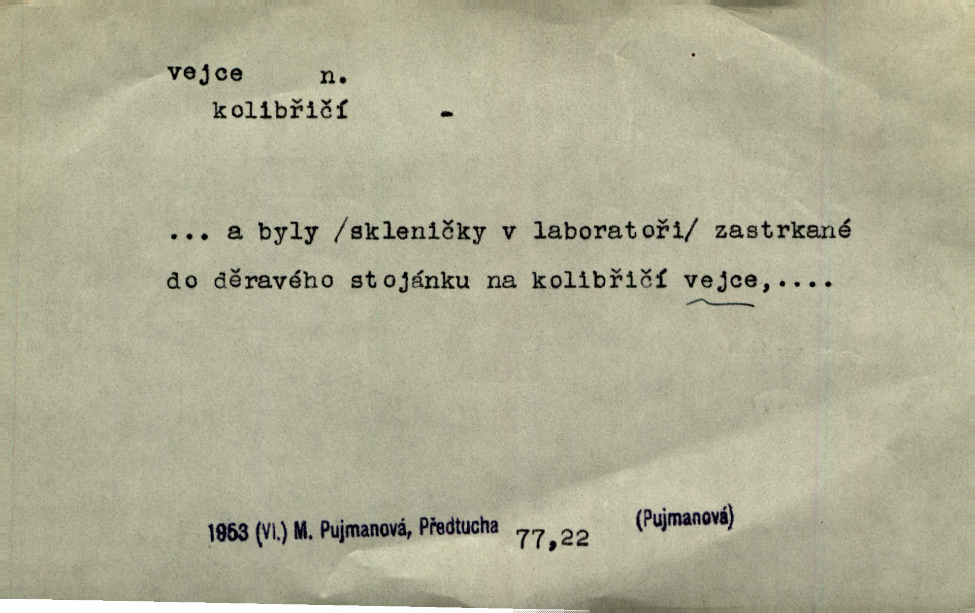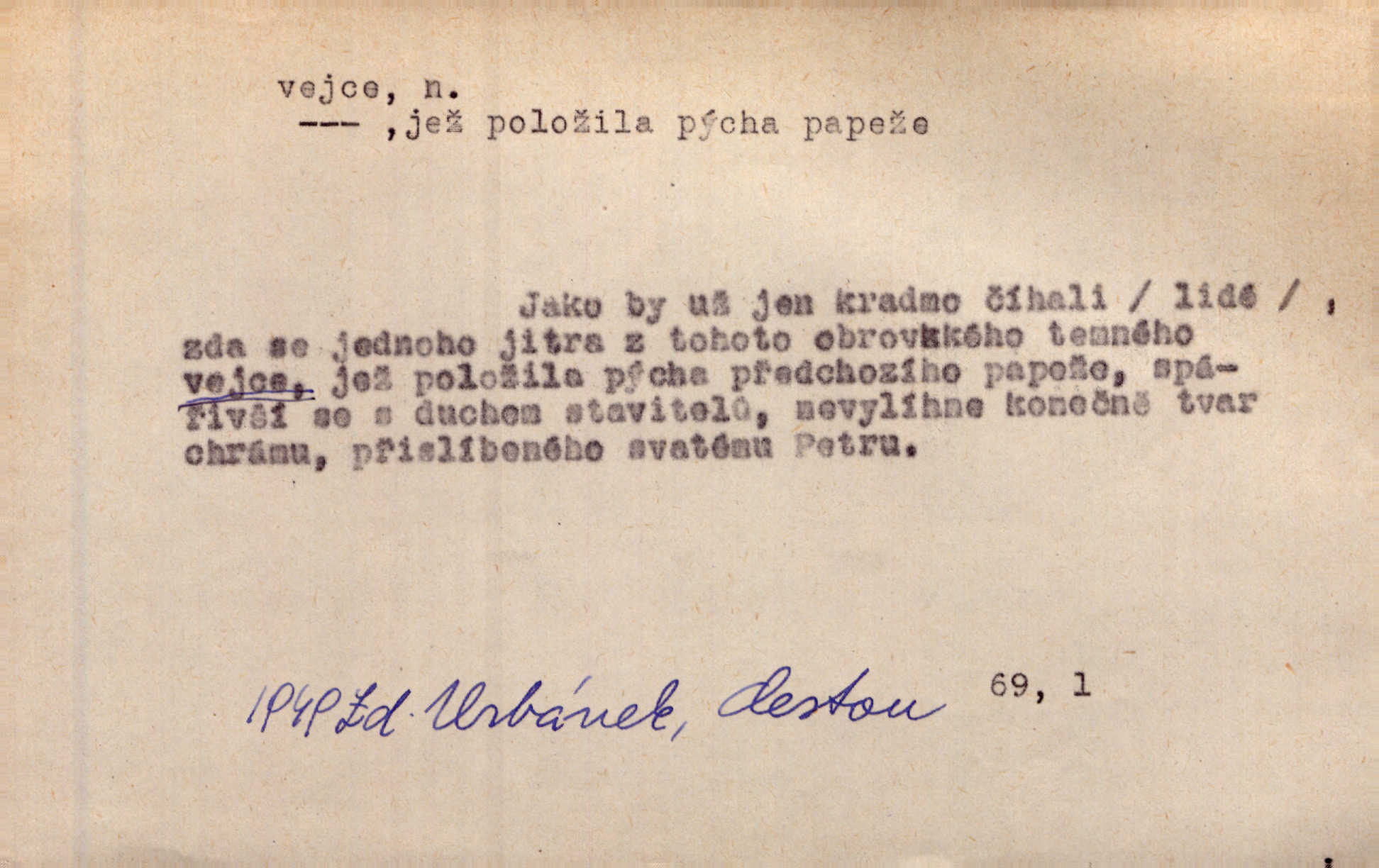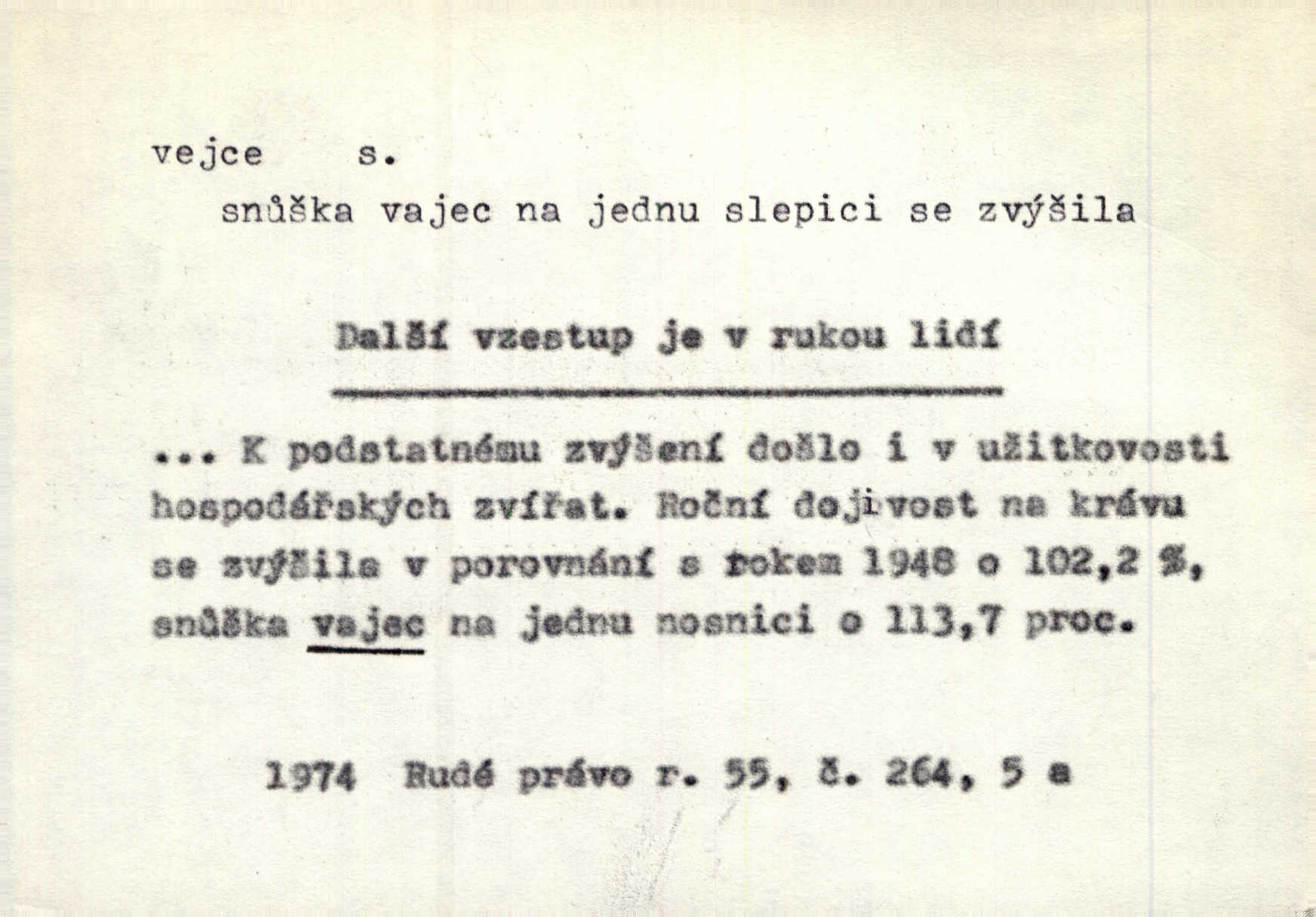 - vejce, -e n. (2. pl. vajec, 7. vejci) skořápkou oválného tvaru n. jen blanou obalený zárodek budoucího jedince, zpr. ptáka. Slepicím hodí hrst hrachu, aby snesly mnoho vajec. Erb. Má stará schovává pro vás vejce od tyrolek k násadce. Něm. Mladá nosila do města vejce na prodej, co jim slepice snesly. Erb. Vybrali jsme kde jaké vejce z kurníku. Kam. Voralka již skládala vejce na kuřata, na kačky i na housata. Rais. V díře na jiné straně o něco výše jsou datlíci ještě ve vejcích. Hál. Smetánky žluté jak z vejce vyvrhnutý žloutek krčily se v trávě. V. Mrš. Dostávali jsme malovaná vejce i perník kraslice. Jir. Potom vyměňují si červené vejce (kraslice). Něm. Kameny v prstenech jako holubí vejce. Heřm. Slívy modrají se velké jako vejce slepičí. Čech. Vypouklé jeho čelo bylo holé jako vejce. Maj. A jeden ten sirotek jako druhý, jako vejce od černé slepice a od bílé. Ner. Jako vejce vejci, tak byli si podobni dnové na Dubecké faře úplně. Baar. Holubička z vejce urobená [visí nad kamny] ze skořápky. Čech. Která slípka mnoho kdáče, ta málo vajec nese kdo mnoho mluví, málo udělá. Přísl. A jak sobě vyšlapuje, zticha jako po vejcích opatrně. Choch. Dávám pozor, jako bych nesl vejce na másle, a přece jsem rozlil byl jsem velmi opatrný. Prav. S těmi [pány] musí člověk jako s měkkými vejcemi opatrně, slušně. Svět. Vím, že šetříval [soudce] tuláků jako čerjených vajec jednal s nimi mírně. Vanč. Proto [aby se zachoval] musí tancovat mezi vejci, nositi na obou ramenou, obě strany klamati a čekati jednati opatrnicky. Herb. Uměl výborně tančiti mezi vejci. Smet. Povídalo se, že to je prach na prach vycvikaná osoba a že sedí na několika vejcích a že čeká, z kterého bude největší kuře jedná obojace. Jah. Ta [žena] všechno ví… i kde čert vejce snes’ ví všechno možné. Staš. Vyhledávaly [noviny] na vejci chlup, aby mohly štváti malichernosti, zbytečnosti. Hol. Vyvraceti hloupé předsudky je vejcem do kuželek kouleti marné. Šmil. Než by vejce uvařil, vyrazil tryskem ze zámecké brány velmi rychle, v mžiku. Vrba. Seděl jako kvočna na vejcích ani se nehnul. Vanč. Až kočka vejce snese nikdy. A. Mar. „Ten si sed’ do vajec,“ usmál se účetní dočkal se nepříjemnosti. Šim. „Těm donesl také slepé vejce,“ zašuškal mlynář nic nezařídil. Kosm. [Ujal se] opuštěného sirotka, ale přes to moudře nejednal a kukaččí vejce do hnízda si přinesl přijal vetřelce, který mu způsobil mnoho nepříjemného. Klost. „Krkavčí matka“, která své dítě pohodí, je taková nadávka, jako řekne-li se „kukaččino vejce“; znamená to: zvrhlé, nezdárné dítě, jež zahubí rodiče. Herb. Jsme všeci z divokejch vajec! divocí. V. Mrš. Obrovská myšlenka — ale jen zas Kolumbovo vejce, nic víc, pravím věc v podstatě prostá, ale vyžadující při řešení vtipu. Ner. I forma, v jaké jest proveden [Bar-Kochba], byla pro mne vskutku vejcem Kolumbovým něčím překvapujícím. Vrch. To je všechno tvůj výmysl, babizno, tvoje hadí vejce! Nic takového neřekla Jányška starostovi pomluva, zlý výmysl. Rón. Zeměd. matičková vejce vhodná k nakládání, v srpnu n. začátkem září snesená. Porcelánové vejce podkladek. Kuch. sázená, míchaná, smažená a pod. vejce. D něco tvarem tomuto ptačímu vejci podobného. Ohromné vejce, kde se taví litina s hliníkem, obrátilo se ústím k nebi. Maj. Dávno vrhač pum vrhl svá „vejce“ bomby. Lid. nov. Říkalo se jim [kapesním hodinkám] pro jejich charakteristický tvar „norimberské vejce“. Lid. nov. Lid. U Kujíčků zrají papeží vejce paví (ovoce). Hais. Zahr. paví vejce odrůda slívy s plody vejčitými. D červená vejce lid. velikonoce. Skutečně „po červených vejcích“ bylo Šmatlánovi lépe. Nov.