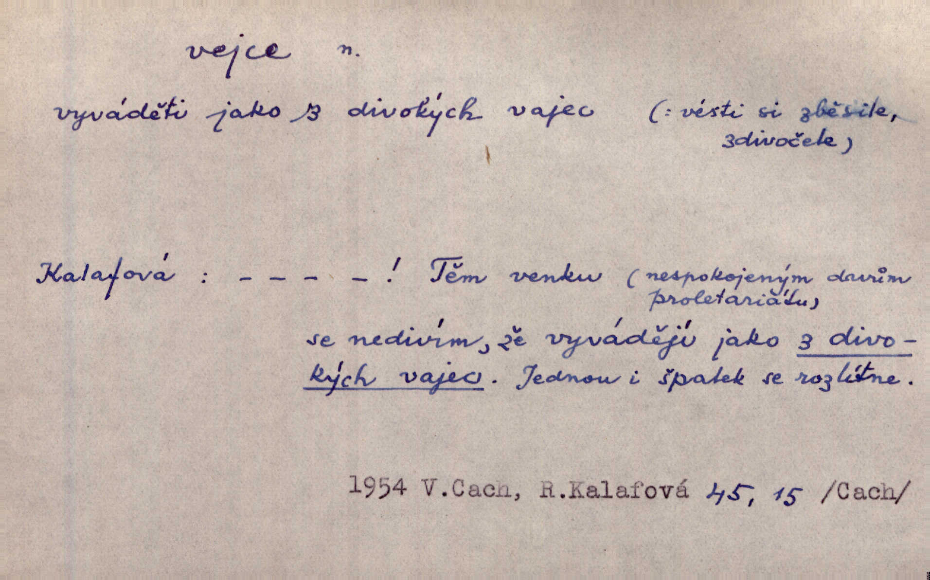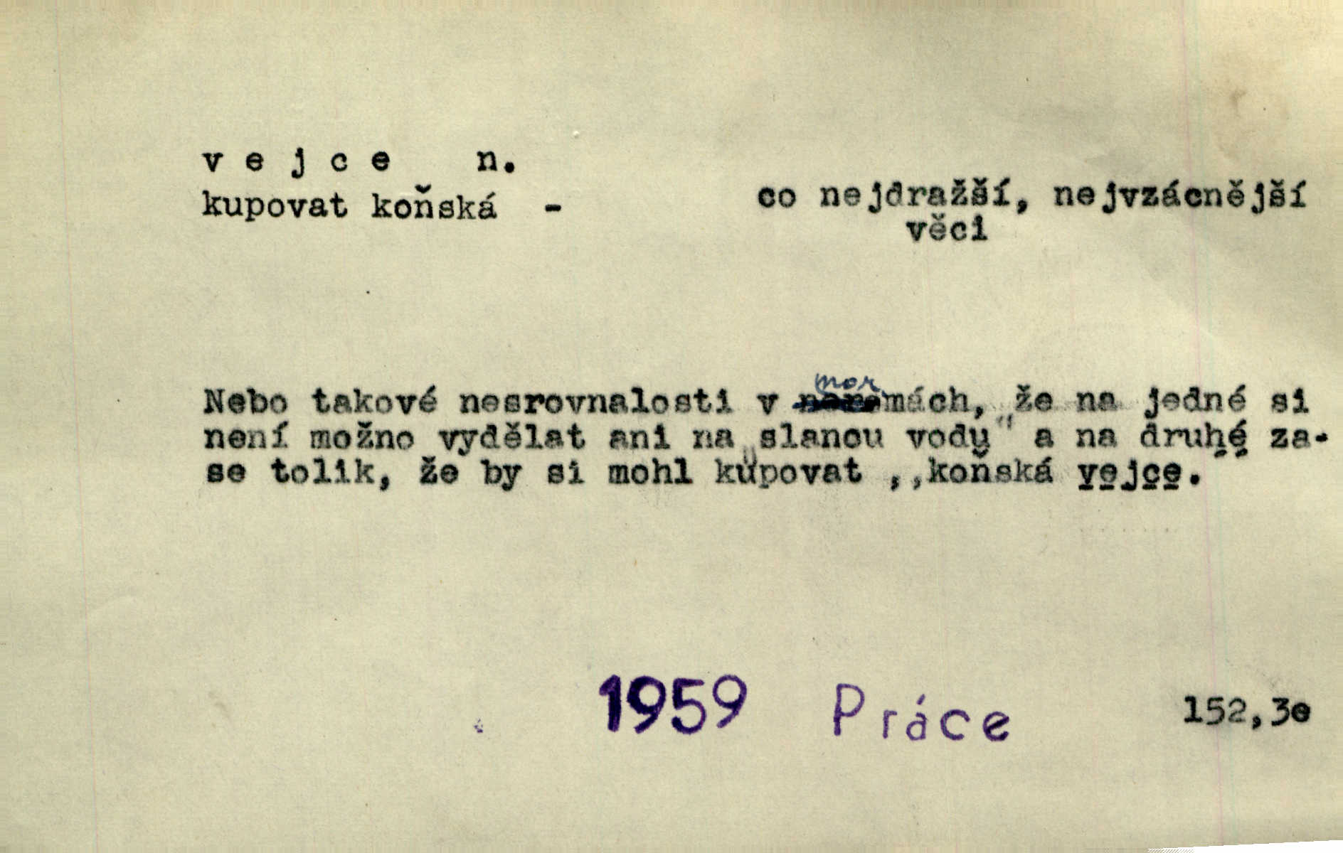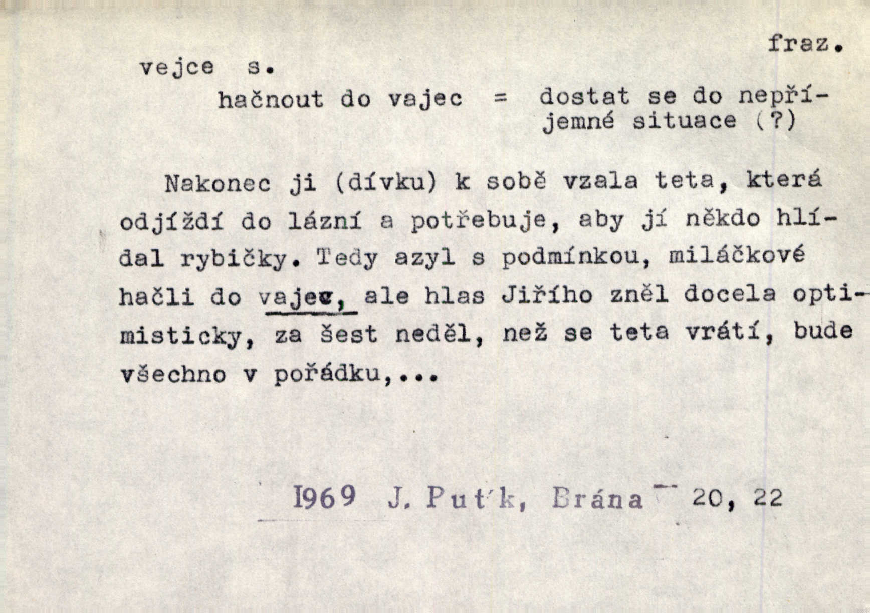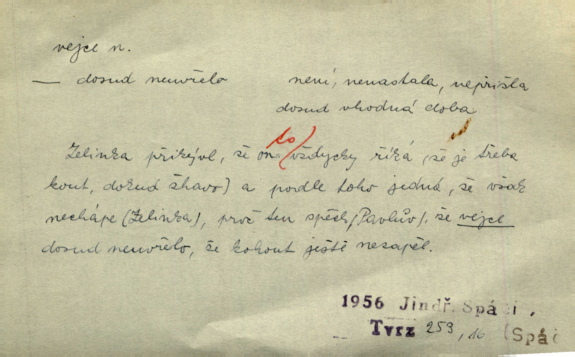 - vejce, -e n. (2. pl. vajec, 7. vejci) skořápkou oválného tvaru n. jen blanou obalený zárodek budoucího jedince, zpr. ptáka. Slepicím hodí hrst hrachu, aby snesly mnoho vajec. Erb. Má stará schovává pro vás vejce od tyrolek k násadce. Něm. Mladá nosila do města vejce na prodej, co jim slepice snesly. Erb. Vybrali jsme kde jaké vejce z kurníku. Kam. Voralka již skládala vejce na kuřata, na kačky i na housata. Rais. V díře na jiné straně o něco výše jsou datlíci ještě ve vejcích. Hál. Smetánky žluté jak z vejce vyvrhnutý žloutek krčily se v trávě. V. Mrš. Dostávali jsme malovaná vejce i perník kraslice. Jir. Potom vyměňují si červené vejce (kraslice). Něm. Kameny v prstenech jako holubí vejce. Heřm. Slívy modrají se velké jako vejce slepičí. Čech. Vypouklé jeho čelo bylo holé jako vejce. Maj. A jeden ten sirotek jako druhý, jako vejce od černé slepice a od bílé. Ner. Jako vejce vejci, tak byli si podobni dnové na Dubecké faře úplně. Baar. Holubička z vejce urobená [visí nad kamny] ze skořápky. Čech. Která slípka mnoho kdáče, ta málo vajec nese kdo mnoho mluví, málo udělá. Přísl. A jak sobě vyšlapuje, zticha jako po vejcích opatrně. Choch. Dávám pozor, jako bych nesl vejce na másle, a přece jsem rozlil byl jsem velmi opatrný. Prav. S těmi [pány] musí člověk jako s měkkými vejcemi opatrně, slušně. Svět. Vím, že šetříval [soudce] tuláků jako čerjených vajec jednal s nimi mírně. Vanč. Proto [aby se zachoval] musí tancovat mezi vejci, nositi na obou ramenou, obě strany klamati a čekati jednati opatrnicky. Herb. Uměl výborně tančiti mezi vejci. Smet. Povídalo se, že to je prach na prach vycvikaná osoba a že sedí na několika vejcích a že čeká, z kterého bude největší kuře jedná obojace. Jah. Ta [žena] všechno ví… i kde čert vejce snes’ ví všechno možné. Staš. Vyhledávaly [noviny] na vejci chlup, aby mohly štváti malichernosti, zbytečnosti. Hol. Vyvraceti hloupé předsudky je vejcem do kuželek kouleti marné. Šmil. Než by vejce uvařil, vyrazil tryskem ze zámecké brány velmi rychle, v mžiku. Vrba. Seděl jako kvočna na vejcích ani se nehnul. Vanč. Až kočka vejce snese nikdy. A. Mar. „Ten si sed’ do vajec,“ usmál se účetní dočkal se nepříjemnosti. Šim. „Těm donesl také slepé vejce,“ zašuškal mlynář nic nezařídil. Kosm. [Ujal se] opuštěného sirotka, ale přes to moudře nejednal a kukaččí vejce do hnízda si přinesl přijal vetřelce, který mu způsobil mnoho nepříjemného. Klost. „Krkavčí matka“, která své dítě pohodí, je taková nadávka, jako řekne-li se „kukaččino vejce“; znamená to: zvrhlé, nezdárné dítě, jež zahubí rodiče. Herb. Jsme všeci z divokejch vajec! divocí. V. Mrš. Obrovská myšlenka — ale jen zas Kolumbovo vejce, nic víc, pravím věc v podstatě prostá, ale vyžadující při řešení vtipu. Ner. I forma, v jaké jest proveden [Bar-Kochba], byla pro mne vskutku vejcem Kolumbovým něčím překvapujícím. Vrch. To je všechno tvůj výmysl, babizno, tvoje hadí vejce! Nic takového neřekla Jányška starostovi pomluva, zlý výmysl. Rón. Zeměd. matičková vejce vhodná k nakládání, v srpnu n. začátkem září snesená. Porcelánové vejce podkladek. Kuch. sázená, míchaná, smažená a pod. vejce. D něco tvarem tomuto ptačímu vejci podobného. Ohromné vejce, kde se taví litina s hliníkem, obrátilo se ústím k nebi. Maj. Dávno vrhač pum vrhl svá „vejce“ bomby. Lid. nov. Říkalo se jim [kapesním hodinkám] pro jejich charakteristický tvar „norimberské vejce“. Lid. nov. Lid. U Kujíčků zrají papeží vejce paví (ovoce). Hais. Zahr. paví vejce odrůda slívy s plody vejčitými. D červená vejce lid. velikonoce. Skutečně „po červených vejcích“ bylo Šmatlánovi lépe. Nov.