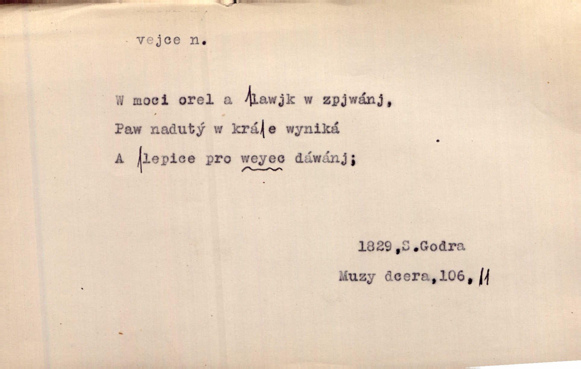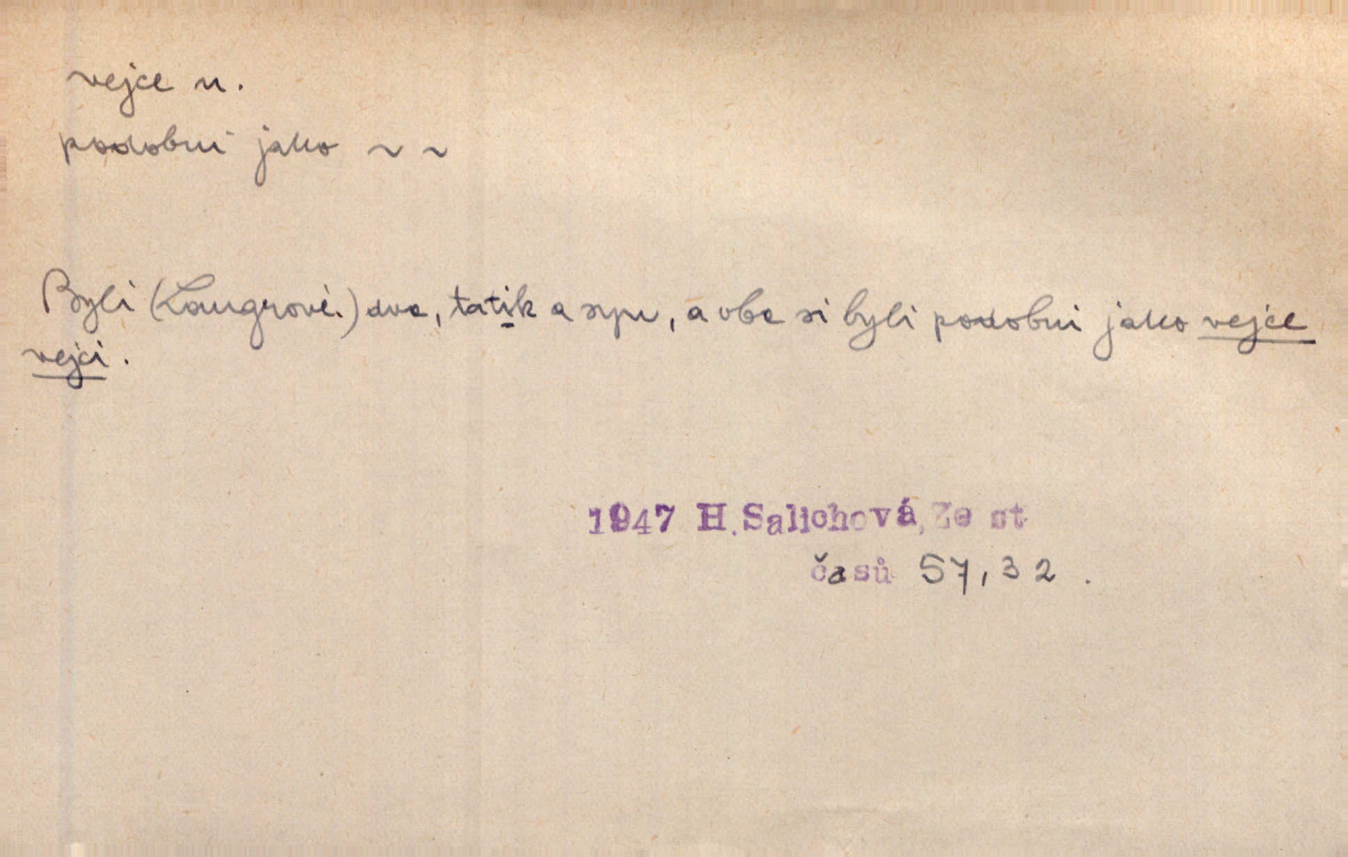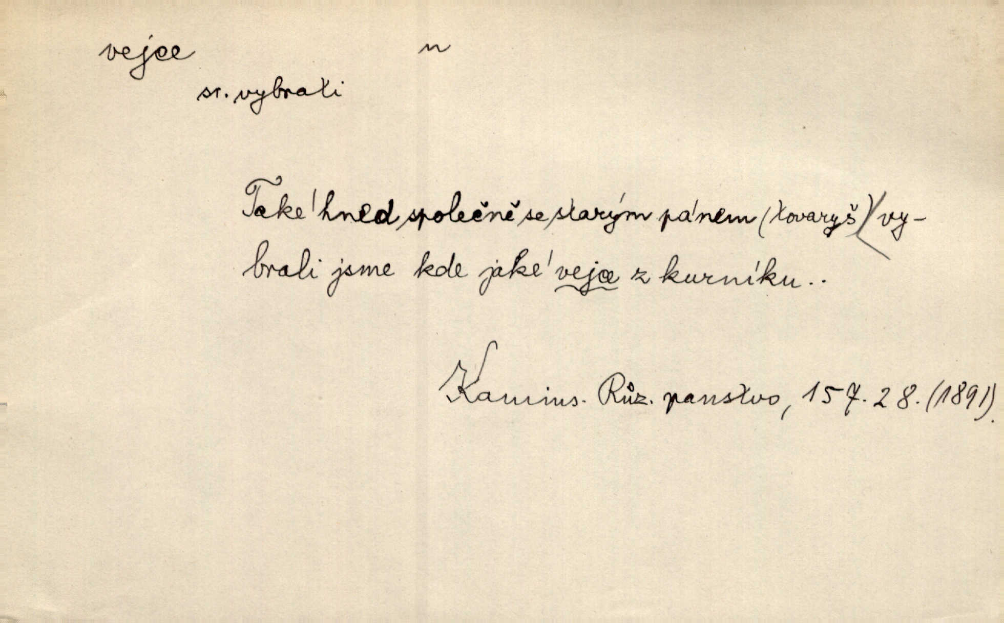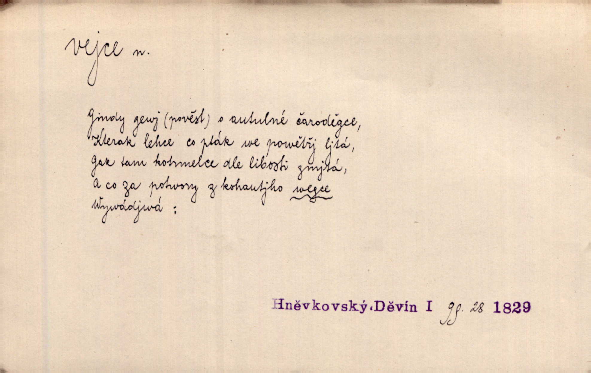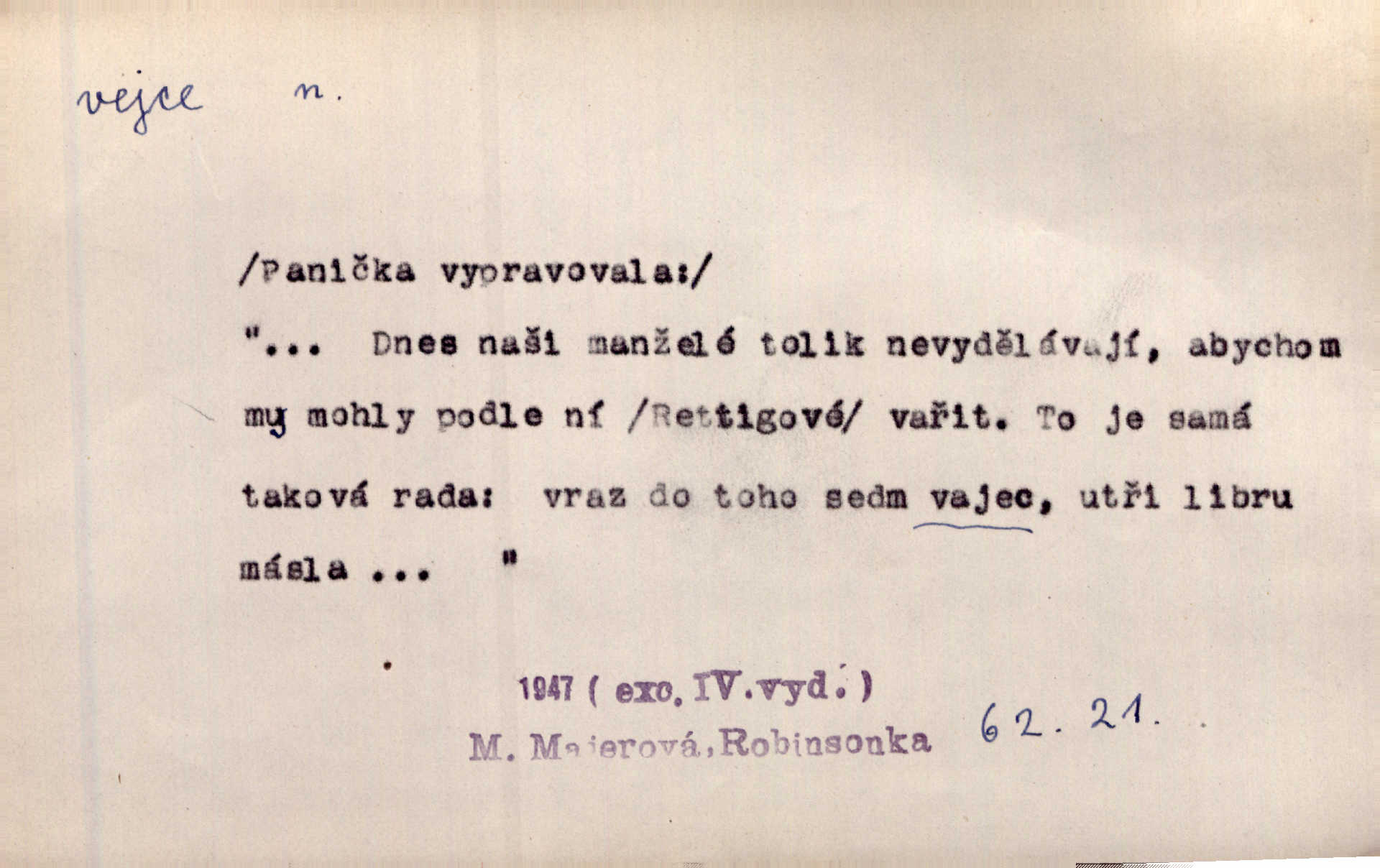 - vejce, -e n. (2. pl. vajec, 7. vejci) skořápkou oválného tvaru n. jen blanou obalený zárodek budoucího jedince, zpr. ptáka. Slepicím hodí hrst hrachu, aby snesly mnoho vajec. Erb. Má stará schovává pro vás vejce od tyrolek k násadce. Něm. Mladá nosila do města vejce na prodej, co jim slepice snesly. Erb. Vybrali jsme kde jaké vejce z kurníku. Kam. Voralka již skládala vejce na kuřata, na kačky i na housata. Rais. V díře na jiné straně o něco výše jsou datlíci ještě ve vejcích. Hál. Smetánky žluté jak z vejce vyvrhnutý žloutek krčily se v trávě. V. Mrš. Dostávali jsme malovaná vejce i perník kraslice. Jir. Potom vyměňují si červené vejce (kraslice). Něm. Kameny v prstenech jako holubí vejce. Heřm. Slívy modrají se velké jako vejce slepičí. Čech. Vypouklé jeho čelo bylo holé jako vejce. Maj. A jeden ten sirotek jako druhý, jako vejce od černé slepice a od bílé. Ner. Jako vejce vejci, tak byli si podobni dnové na Dubecké faře úplně. Baar. Holubička z vejce urobená [visí nad kamny] ze skořápky. Čech. Která slípka mnoho kdáče, ta málo vajec nese kdo mnoho mluví, málo udělá. Přísl. A jak sobě vyšlapuje, zticha jako po vejcích opatrně. Choch. Dávám pozor, jako bych nesl vejce na másle, a přece jsem rozlil byl jsem velmi opatrný. Prav. S těmi [pány] musí člověk jako s měkkými vejcemi opatrně, slušně. Svět. Vím, že šetříval [soudce] tuláků jako čerjených vajec jednal s nimi mírně. Vanč. Proto [aby se zachoval] musí tancovat mezi vejci, nositi na obou ramenou, obě strany klamati a čekati jednati opatrnicky. Herb. Uměl výborně tančiti mezi vejci. Smet. Povídalo se, že to je prach na prach vycvikaná osoba a že sedí na několika vejcích a že čeká, z kterého bude největší kuře jedná obojace. Jah. Ta [žena] všechno ví… i kde čert vejce snes’ ví všechno možné. Staš. Vyhledávaly [noviny] na vejci chlup, aby mohly štváti malichernosti, zbytečnosti. Hol. Vyvraceti hloupé předsudky je vejcem do kuželek kouleti marné. Šmil. Než by vejce uvařil, vyrazil tryskem ze zámecké brány velmi rychle, v mžiku. Vrba. Seděl jako kvočna na vejcích ani se nehnul. Vanč. Až kočka vejce snese nikdy. A. Mar. „Ten si sed’ do vajec,“ usmál se účetní dočkal se nepříjemnosti. Šim. „Těm donesl také slepé vejce,“ zašuškal mlynář nic nezařídil. Kosm. [Ujal se] opuštěného sirotka, ale přes to moudře nejednal a kukaččí vejce do hnízda si přinesl přijal vetřelce, který mu způsobil mnoho nepříjemného. Klost. „Krkavčí matka“, která své dítě pohodí, je taková nadávka, jako řekne-li se „kukaččino vejce“; znamená to: zvrhlé, nezdárné dítě, jež zahubí rodiče. Herb. Jsme všeci z divokejch vajec! divocí. V. Mrš. Obrovská myšlenka — ale jen zas Kolumbovo vejce, nic víc, pravím věc v podstatě prostá, ale vyžadující při řešení vtipu. Ner. I forma, v jaké jest proveden [Bar-Kochba], byla pro mne vskutku vejcem Kolumbovým něčím překvapujícím. Vrch. To je všechno tvůj výmysl, babizno, tvoje hadí vejce! Nic takového neřekla Jányška starostovi pomluva, zlý výmysl. Rón. Zeměd. matičková vejce vhodná k nakládání, v srpnu n. začátkem září snesená. Porcelánové vejce podkladek. Kuch. sázená, míchaná, smažená a pod. vejce. D něco tvarem tomuto ptačímu vejci podobného. Ohromné vejce, kde se taví litina s hliníkem, obrátilo se ústím k nebi. Maj. Dávno vrhač pum vrhl svá „vejce“ bomby. Lid. nov. Říkalo se jim [kapesním hodinkám] pro jejich charakteristický tvar „norimberské vejce“. Lid. nov. Lid. U Kujíčků zrají papeží vejce paví (ovoce). Hais. Zahr. paví vejce odrůda slívy s plody vejčitými. D červená vejce lid. velikonoce. Skutečně „po červených vejcích“ bylo Šmatlánovi lépe. Nov.