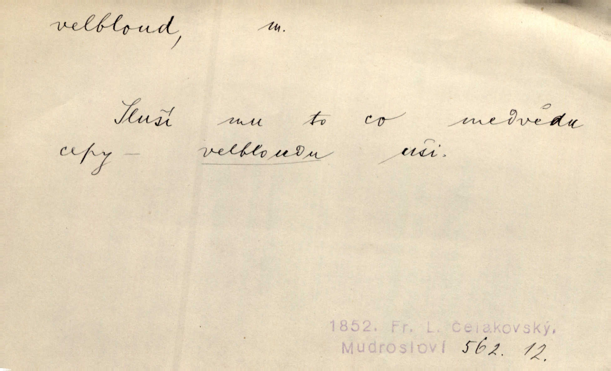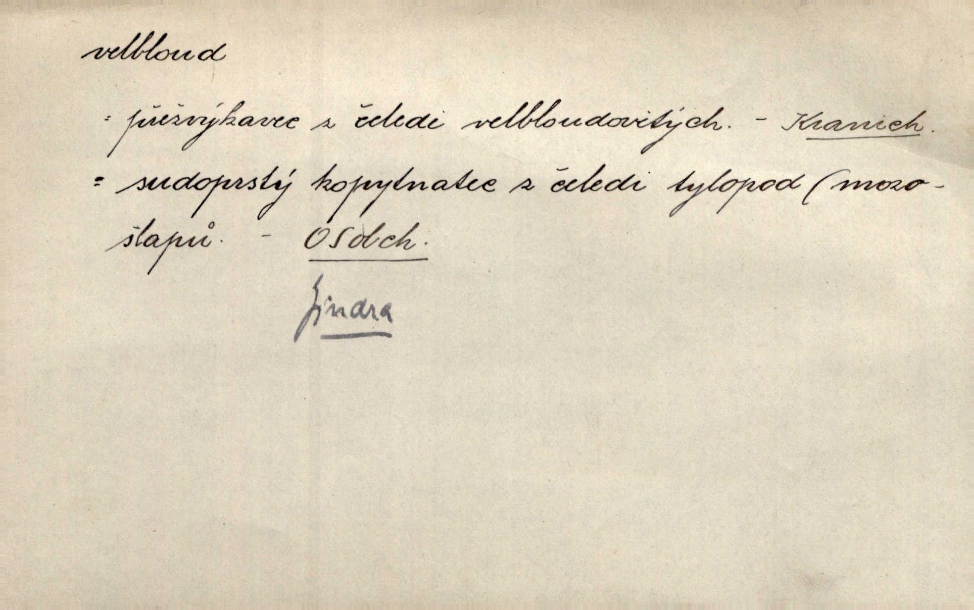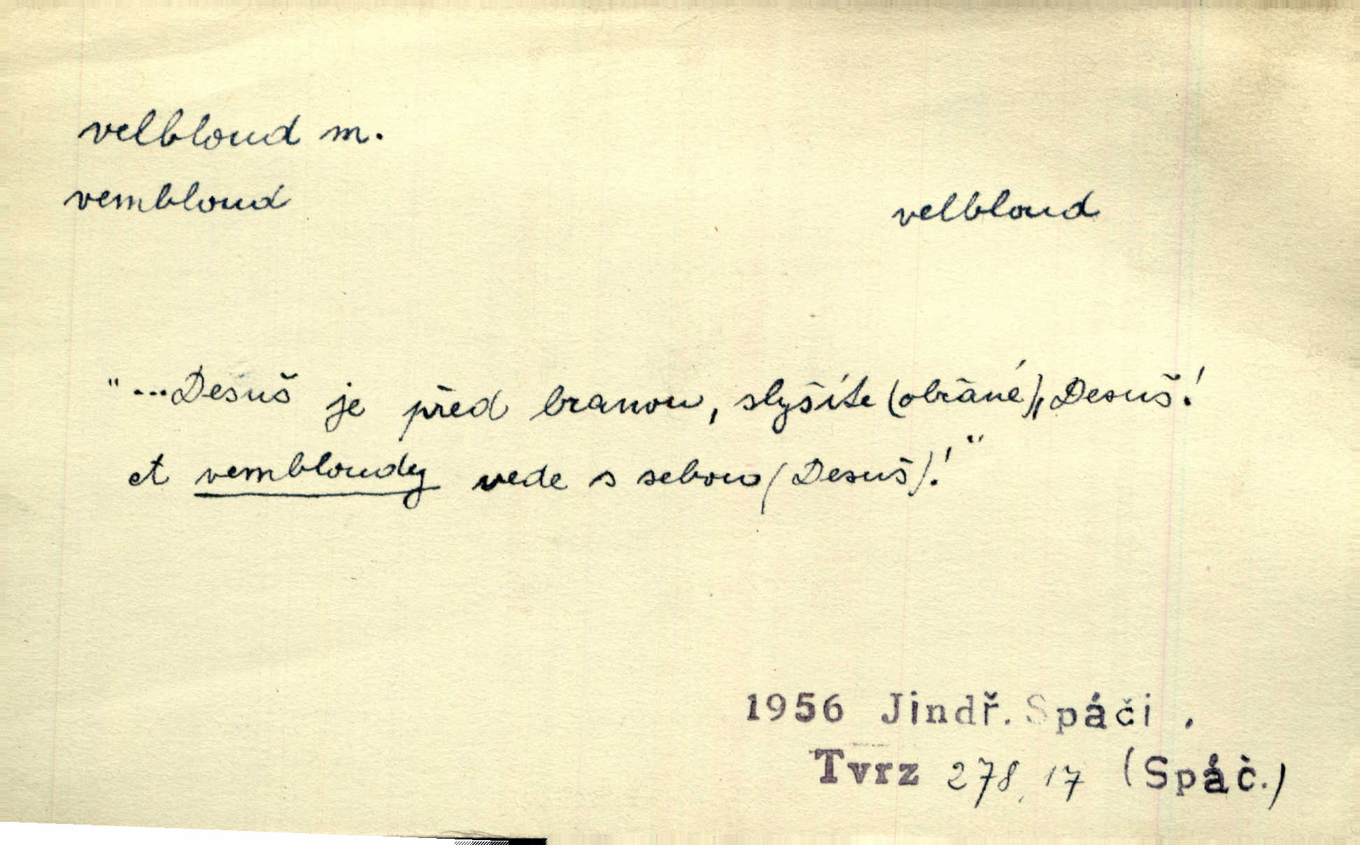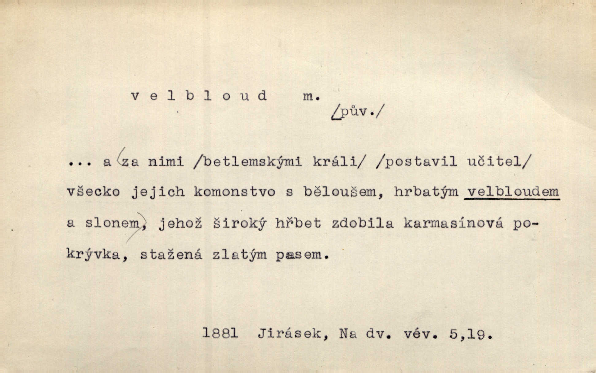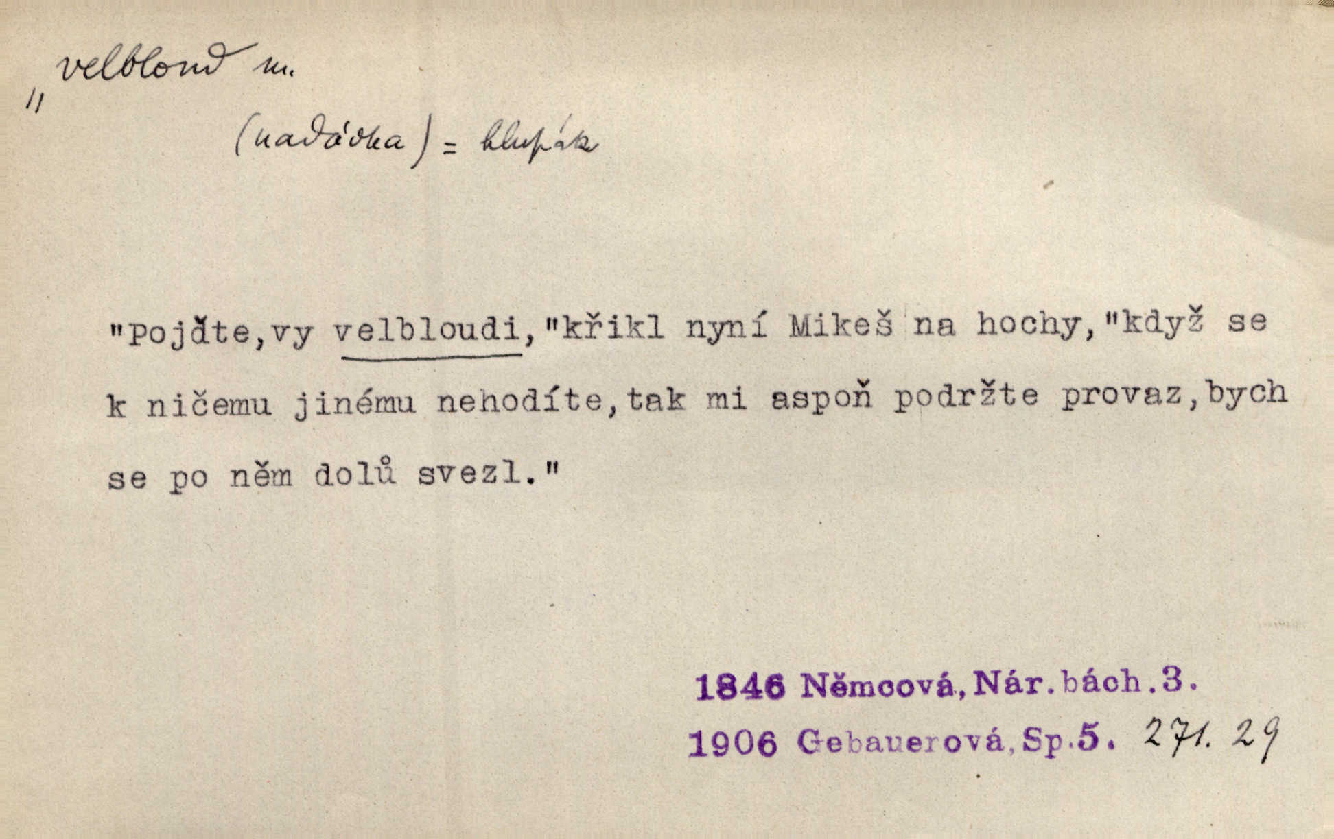- velbloud (lid. vembloud), -a m. velký, cizokrajný přežvýkavec s jedním n. se dvěma hrby. Zas to poušť je širá, bez mezí, na níž velbloud klesá ve stín palem. Krás. Za nimi [betlemskými králi] postavil učitel všecko jejich komonstvo s běloušem, hrbatým velbloudem a slonem. Jir. Našla jsem děti Arabie, které na hřbetech velbloudů voňavky a kadidla do Memfidy vozí. Zey. Velbloud prý projde jehlou spíš, než takový rentier v nebe. Mach. Ať sem vembloud, když to není pravda ať jsem hlupák. Klost. Nedělej z komára velblouda nepřeháněj, nezveličuj. Čech. Ono kolikrát slovo komárem vyletí a velbloudem se vrátí! A. Mrš. [Kritik] velblouda sází na nos cizincům dělási z nich blázny. Vin. To je právě karakteristické pro naši demokracii: ta politika zcela přízemní, řekl bych hokynářská, která cedí komáry a polyká velbloudy pro maličkost jí utíkají věci závažné. Šal. Zool. velbloudi rod ssavců z čeledi Camelidae, Camelus; velbloud dvouhrbý. D Expr. hloupý, na hlavu padlý člověk (často jako nadávka). Ten chlap je velbloud. On myslí, že kejchnem, když nám flastr na nos přilepí. Hál. O lásce k vlasti nekaž velbloudu. Havl. Hned se podíváme, zdali toho velblouda tam [ve studni] ještě uhlídáme. Sab. Co vám do toho, velbloude? Don. „Pojďte, vy velbloudi,“ křikl nyní Mikeš na hochy, „když se k ničemu jinému nehodíte, tak mi aspoň podržte provaz, bych se po něm dolů svezl.“ Něm.
