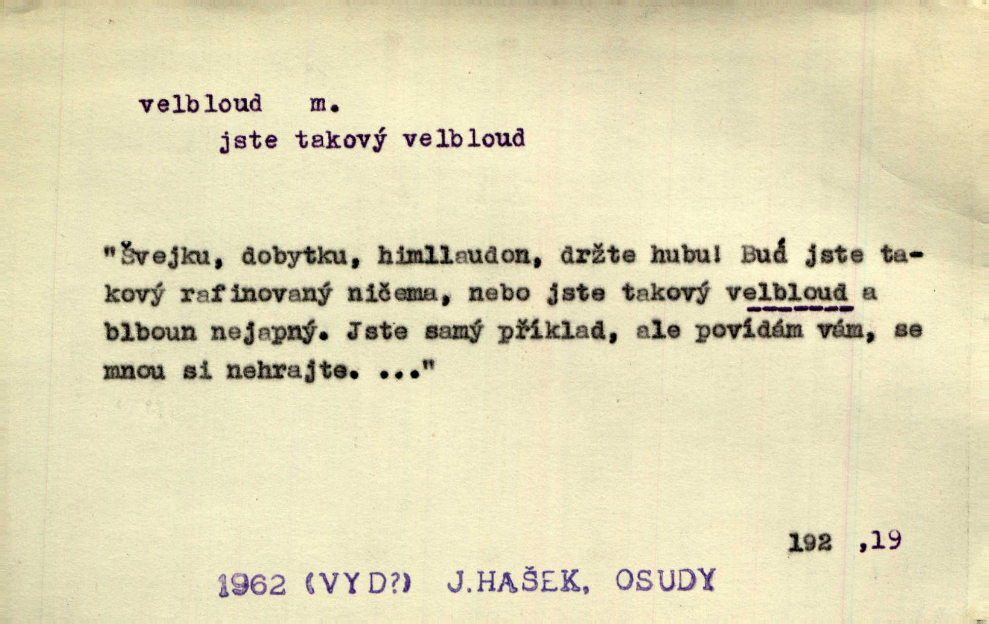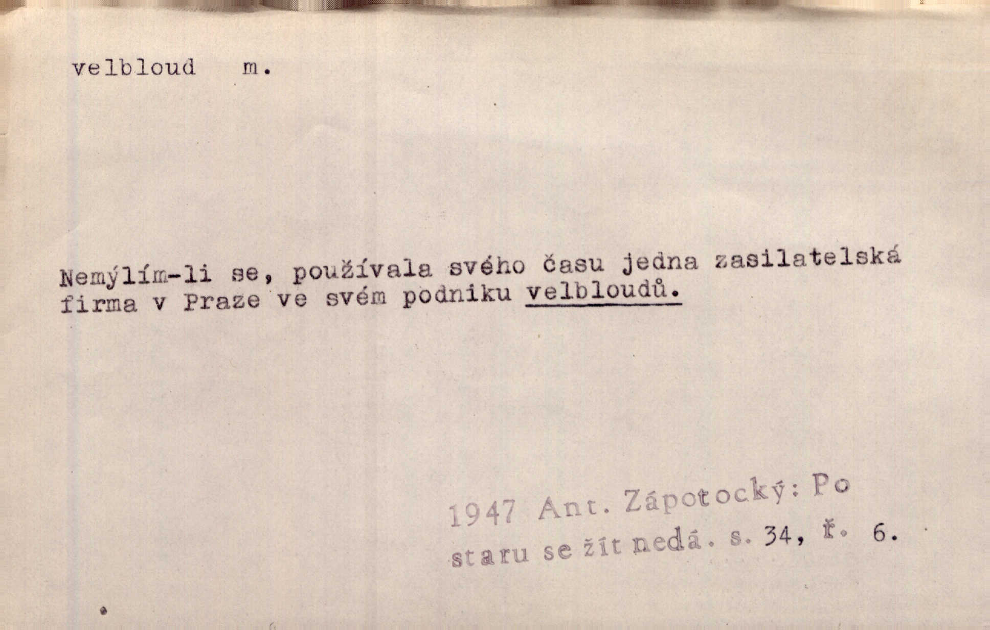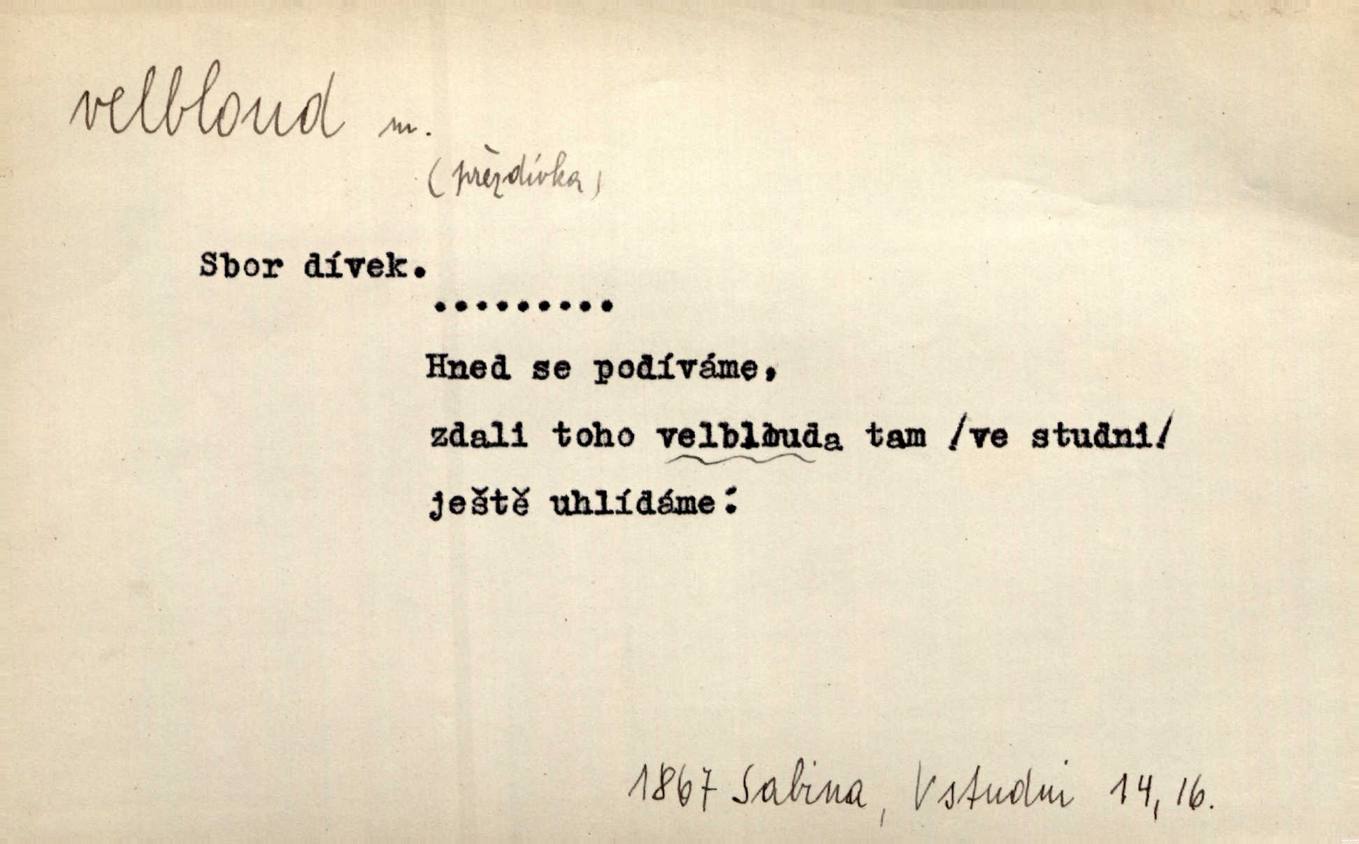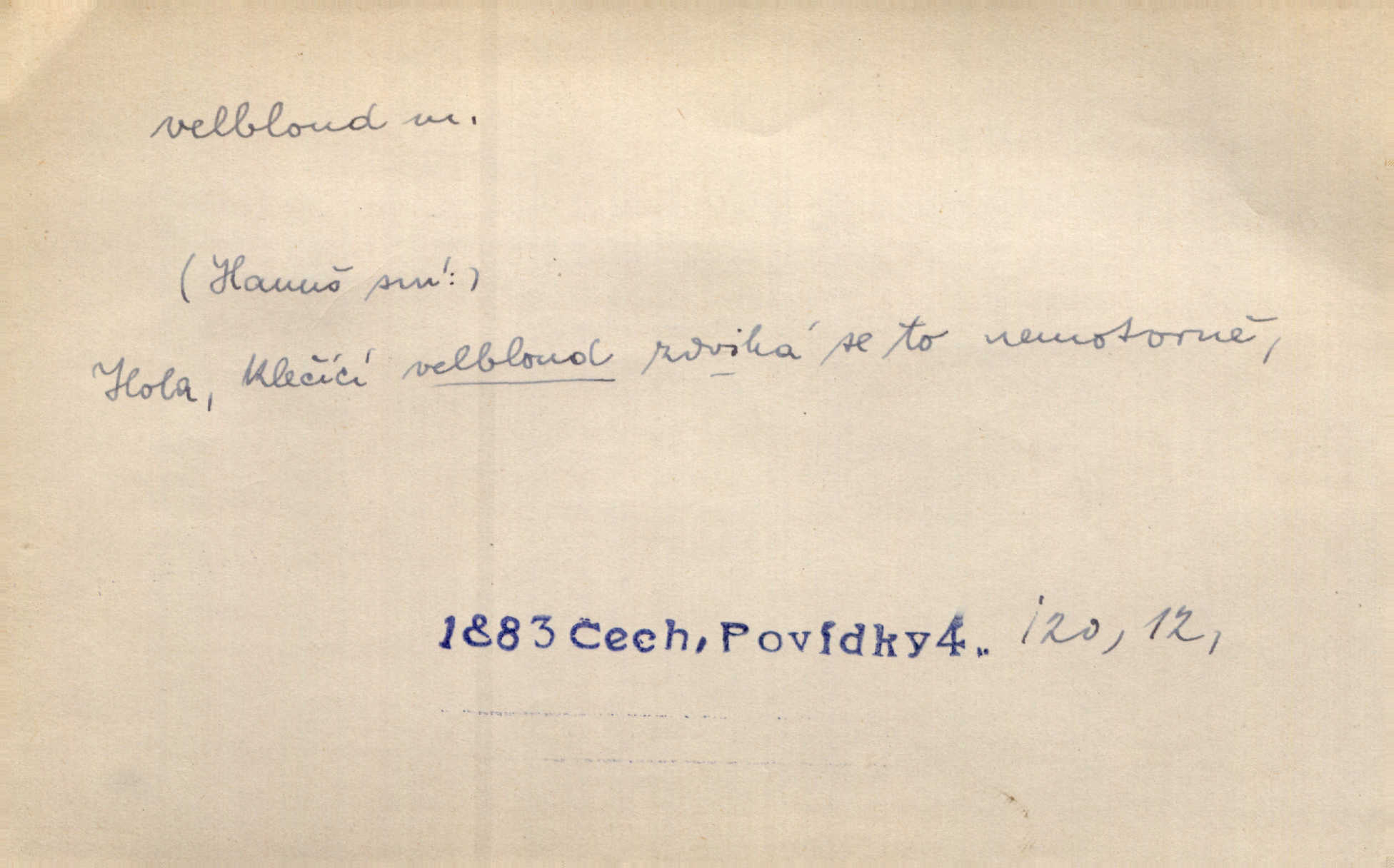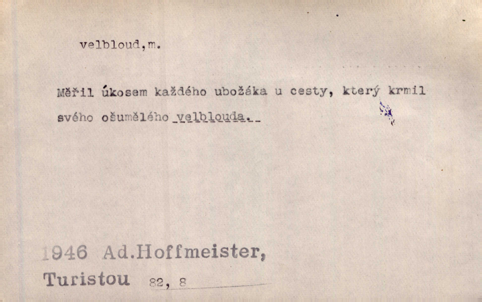 - velbloud (lid. vembloud), -a m. velký, cizokrajný přežvýkavec s jedním n. se dvěma hrby. Zas to poušť je širá, bez mezí, na níž velbloud klesá ve stín palem. Krás. Za nimi [betlemskými králi] postavil učitel všecko jejich komonstvo s běloušem, hrbatým velbloudem a slonem. Jir. Našla jsem děti Arabie, které na hřbetech velbloudů voňavky a kadidla do Memfidy vozí. Zey. Velbloud prý projde jehlou spíš, než takový rentier v nebe. Mach. Ať sem vembloud, když to není pravda ať jsem hlupák. Klost. Nedělej z komára velblouda nepřeháněj, nezveličuj. Čech. Ono kolikrát slovo komárem vyletí a velbloudem se vrátí! A. Mrš. [Kritik] velblouda sází na nos cizincům dělási z nich blázny. Vin. To je právě karakteristické pro naši demokracii: ta politika zcela přízemní, řekl bych hokynářská, která cedí komáry a polyká velbloudy pro maličkost jí utíkají věci závažné. Šal. Zool. velbloudi rod ssavců z čeledi Camelidae, Camelus; velbloud dvouhrbý. D Expr. hloupý, na hlavu padlý člověk (často jako nadávka). Ten chlap je velbloud. On myslí, že kejchnem, když nám flastr na nos přilepí. Hál. O lásce k vlasti nekaž velbloudu. Havl. Hned se podíváme, zdali toho velblouda tam [ve studni] ještě uhlídáme. Sab. Co vám do toho, velbloude? Don. „Pojďte, vy velbloudi,“ křikl nyní Mikeš na hochy, „když se k ničemu jinému nehodíte, tak mi aspoň podržte provaz, bych se po něm dolů svezl.“ Něm.