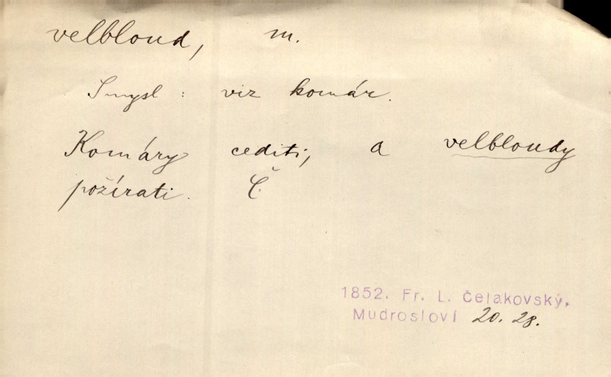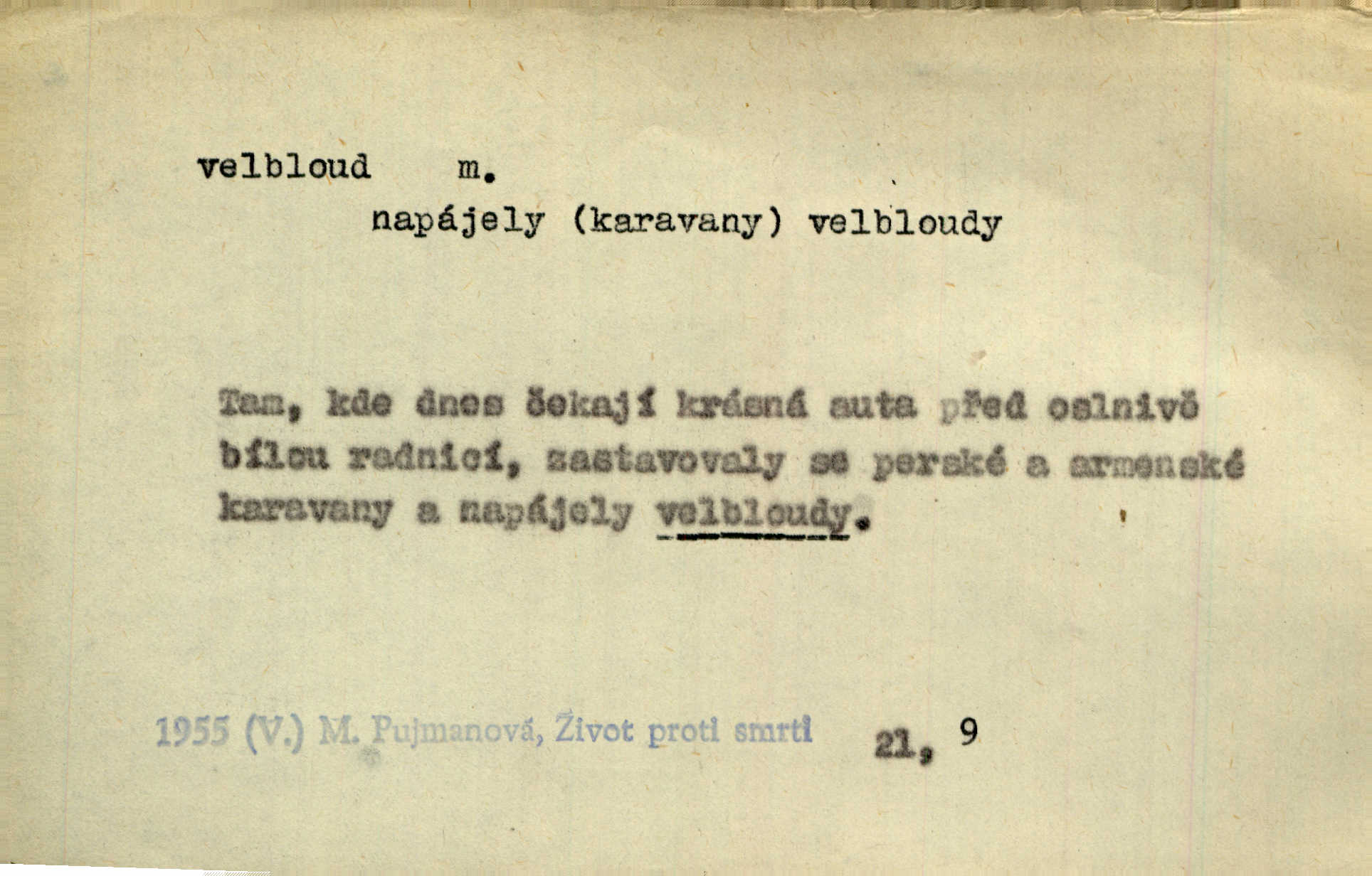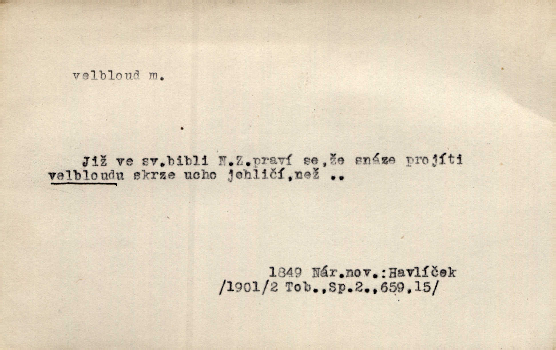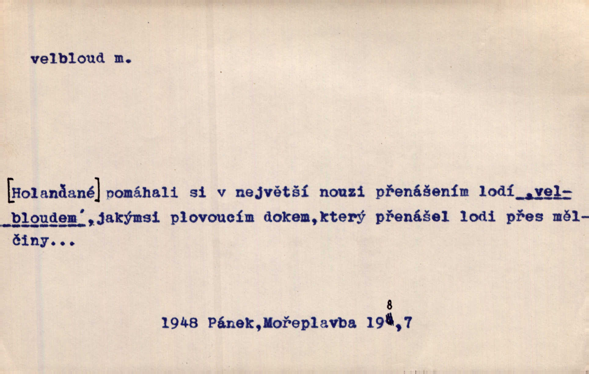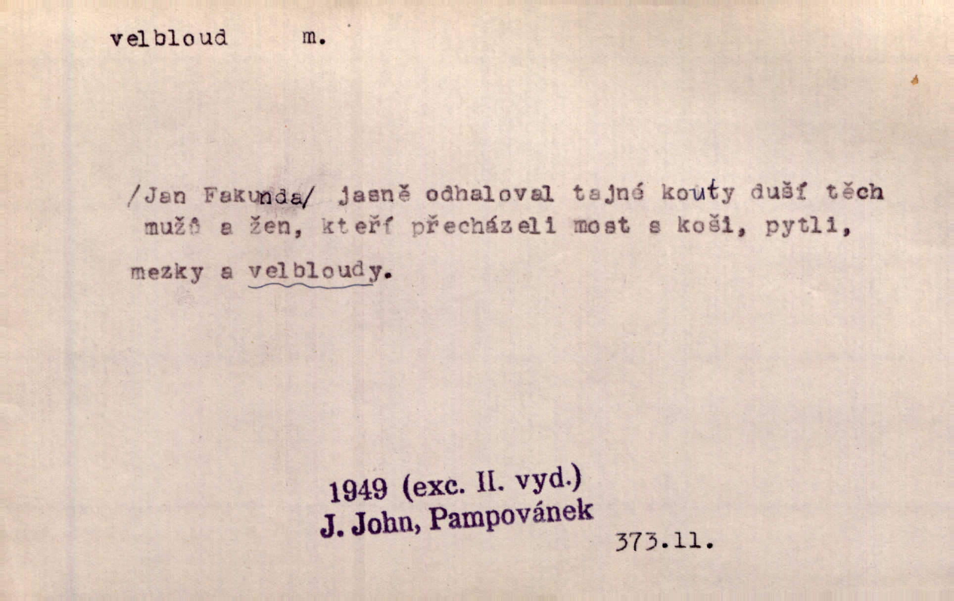 - velbloud (lid. vembloud), -a m. velký, cizokrajný přežvýkavec s jedním n. se dvěma hrby. Zas to poušť je širá, bez mezí, na níž velbloud klesá ve stín palem. Krás. Za nimi [betlemskými králi] postavil učitel všecko jejich komonstvo s běloušem, hrbatým velbloudem a slonem. Jir. Našla jsem děti Arabie, které na hřbetech velbloudů voňavky a kadidla do Memfidy vozí. Zey. Velbloud prý projde jehlou spíš, než takový rentier v nebe. Mach. Ať sem vembloud, když to není pravda ať jsem hlupák. Klost. Nedělej z komára velblouda nepřeháněj, nezveličuj. Čech. Ono kolikrát slovo komárem vyletí a velbloudem se vrátí! A. Mrš. [Kritik] velblouda sází na nos cizincům dělási z nich blázny. Vin. To je právě karakteristické pro naši demokracii: ta politika zcela přízemní, řekl bych hokynářská, která cedí komáry a polyká velbloudy pro maličkost jí utíkají věci závažné. Šal. Zool. velbloudi rod ssavců z čeledi Camelidae, Camelus; velbloud dvouhrbý. D Expr. hloupý, na hlavu padlý člověk (často jako nadávka). Ten chlap je velbloud. On myslí, že kejchnem, když nám flastr na nos přilepí. Hál. O lásce k vlasti nekaž velbloudu. Havl. Hned se podíváme, zdali toho velblouda tam [ve studni] ještě uhlídáme. Sab. Co vám do toho, velbloude? Don. „Pojďte, vy velbloudi,“ křikl nyní Mikeš na hochy, „když se k ničemu jinému nehodíte, tak mi aspoň podržte provaz, bych se po něm dolů svezl.“ Něm.