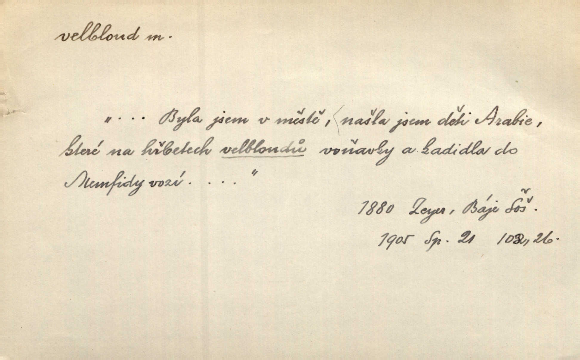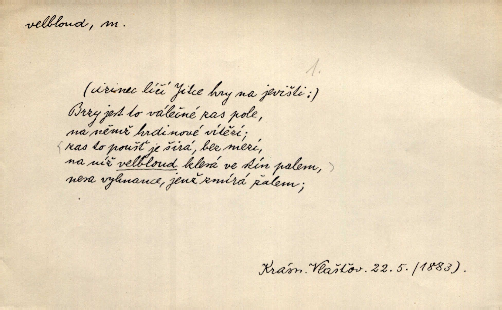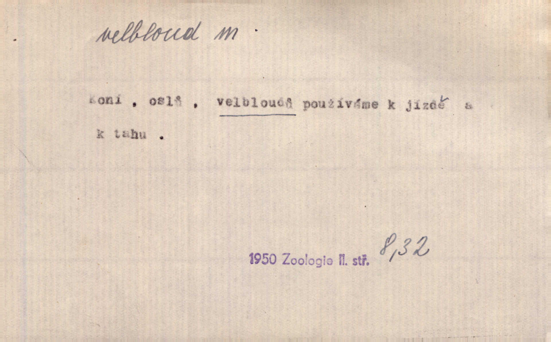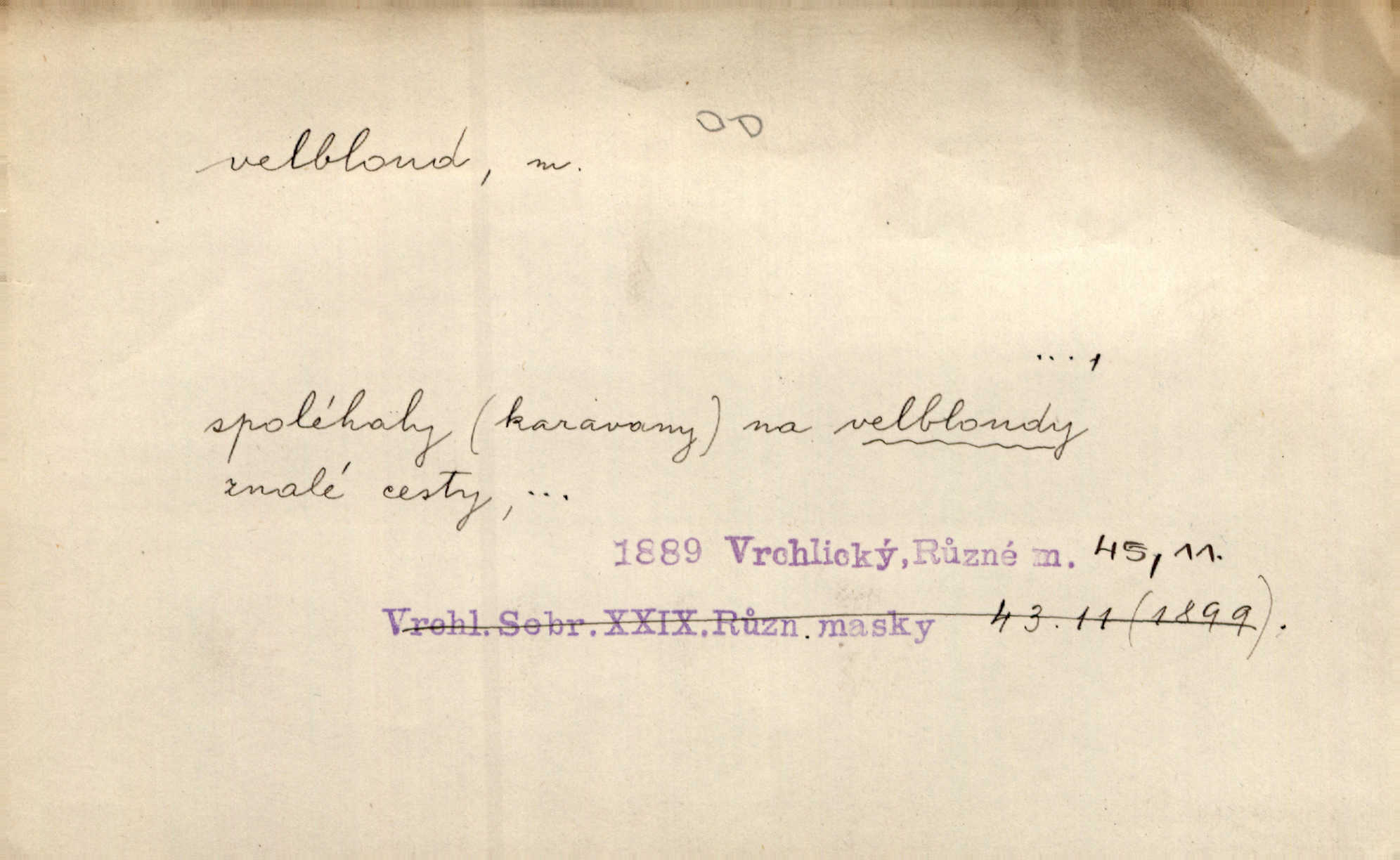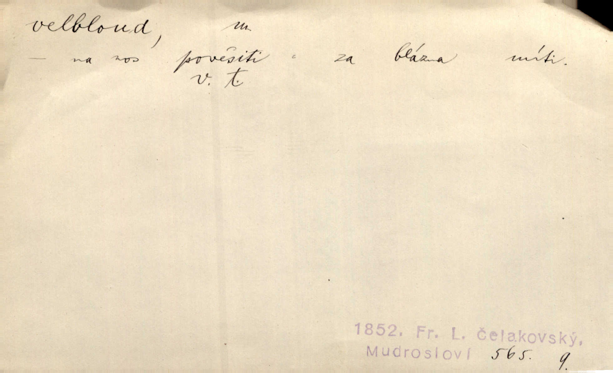 - velbloud (lid. vembloud), -a m. velký, cizokrajný přežvýkavec s jedním n. se dvěma hrby. Zas to poušť je širá, bez mezí, na níž velbloud klesá ve stín palem. Krás. Za nimi [betlemskými králi] postavil učitel všecko jejich komonstvo s běloušem, hrbatým velbloudem a slonem. Jir. Našla jsem děti Arabie, které na hřbetech velbloudů voňavky a kadidla do Memfidy vozí. Zey. Velbloud prý projde jehlou spíš, než takový rentier v nebe. Mach. Ať sem vembloud, když to není pravda ať jsem hlupák. Klost. Nedělej z komára velblouda nepřeháněj, nezveličuj. Čech. Ono kolikrát slovo komárem vyletí a velbloudem se vrátí! A. Mrš. [Kritik] velblouda sází na nos cizincům dělási z nich blázny. Vin. To je právě karakteristické pro naši demokracii: ta politika zcela přízemní, řekl bych hokynářská, která cedí komáry a polyká velbloudy pro maličkost jí utíkají věci závažné. Šal. Zool. velbloudi rod ssavců z čeledi Camelidae, Camelus; velbloud dvouhrbý. D Expr. hloupý, na hlavu padlý člověk (často jako nadávka). Ten chlap je velbloud. On myslí, že kejchnem, když nám flastr na nos přilepí. Hál. O lásce k vlasti nekaž velbloudu. Havl. Hned se podíváme, zdali toho velblouda tam [ve studni] ještě uhlídáme. Sab. Co vám do toho, velbloude? Don. „Pojďte, vy velbloudi,“ křikl nyní Mikeš na hochy, „když se k ničemu jinému nehodíte, tak mi aspoň podržte provaz, bych se po něm dolů svezl.“ Něm.