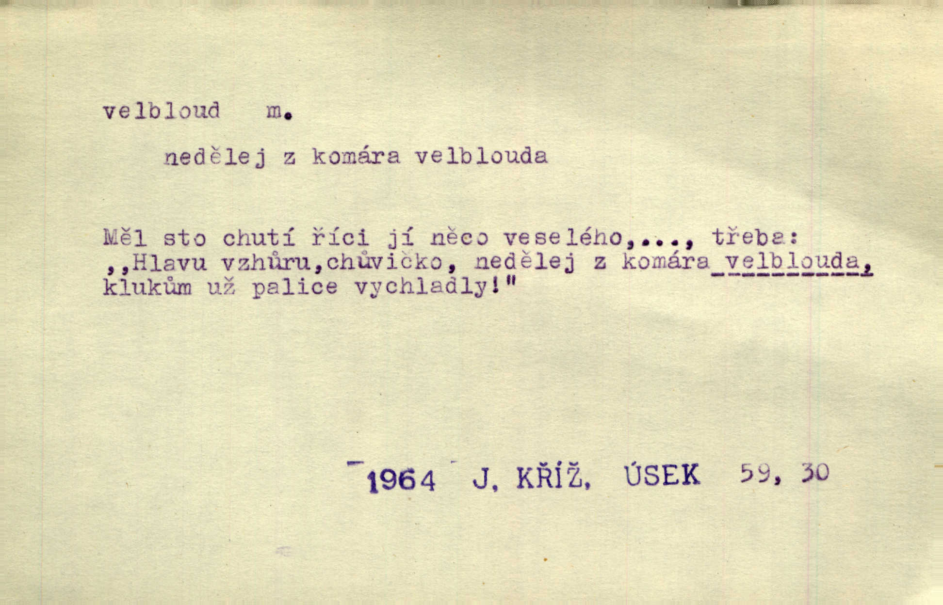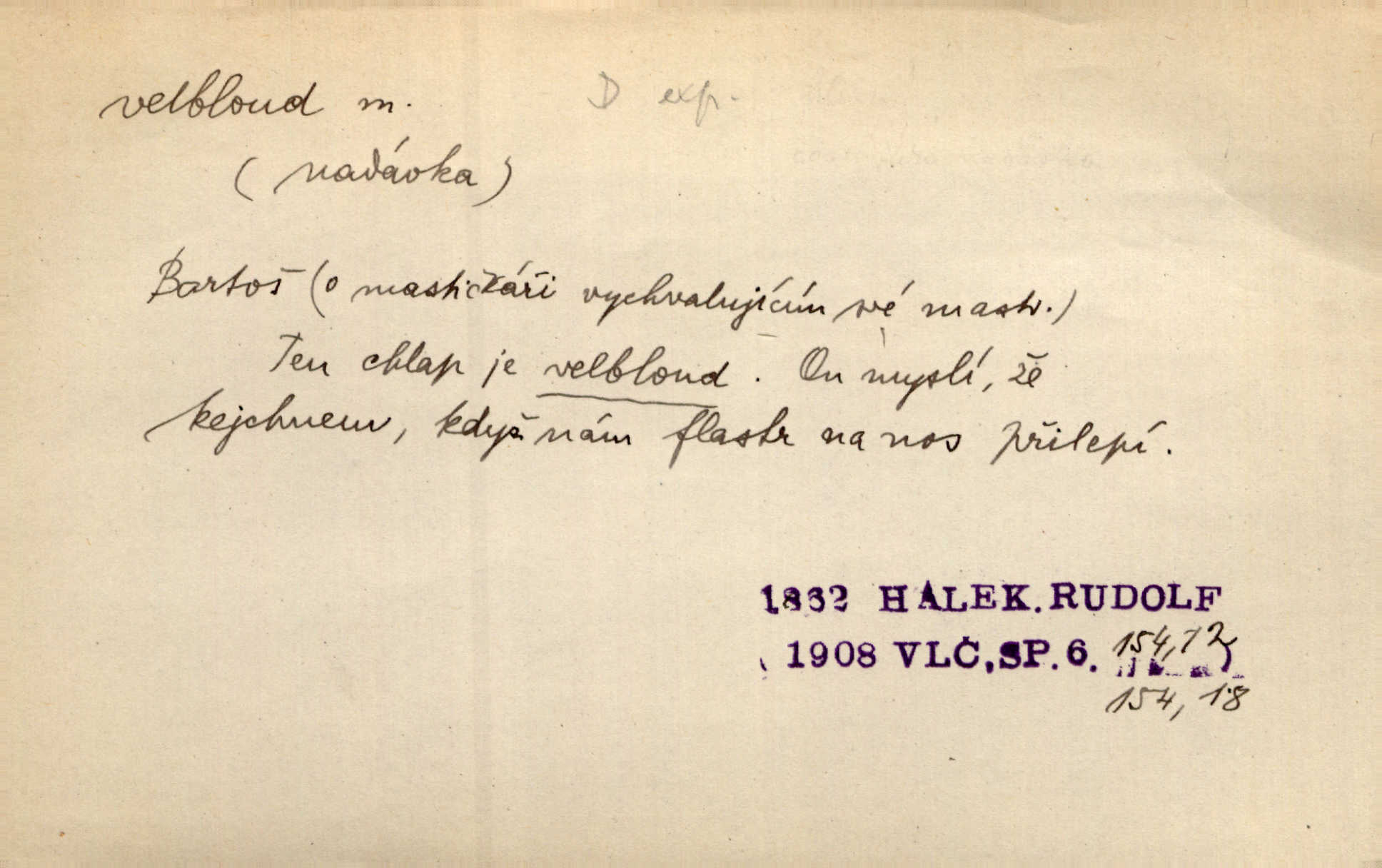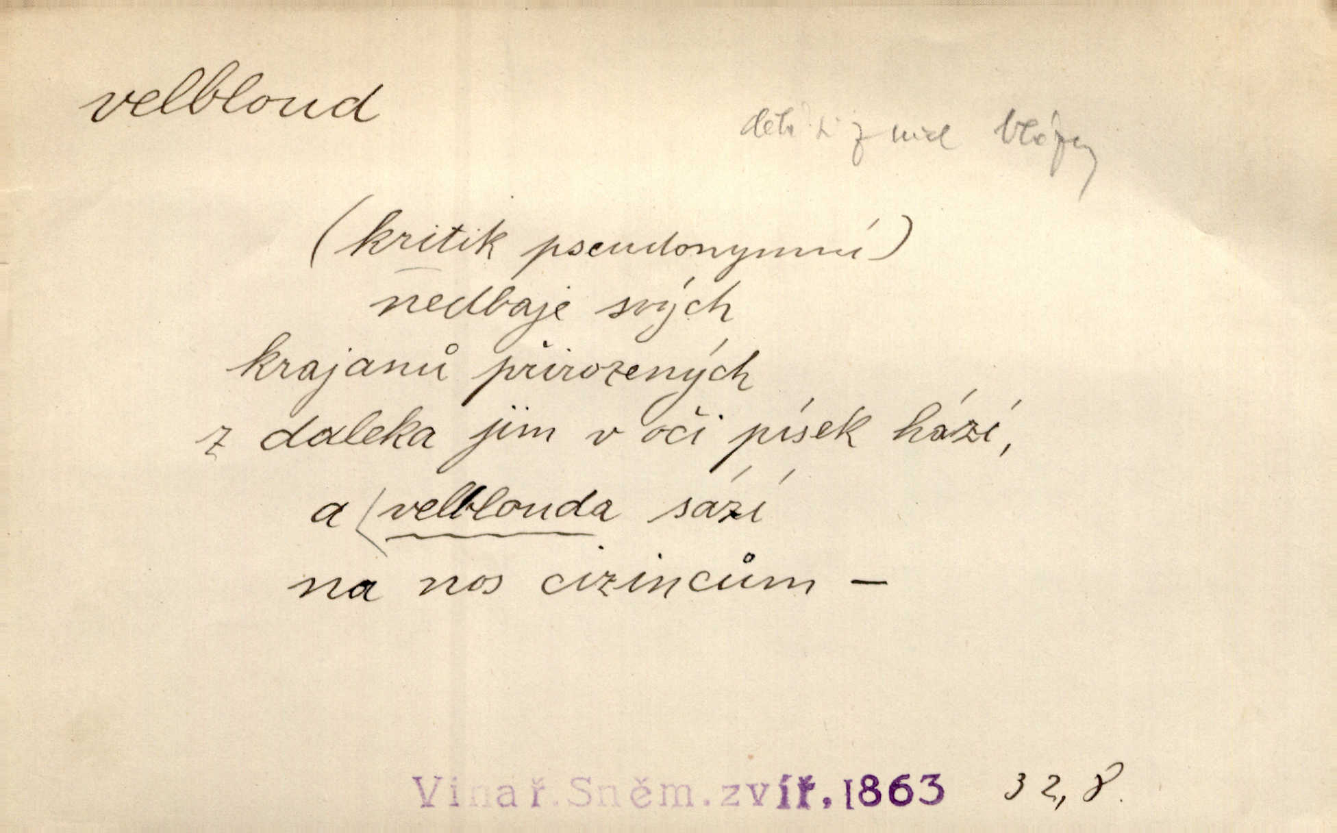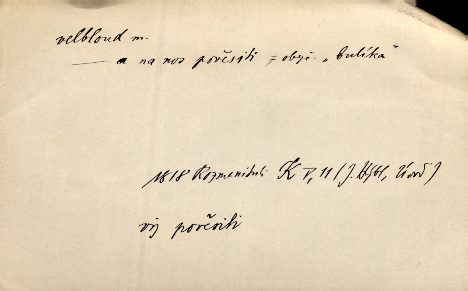 - velbloud (lid. vembloud), -a m. velký, cizokrajný přežvýkavec s jedním n. se dvěma hrby. Zas to poušť je širá, bez mezí, na níž velbloud klesá ve stín palem. Krás. Za nimi [betlemskými králi] postavil učitel všecko jejich komonstvo s běloušem, hrbatým velbloudem a slonem. Jir. Našla jsem děti Arabie, které na hřbetech velbloudů voňavky a kadidla do Memfidy vozí. Zey. Velbloud prý projde jehlou spíš, než takový rentier v nebe. Mach. Ať sem vembloud, když to není pravda ať jsem hlupák. Klost. Nedělej z komára velblouda nepřeháněj, nezveličuj. Čech. Ono kolikrát slovo komárem vyletí a velbloudem se vrátí! A. Mrš. [Kritik] velblouda sází na nos cizincům dělási z nich blázny. Vin. To je právě karakteristické pro naši demokracii: ta politika zcela přízemní, řekl bych hokynářská, která cedí komáry a polyká velbloudy pro maličkost jí utíkají věci závažné. Šal. Zool. velbloudi rod ssavců z čeledi Camelidae, Camelus; velbloud dvouhrbý. D Expr. hloupý, na hlavu padlý člověk (často jako nadávka). Ten chlap je velbloud. On myslí, že kejchnem, když nám flastr na nos přilepí. Hál. O lásce k vlasti nekaž velbloudu. Havl. Hned se podíváme, zdali toho velblouda tam [ve studni] ještě uhlídáme. Sab. Co vám do toho, velbloude? Don. „Pojďte, vy velbloudi,“ křikl nyní Mikeš na hochy, „když se k ničemu jinému nehodíte, tak mi aspoň podržte provaz, bych se po něm dolů svezl.“ Něm.