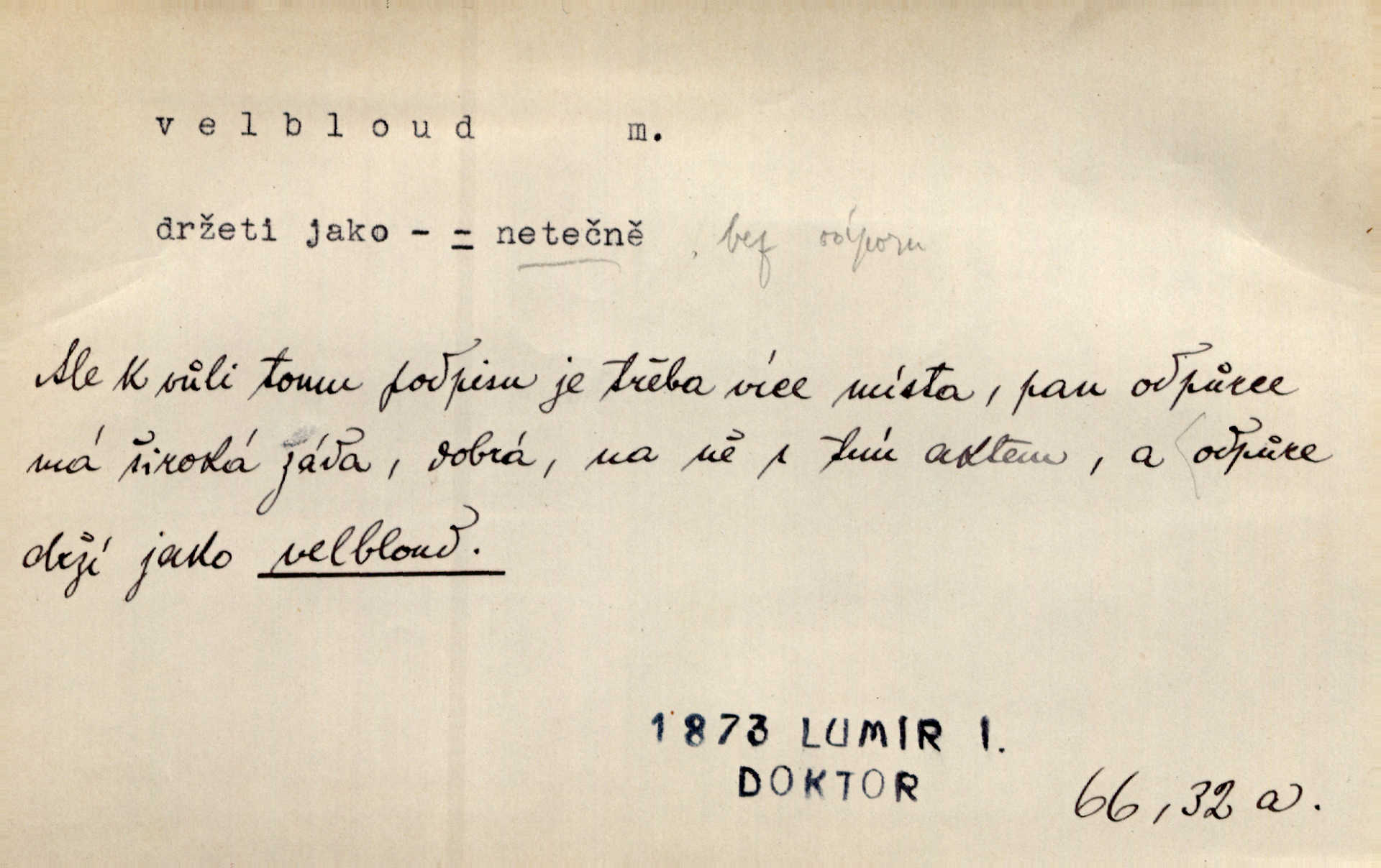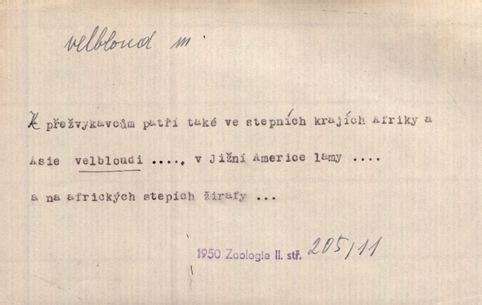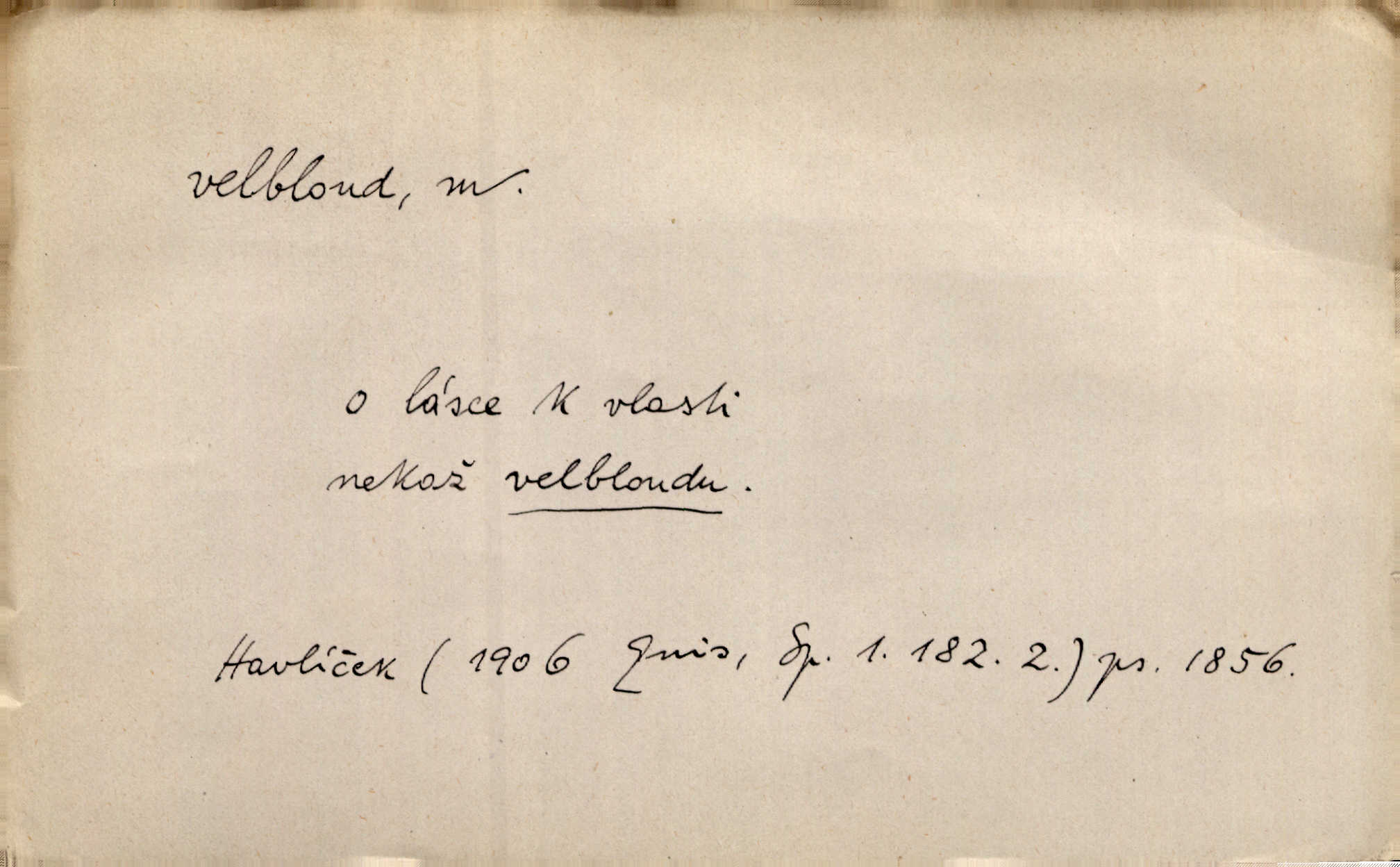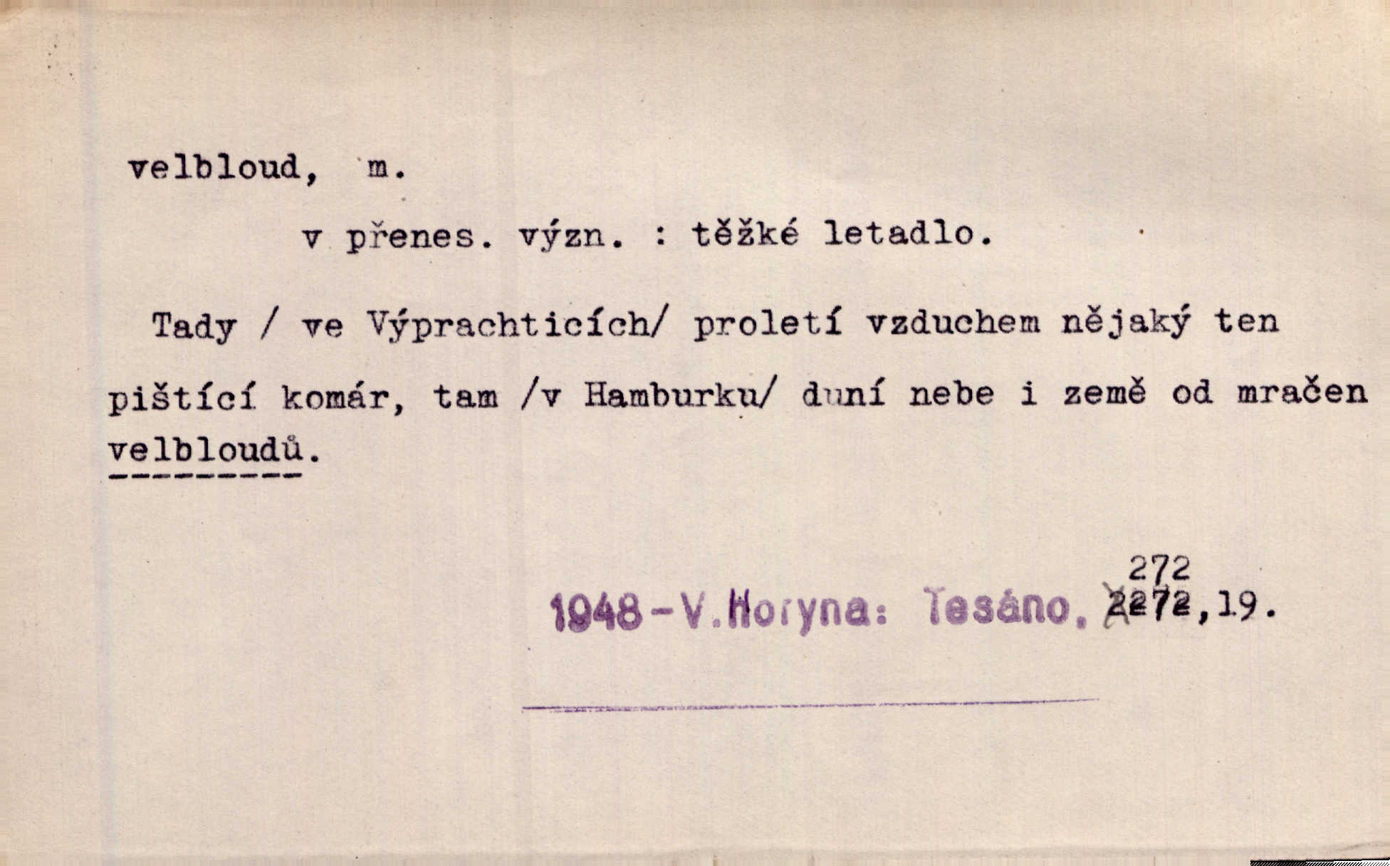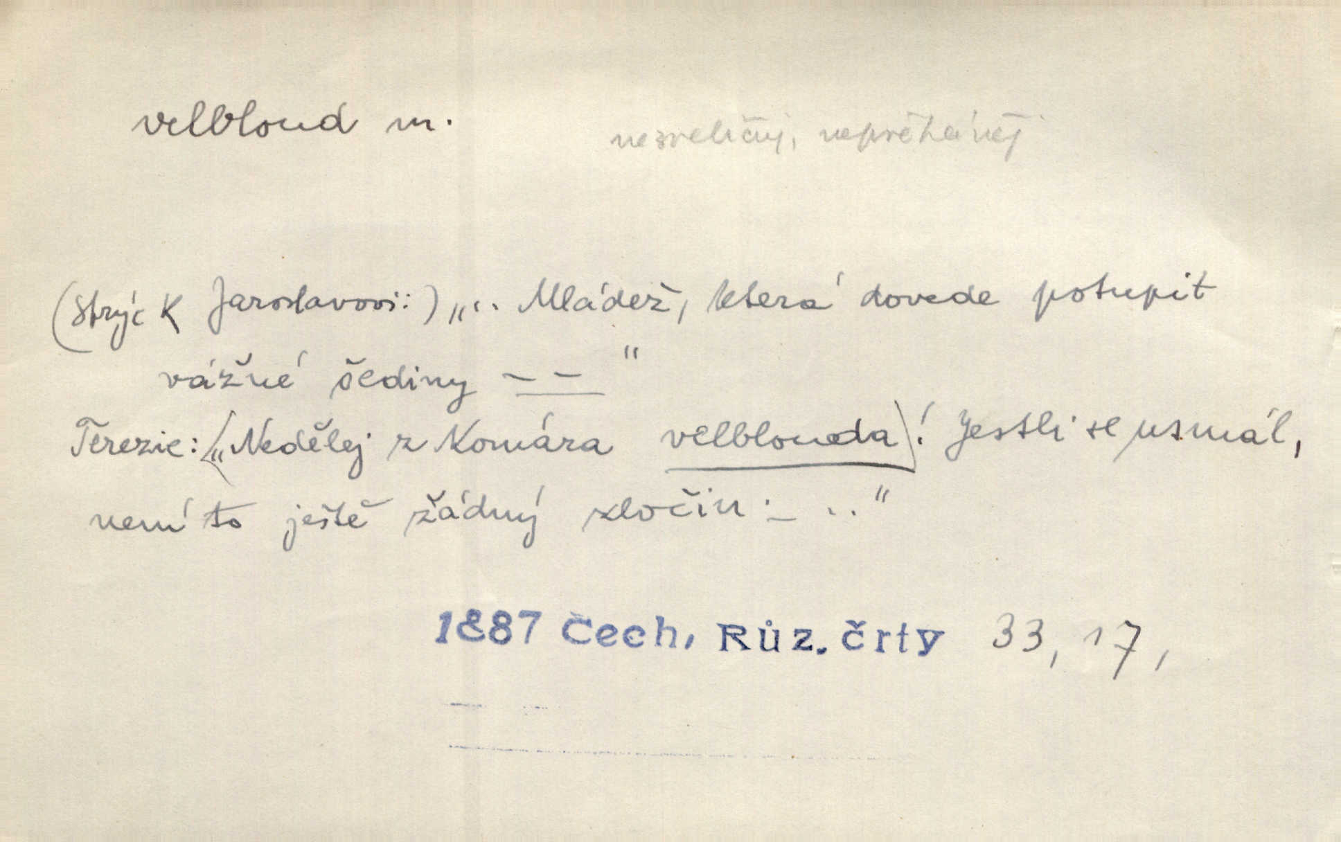 - velbloud (lid. vembloud), -a m. velký, cizokrajný přežvýkavec s jedním n. se dvěma hrby. Zas to poušť je širá, bez mezí, na níž velbloud klesá ve stín palem. Krás. Za nimi [betlemskými králi] postavil učitel všecko jejich komonstvo s běloušem, hrbatým velbloudem a slonem. Jir. Našla jsem děti Arabie, které na hřbetech velbloudů voňavky a kadidla do Memfidy vozí. Zey. Velbloud prý projde jehlou spíš, než takový rentier v nebe. Mach. Ať sem vembloud, když to není pravda ať jsem hlupák. Klost. Nedělej z komára velblouda nepřeháněj, nezveličuj. Čech. Ono kolikrát slovo komárem vyletí a velbloudem se vrátí! A. Mrš. [Kritik] velblouda sází na nos cizincům dělási z nich blázny. Vin. To je právě karakteristické pro naši demokracii: ta politika zcela přízemní, řekl bych hokynářská, která cedí komáry a polyká velbloudy pro maličkost jí utíkají věci závažné. Šal. Zool. velbloudi rod ssavců z čeledi Camelidae, Camelus; velbloud dvouhrbý. D Expr. hloupý, na hlavu padlý člověk (často jako nadávka). Ten chlap je velbloud. On myslí, že kejchnem, když nám flastr na nos přilepí. Hál. O lásce k vlasti nekaž velbloudu. Havl. Hned se podíváme, zdali toho velblouda tam [ve studni] ještě uhlídáme. Sab. Co vám do toho, velbloude? Don. „Pojďte, vy velbloudi,“ křikl nyní Mikeš na hochy, „když se k ničemu jinému nehodíte, tak mi aspoň podržte provaz, bych se po něm dolů svezl.“ Něm.