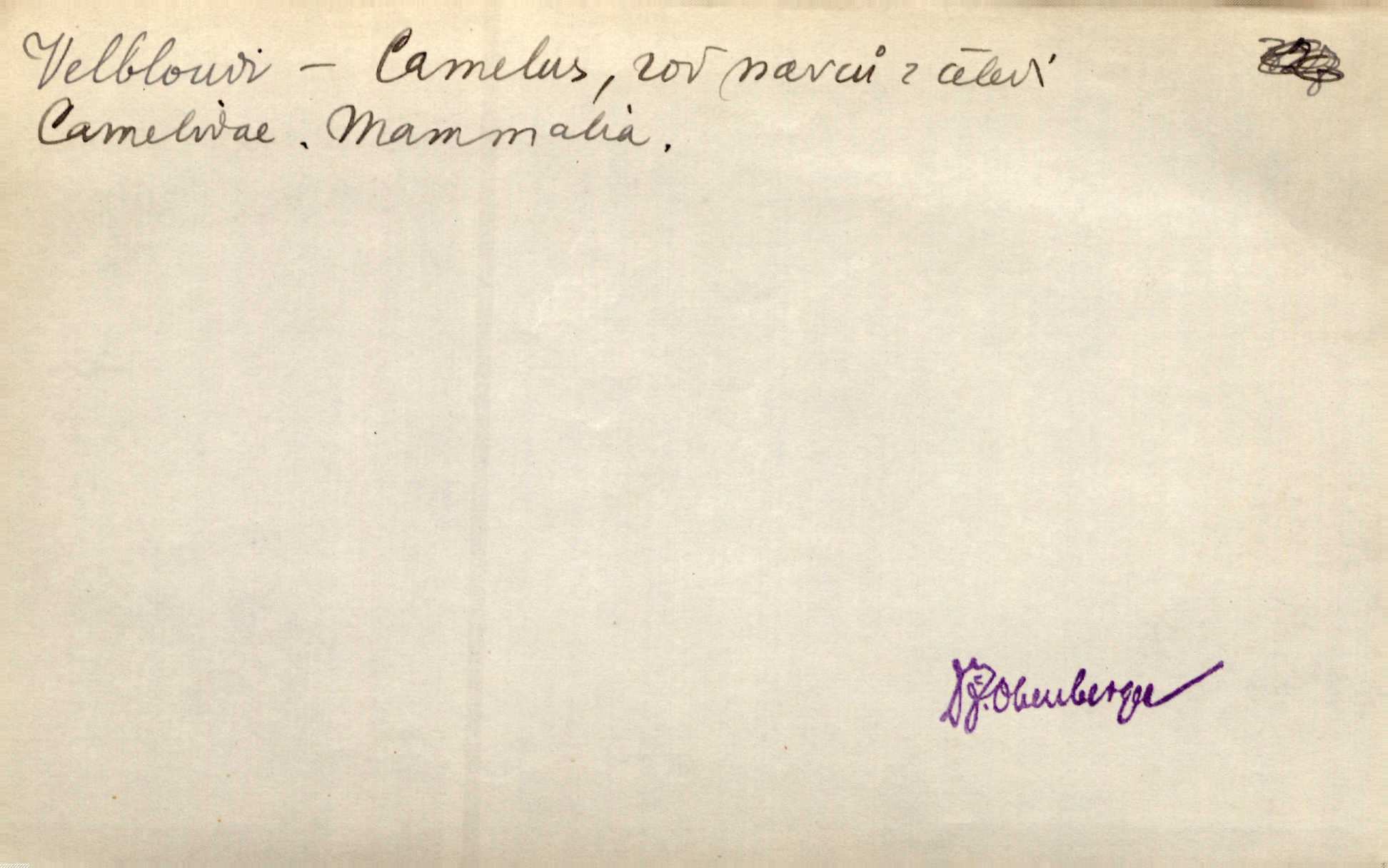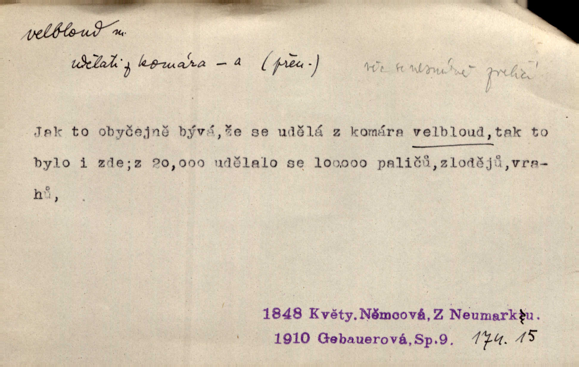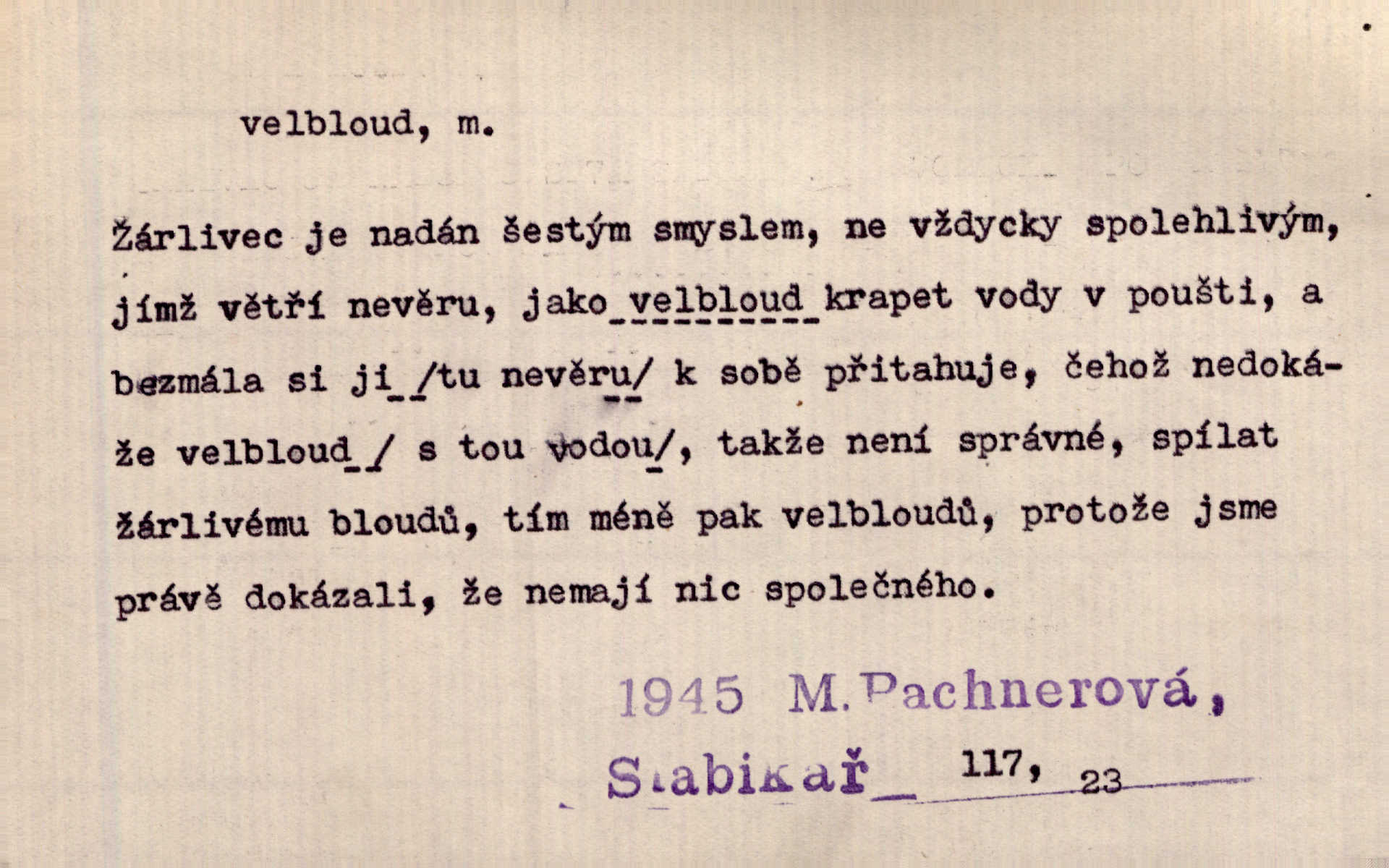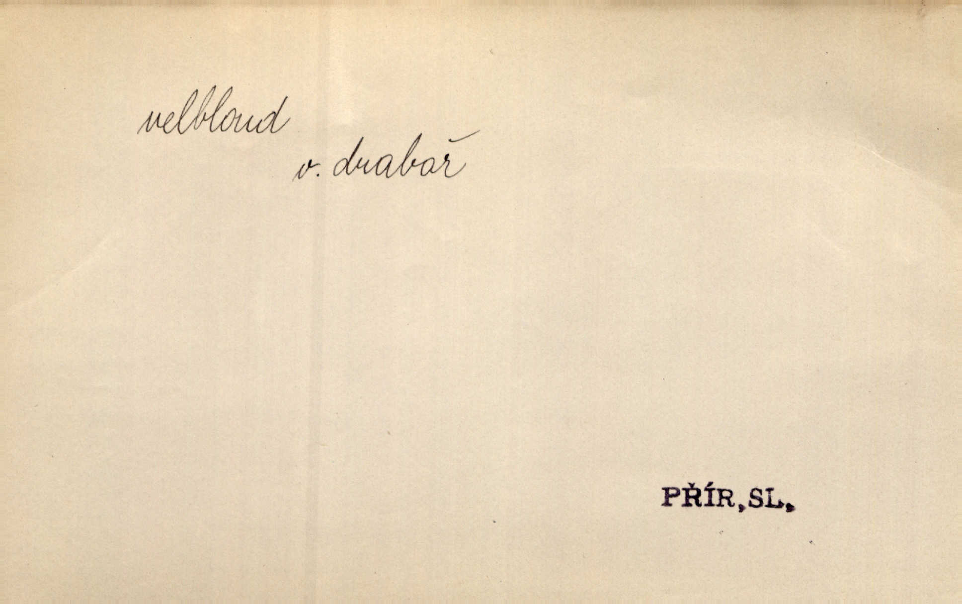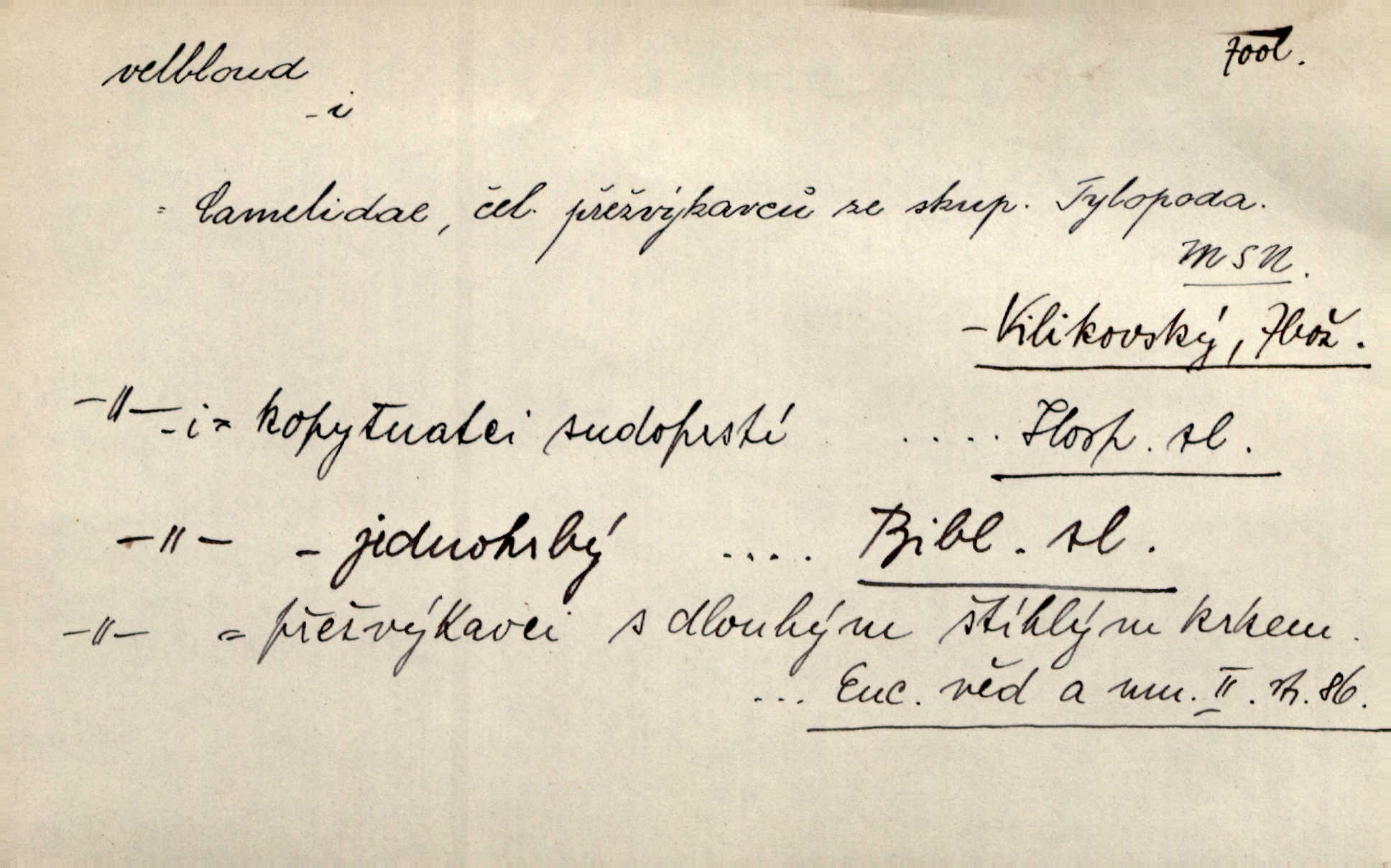 - velbloud (lid. vembloud), -a m. velký, cizokrajný přežvýkavec s jedním n. se dvěma hrby. Zas to poušť je širá, bez mezí, na níž velbloud klesá ve stín palem. Krás. Za nimi [betlemskými králi] postavil učitel všecko jejich komonstvo s běloušem, hrbatým velbloudem a slonem. Jir. Našla jsem děti Arabie, které na hřbetech velbloudů voňavky a kadidla do Memfidy vozí. Zey. Velbloud prý projde jehlou spíš, než takový rentier v nebe. Mach. Ať sem vembloud, když to není pravda ať jsem hlupák. Klost. Nedělej z komára velblouda nepřeháněj, nezveličuj. Čech. Ono kolikrát slovo komárem vyletí a velbloudem se vrátí! A. Mrš. [Kritik] velblouda sází na nos cizincům dělási z nich blázny. Vin. To je právě karakteristické pro naši demokracii: ta politika zcela přízemní, řekl bych hokynářská, která cedí komáry a polyká velbloudy pro maličkost jí utíkají věci závažné. Šal. Zool. velbloudi rod ssavců z čeledi Camelidae, Camelus; velbloud dvouhrbý. D Expr. hloupý, na hlavu padlý člověk (často jako nadávka). Ten chlap je velbloud. On myslí, že kejchnem, když nám flastr na nos přilepí. Hál. O lásce k vlasti nekaž velbloudu. Havl. Hned se podíváme, zdali toho velblouda tam [ve studni] ještě uhlídáme. Sab. Co vám do toho, velbloude? Don. „Pojďte, vy velbloudi,“ křikl nyní Mikeš na hochy, „když se k ničemu jinému nehodíte, tak mi aspoň podržte provaz, bych se po něm dolů svezl.“ Něm.