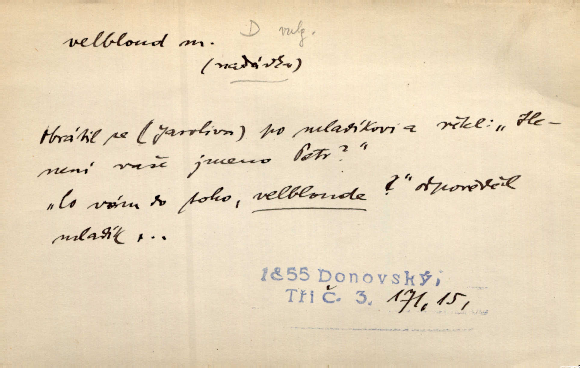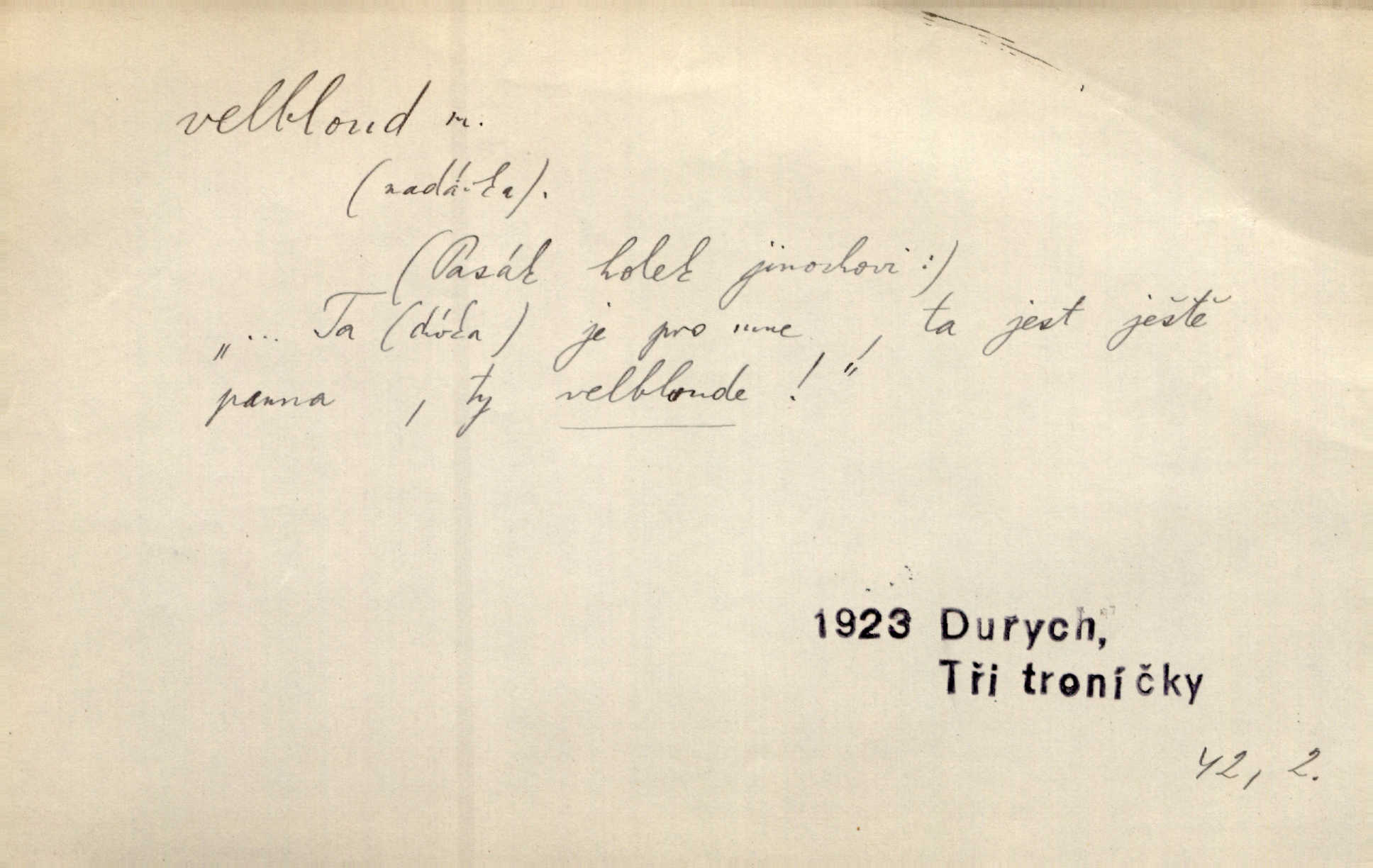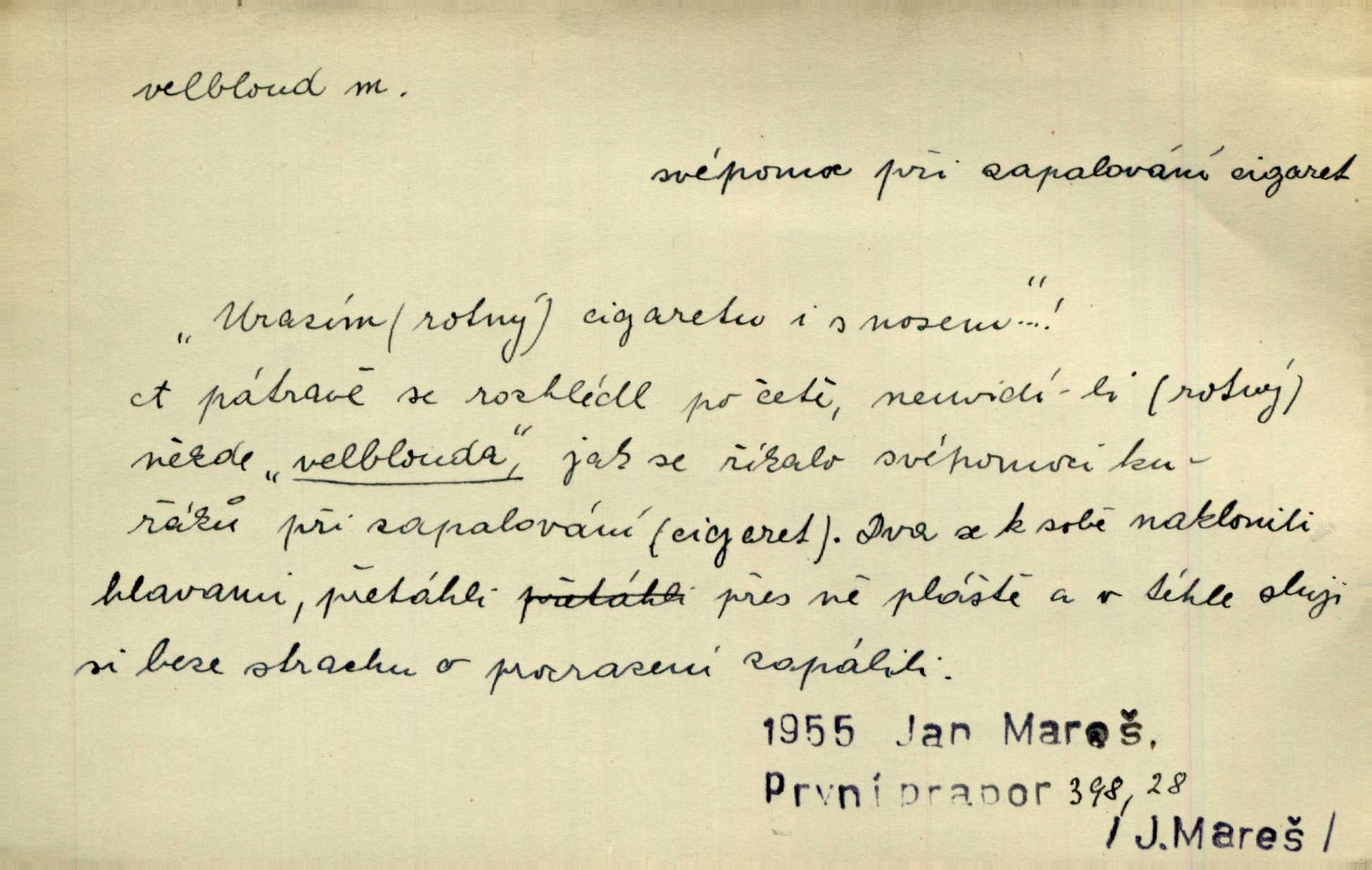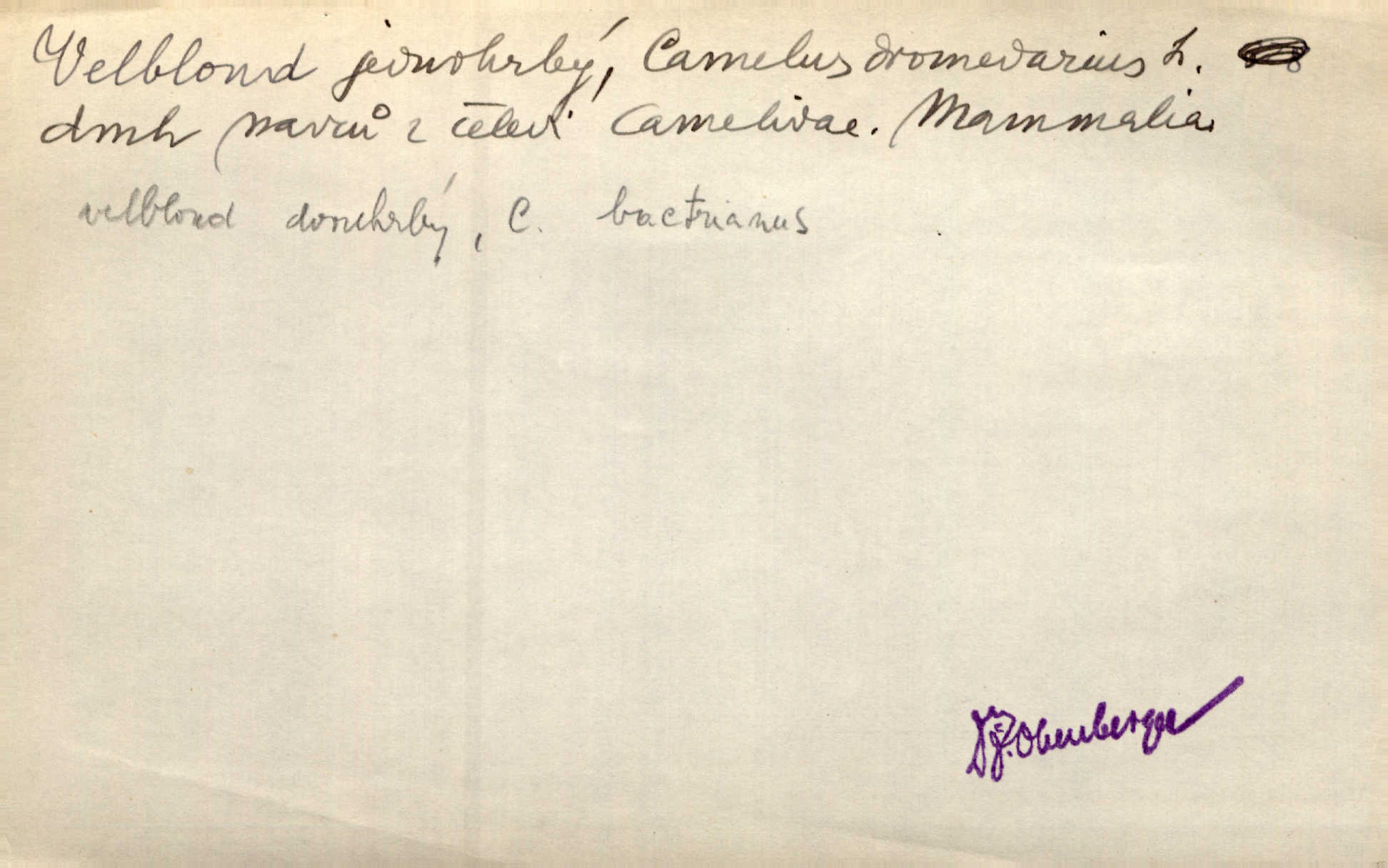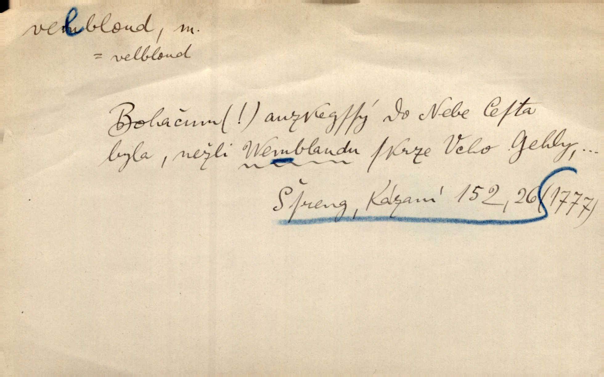 - velbloud (lid. vembloud), -a m. velký, cizokrajný přežvýkavec s jedním n. se dvěma hrby. Zas to poušť je širá, bez mezí, na níž velbloud klesá ve stín palem. Krás. Za nimi [betlemskými králi] postavil učitel všecko jejich komonstvo s běloušem, hrbatým velbloudem a slonem. Jir. Našla jsem děti Arabie, které na hřbetech velbloudů voňavky a kadidla do Memfidy vozí. Zey. Velbloud prý projde jehlou spíš, než takový rentier v nebe. Mach. Ať sem vembloud, když to není pravda ať jsem hlupák. Klost. Nedělej z komára velblouda nepřeháněj, nezveličuj. Čech. Ono kolikrát slovo komárem vyletí a velbloudem se vrátí! A. Mrš. [Kritik] velblouda sází na nos cizincům dělási z nich blázny. Vin. To je právě karakteristické pro naši demokracii: ta politika zcela přízemní, řekl bych hokynářská, která cedí komáry a polyká velbloudy pro maličkost jí utíkají věci závažné. Šal. Zool. velbloudi rod ssavců z čeledi Camelidae, Camelus; velbloud dvouhrbý. D Expr. hloupý, na hlavu padlý člověk (často jako nadávka). Ten chlap je velbloud. On myslí, že kejchnem, když nám flastr na nos přilepí. Hál. O lásce k vlasti nekaž velbloudu. Havl. Hned se podíváme, zdali toho velblouda tam [ve studni] ještě uhlídáme. Sab. Co vám do toho, velbloude? Don. „Pojďte, vy velbloudi,“ křikl nyní Mikeš na hochy, „když se k ničemu jinému nehodíte, tak mi aspoň podržte provaz, bych se po něm dolů svezl.“ Něm.