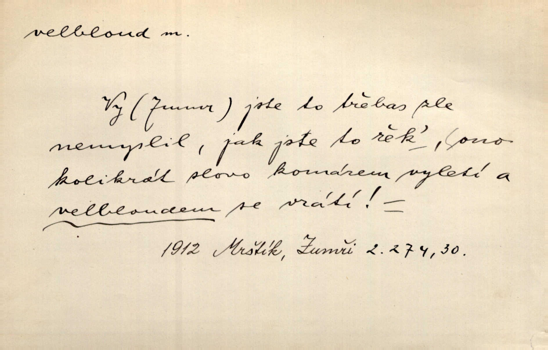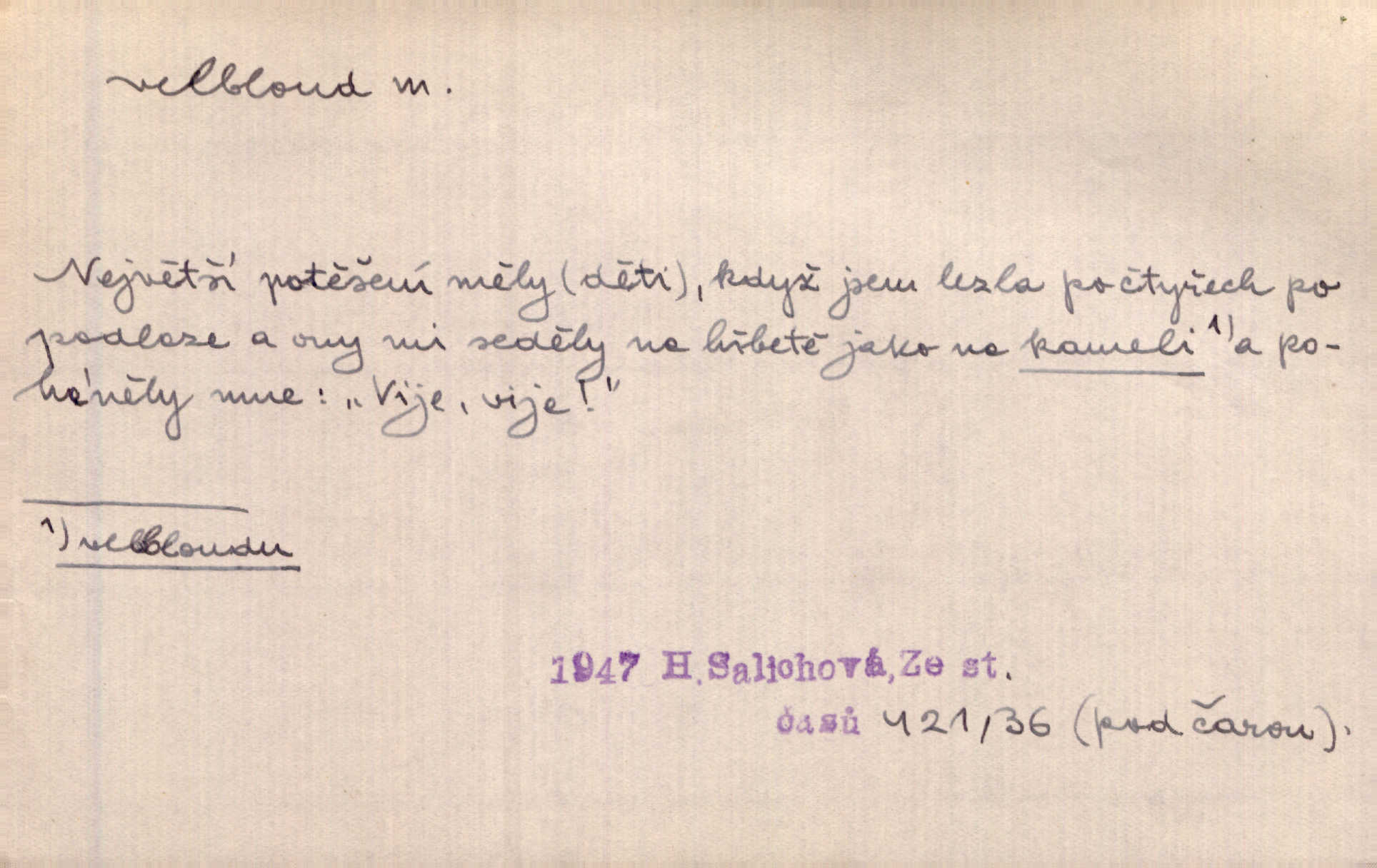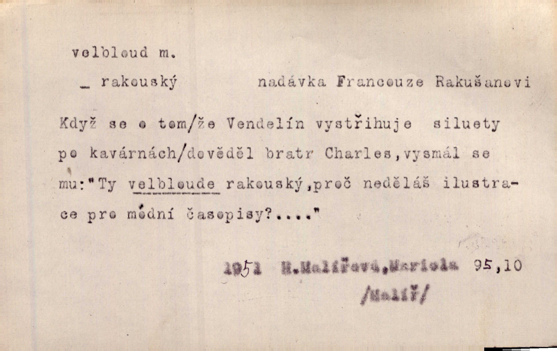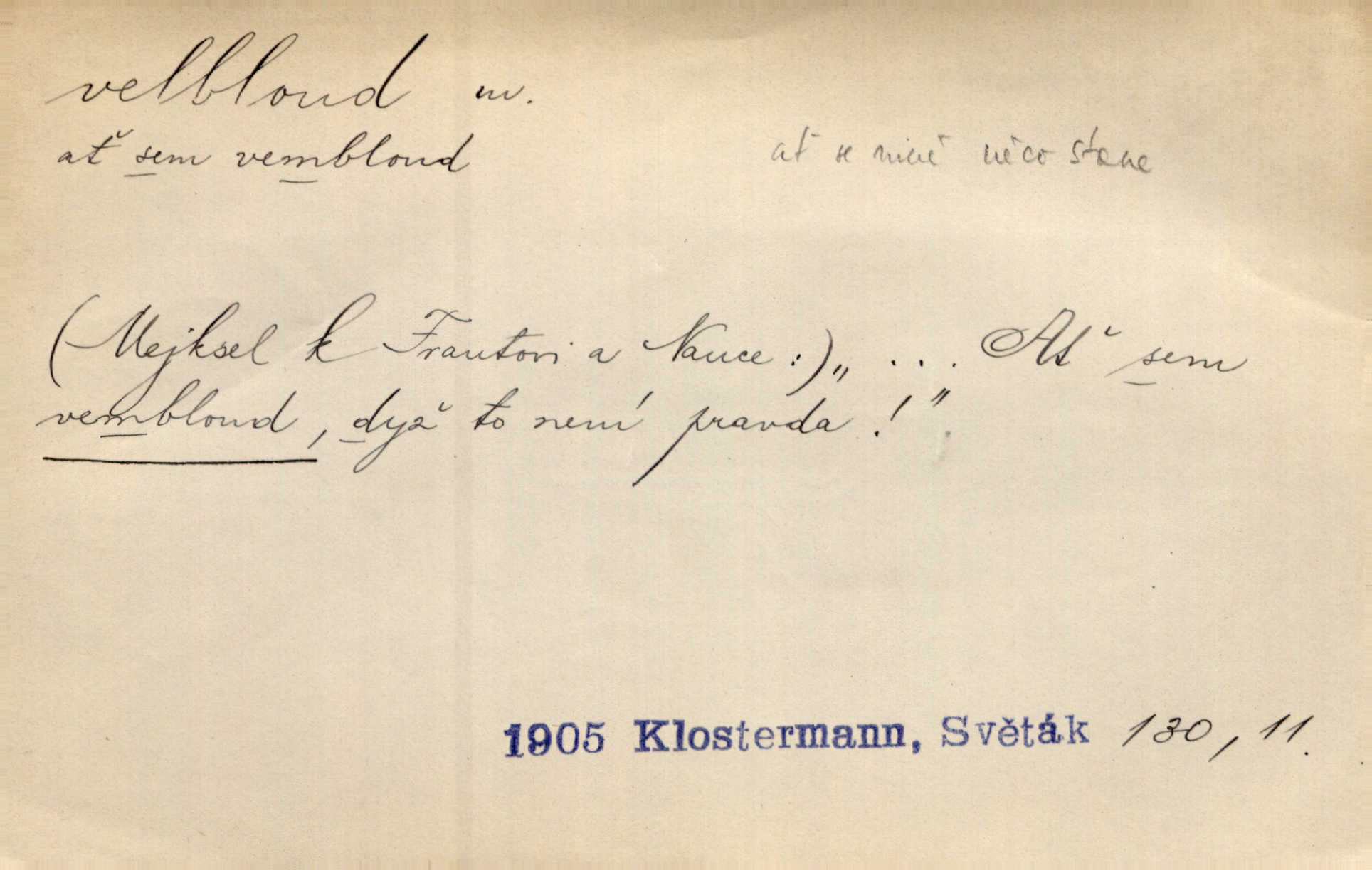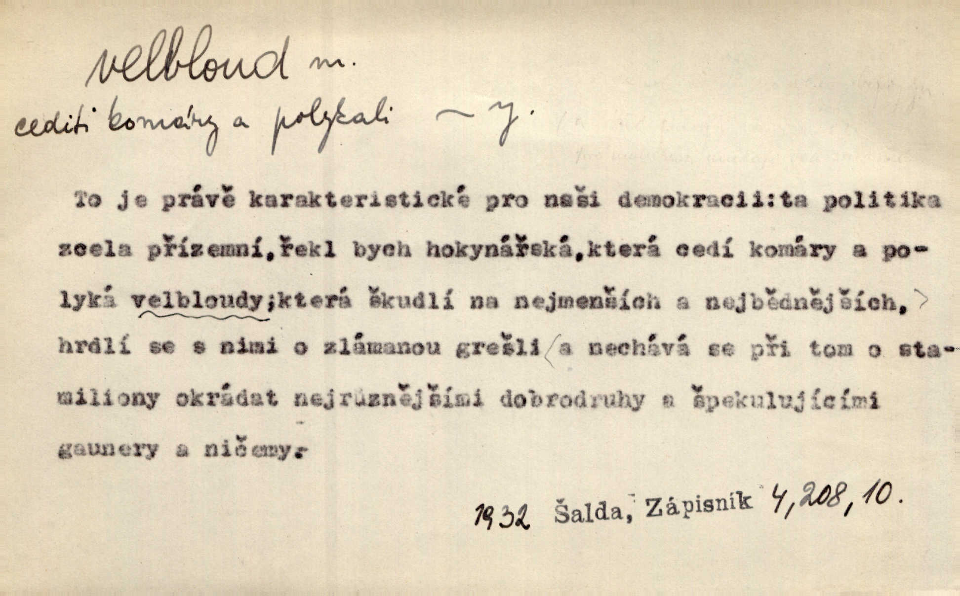 - velbloud (lid. vembloud), -a m. velký, cizokrajný přežvýkavec s jedním n. se dvěma hrby. Zas to poušť je širá, bez mezí, na níž velbloud klesá ve stín palem. Krás. Za nimi [betlemskými králi] postavil učitel všecko jejich komonstvo s běloušem, hrbatým velbloudem a slonem. Jir. Našla jsem děti Arabie, které na hřbetech velbloudů voňavky a kadidla do Memfidy vozí. Zey. Velbloud prý projde jehlou spíš, než takový rentier v nebe. Mach. Ať sem vembloud, když to není pravda ať jsem hlupák. Klost. Nedělej z komára velblouda nepřeháněj, nezveličuj. Čech. Ono kolikrát slovo komárem vyletí a velbloudem se vrátí! A. Mrš. [Kritik] velblouda sází na nos cizincům dělási z nich blázny. Vin. To je právě karakteristické pro naši demokracii: ta politika zcela přízemní, řekl bych hokynářská, která cedí komáry a polyká velbloudy pro maličkost jí utíkají věci závažné. Šal. Zool. velbloudi rod ssavců z čeledi Camelidae, Camelus; velbloud dvouhrbý. D Expr. hloupý, na hlavu padlý člověk (často jako nadávka). Ten chlap je velbloud. On myslí, že kejchnem, když nám flastr na nos přilepí. Hál. O lásce k vlasti nekaž velbloudu. Havl. Hned se podíváme, zdali toho velblouda tam [ve studni] ještě uhlídáme. Sab. Co vám do toho, velbloude? Don. „Pojďte, vy velbloudi,“ křikl nyní Mikeš na hochy, „když se k ničemu jinému nehodíte, tak mi aspoň podržte provaz, bych se po něm dolů svezl.“ Něm.