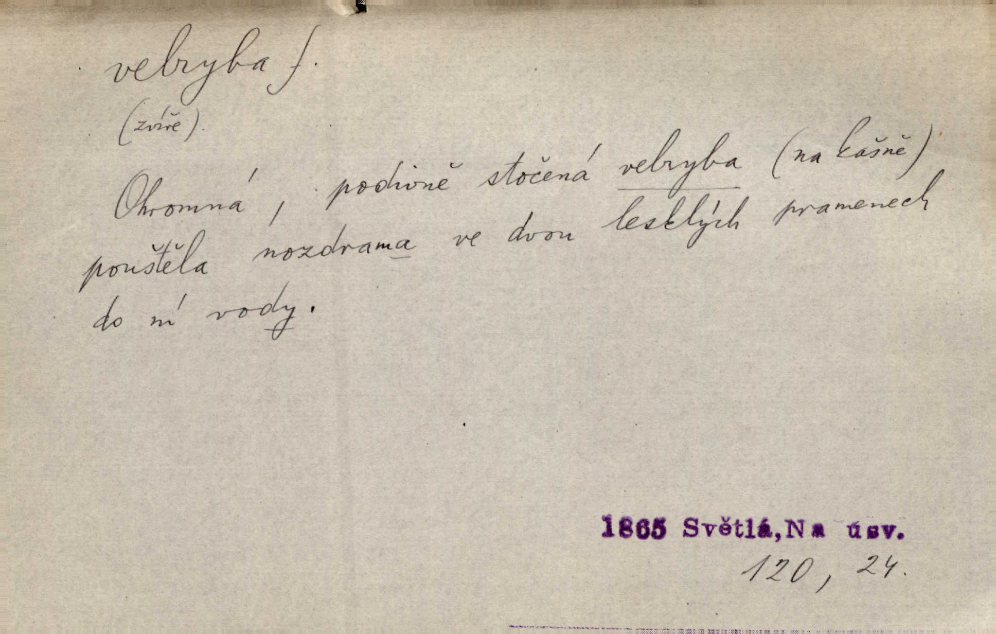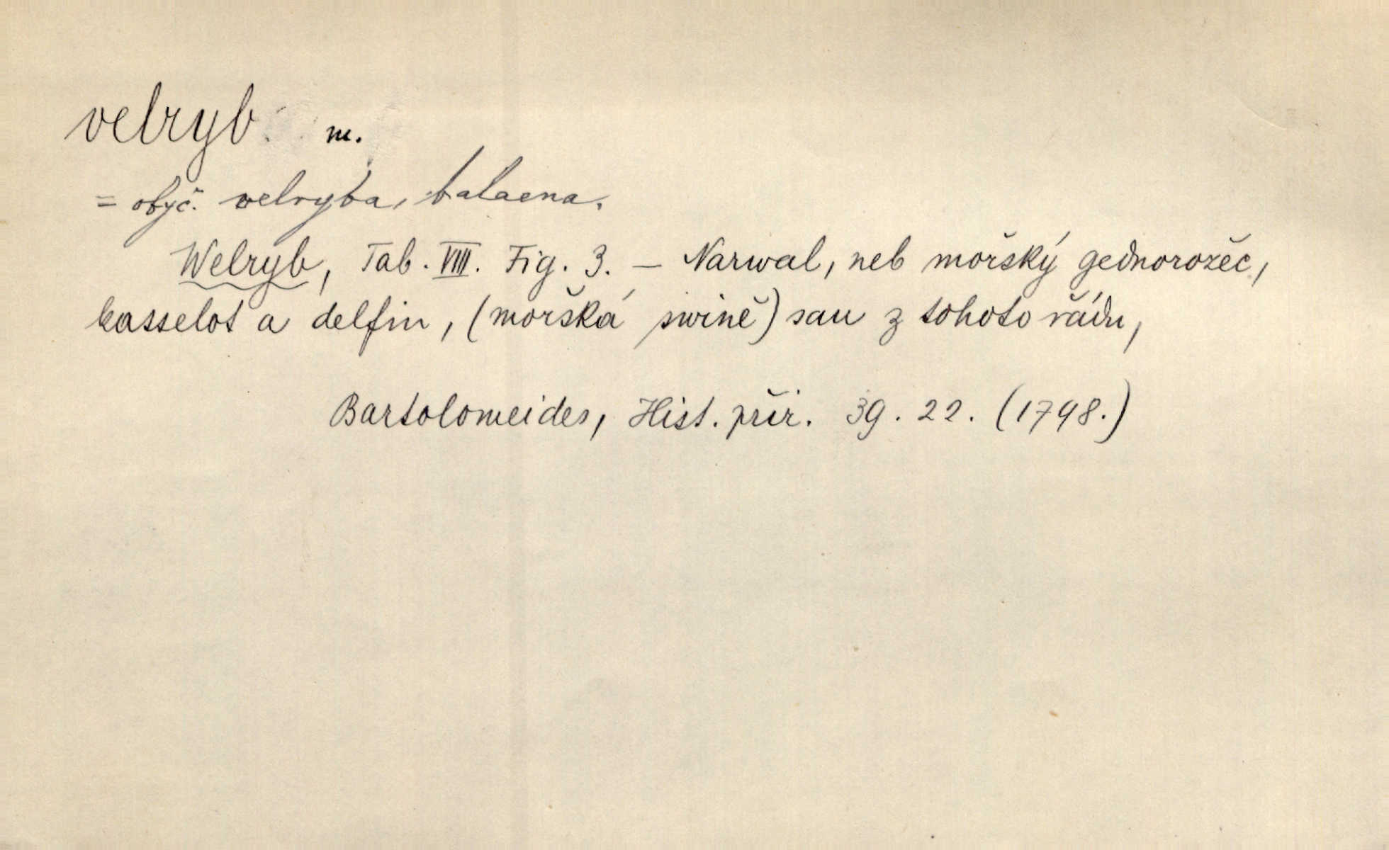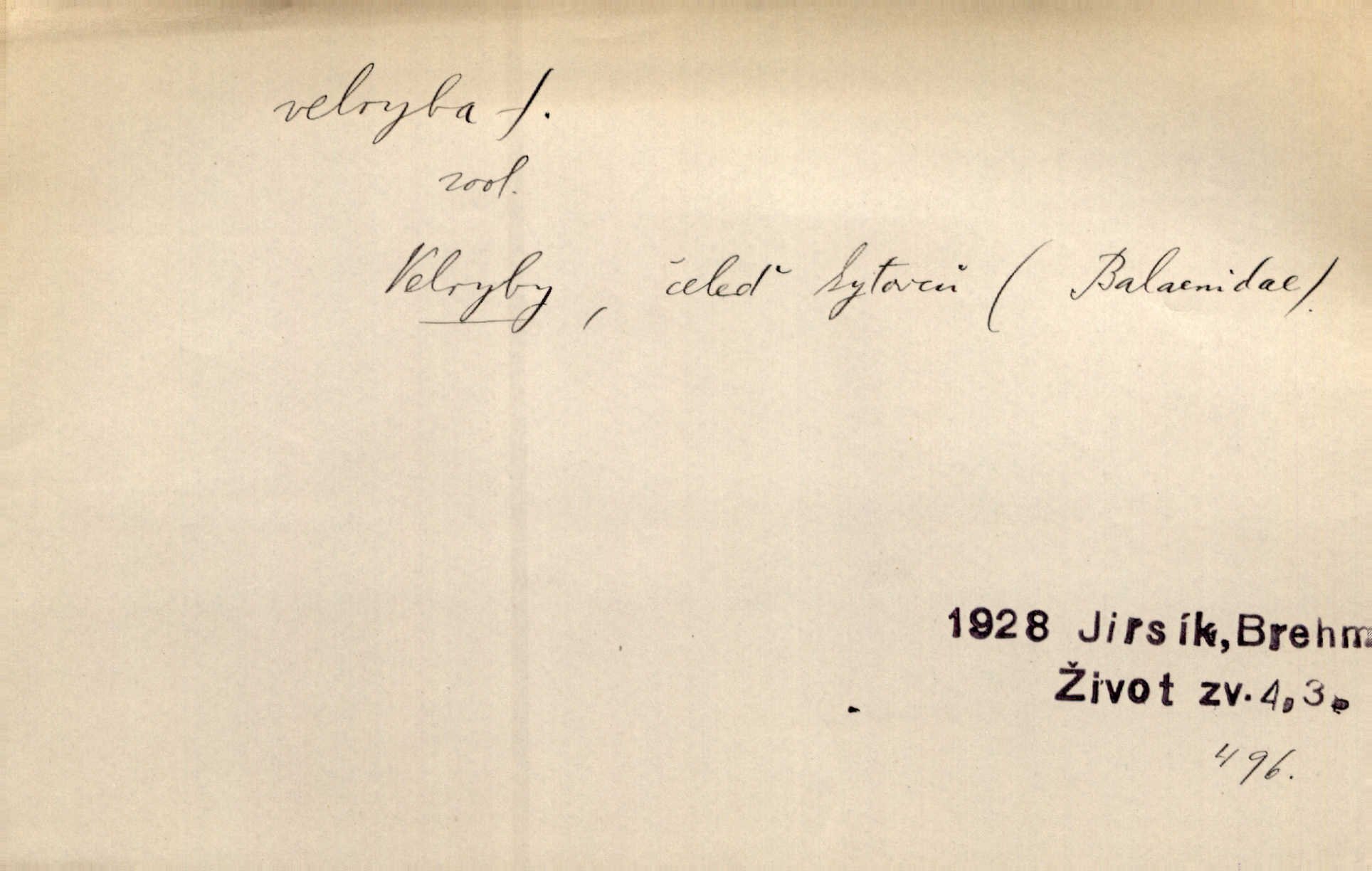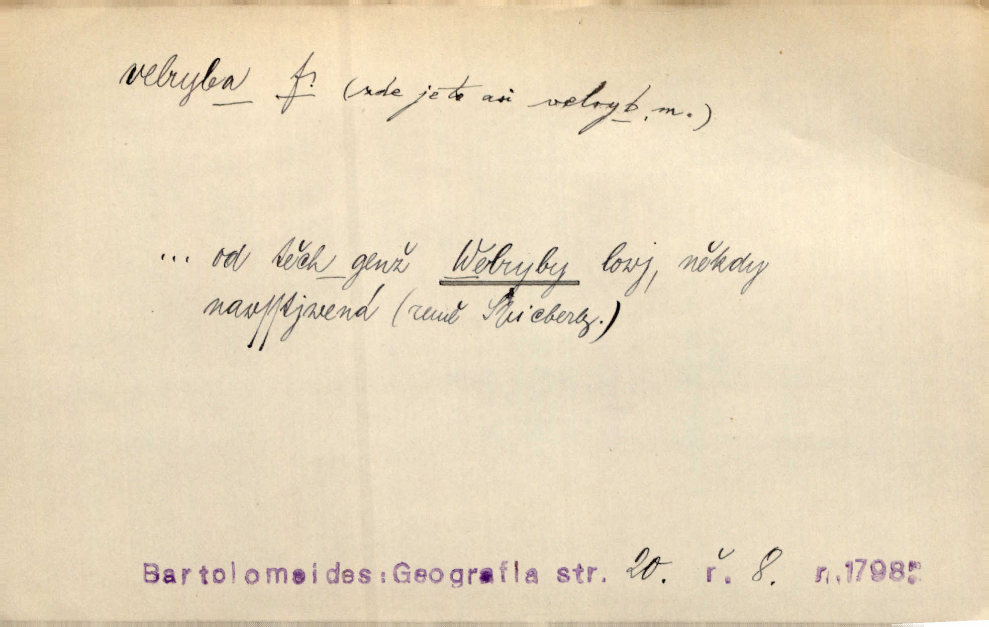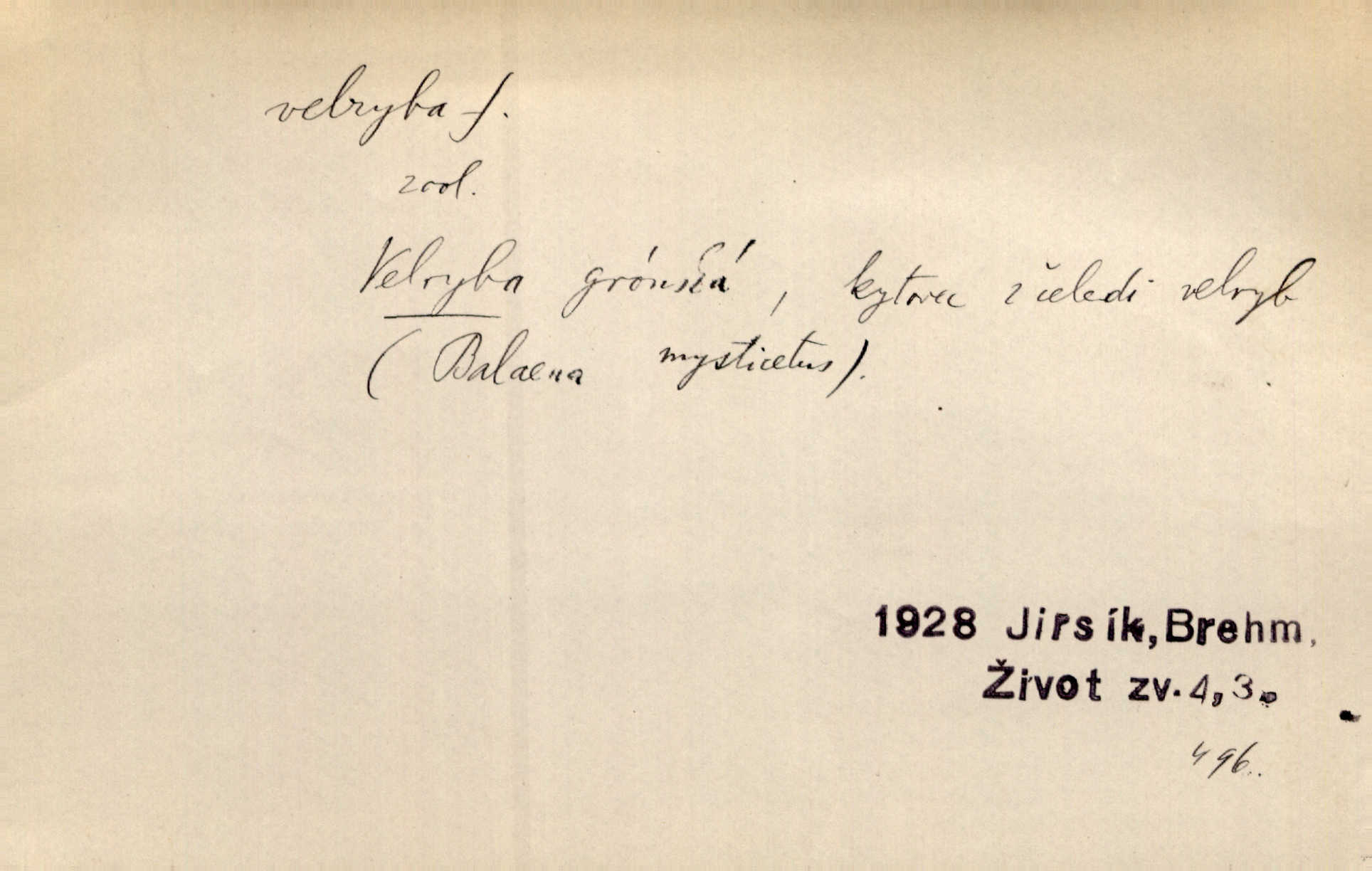 - velryba, -y f. velký mořský ssavec kytovitý. Zamířil do Gronska, kde se oddal lovu velryb a tuleňů. Herrm. Nad ním ve vzduchu orel plul, pod ním velryby pluly. Slád. Vždyť je ten ochlasta jako ta velryba Jonášova, jak živ nemá dost. Šmil. Přen. A temné vody německé autarkie sloužily výkrmu jen největších a nejkrutějších velryb mamutích průmyslových podniků. R. právo. Zool. rod ssavců z čeledi Balaenidae, Balaena; velryba gronská. Astron. Velryba souhvězdí jižní oblohy, Cetus.