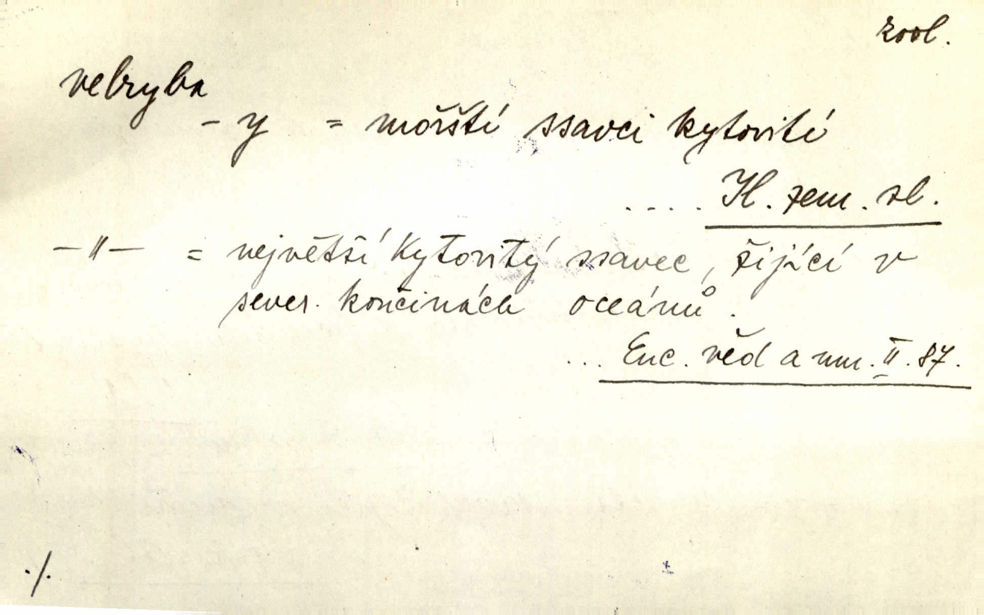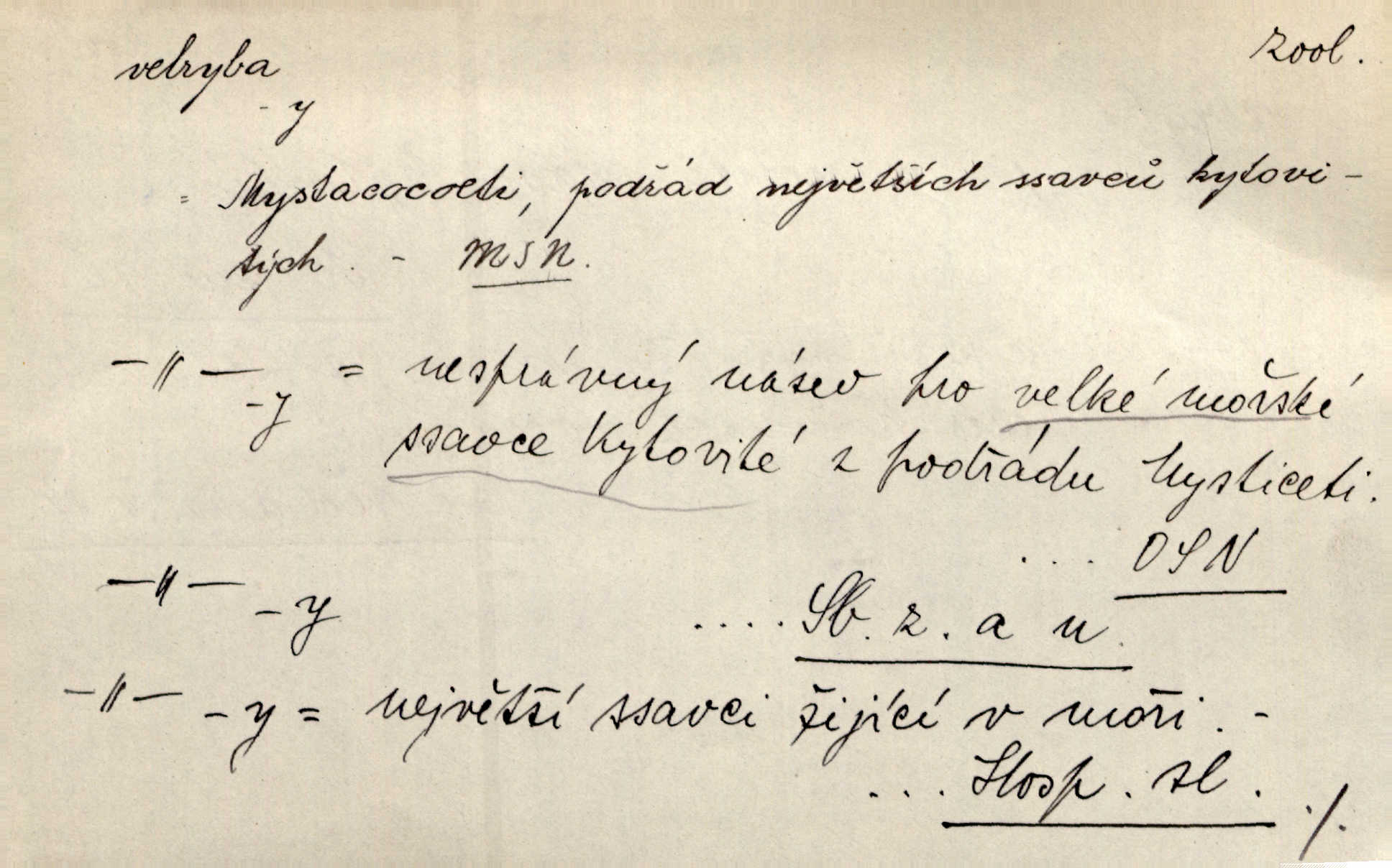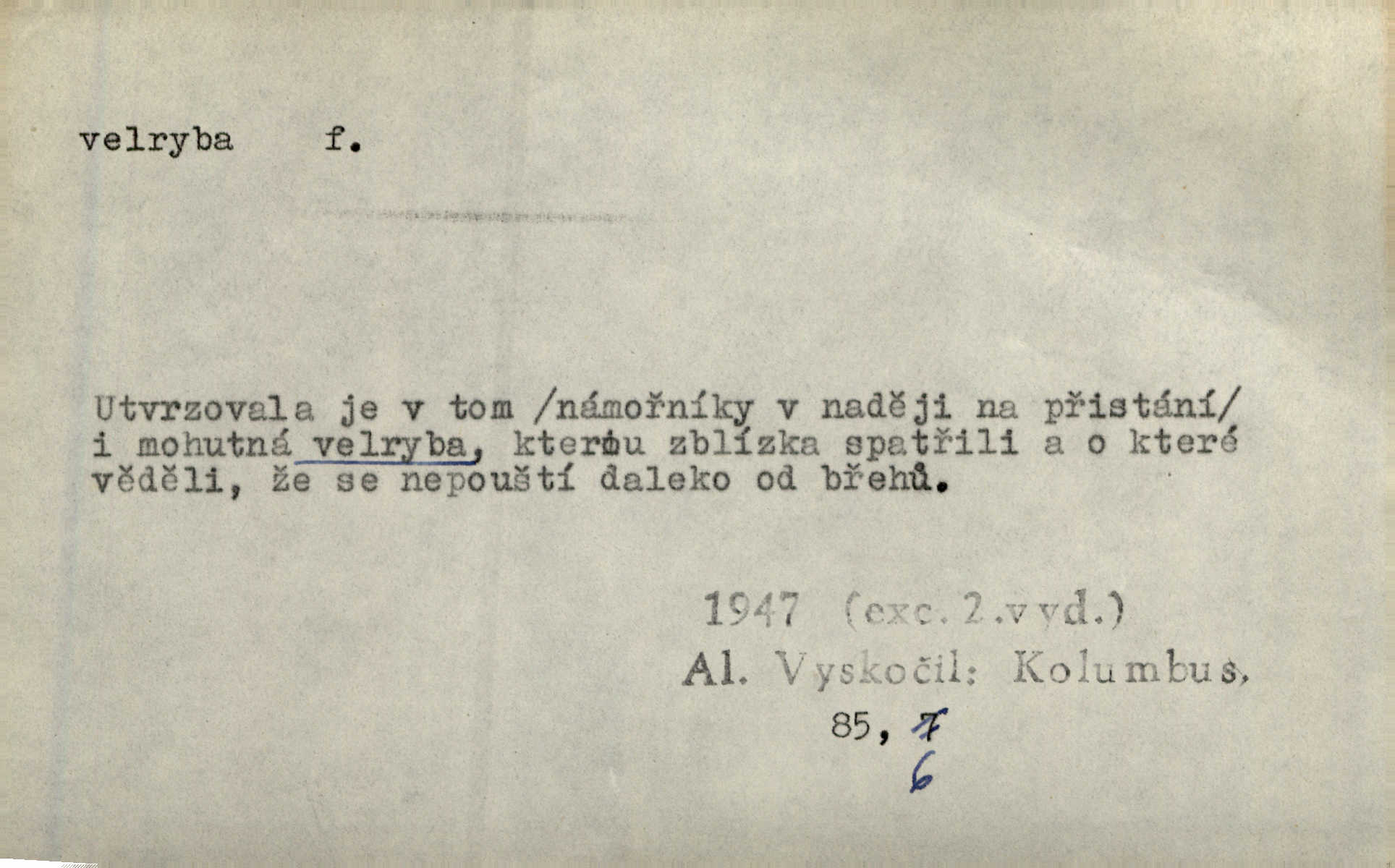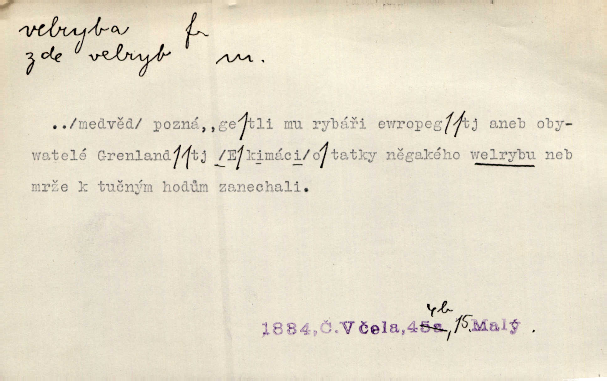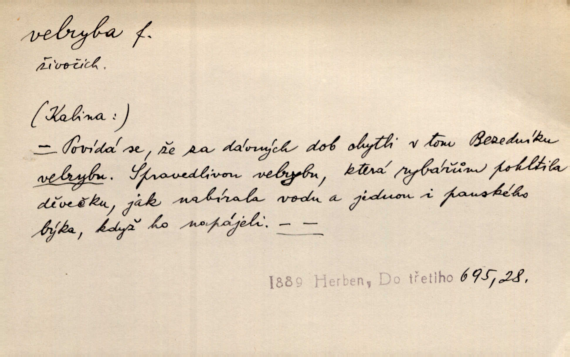 - velryba, -y f. velký mořský ssavec kytovitý. Zamířil do Gronska, kde se oddal lovu velryb a tuleňů. Herrm. Nad ním ve vzduchu orel plul, pod ním velryby pluly. Slád. Vždyť je ten ochlasta jako ta velryba Jonášova, jak živ nemá dost. Šmil. Přen. A temné vody německé autarkie sloužily výkrmu jen největších a nejkrutějších velryb mamutích průmyslových podniků. R. právo. Zool. rod ssavců z čeledi Balaenidae, Balaena; velryba gronská. Astron. Velryba souhvězdí jižní oblohy, Cetus.