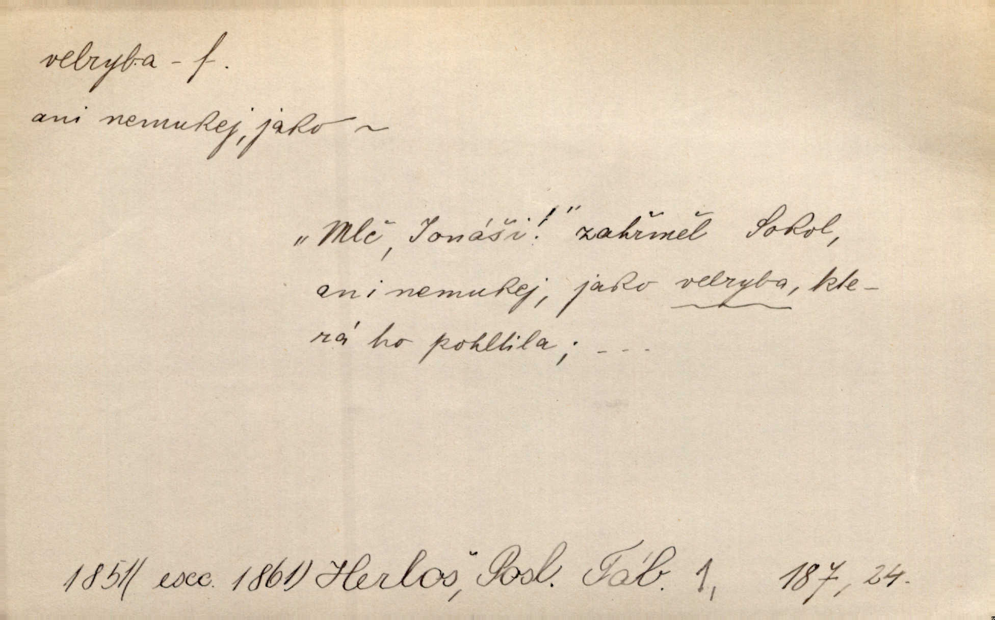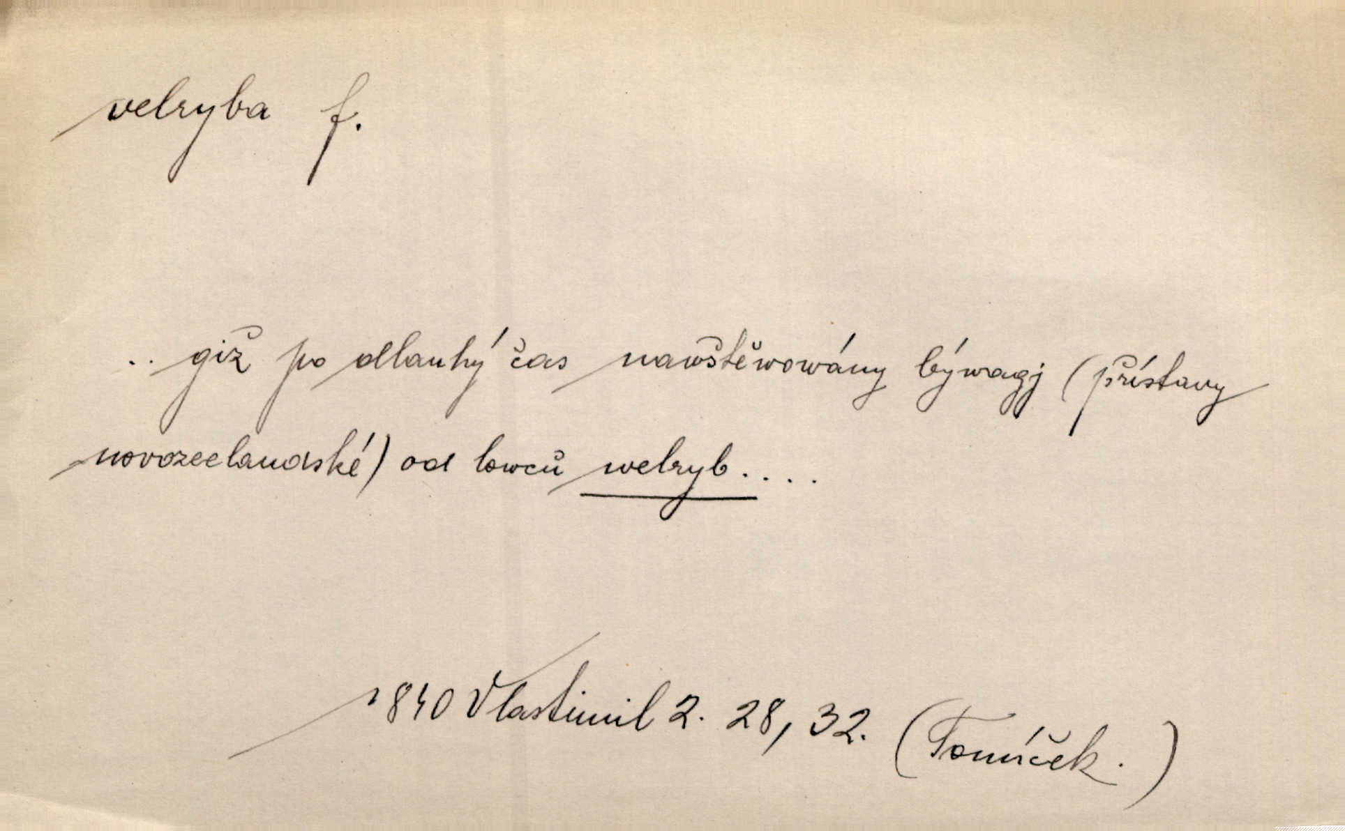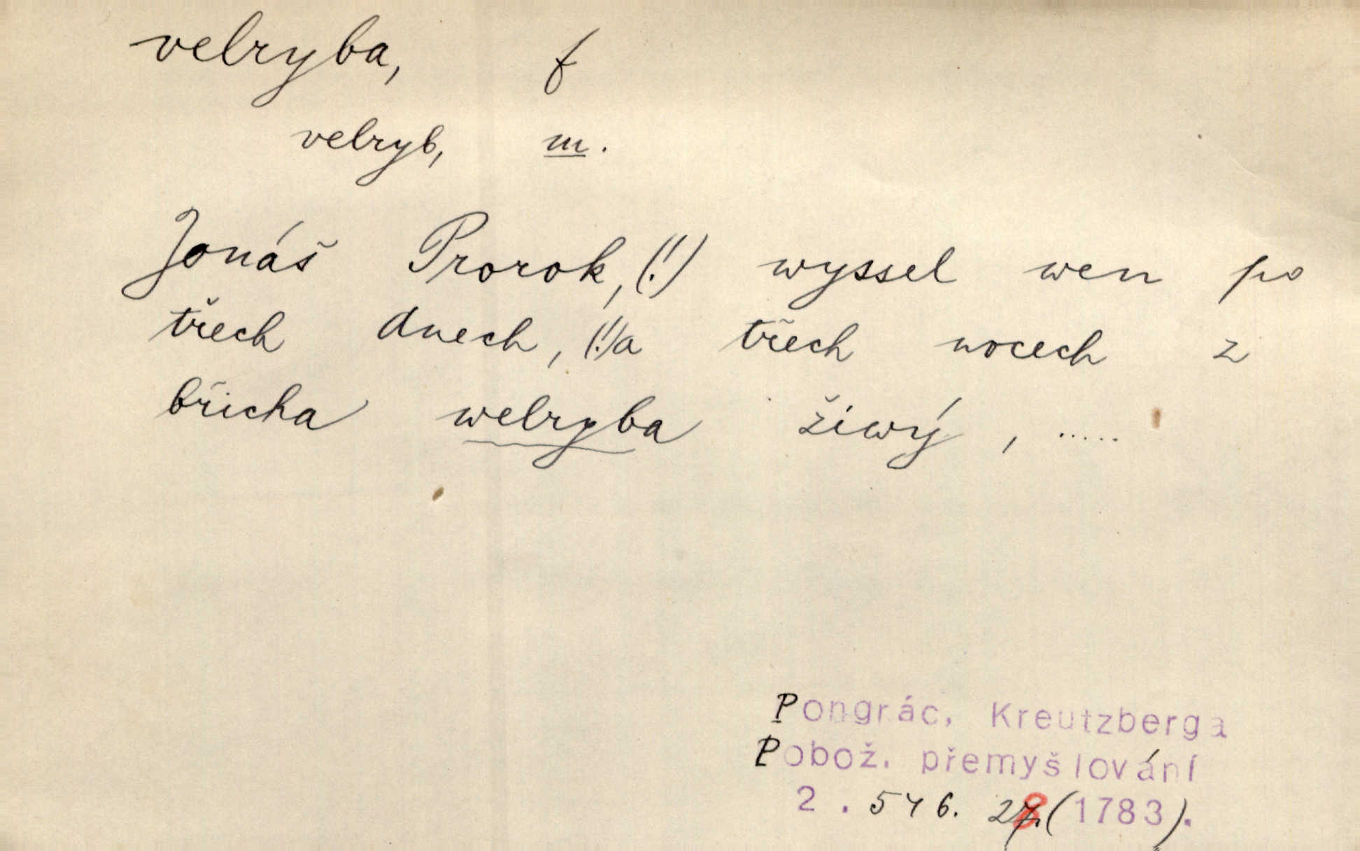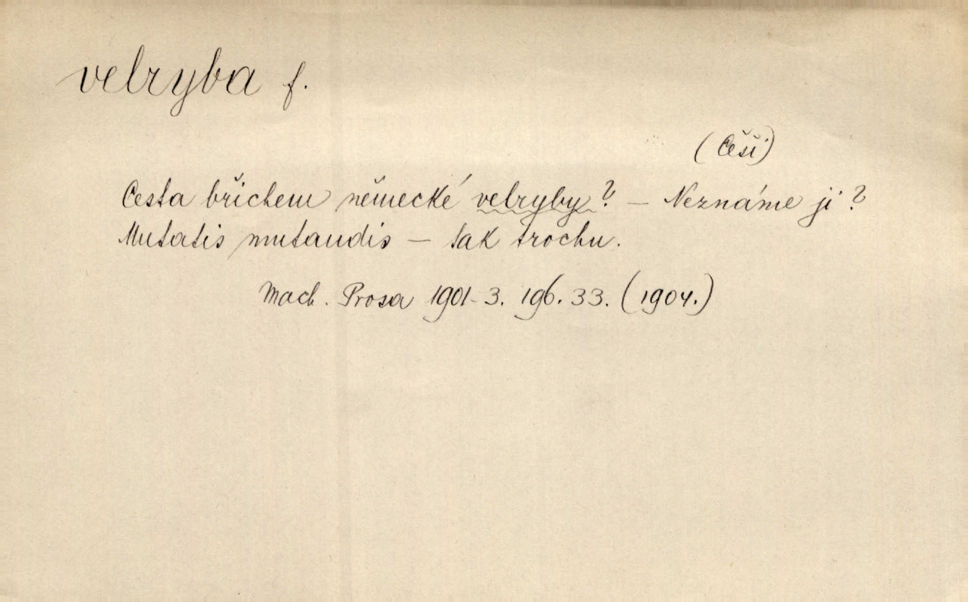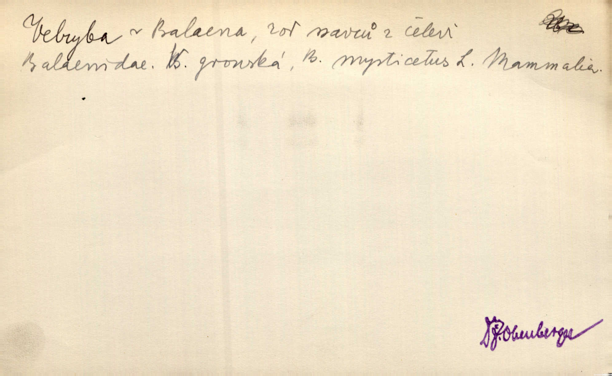 - velryba, -y f. velký mořský ssavec kytovitý. Zamířil do Gronska, kde se oddal lovu velryb a tuleňů. Herrm. Nad ním ve vzduchu orel plul, pod ním velryby pluly. Slád. Vždyť je ten ochlasta jako ta velryba Jonášova, jak živ nemá dost. Šmil. Přen. A temné vody německé autarkie sloužily výkrmu jen největších a nejkrutějších velryb mamutích průmyslových podniků. R. právo. Zool. rod ssavců z čeledi Balaenidae, Balaena; velryba gronská. Astron. Velryba souhvězdí jižní oblohy, Cetus.