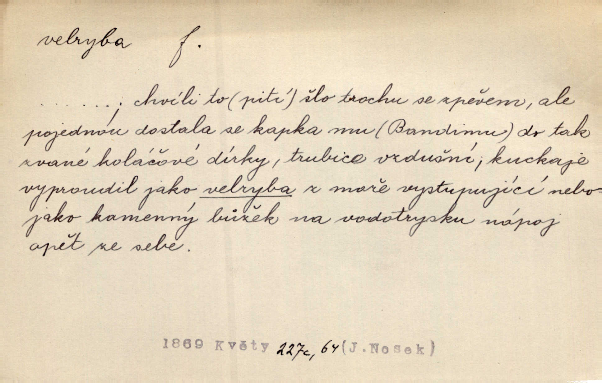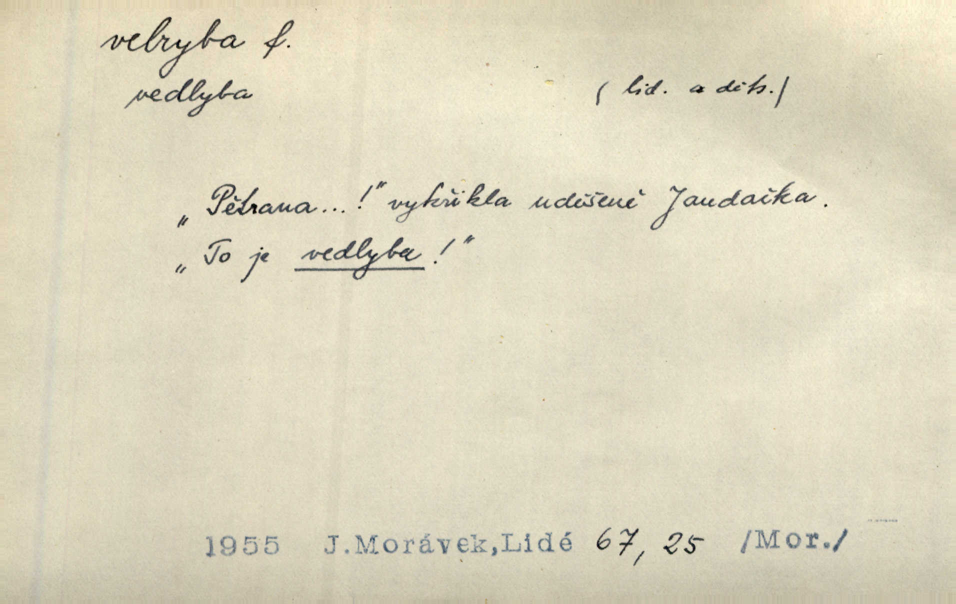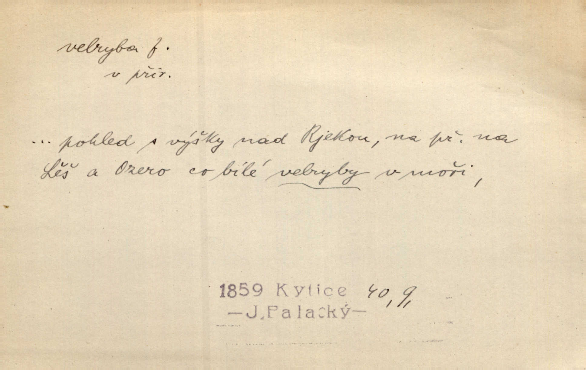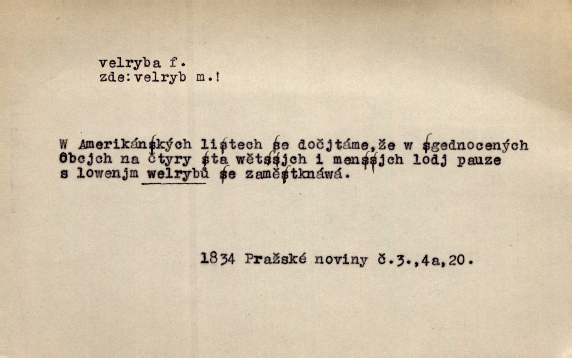 - velryba, -y f. velký mořský ssavec kytovitý. Zamířil do Gronska, kde se oddal lovu velryb a tuleňů. Herrm. Nad ním ve vzduchu orel plul, pod ním velryby pluly. Slád. Vždyť je ten ochlasta jako ta velryba Jonášova, jak živ nemá dost. Šmil. Přen. A temné vody německé autarkie sloužily výkrmu jen největších a nejkrutějších velryb mamutích průmyslových podniků. R. právo. Zool. rod ssavců z čeledi Balaenidae, Balaena; velryba gronská. Astron. Velryba souhvězdí jižní oblohy, Cetus.