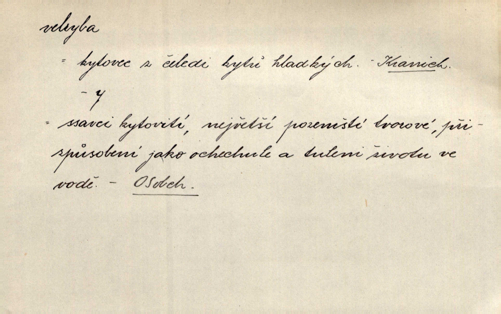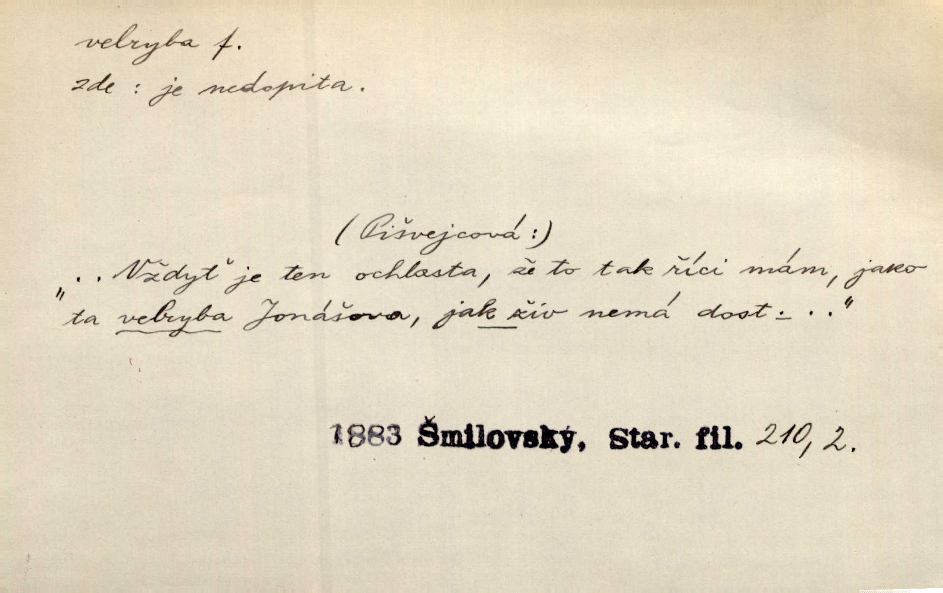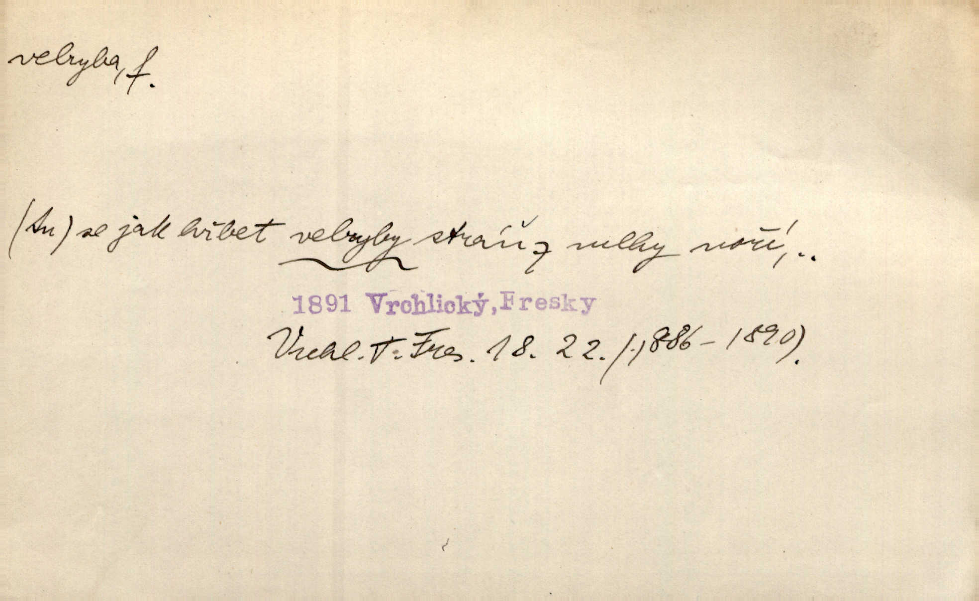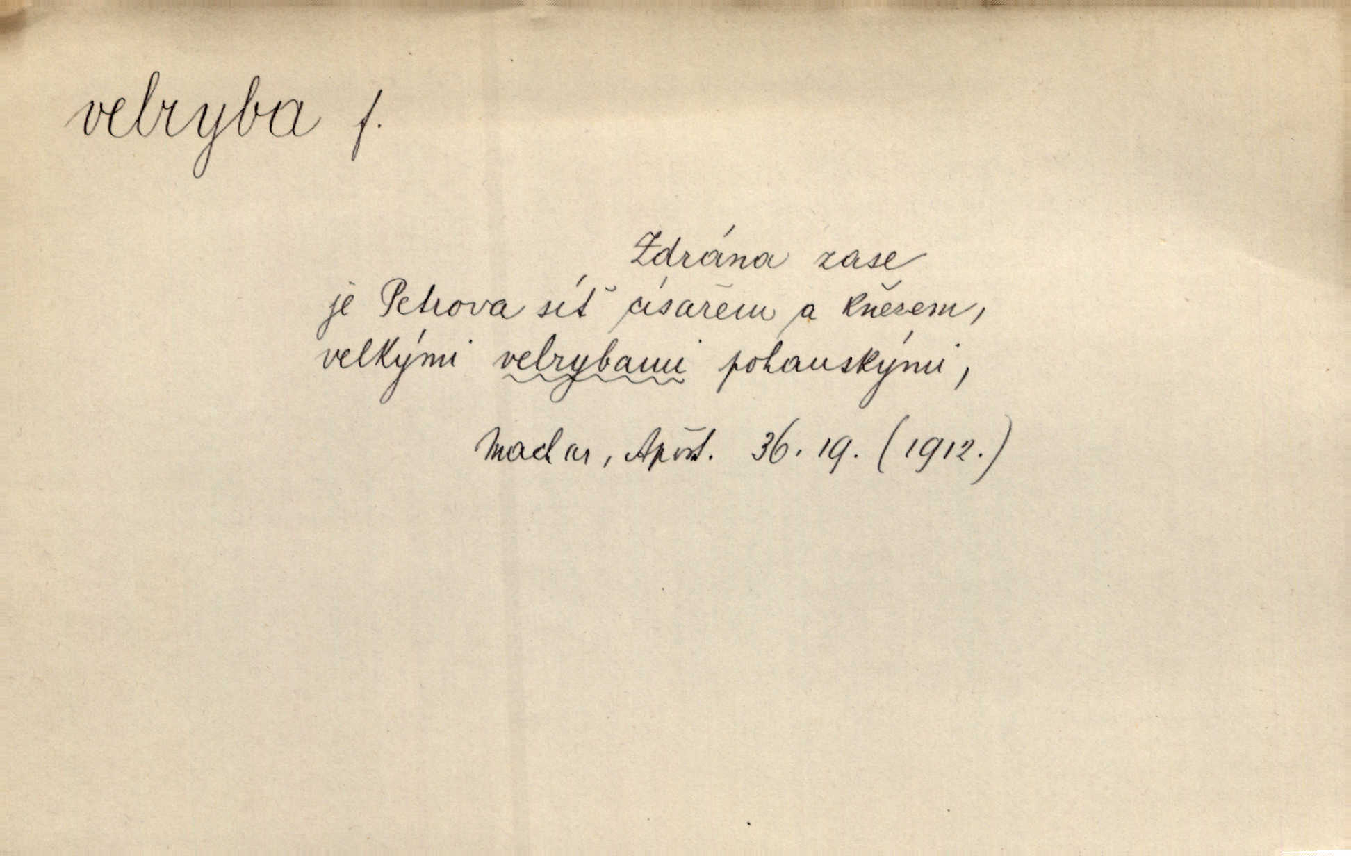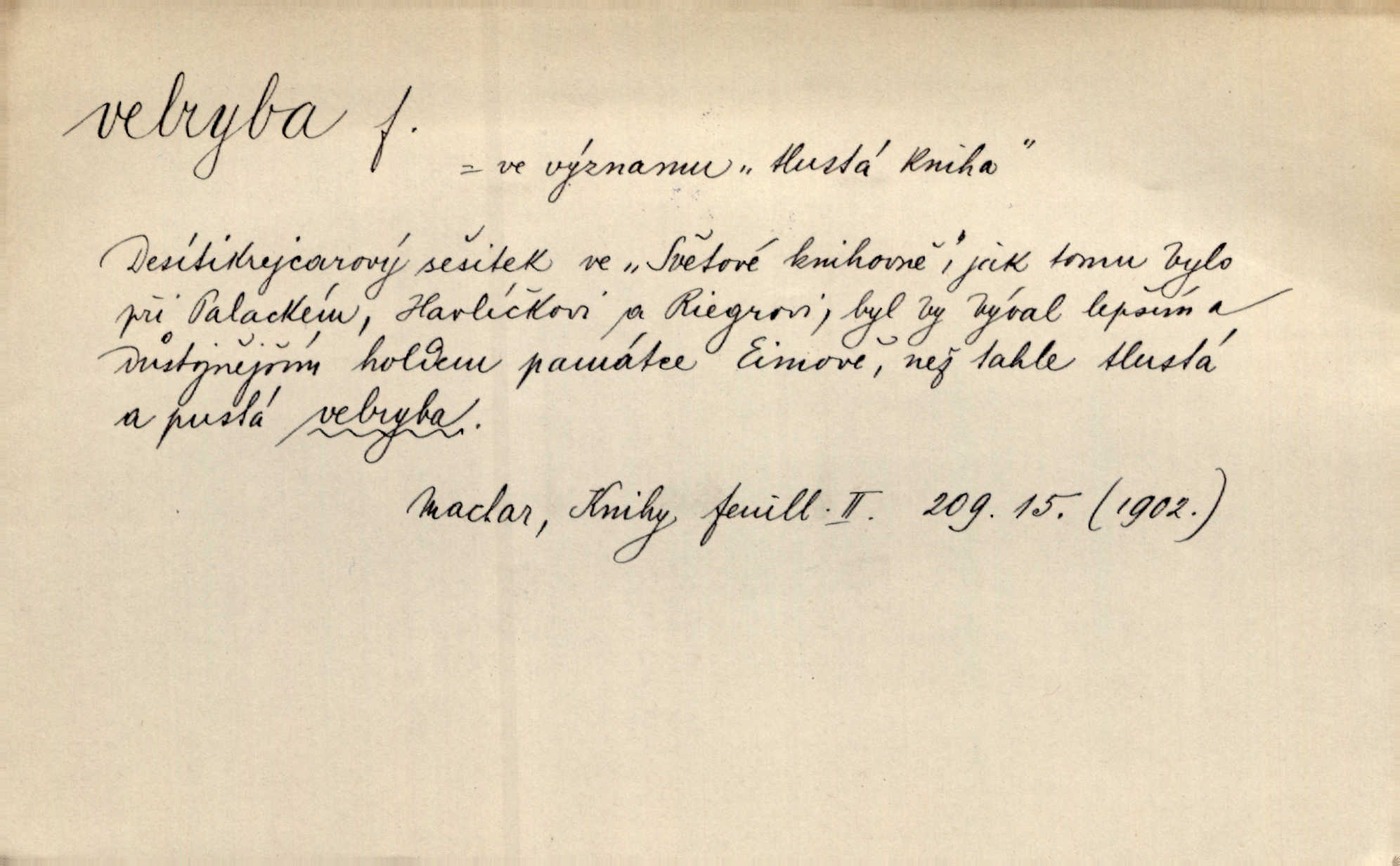 - velryba, -y f. velký mořský ssavec kytovitý. Zamířil do Gronska, kde se oddal lovu velryb a tuleňů. Herrm. Nad ním ve vzduchu orel plul, pod ním velryby pluly. Slád. Vždyť je ten ochlasta jako ta velryba Jonášova, jak živ nemá dost. Šmil. Přen. A temné vody německé autarkie sloužily výkrmu jen největších a nejkrutějších velryb mamutích průmyslových podniků. R. právo. Zool. rod ssavců z čeledi Balaenidae, Balaena; velryba gronská. Astron. Velryba souhvězdí jižní oblohy, Cetus.