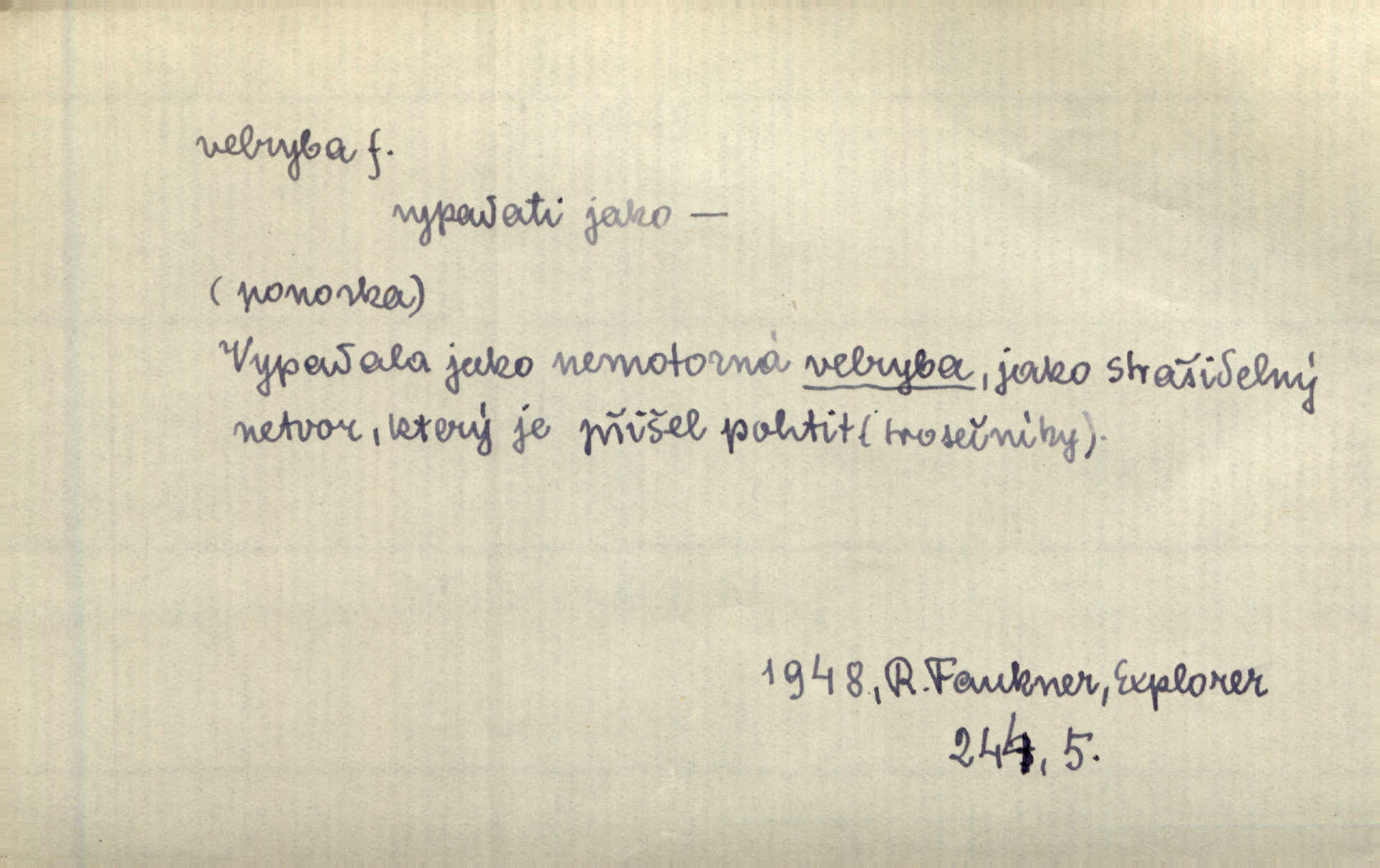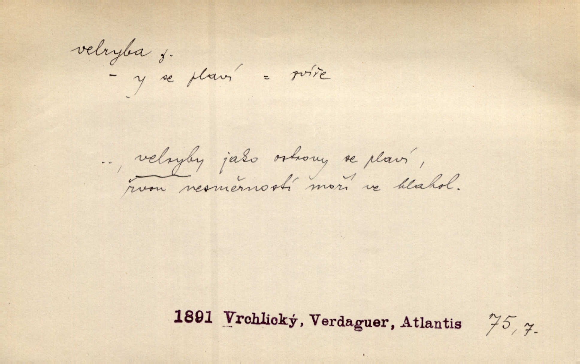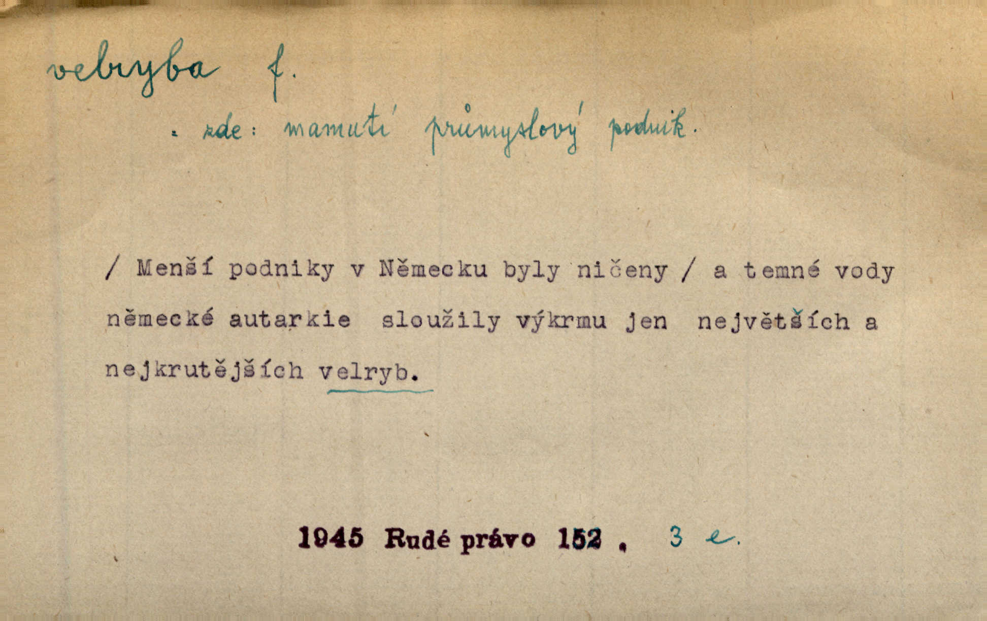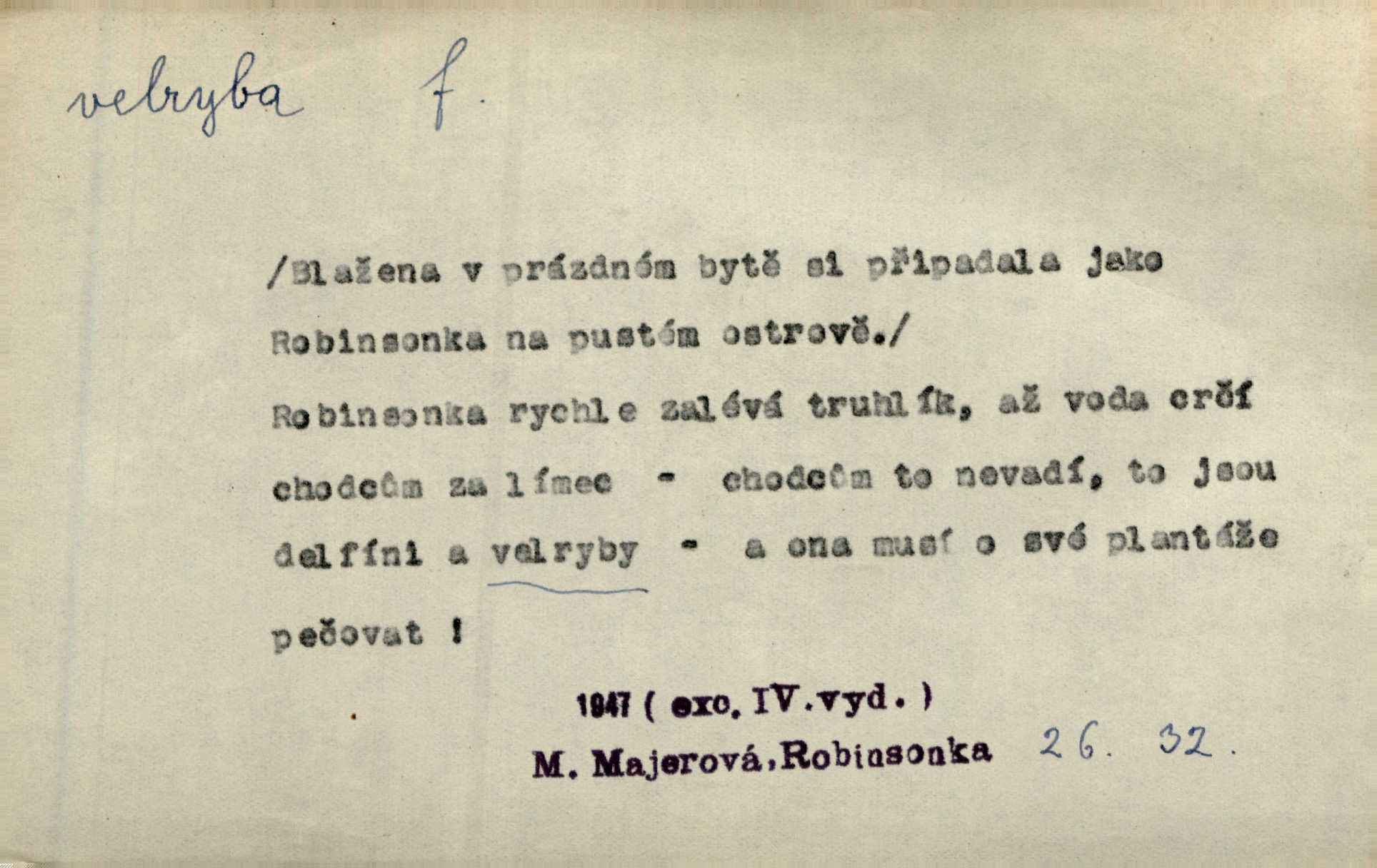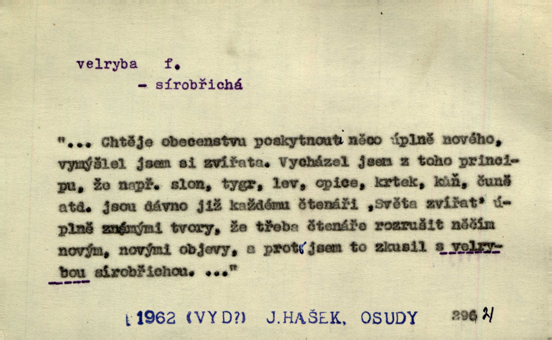 - velryba, -y f. velký mořský ssavec kytovitý. Zamířil do Gronska, kde se oddal lovu velryb a tuleňů. Herrm. Nad ním ve vzduchu orel plul, pod ním velryby pluly. Slád. Vždyť je ten ochlasta jako ta velryba Jonášova, jak živ nemá dost. Šmil. Přen. A temné vody německé autarkie sloužily výkrmu jen největších a nejkrutějších velryb mamutích průmyslových podniků. R. právo. Zool. rod ssavců z čeledi Balaenidae, Balaena; velryba gronská. Astron. Velryba souhvězdí jižní oblohy, Cetus.