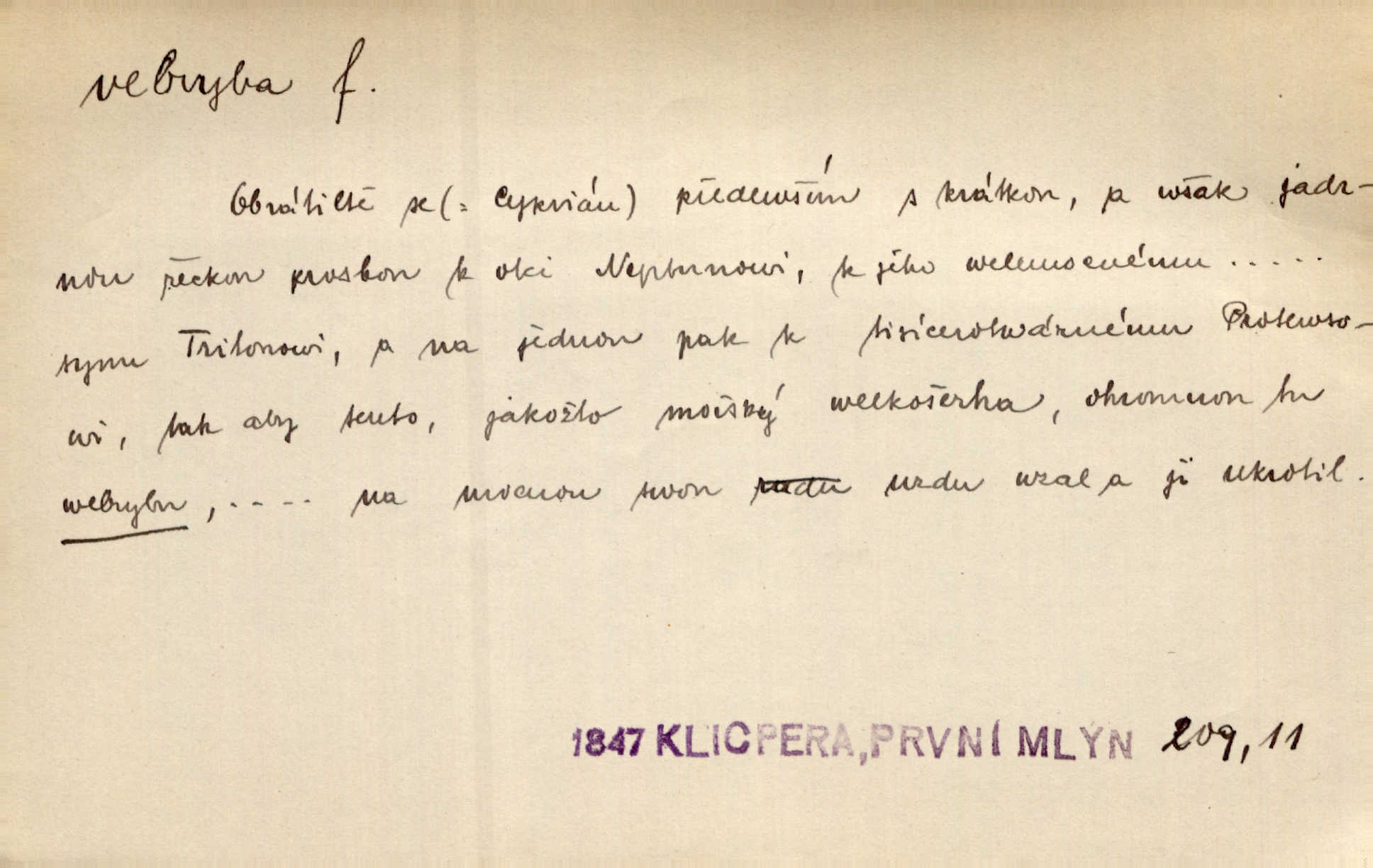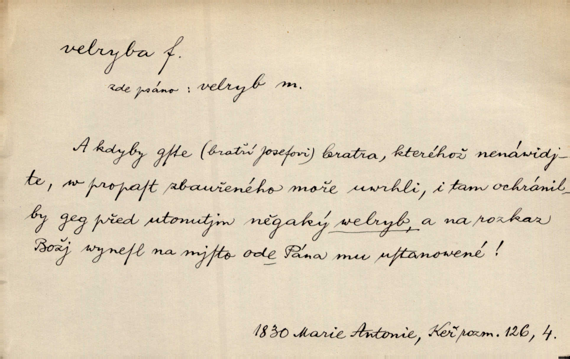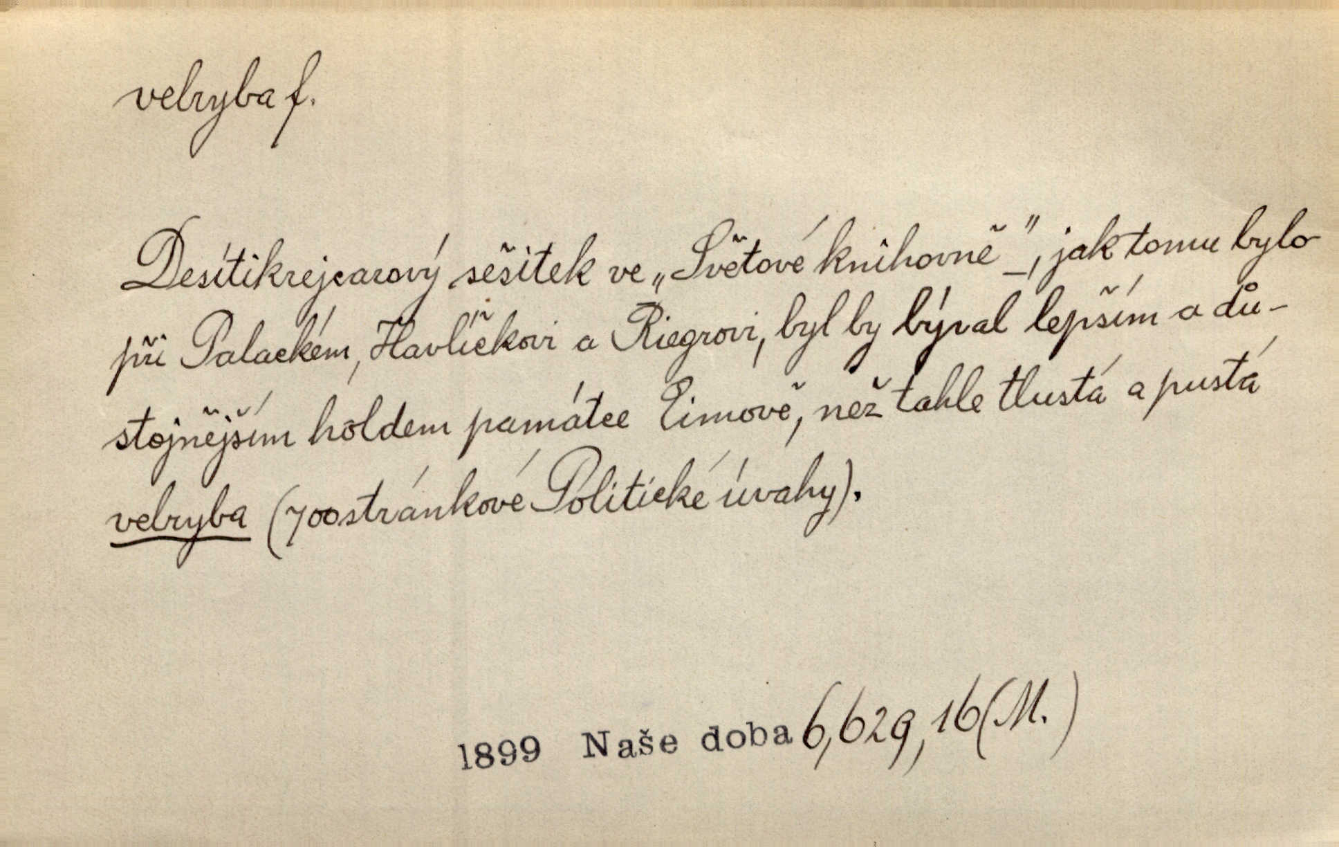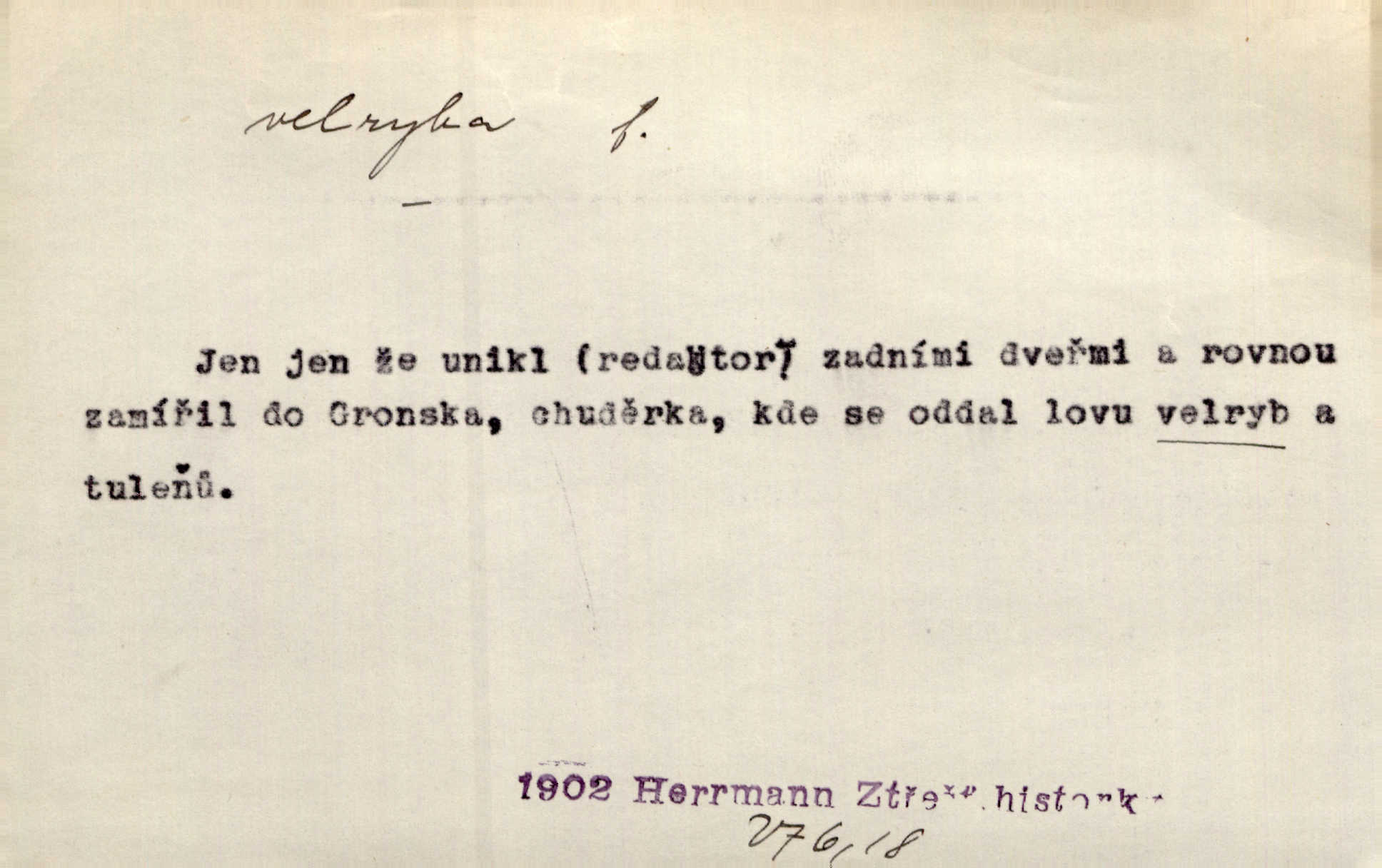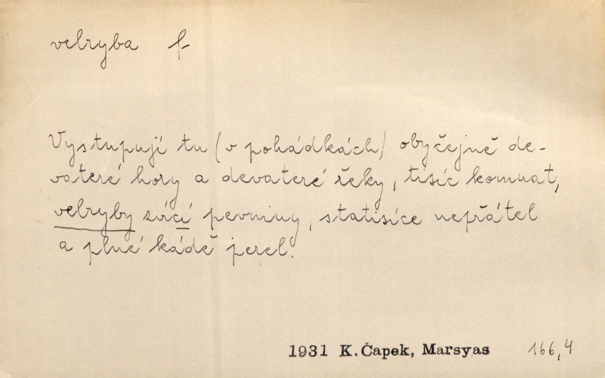 - velryba, -y f. velký mořský ssavec kytovitý. Zamířil do Gronska, kde se oddal lovu velryb a tuleňů. Herrm. Nad ním ve vzduchu orel plul, pod ním velryby pluly. Slád. Vždyť je ten ochlasta jako ta velryba Jonášova, jak živ nemá dost. Šmil. Přen. A temné vody německé autarkie sloužily výkrmu jen největších a nejkrutějších velryb mamutích průmyslových podniků. R. právo. Zool. rod ssavců z čeledi Balaenidae, Balaena; velryba gronská. Astron. Velryba souhvězdí jižní oblohy, Cetus.
