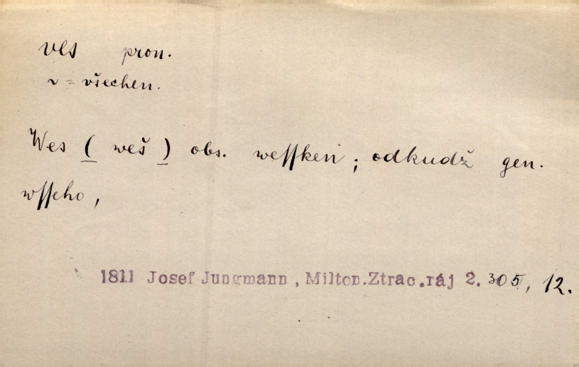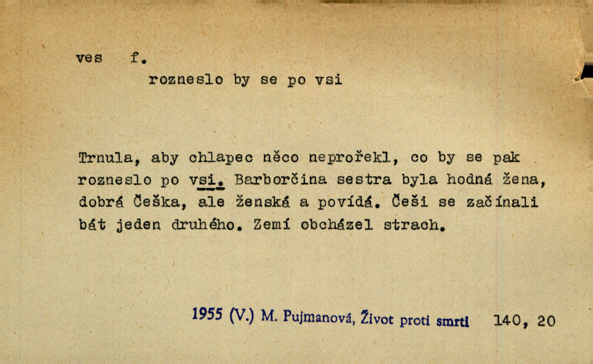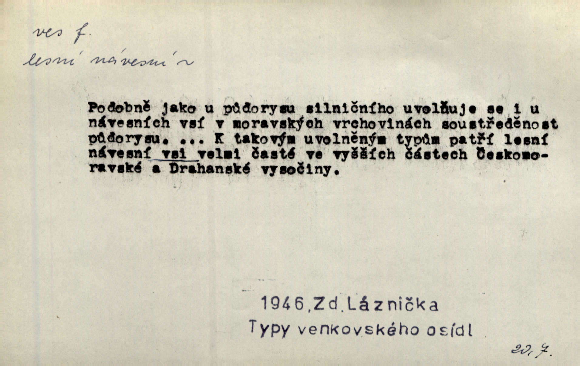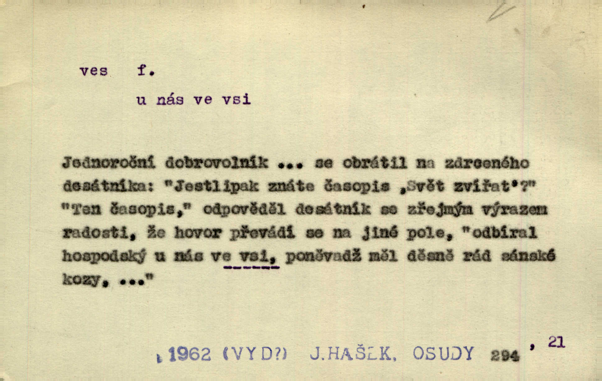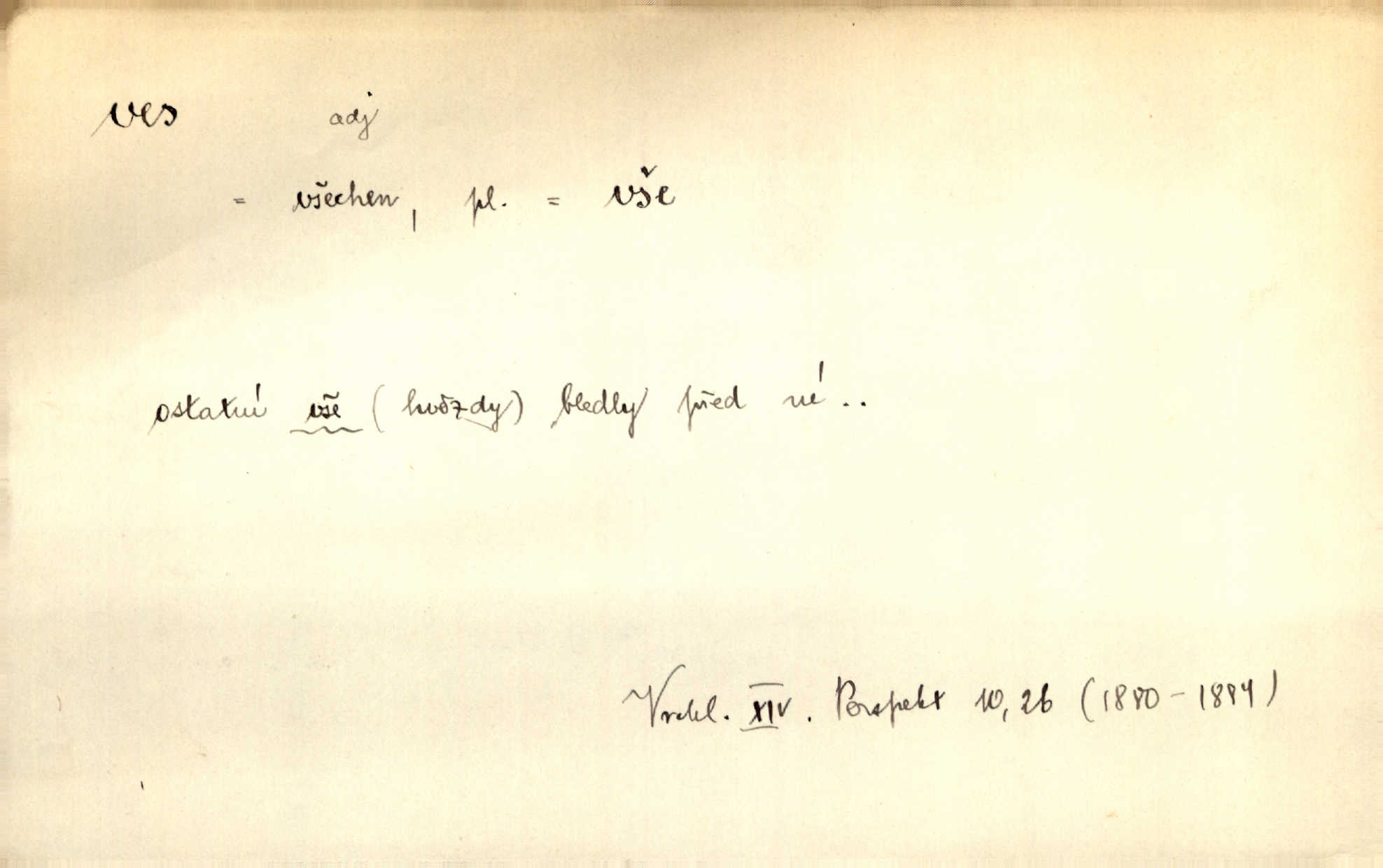 - ves, vsi f. (1. a 4. pl. vsi, 2. vsí, 3. vsím, 6. vsích, 7. vesnicemi) malá osada, mající většinou zemědělské obyvatelstvo, vesnice, dědina. Pan Ksásek byl přeložen do Kunčího, chudé horské vsi. John. Kroji tomu byla stařena věrna, co ze vsi do města přišla. Jir. Toho času leželi ve vsi myslivci. Něm. Psi houfem ve vsi zavyli, když ty pocestné zvětřili. Erb. Když vjížděl do vsi, byla jako vymřelá. Jir. Celá ves byla na nohou obyvatelé vsi. Šmil. Celá ves se dře po polích. Baar. Kouká, jak by chtěla devět vsí vypálit zamračeně, rozzlobeně. Něm. Žehravost byla nám španělskou vsí zcela cizí, neznámá. Šmil. Nábytku tu bylo všude vše plno, ale skorem o všech kusech platilo pořekadlo „každý pes jiná ves“ nic se k sobě nehodilo. Kos. D Dial. část obce, kde jsou pouze statky. Do nedávna bývaly vesnice, kdež stály selské statky („ve vsi“) a chalupy také („v chalupách“). Jir.