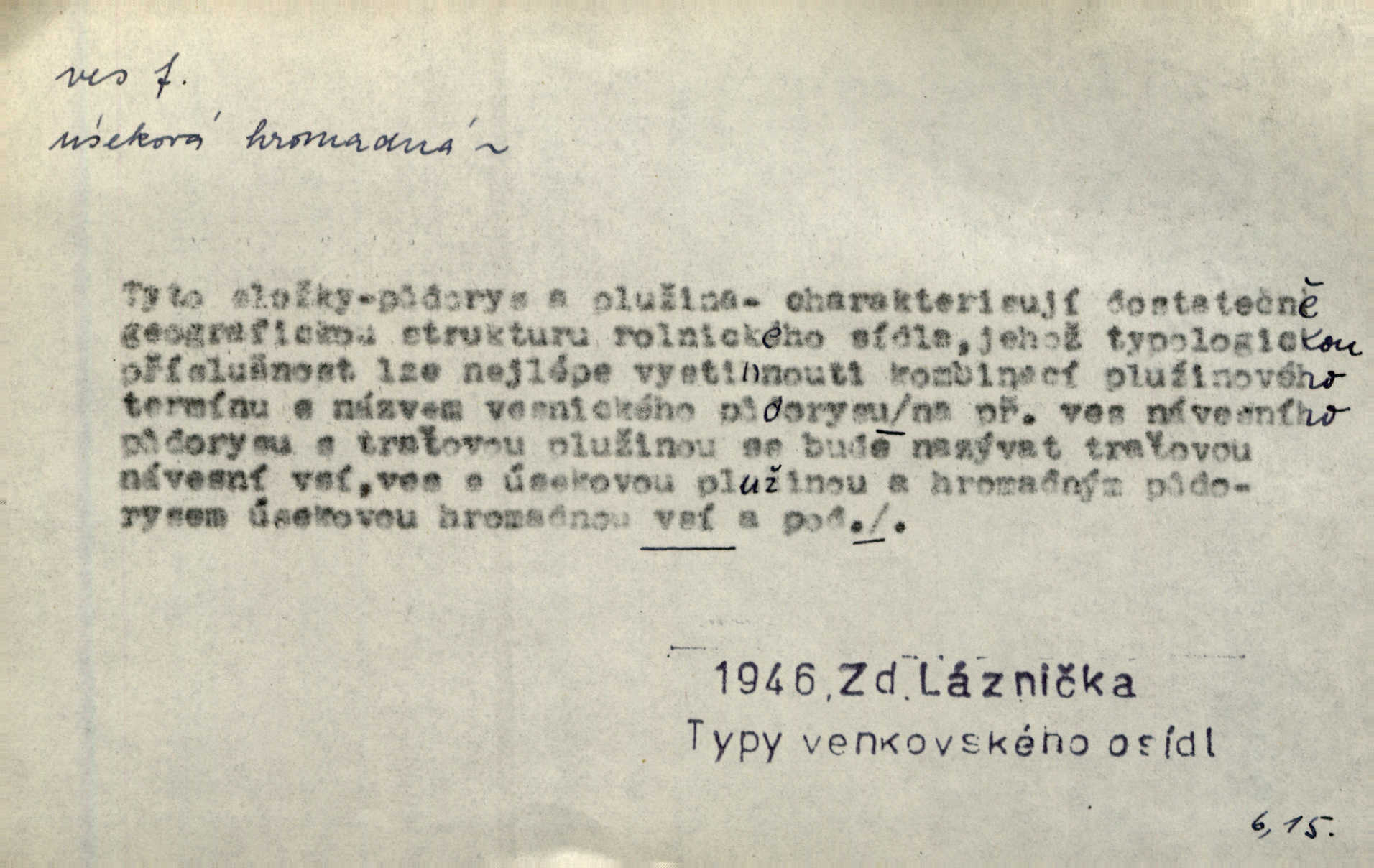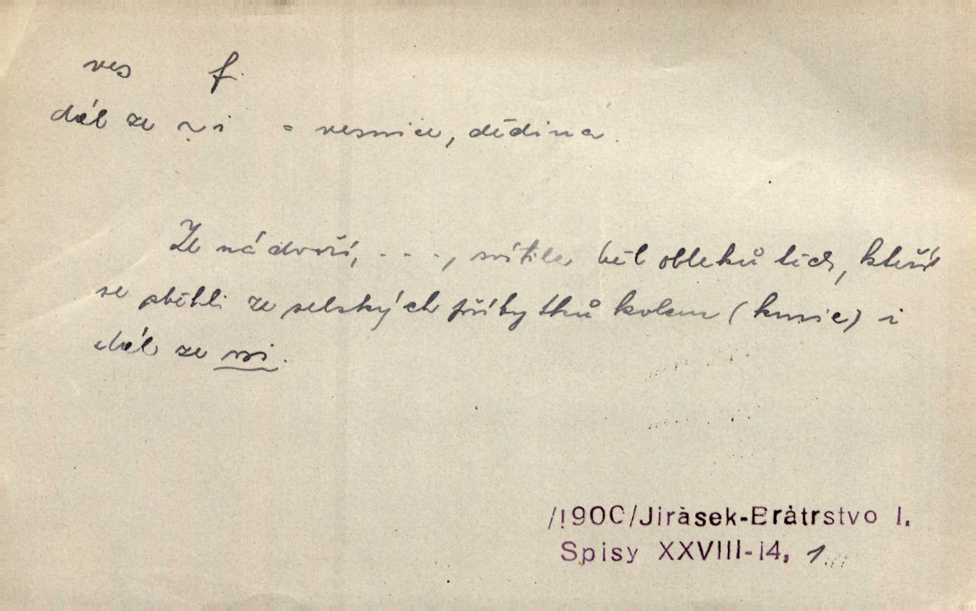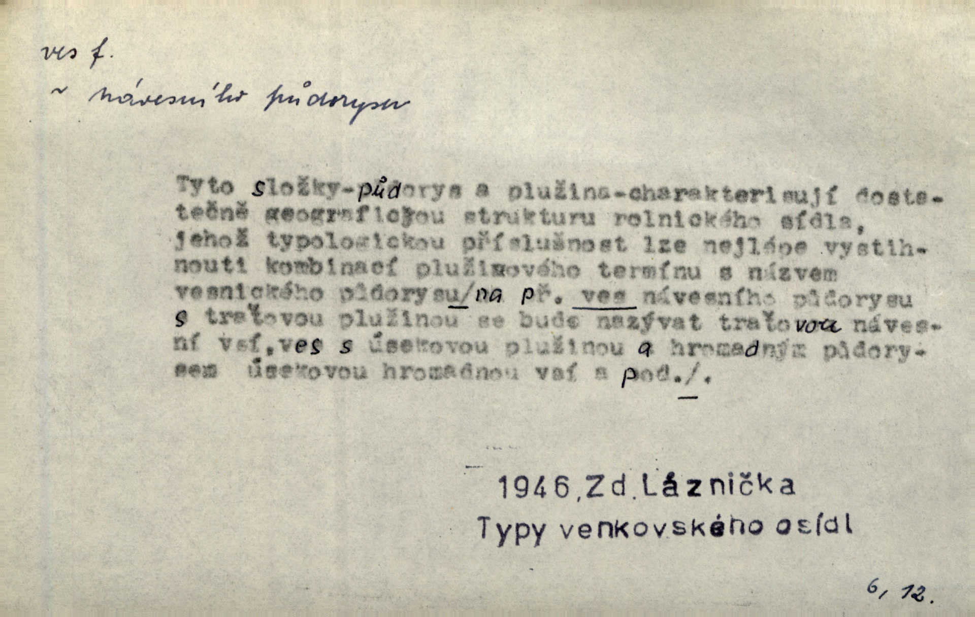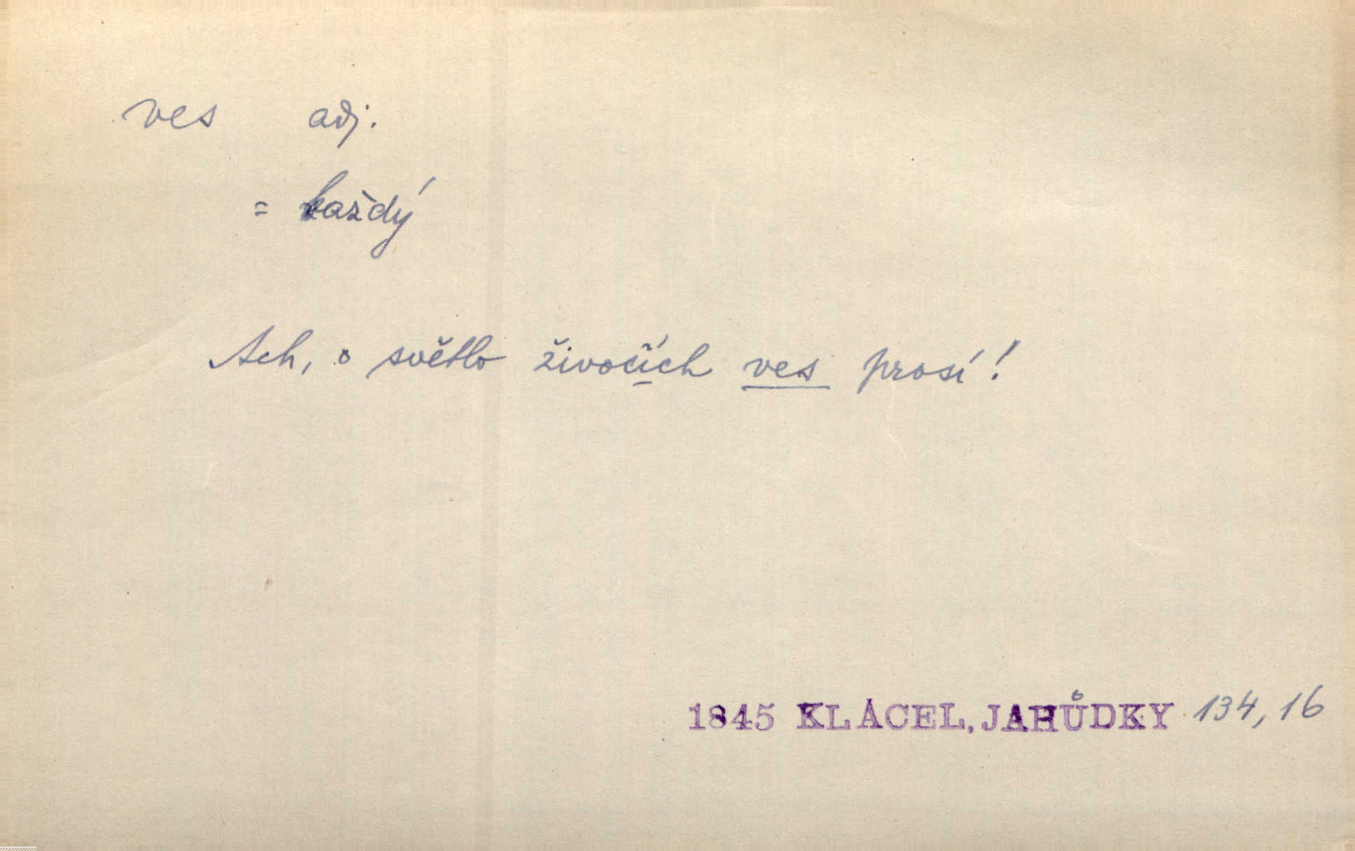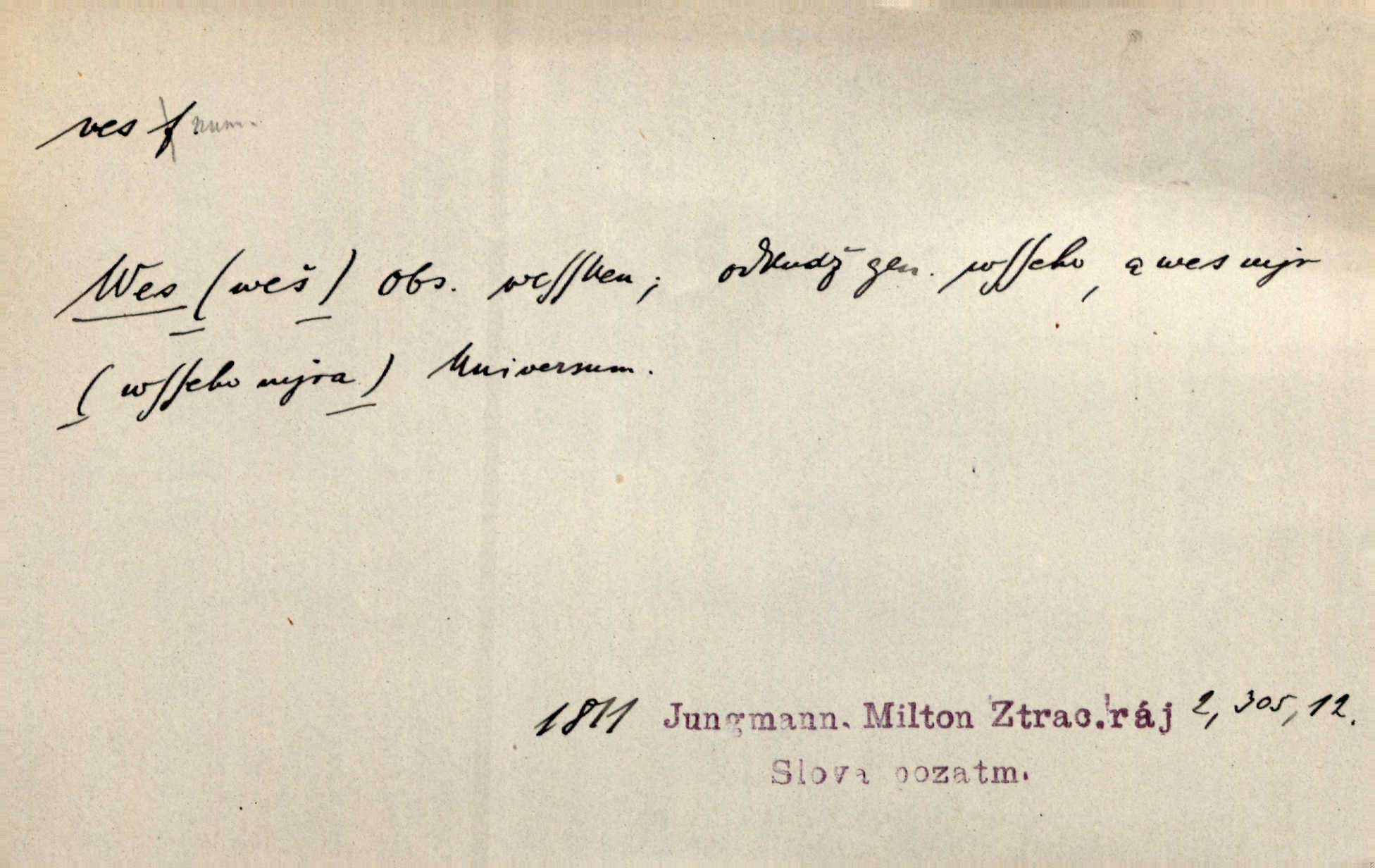 - ves, vsi f. (1. a 4. pl. vsi, 2. vsí, 3. vsím, 6. vsích, 7. vesnicemi) malá osada, mající většinou zemědělské obyvatelstvo, vesnice, dědina. Pan Ksásek byl přeložen do Kunčího, chudé horské vsi. John. Kroji tomu byla stařena věrna, co ze vsi do města přišla. Jir. Toho času leželi ve vsi myslivci. Něm. Psi houfem ve vsi zavyli, když ty pocestné zvětřili. Erb. Když vjížděl do vsi, byla jako vymřelá. Jir. Celá ves byla na nohou obyvatelé vsi. Šmil. Celá ves se dře po polích. Baar. Kouká, jak by chtěla devět vsí vypálit zamračeně, rozzlobeně. Něm. Žehravost byla nám španělskou vsí zcela cizí, neznámá. Šmil. Nábytku tu bylo všude vše plno, ale skorem o všech kusech platilo pořekadlo „každý pes jiná ves“ nic se k sobě nehodilo. Kos. D Dial. část obce, kde jsou pouze statky. Do nedávna bývaly vesnice, kdež stály selské statky („ve vsi“) a chalupy také („v chalupách“). Jir.