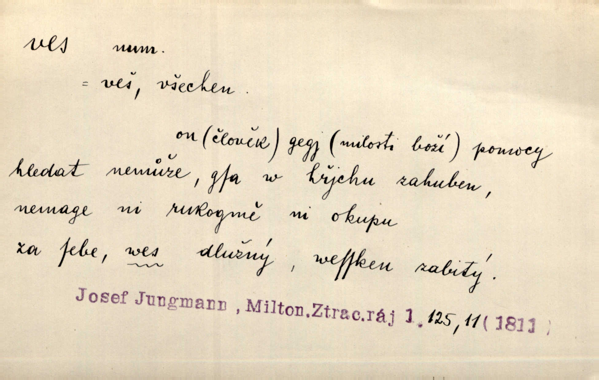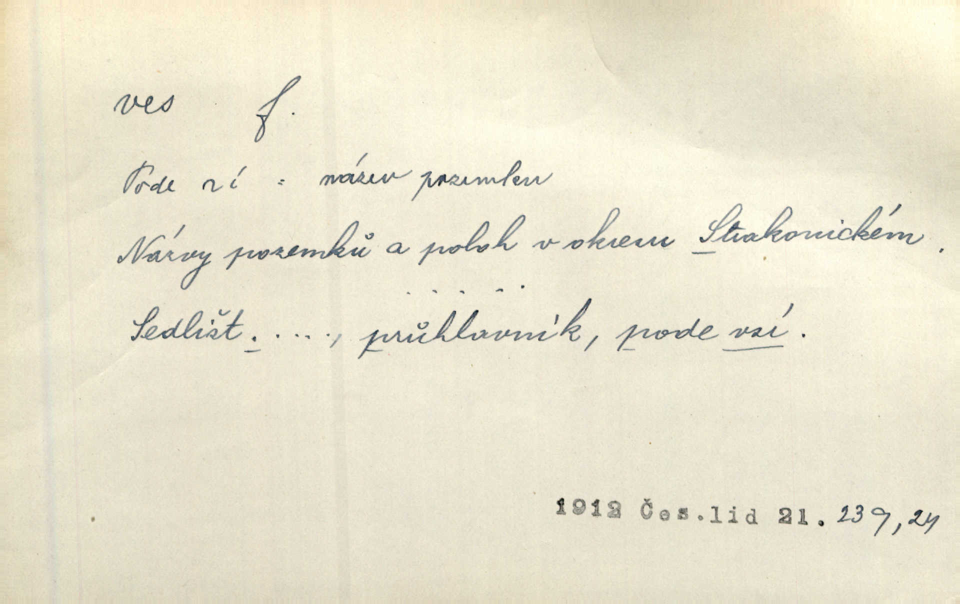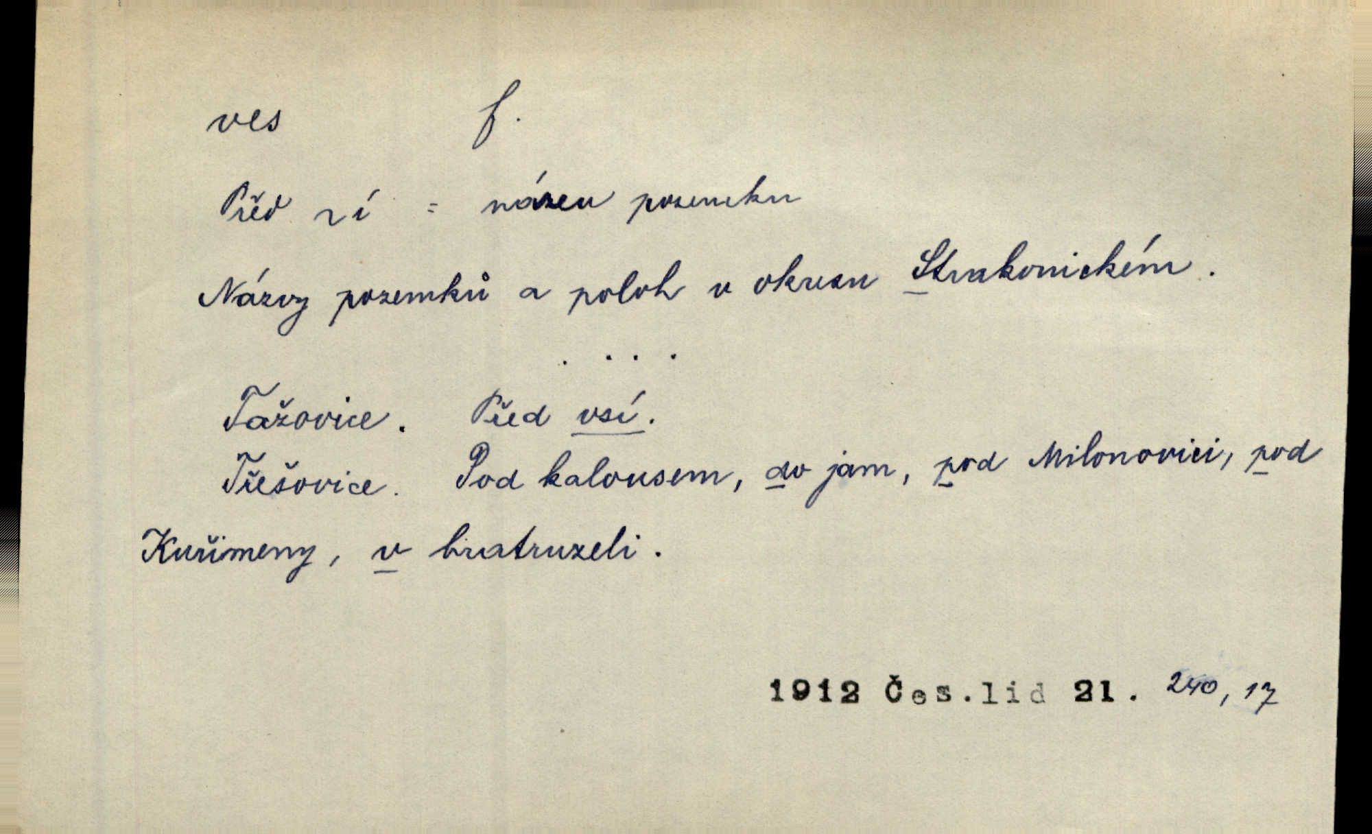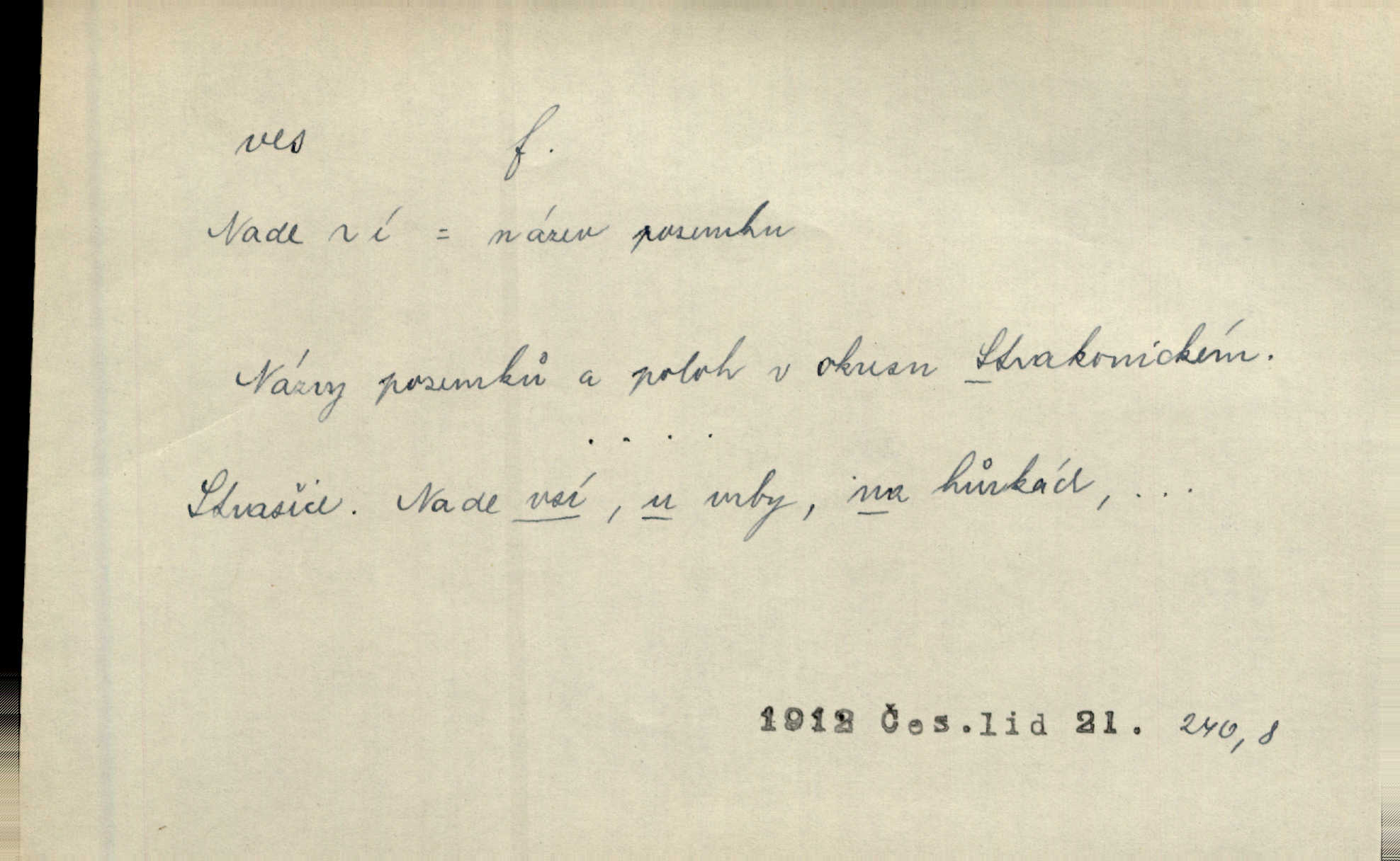 - ves, vsi f. (1. a 4. pl. vsi, 2. vsí, 3. vsím, 6. vsích, 7. vesnicemi) malá osada, mající většinou zemědělské obyvatelstvo, vesnice, dědina. Pan Ksásek byl přeložen do Kunčího, chudé horské vsi. John. Kroji tomu byla stařena věrna, co ze vsi do města přišla. Jir. Toho času leželi ve vsi myslivci. Něm. Psi houfem ve vsi zavyli, když ty pocestné zvětřili. Erb. Když vjížděl do vsi, byla jako vymřelá. Jir. Celá ves byla na nohou obyvatelé vsi. Šmil. Celá ves se dře po polích. Baar. Kouká, jak by chtěla devět vsí vypálit zamračeně, rozzlobeně. Něm. Žehravost byla nám španělskou vsí zcela cizí, neznámá. Šmil. Nábytku tu bylo všude vše plno, ale skorem o všech kusech platilo pořekadlo „každý pes jiná ves“ nic se k sobě nehodilo. Kos. D Dial. část obce, kde jsou pouze statky. Do nedávna bývaly vesnice, kdež stály selské statky („ve vsi“) a chalupy také („v chalupách“). Jir.