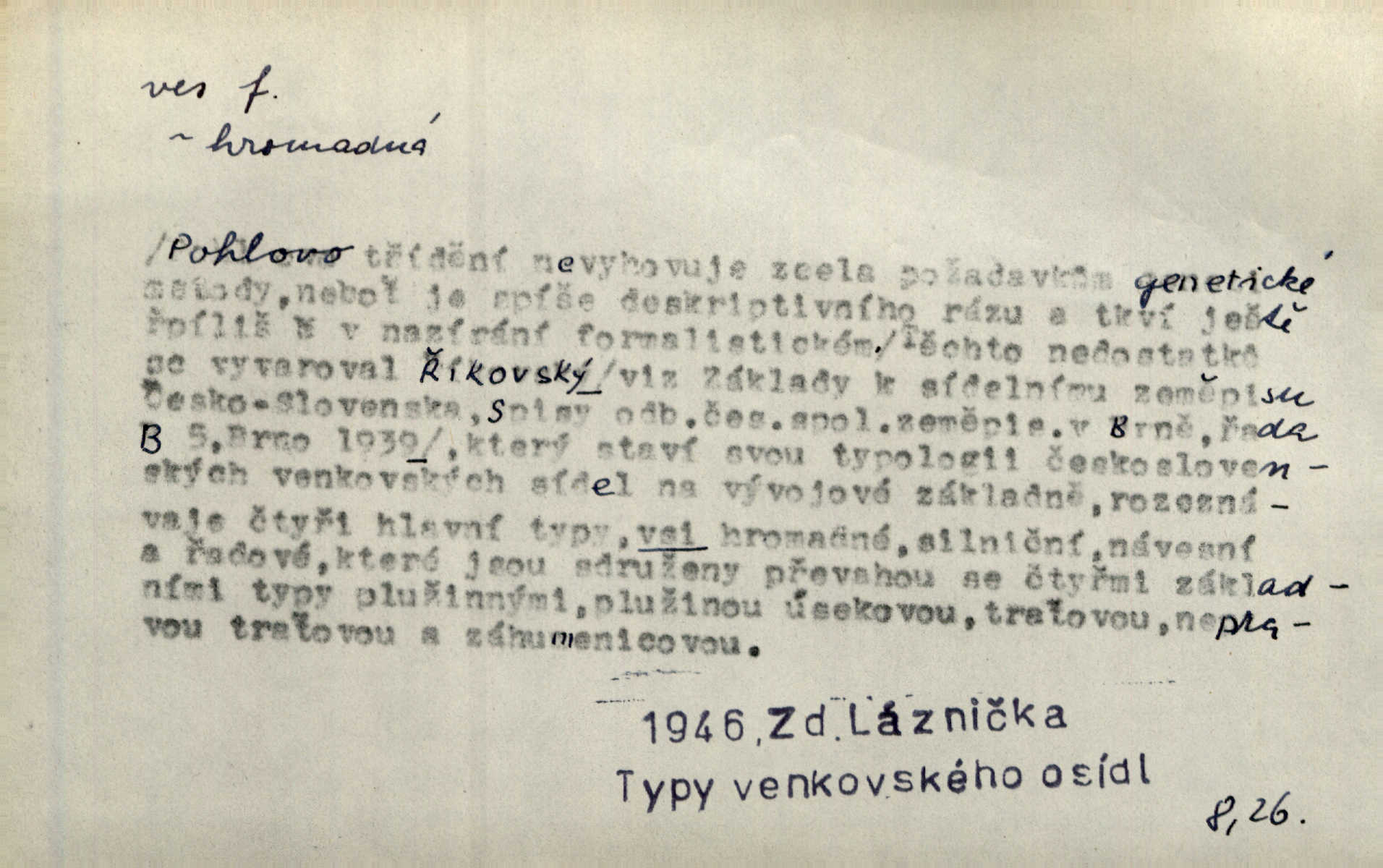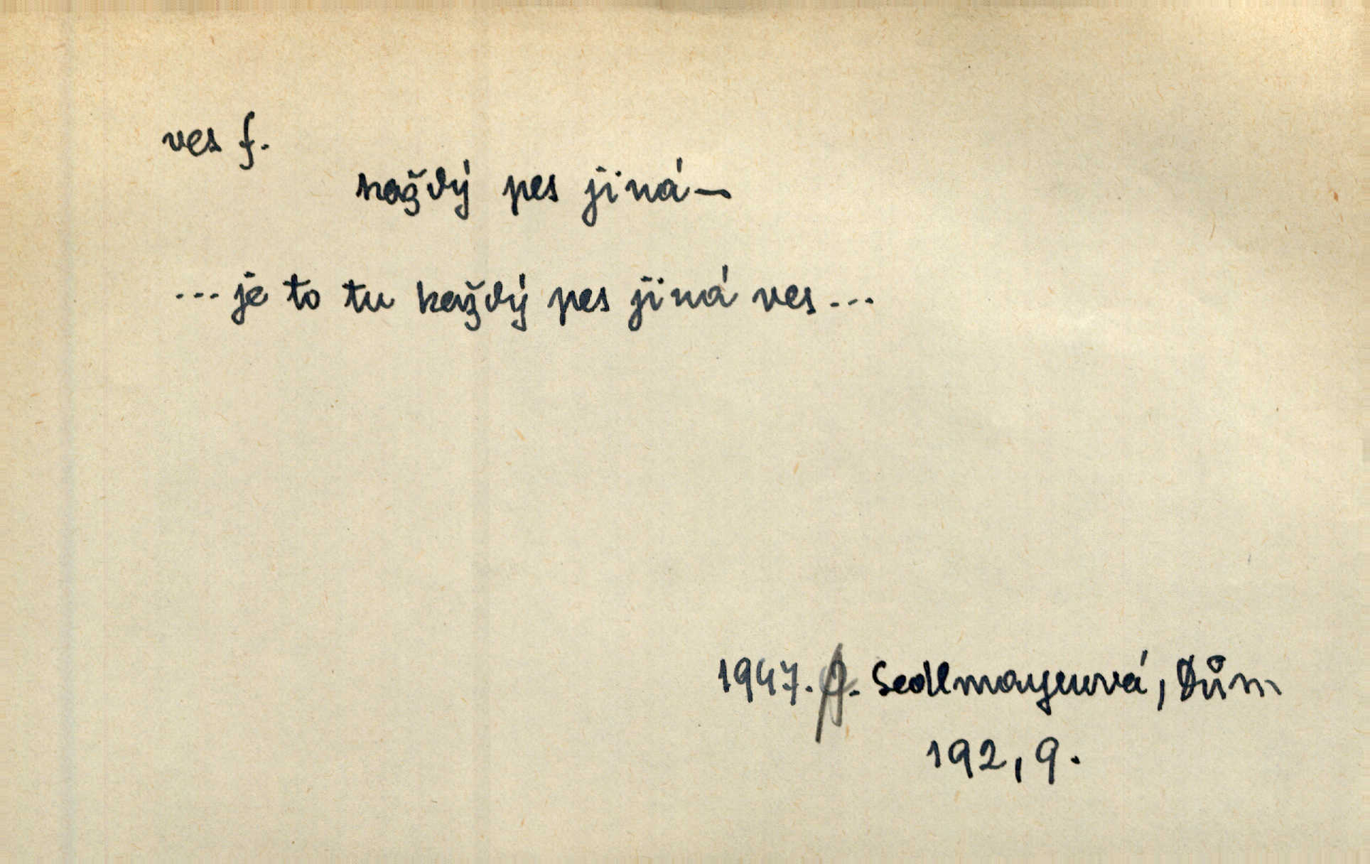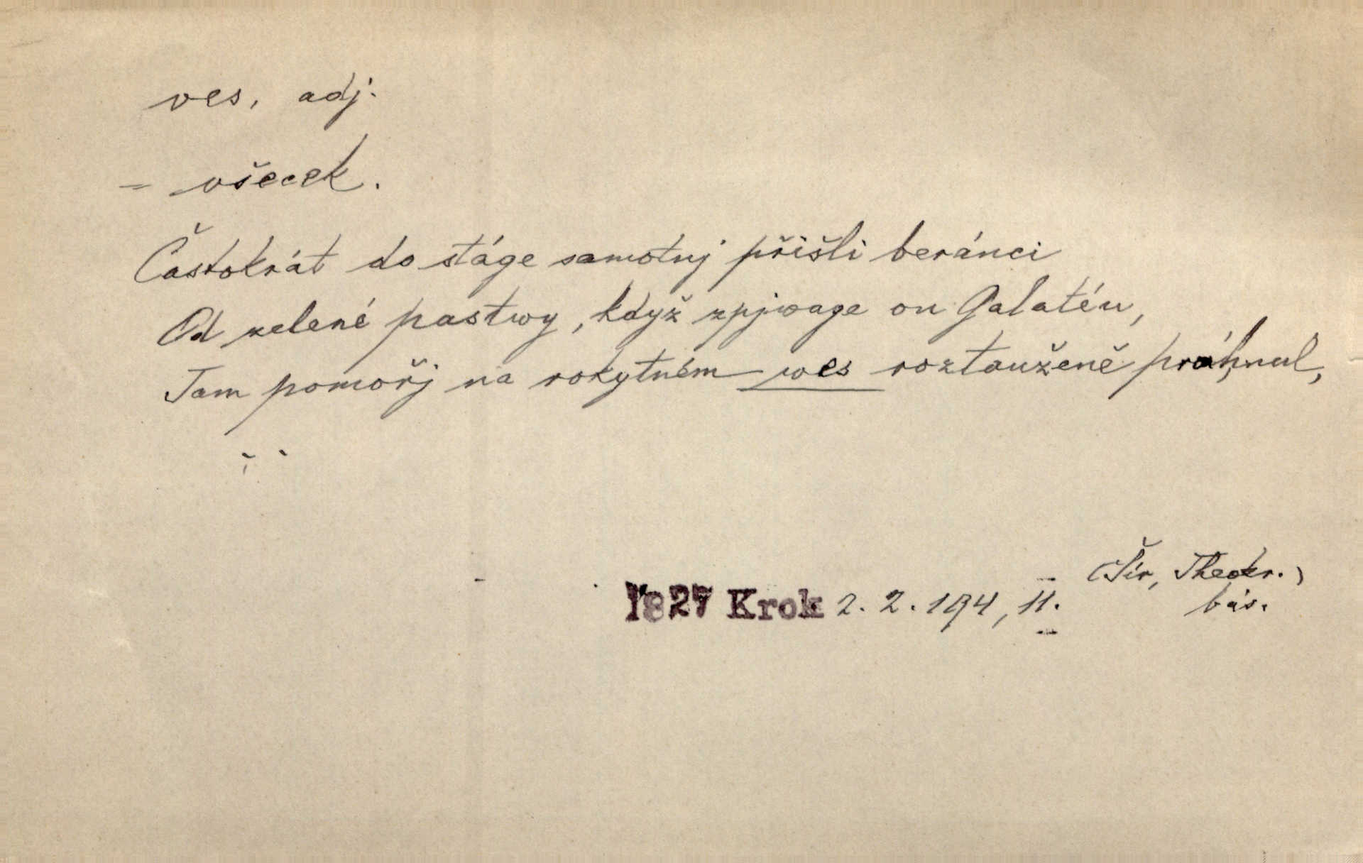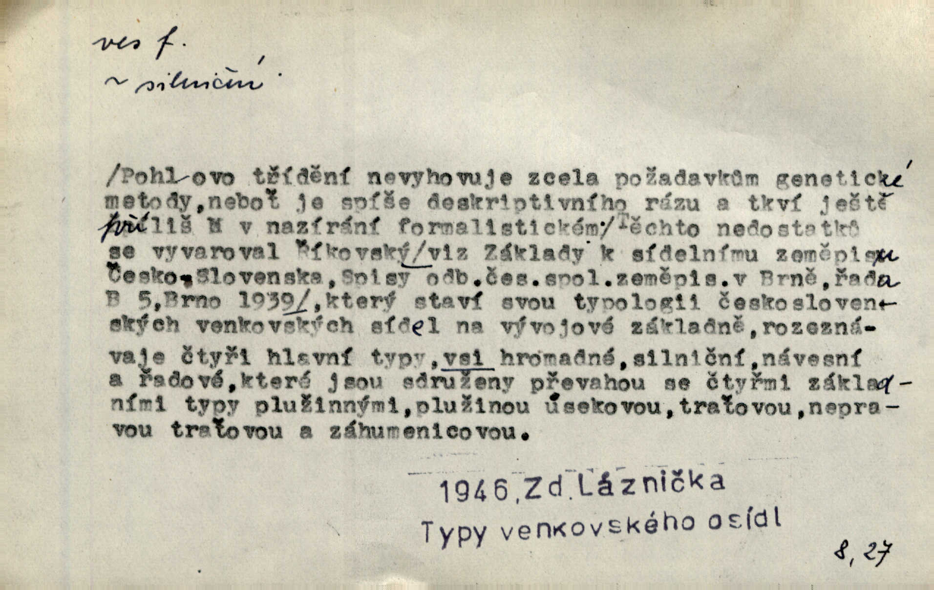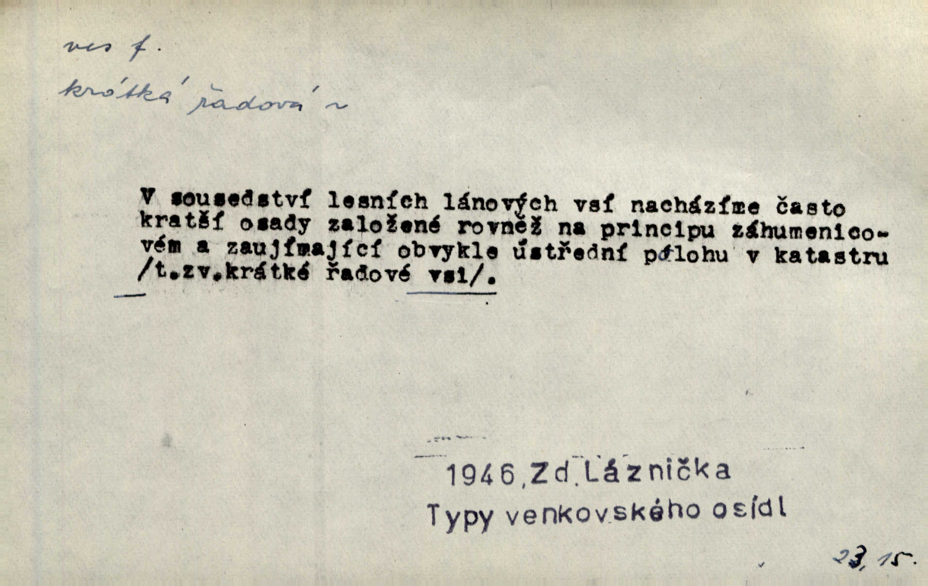 - ves, vsi f. (1. a 4. pl. vsi, 2. vsí, 3. vsím, 6. vsích, 7. vesnicemi) malá osada, mající většinou zemědělské obyvatelstvo, vesnice, dědina. Pan Ksásek byl přeložen do Kunčího, chudé horské vsi. John. Kroji tomu byla stařena věrna, co ze vsi do města přišla. Jir. Toho času leželi ve vsi myslivci. Něm. Psi houfem ve vsi zavyli, když ty pocestné zvětřili. Erb. Když vjížděl do vsi, byla jako vymřelá. Jir. Celá ves byla na nohou obyvatelé vsi. Šmil. Celá ves se dře po polích. Baar. Kouká, jak by chtěla devět vsí vypálit zamračeně, rozzlobeně. Něm. Žehravost byla nám španělskou vsí zcela cizí, neznámá. Šmil. Nábytku tu bylo všude vše plno, ale skorem o všech kusech platilo pořekadlo „každý pes jiná ves“ nic se k sobě nehodilo. Kos. D Dial. část obce, kde jsou pouze statky. Do nedávna bývaly vesnice, kdež stály selské statky („ve vsi“) a chalupy také („v chalupách“). Jir.