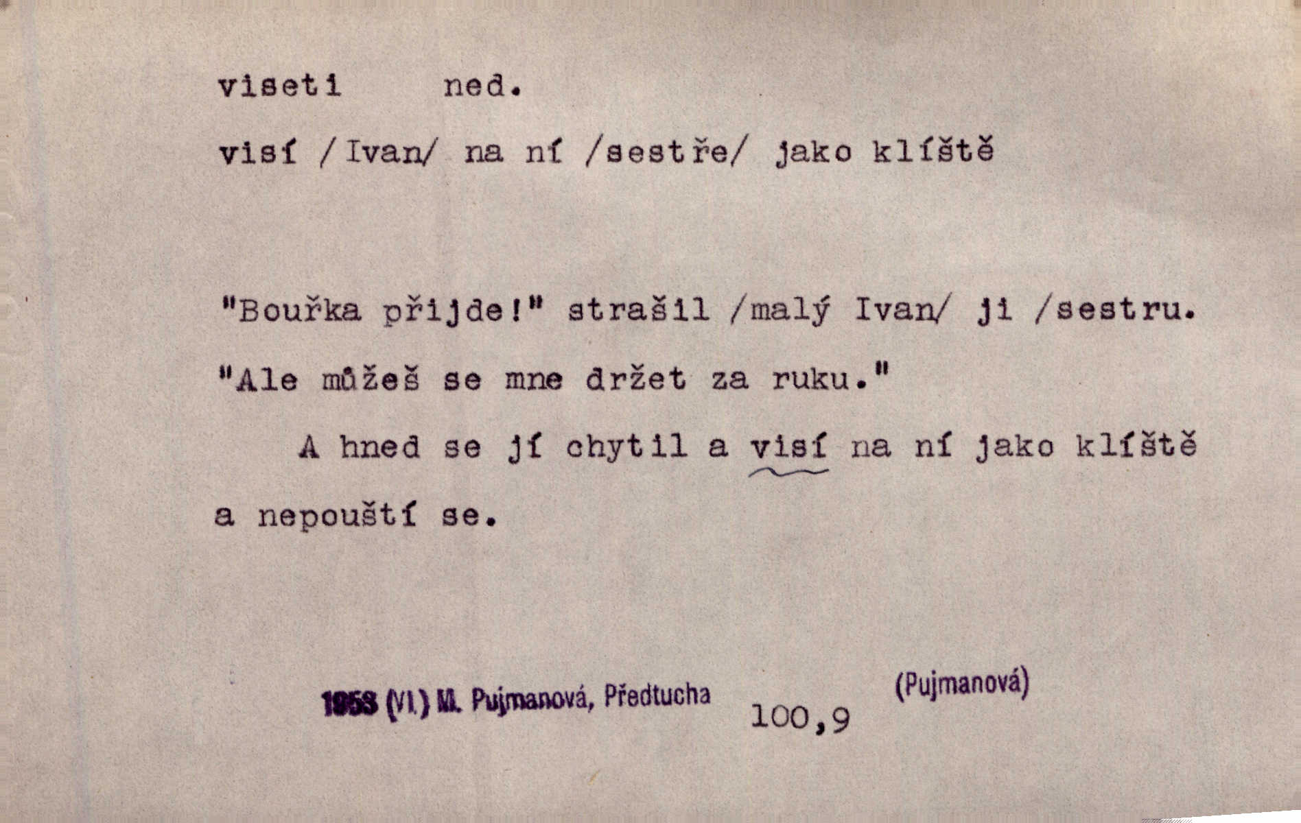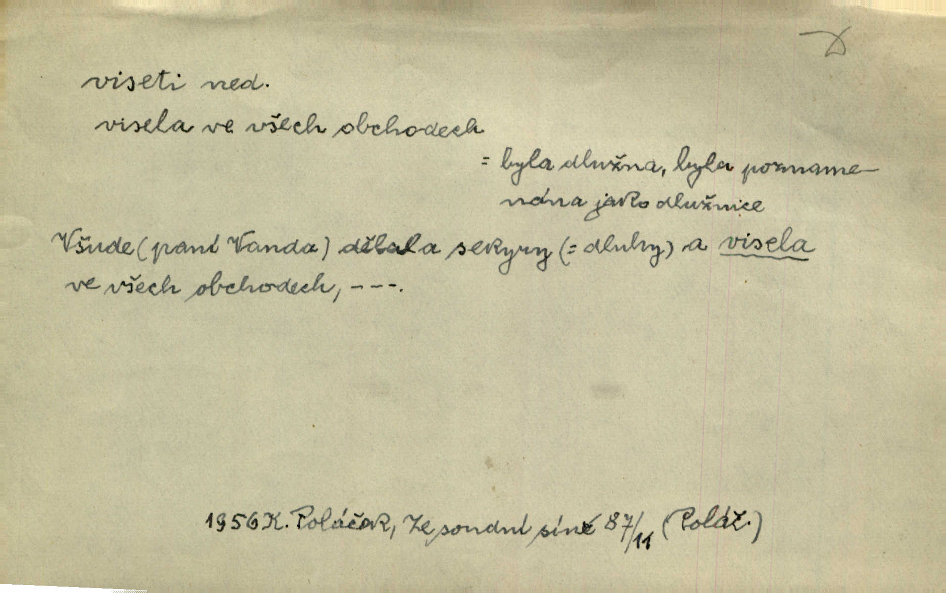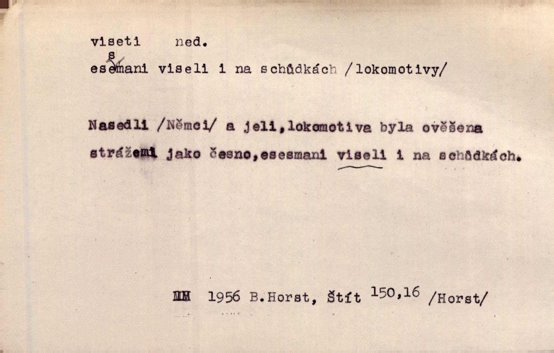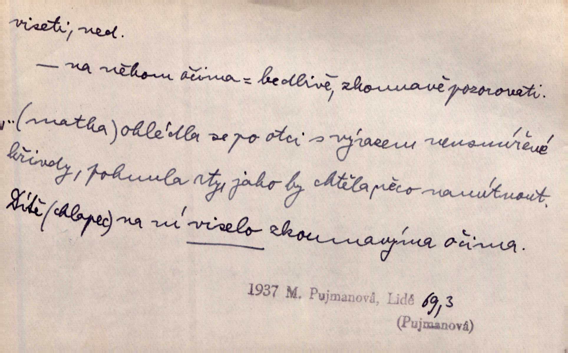 - viseti ned. býti zachycen, upevněn tak, že těžiště je pod místem upevnění. A nad ním zlatá lampa visí. Vrch. Z kapsy visel řetízek hodinek. Just. Kytara visela na krku. Rub. Komediant zazvonil velkým zvonem, který mu visel od pasu. Svět. Na levé ruce visel jí košík. Šmil. Dokončil převlek do svého občanského šatu v jeho klubovní skříni od včerejška visícího. Čap. Ch. Vzadu visel mu cop s mašlí. Něm. Podlé všeho nejsou tyto dvéře nové. Visí špatně v zámku. Pfleg. Mezkovi smekla se noha a již visel zadní částí těla nad propastí. Lum. Starý Božek visel ve větvích a sbíraje housenky, s hůry dolů cenil křivé svoje zuby. V. Mrš. Jedním skokem viseli oba chlapci otci na krku. Svět. Služby nevisí na hřebíčku nenajdou se snadno. Jah. A což nevisí ještě každým dnem nad naší hlavou Damoklův meč nehrozí. Marx-Štoll. Život její visel jen na jediné tenounké nitce byl ve velkém nebezpečí. Svět. Nejeden z těch pánů, kteří jsou dnes slavní, visel před lety u nás na černé tabuli byl dlužen. Ben. Žert. Už, prosím, visíme na Staroměstské radnici! máme ohlášky. Švan. D vůbec býti ve svislé, skleslé poloze. Netečně nyní visely mu ruce. Svob. Brada visí na prsa. Ner. Dlaní hladil si široký obličej visících vrásčitých tváří. Rais. S koutků úst visí cigareta. Poláč. Jak mdle se klonila kupředu, kterak visel oděv na její jindy tak plné postavě. Svět. D přečnívati, pnouti se nad něčím. Zasedl jsem s drahým svým přítelem na verandě kolem zámku nad mořem visící. Ner. Nad příbojem, kde visí skála holá, dlí pěvec zamyšlen a k živlům volá. Krás. D býti oběšen. Ty, chlape, budeš viset. Vanč. Chci viset, jestliže kýs arcipadouch nevymyslil si tu pomluvu. Slád. Jestli ta je pravá, tak ať visím (v důrazném ujištění). Hoffm. D (nad čím) vznášeti se nehybně nad něčím, v něčem. Nad pasekou v modru nebes nehybně visí krahujec. J. Šulc. Mračno viselo nad plochou krajinou. Vanč. Byl chladný večer, mlha visela s nebe. Zey. Sníh ležel všude, nebe šedivé nad černým hvozdem viselo. Zey. Zářijové slunce viselo na bleděmodré, bezmračné obloze jako zralý, ohnivý plod. K. J. Ben. Na obzoru širém juž visí noc. Vrch. Politický program sebe lepší, když není schopen a přijat mnohými a mnohými jednotlivci, ve vzduchu visí, je abstraktní nemá souvislost se skutečností. Naše d. D (na kom, n. čem) váznouti, lpěti, tkvíti na někom n. něčem. Visí na tom jakési, starému pánu dobře povědomé trestní vyšetřování. Staš. Kleveta byla slavně vyvrácena — ale na Bozděchovi ještě dlouho po tom z ní něco viselo. Kronb. Z každé třeba nejhanebněji vymyšlené lži vždy předce nějaká skvrna viseti zůstane. Ner. Na patách visela mu [Jardovi] pořád maminka, služka nebo tatínek stále za ním chodili. Hašková. Na rtech stále visela jí otázka. Svob. Ať je pokyn jakkoliv správný, může zůstat viset ve vzduchu, budou-li na odpovědných místech stát lidé, kteří nejsou schopni tento pokyn uskutečnit minouti se účinkem. R. právo. Šafránka visela očima na dědkovi karbaníku stále ho pozorovala. Herrm. Jeho zrak visel ustavičně na její tváři. Zey. Oni všichni zdají se viseti na mých rtech, mých očích a čekají na to, co vyřknu. Kun. Pomoz mi, zůstala jsem zde někde viset zachytila jsem šatem a uvázla. Ner. D (čím, s čím) slang. býti dlužen nějakou částku. Posléze zůstal předce asi desítkou viseti a nedal se dlouho vidět. Sab. S loňským nedoplatkem bude teď u firmy viset s dvanácti sty. Horečka. Tak namátkou si vzpomínám, že tady visíte pěkným penízem již od léta. Vanč. Visíme tam třiceti korunami. Lang. D (na kom) lpěti na někom jako nějaká starost, těžká povinnost, tížiti někoho; (nad kým n. čím) hroziti někomu n. něčemu nepříznivým obratem, nebezpečím. Všecko všude visí na člověku! Svob. Všecko jen na tobě visí. A. Mrš. Hmotná starost o ně [sourozence] visela na něm jako závaží. Rozhlas. Bankrot zemský se vší svou hrůzou visí nám nad hlavami. Havl. Pachtil se v lomu, kde smrt pořád nad ním visela. Svět. Cosi viselo ve vzduchu, o tom nebylo pochyby. K. J. Ben. D (na kom n. čem, řidč. od koho n. čeho, čím) poněk. zast. záviseti. Bude všechno viset na předsedovi, ku které straně se přidá. Staš. Všecko visí ovšem na povaze Luisině. Šmil. Snad i jeho život na tom visí, jakým se bude na první pohled císaři zdát. Zey. Napřed zjednati bylo dovolení nejvyšších úředníků a místodržících, na jejichž dobrém zdání takový zákup visel rozhodně. Win. Vše od krále visí, co se stane. A. Dvoř. Zásada svrchované autority a celé ústrojí církve visely takořka od rozhodnutí otázky české. Pal. I když viseli Rakovničtí robotou na Hrádku, oslavovali vždy den, kdy hejtman z Hrádku nový úřad posazoval. Win. Z vůle jeho jediného visel pokoj v Čechách. Pal. D (na kom n. čem) býti cele někomu n. něčemu oddán, něčím zaujat, vřele milovati někoho n. něco. Je to dítě, má tě rádo, visí na tobě. Kun. On na statku vezdejším nevisí tak jako sestra jeho. Zey. Srdce tvé visí na statcích pozemských. Prav. Bylo zřejmo, jak na bratru visí, jak jej má ráda. Jir. Bylo zřejmo, jak visí na tom plánu svém vdáti Lidušku za Piltyše. Štech. — V. t. visení.